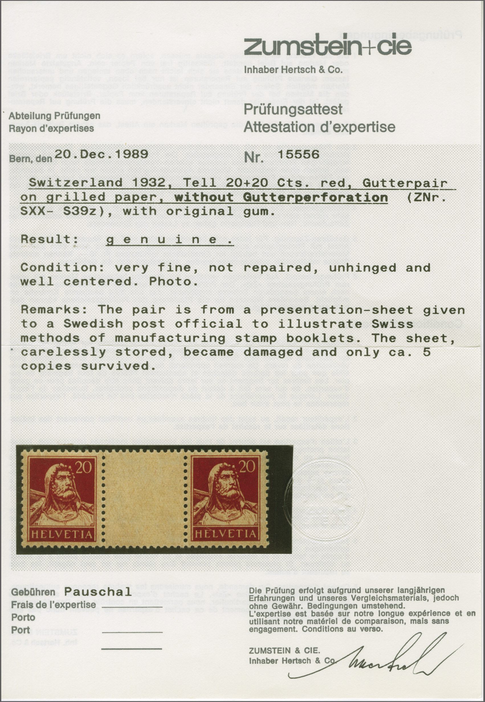 den 1930er Jahren von der Wertzeichendruckerei PTT einem ihrer Besucher, einem Mitarbeiter der Schwedischen Staatsdruckerei, als Dokumentation des Schweizer Verfahrens zur Herstellung von Markenheftchen übergeben. Ende der 1980er Jahre