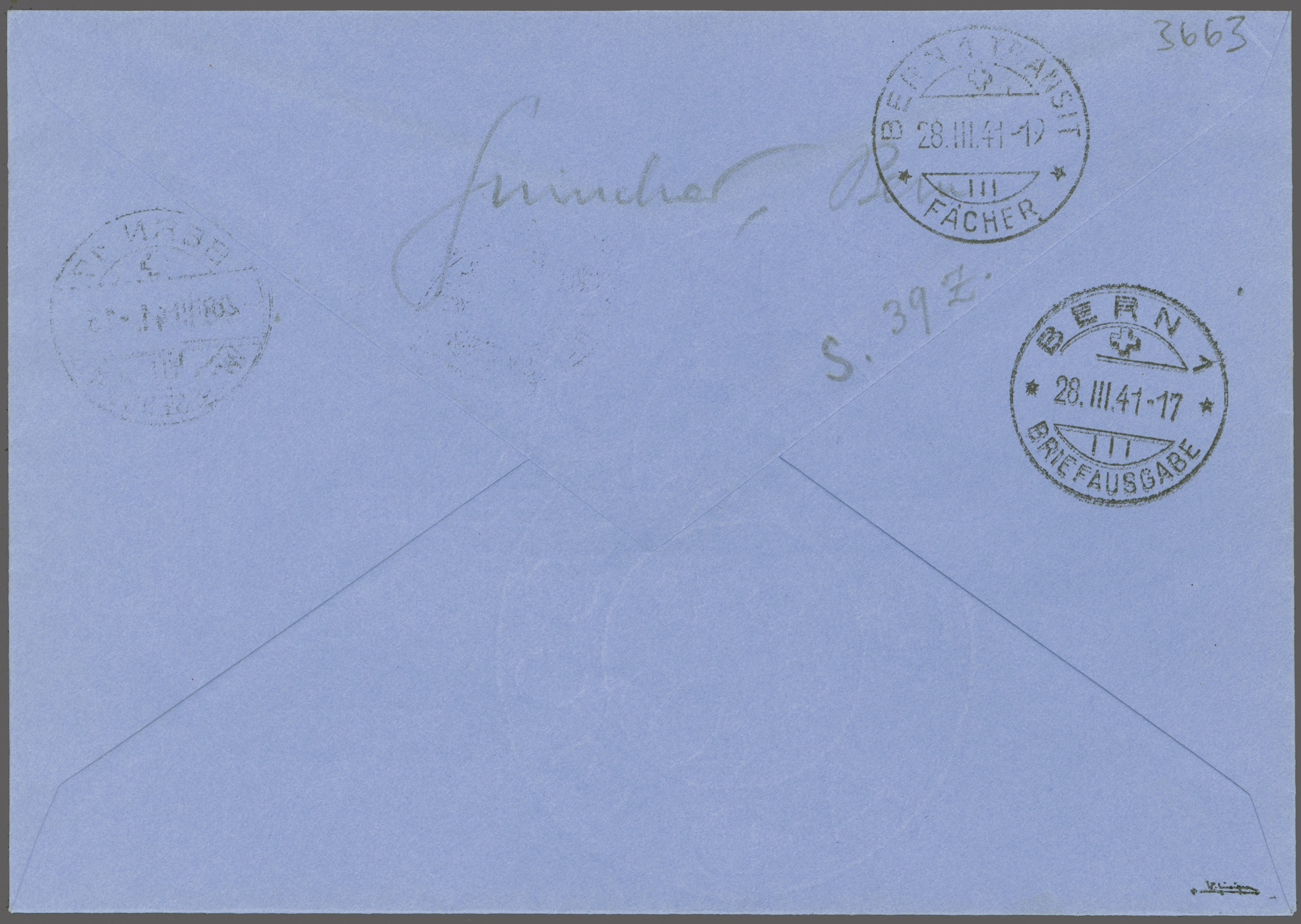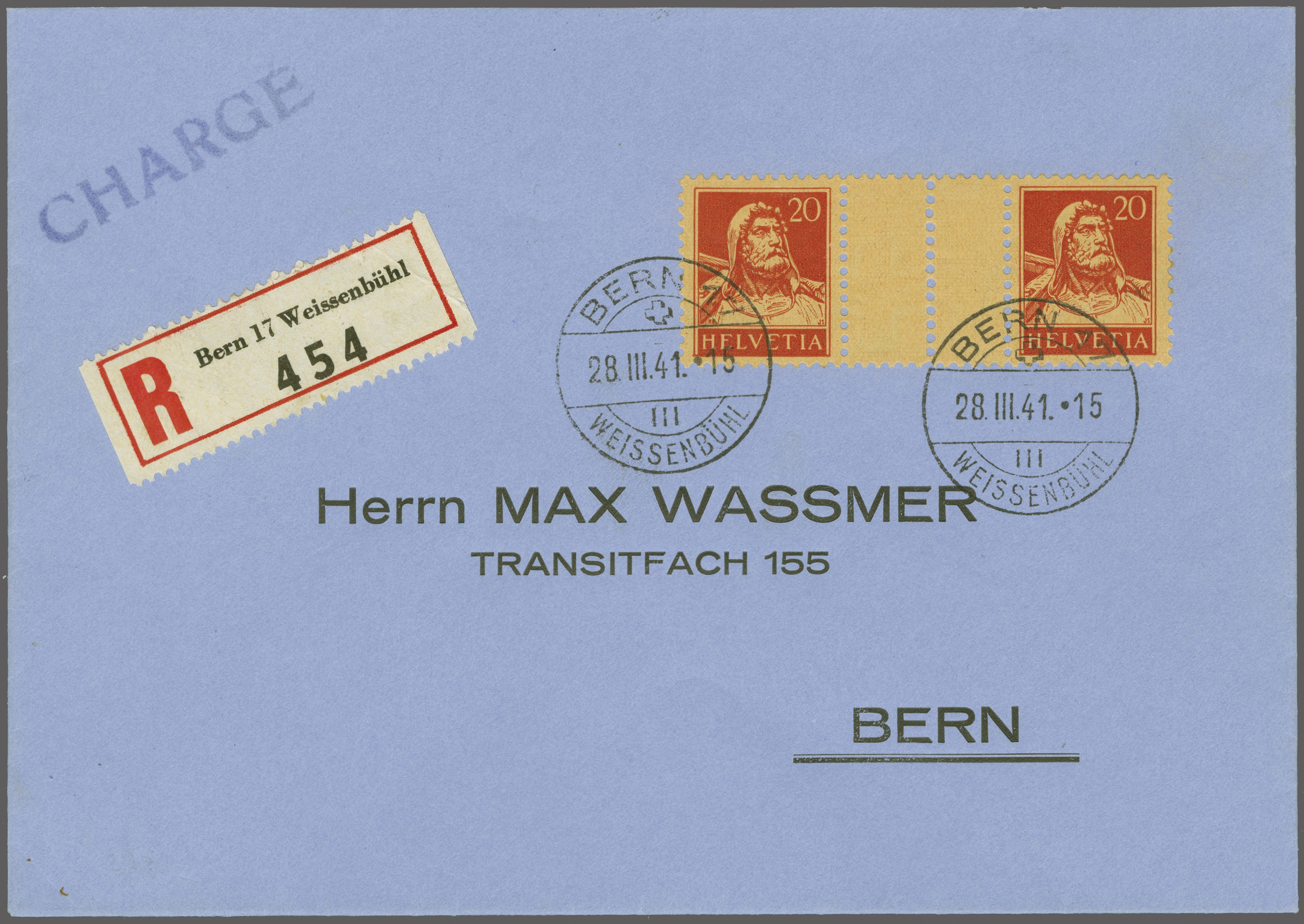 28.III.41-15", portogerecht verwendet auf eingeschriebenem Firmencouvert mit vorgedruckter Adresse an Max Wassmer in Bern. Rücks. Ankunftsstp. "BERN 1 BRIEFAUSGABE 28.III.41.-17" resp. "BERN 1 TRANSIT FÄCHER 28.III.41-19". Ein sehr seltenes Paar in