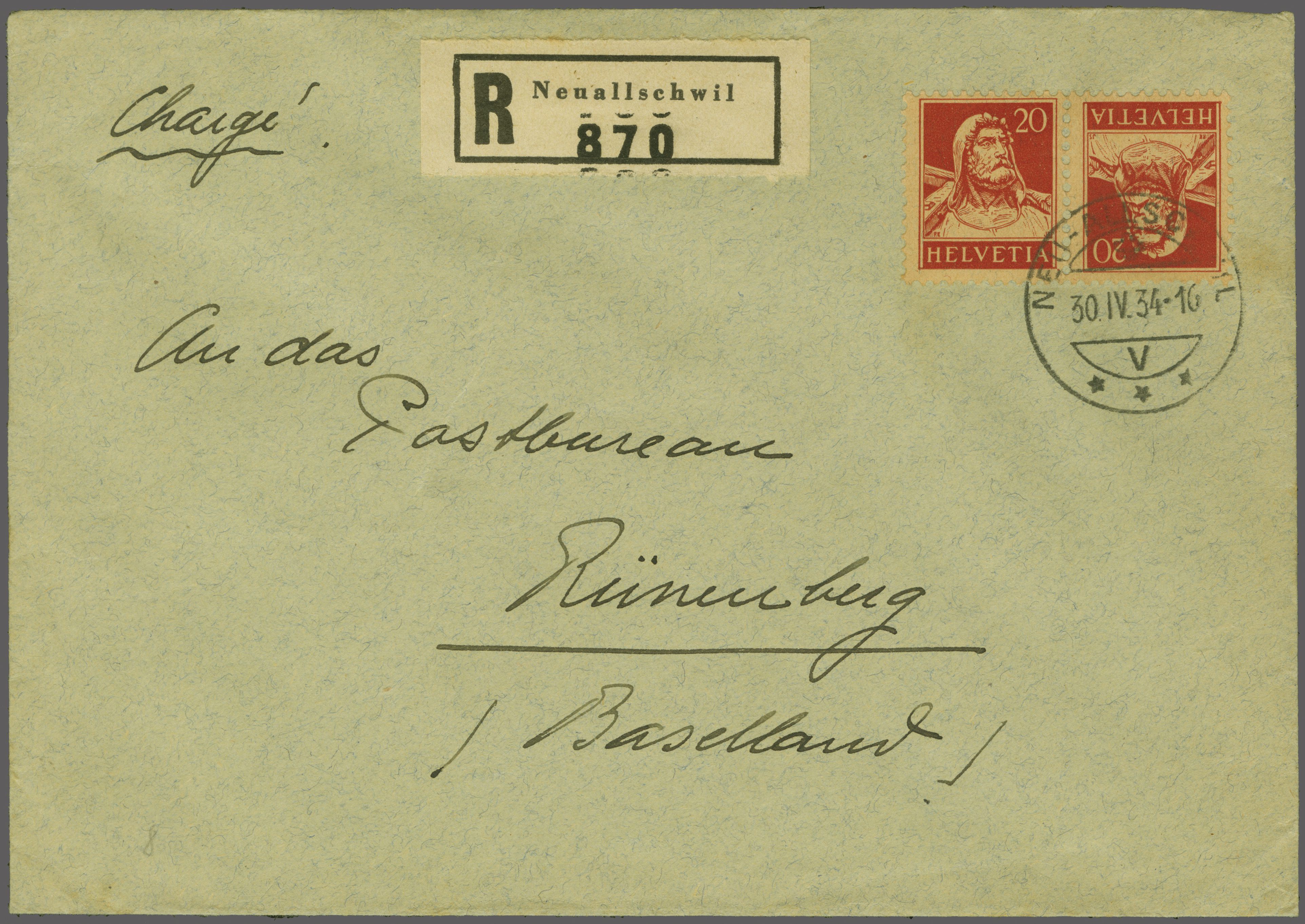 1933: Tellbrustbild 20 Rp. karminrot mit geriffelter Gummierung im waagr. Kehrdruckpaar, gut gez., schön gest. "NEU-ALLSCHWIL 30.IV.24-16", portogerecht verwendet auf eingeschriebenem Briefcouvert adressiert an das Postbüro
