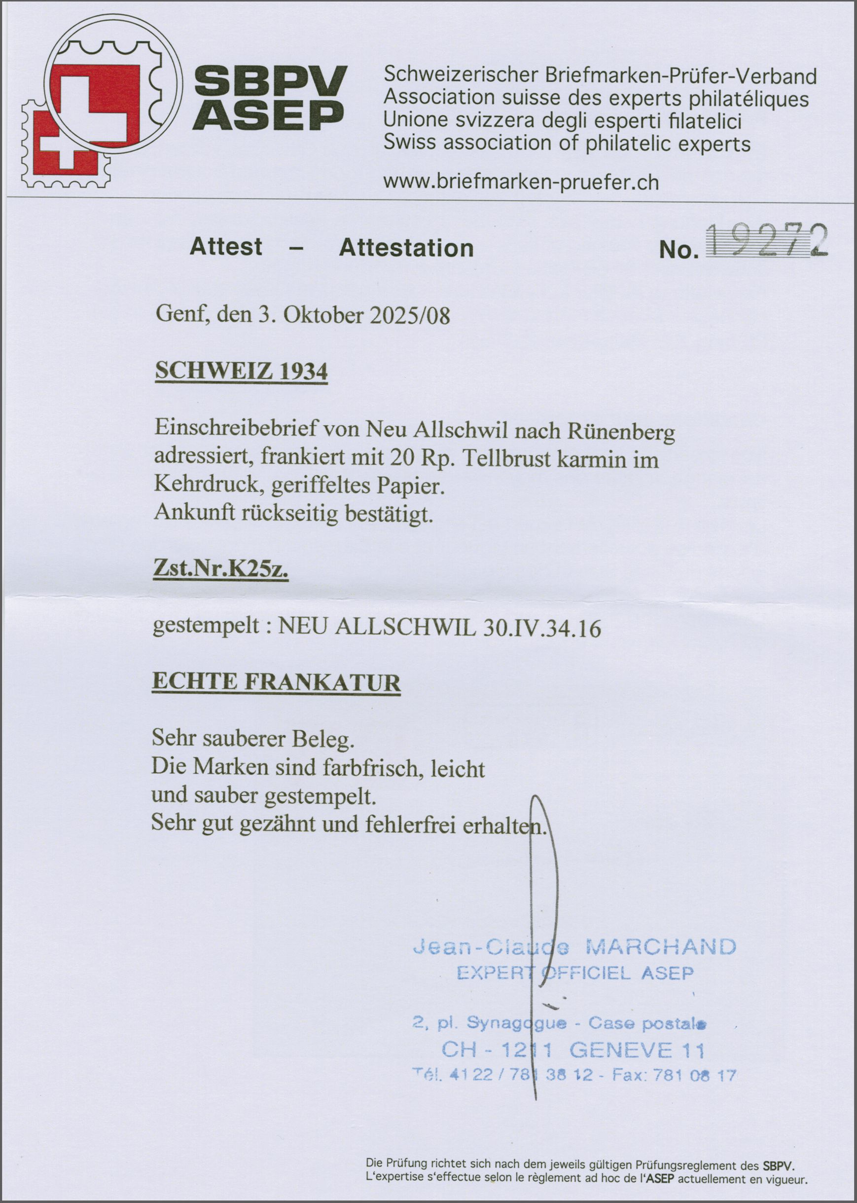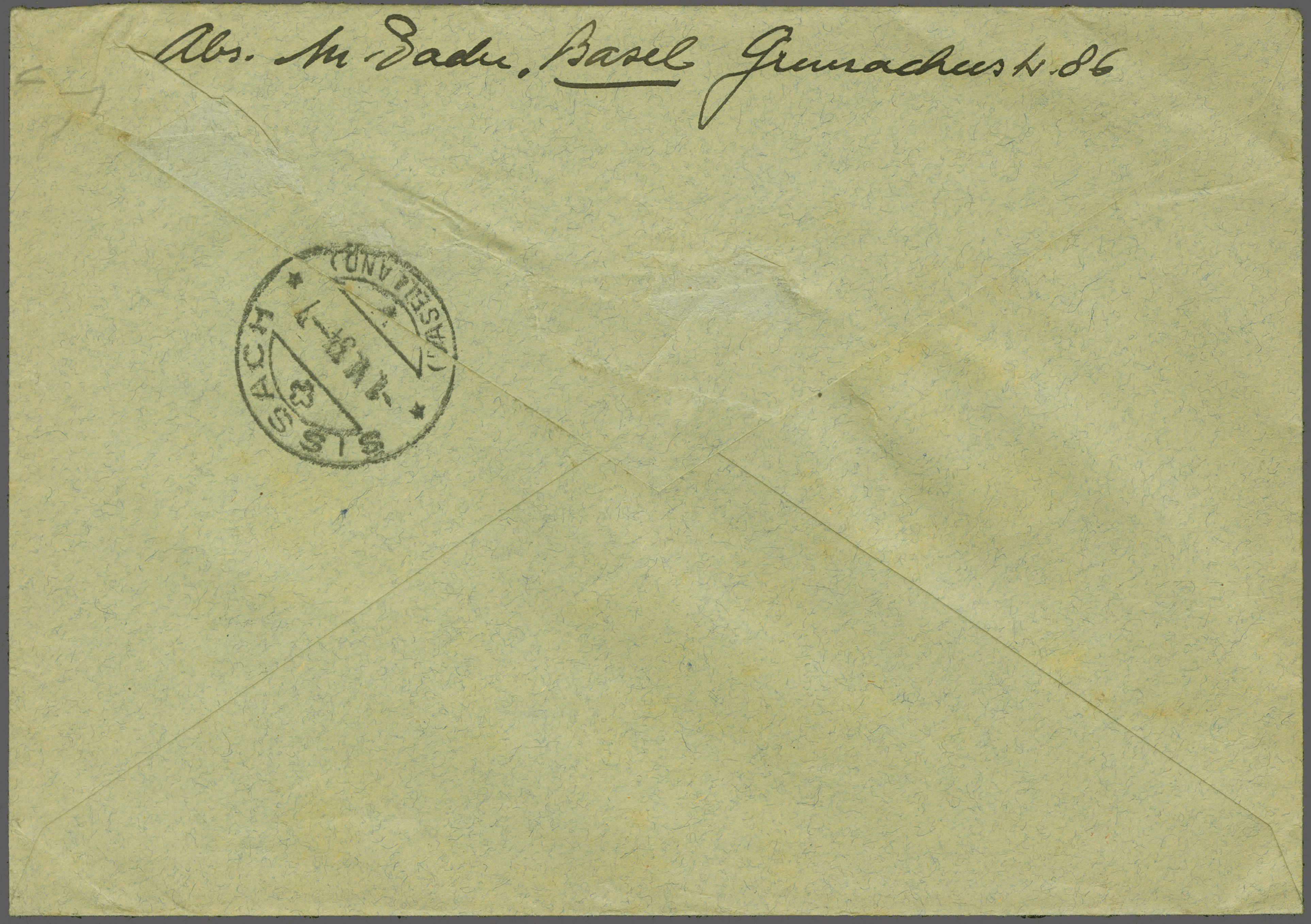 Rünenberg (BL). Rücks. Transitstp. "SISSACH (BASELLAND) 1.V.34-7". Ein frischer und ansprechender Brief mit diesem seltenen Kehrdruck; Attest Marchand (2025). SBK=CHF 4'500 (Image 1)