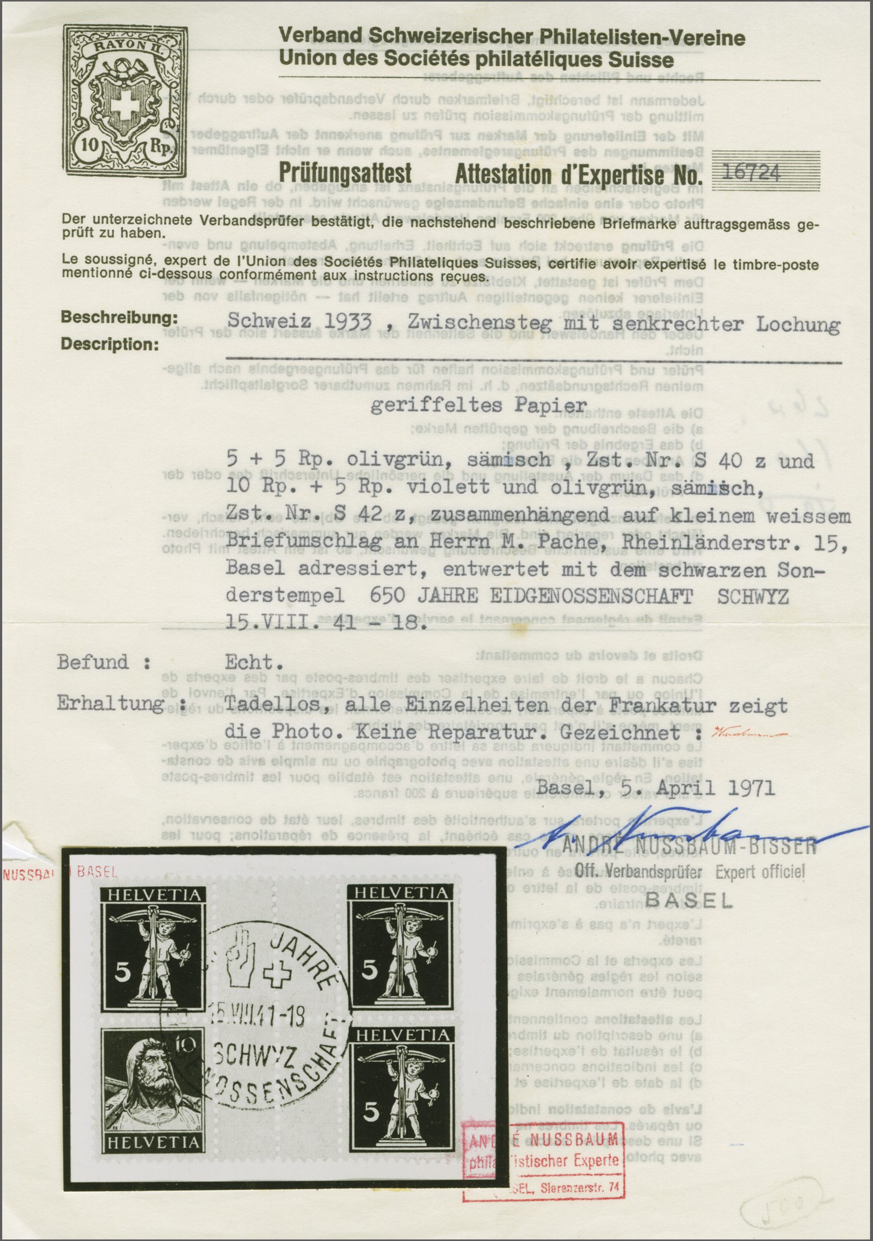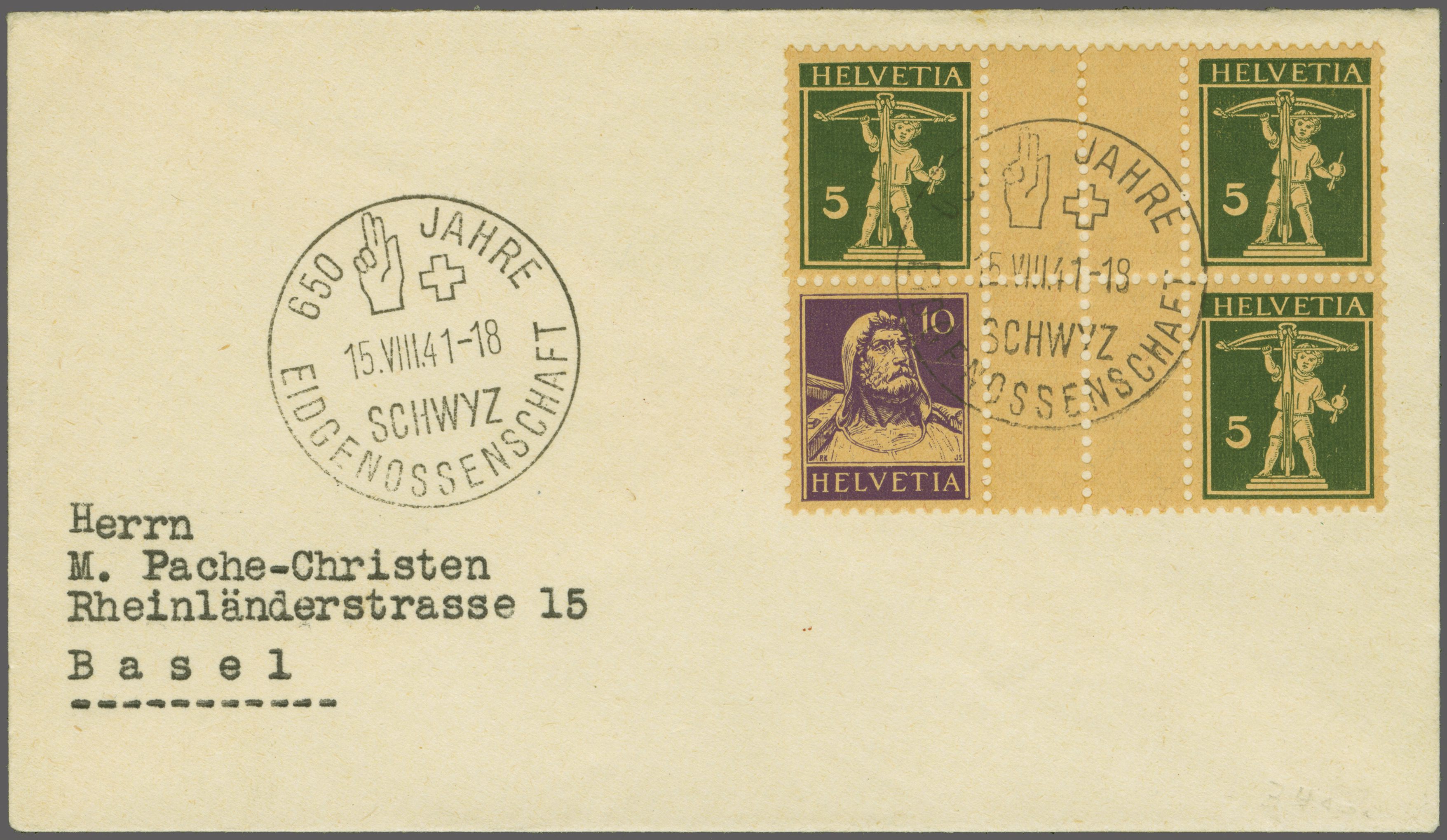 Gummierung, eine frische und gut gez. Einheit, schön entw. mit Sonderstp. "650 JAHRE / EIDGENOSSENSCHAFT / SCHWYZ / 15.VIII.41-18" auf kleinformatigem Briefcouvert nach Basel. Minime Kratzspur im unteren Paar, sonst in fehlerfreier Erhaltung; Atteste