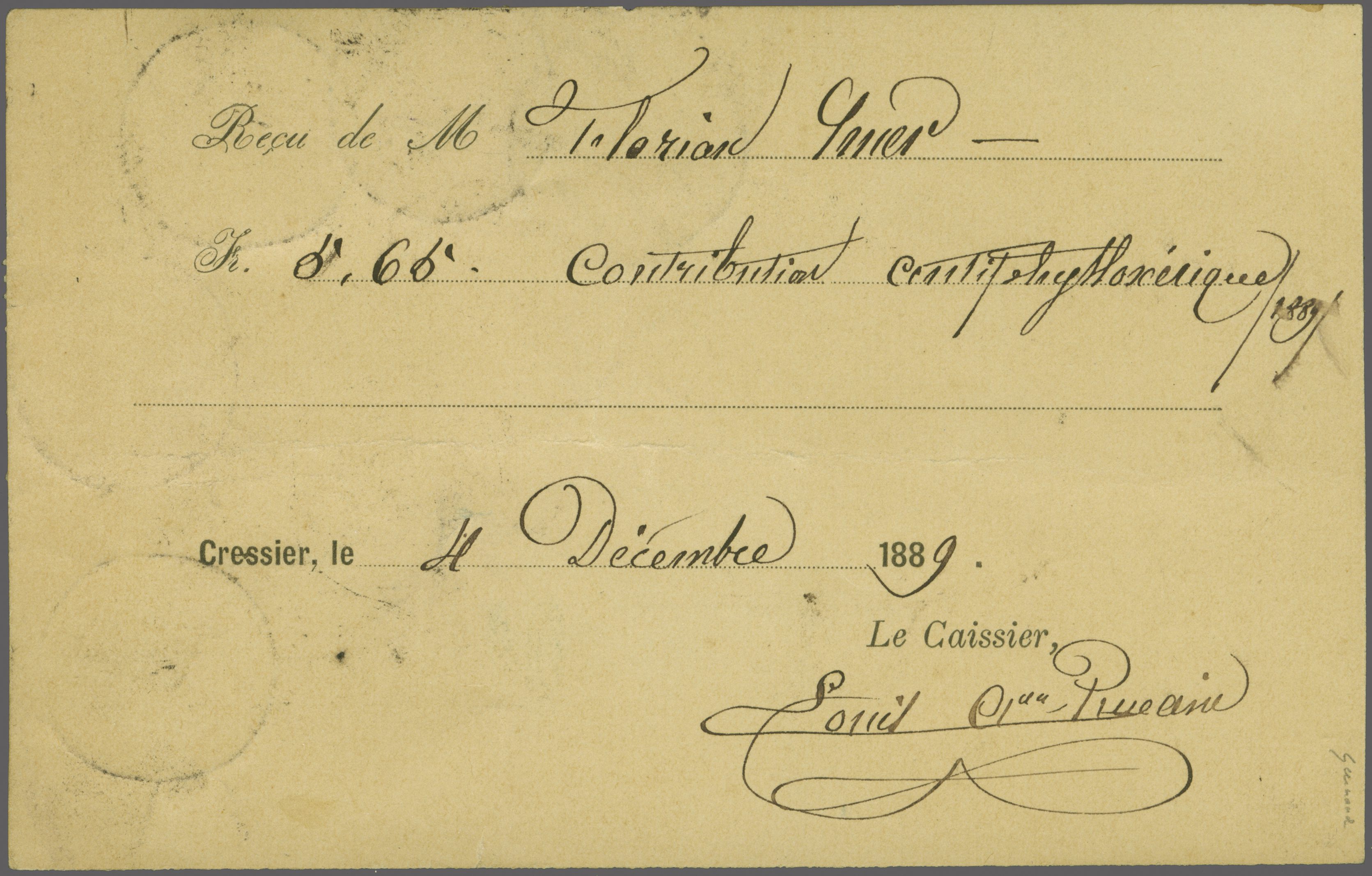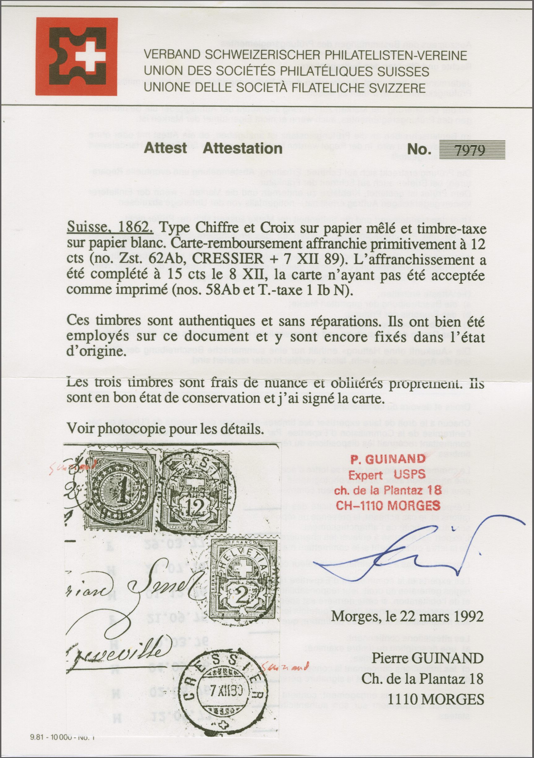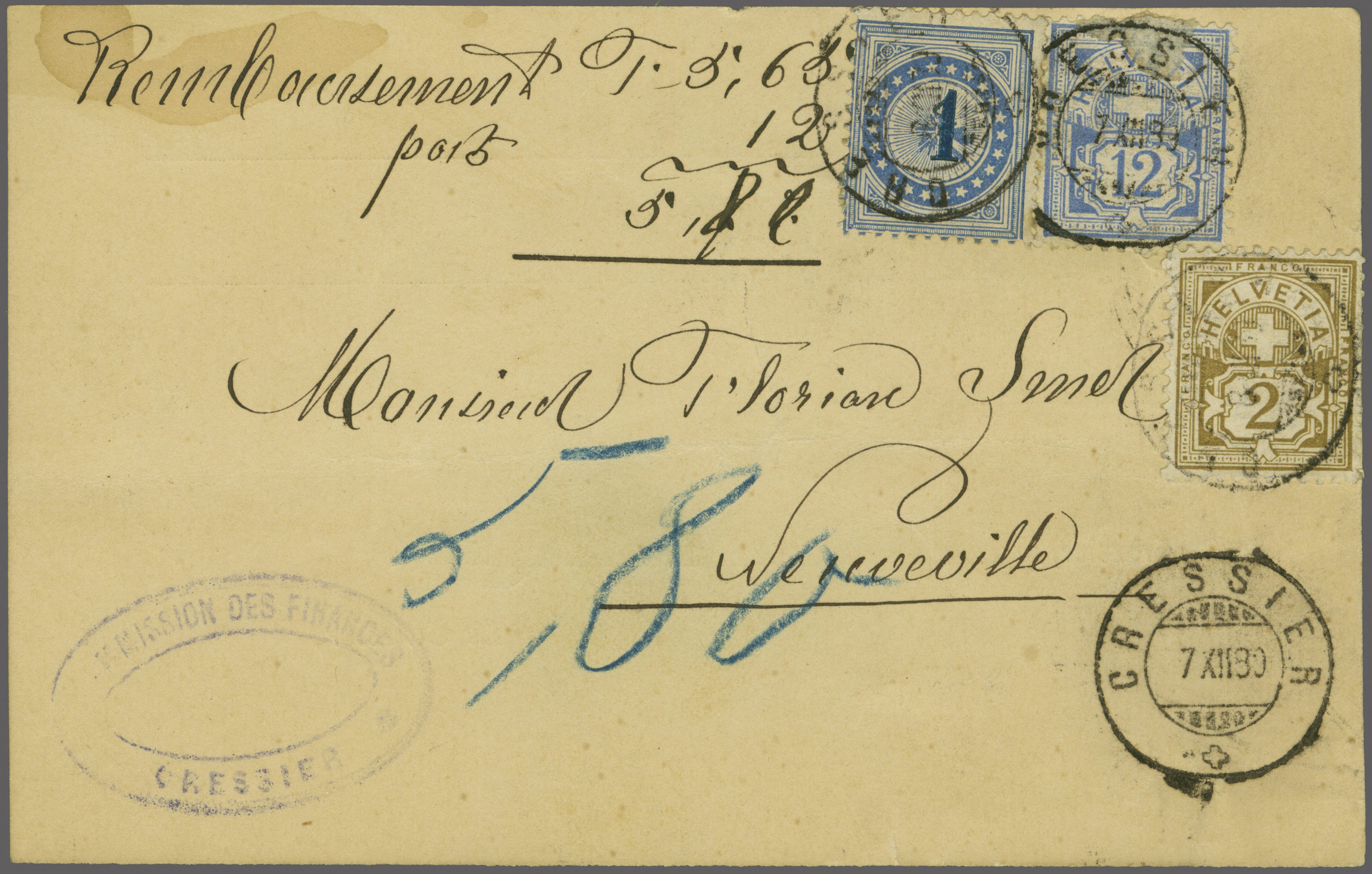 1889: Ziffermuster 12 Rp. ultramarin, farbfr. und gut gez., klar gest. "CRESSIER 7.XII.89" als 2 Rp.-Drucksachenporto plus 10 Rp. Nachnahmeprovision auf Nachnahmekarte über Fr. 5.80 nach La Neuveville. Die Karte wurde nicht