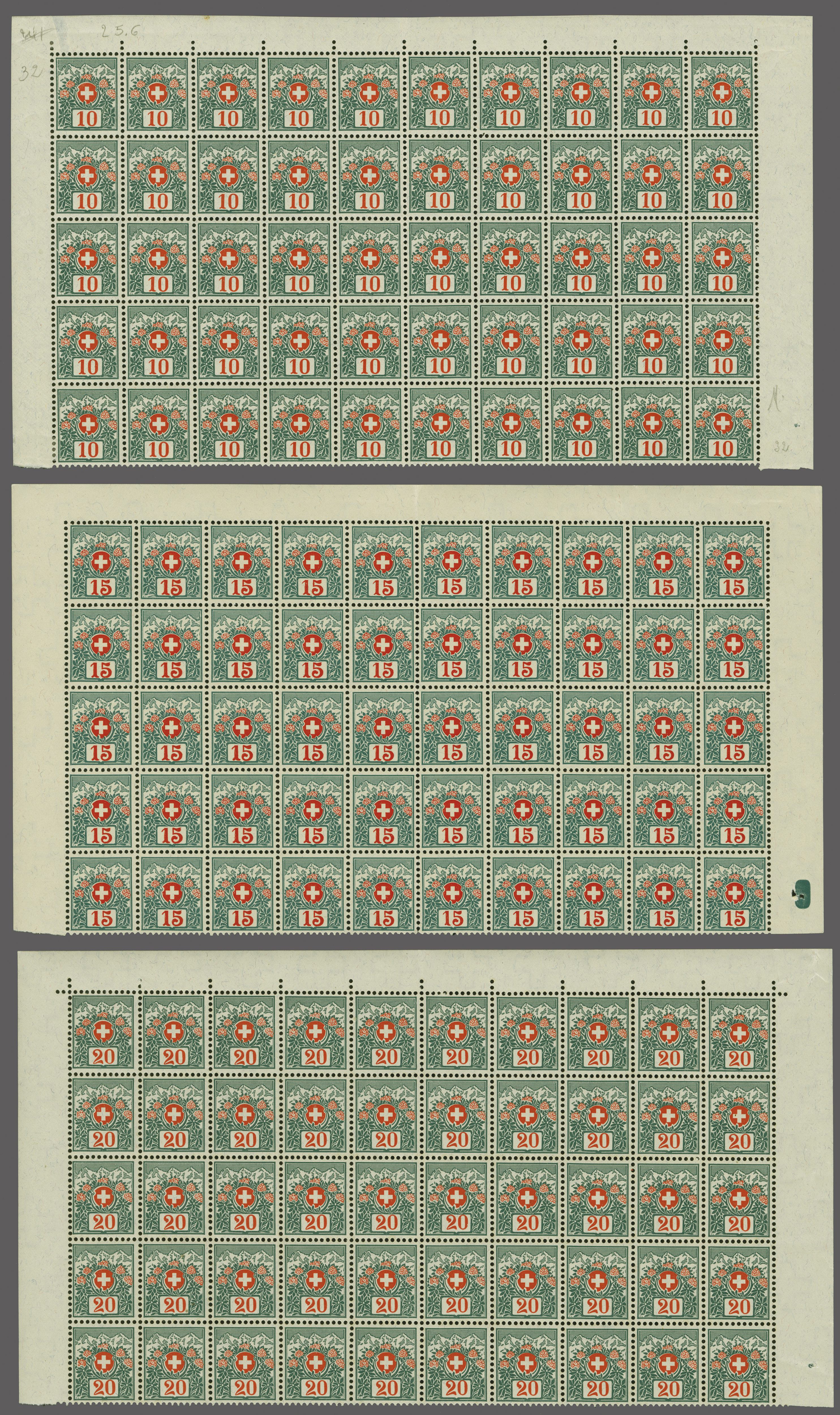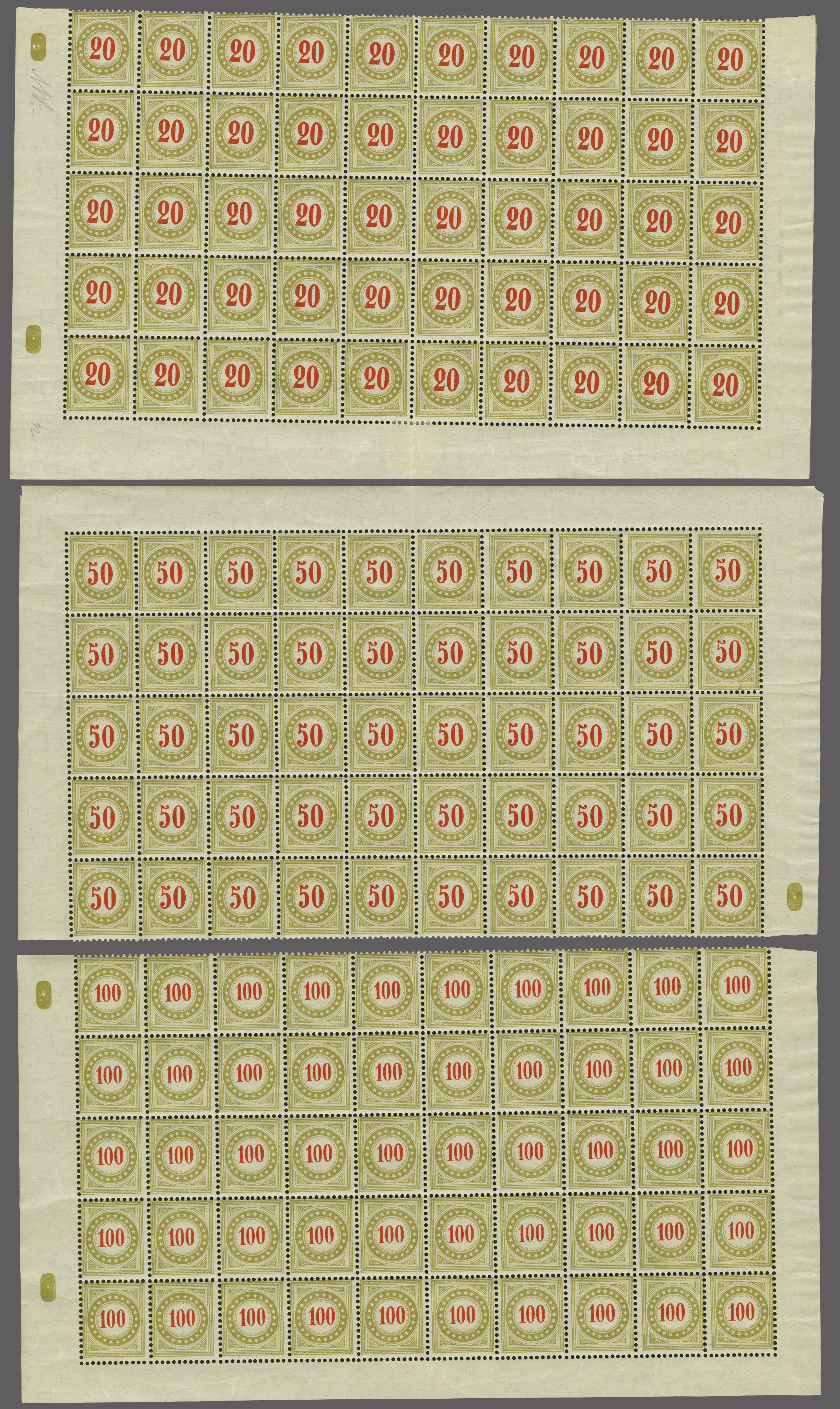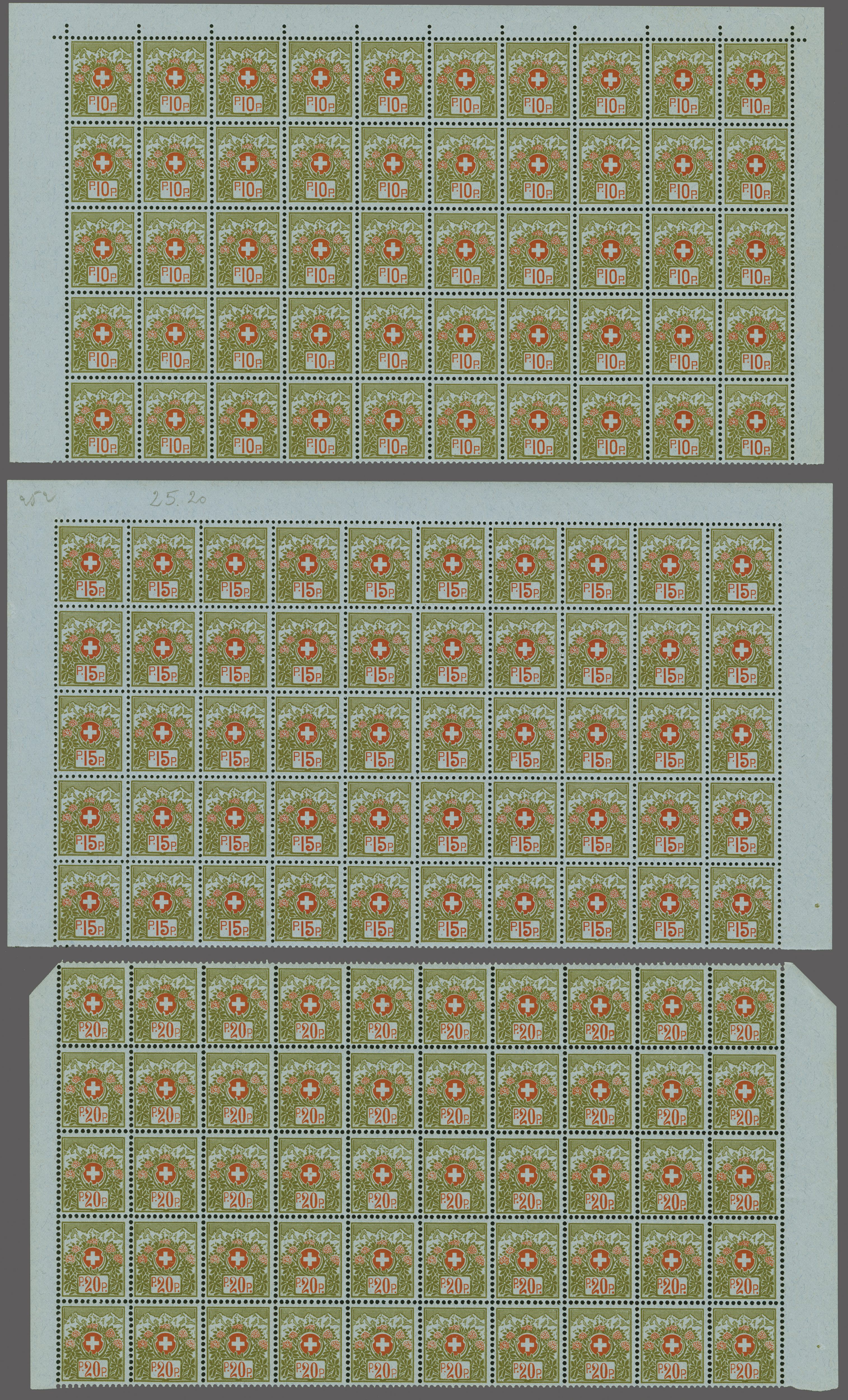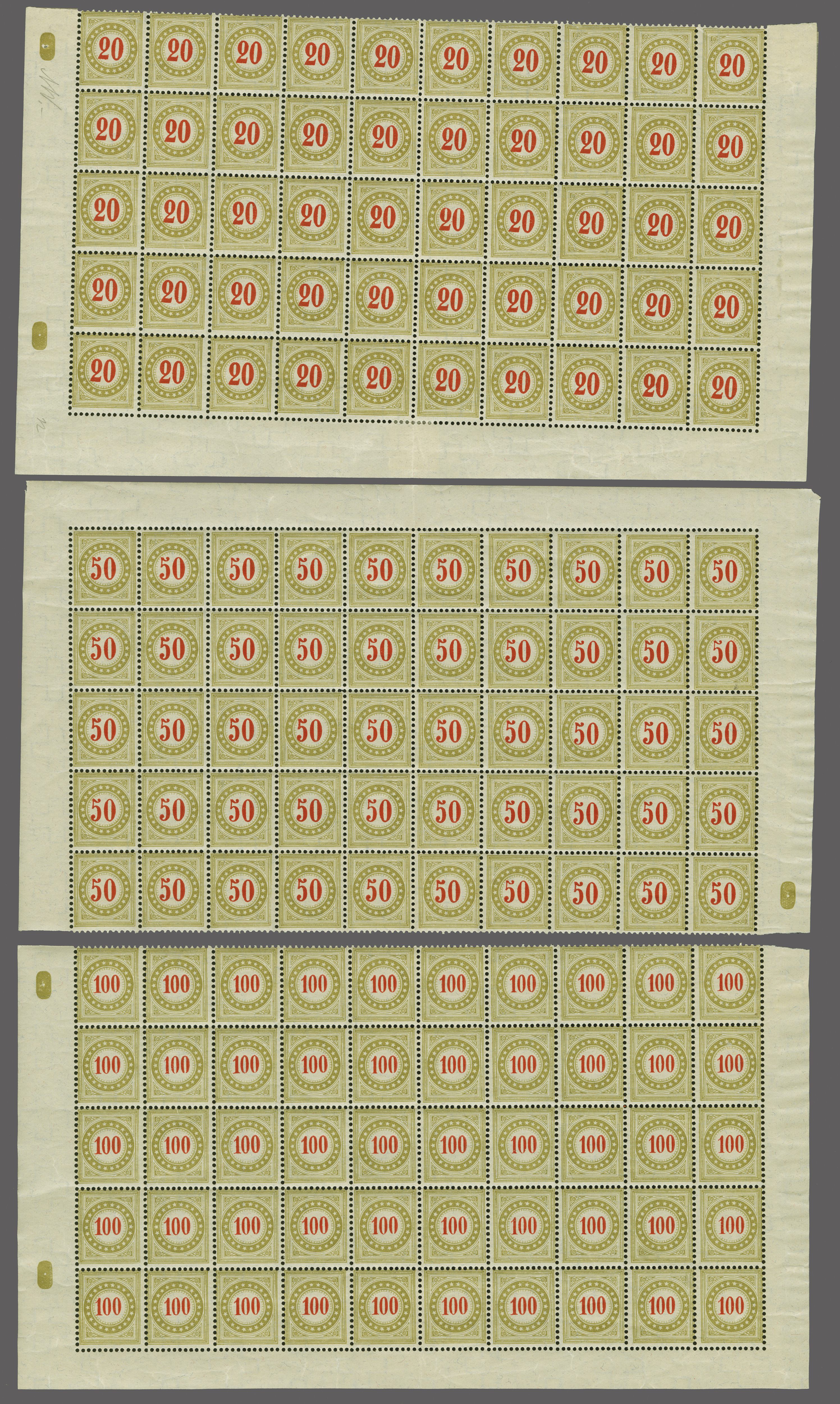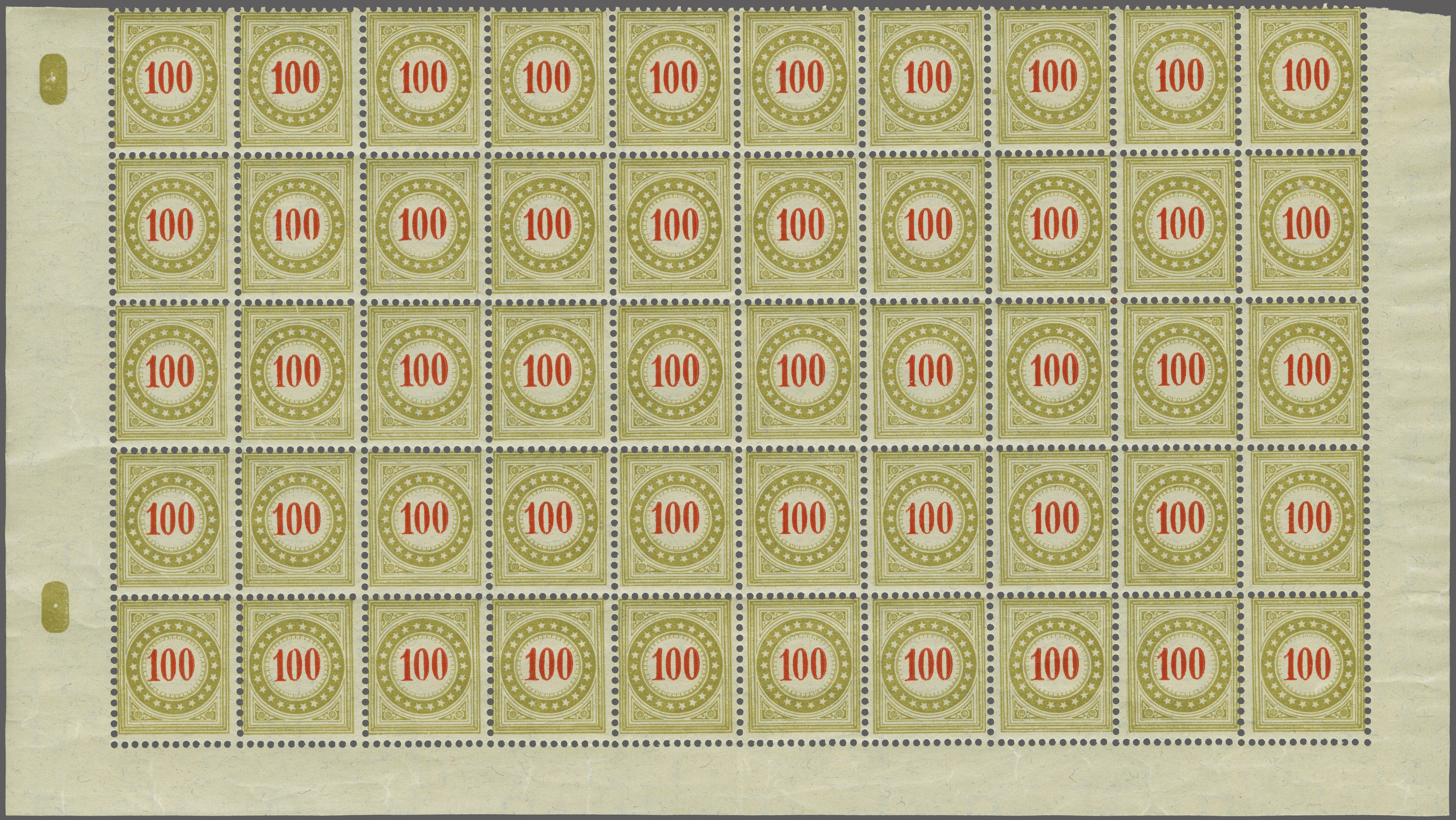 Portomarken 1908/09: Rahmen bräunlicholiv & Wertziffer zinnoberrot, der komplette Satz zu sechs Werten von 1 - 100 Rp. in postfrischen Halbbogen zu 50 Marken. Kleinere Unregelmässigkeiten bei zwei Werten der 1 Rp. resp. 5