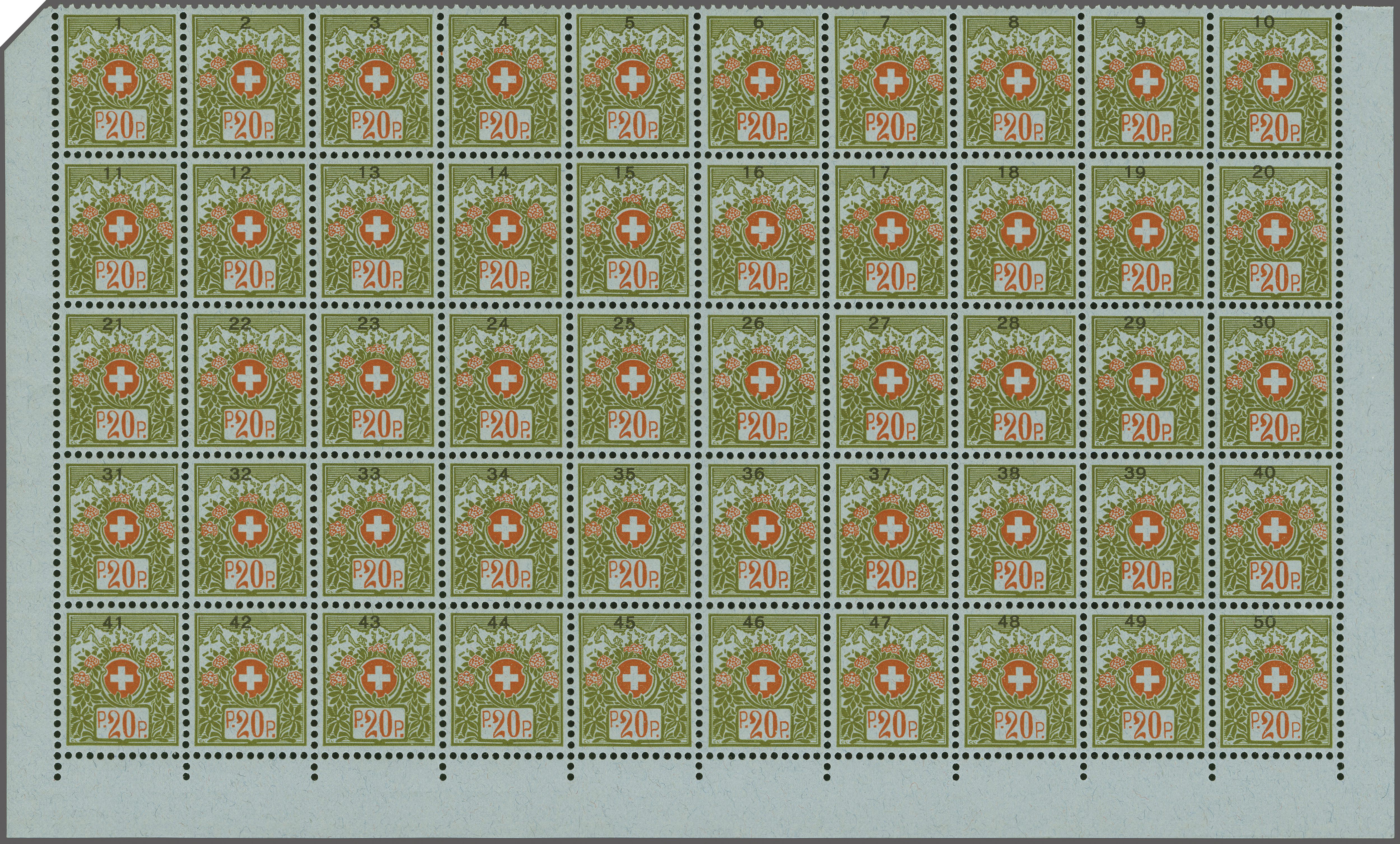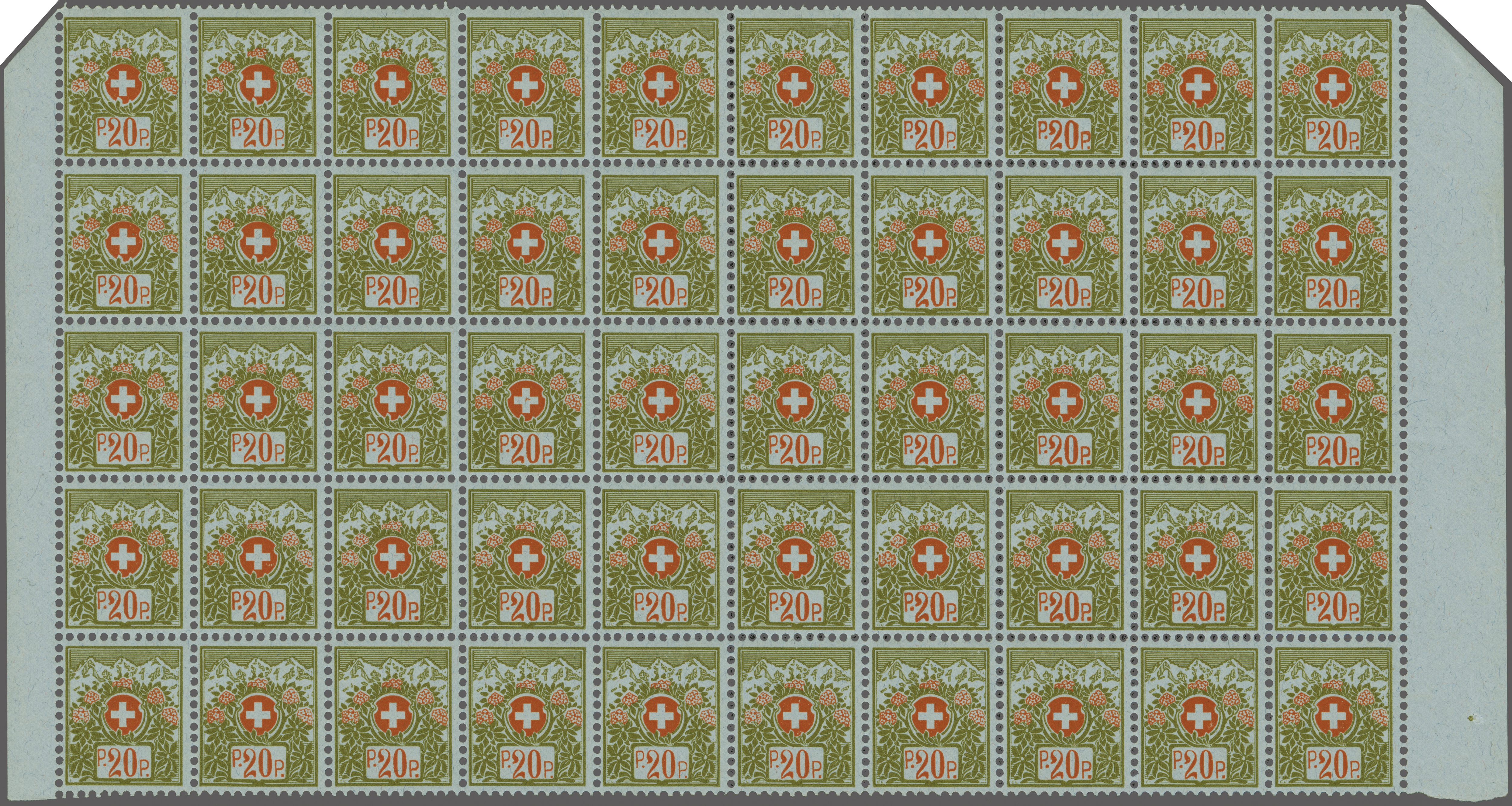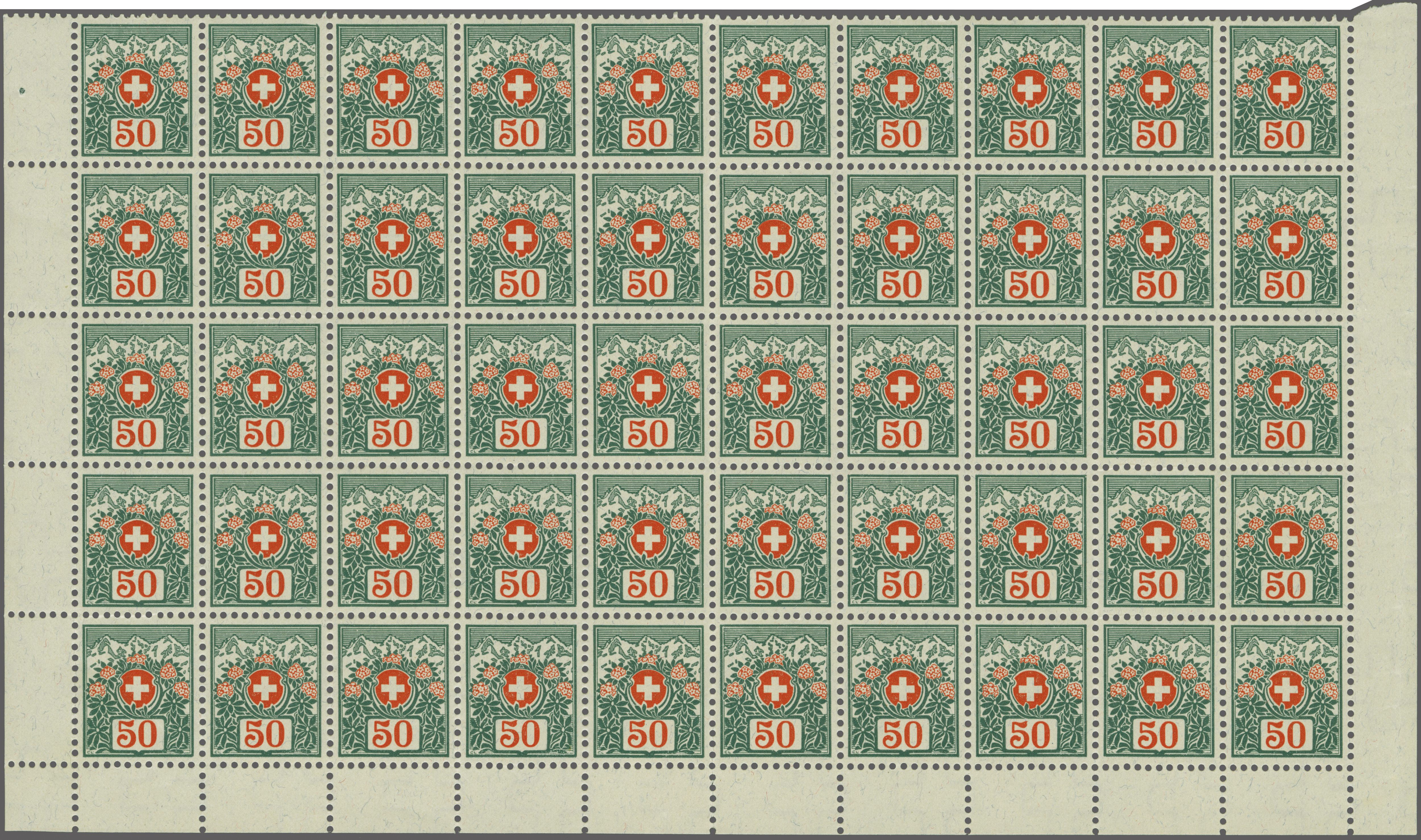 Portomarken 1910: Alpenrosen, der komplette Satz zu neun Werten von 1 - 50 Rp. in postfrischen Halbbogen zu 50 Marken. SBK = CH 7'000 als Einzelwerte (Image 1)