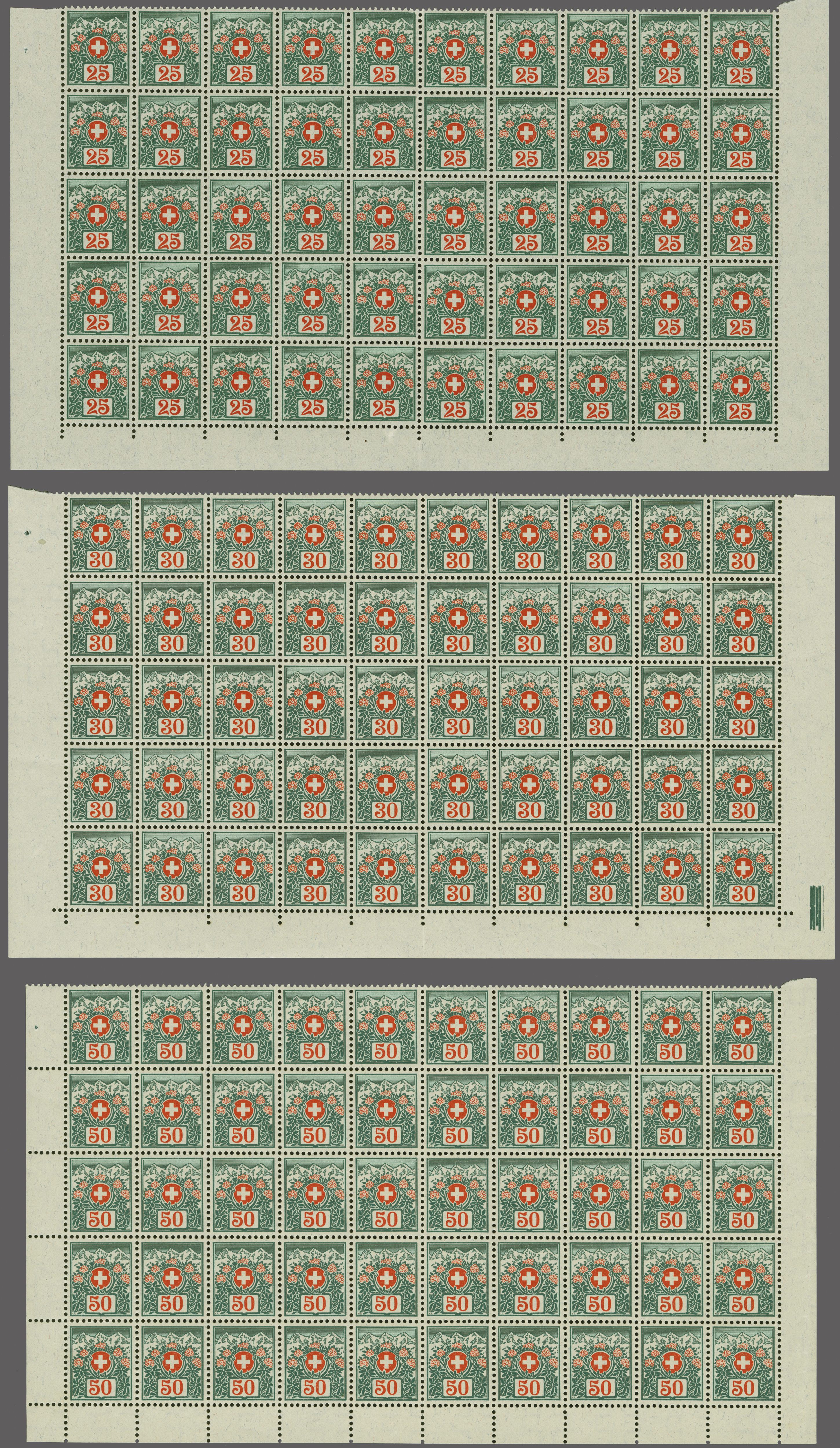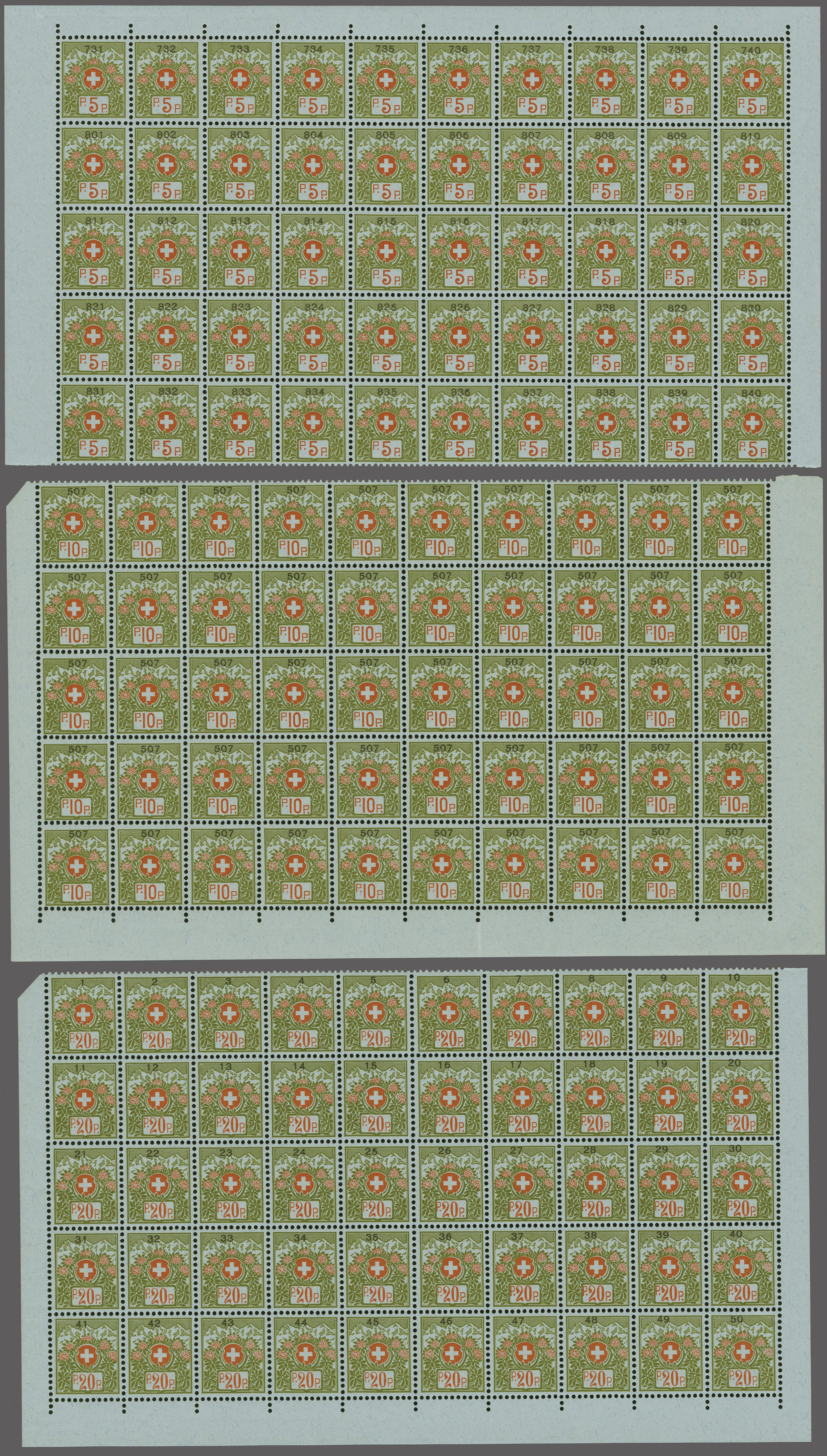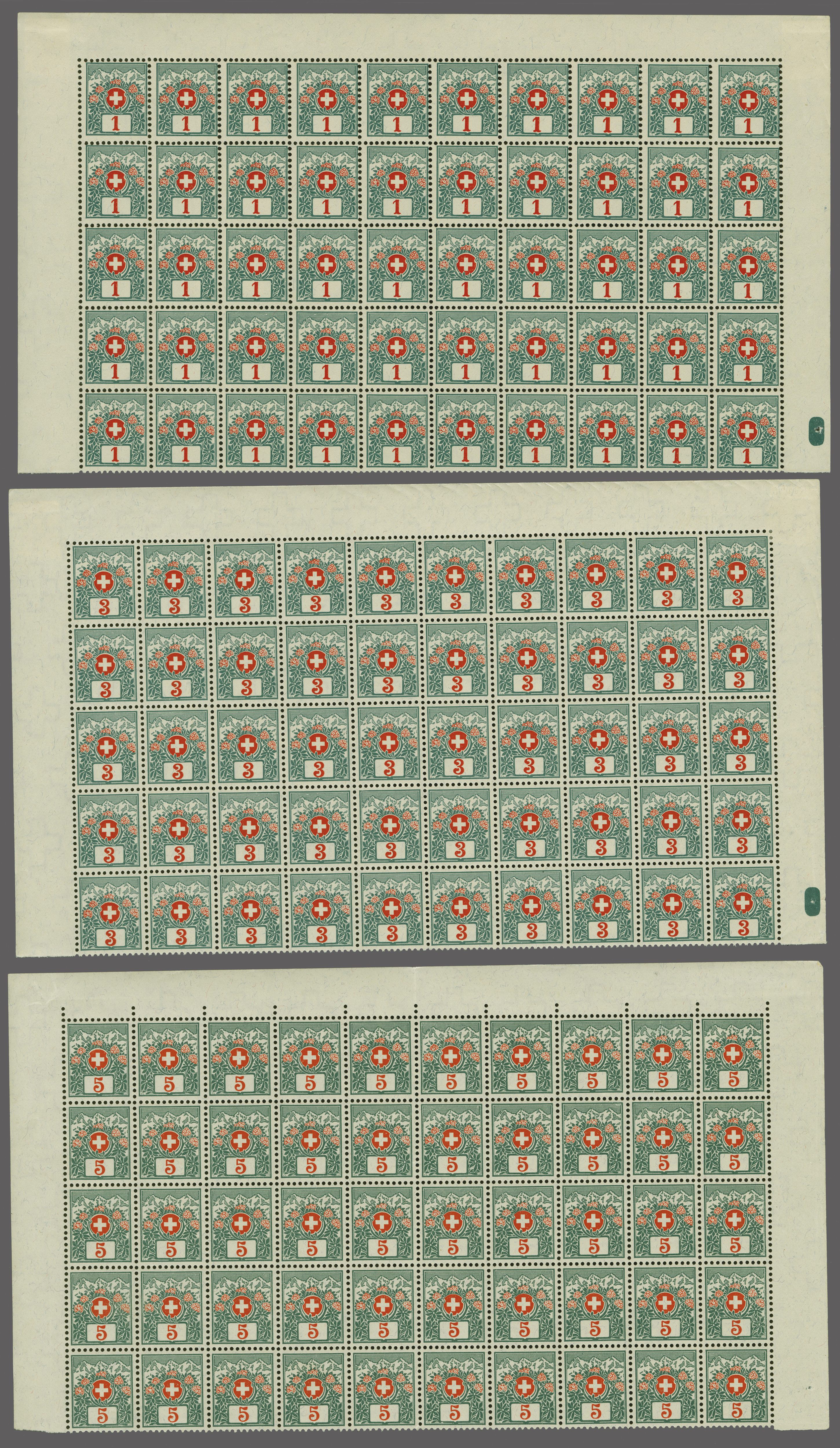 Portofreiheitsmarken 1926: Alpenrosen mit grosser Kontrollnummer, der komplette Satz zu drei Werten von 5 - 20 Rp. in postfrischen Halbbogen zu 50 Marken. SBK = CH 5'250 als Einzelwerte (Image 1)
