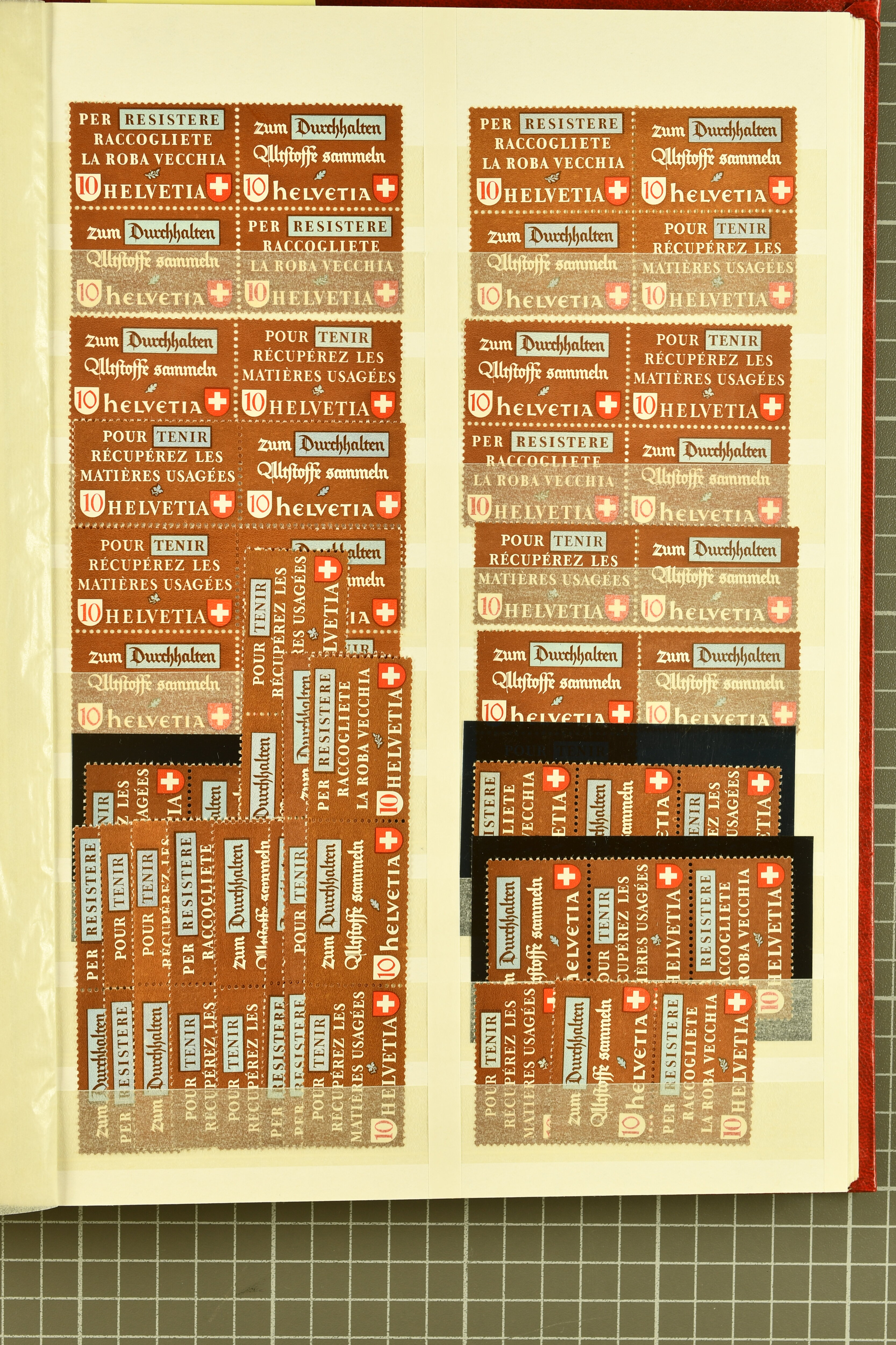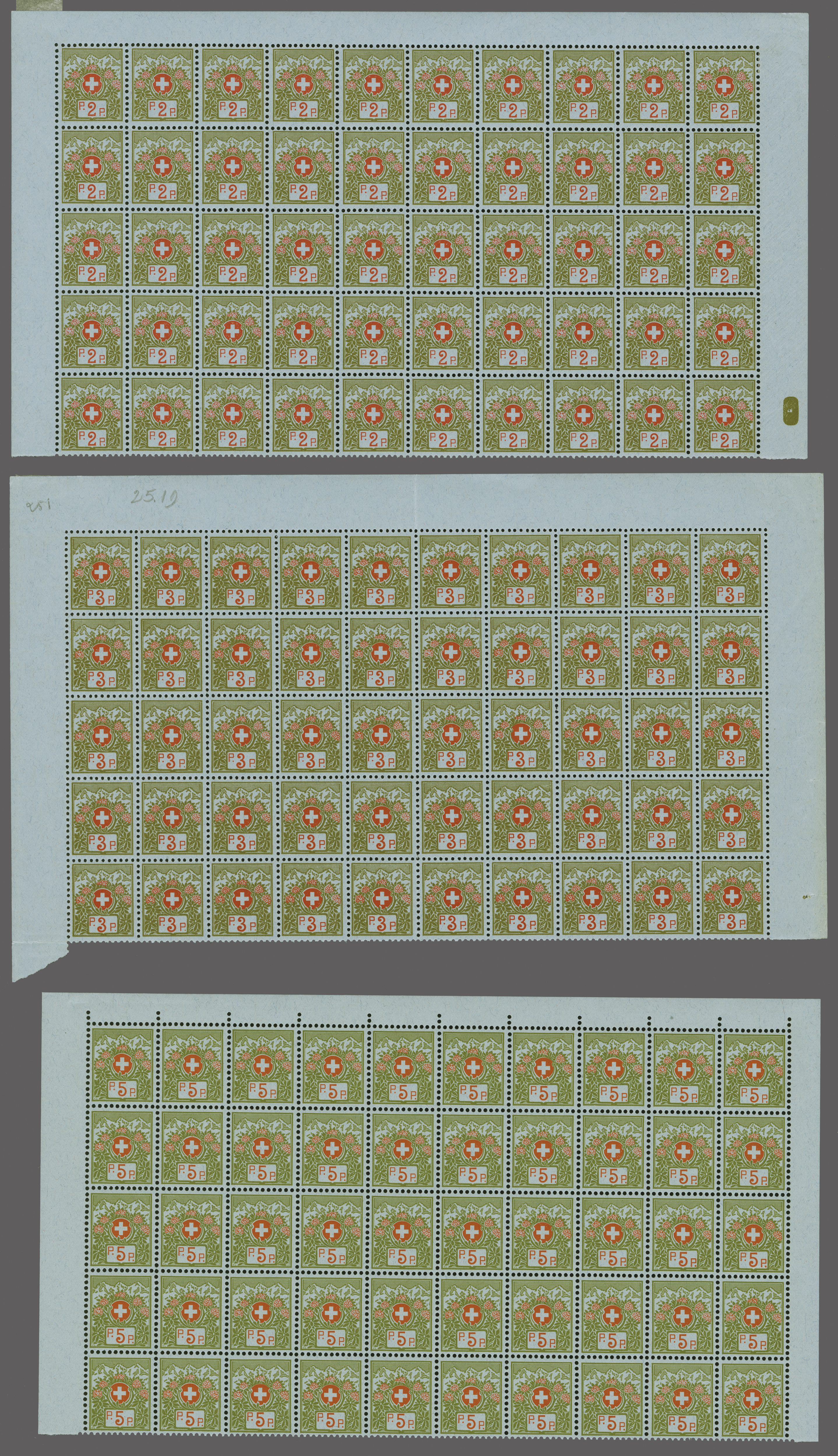 Portofreiheitsmarken 1943: Krankenpflegerinnen & Dunant auf geriffeltem Kreidepapier, jeweils der komplette Satz zu drei Werten 5 - 20 Rp. mit Kontrollnummern '80' res. '580', je in Halbbögen zu 100 Marken, in postfrischer