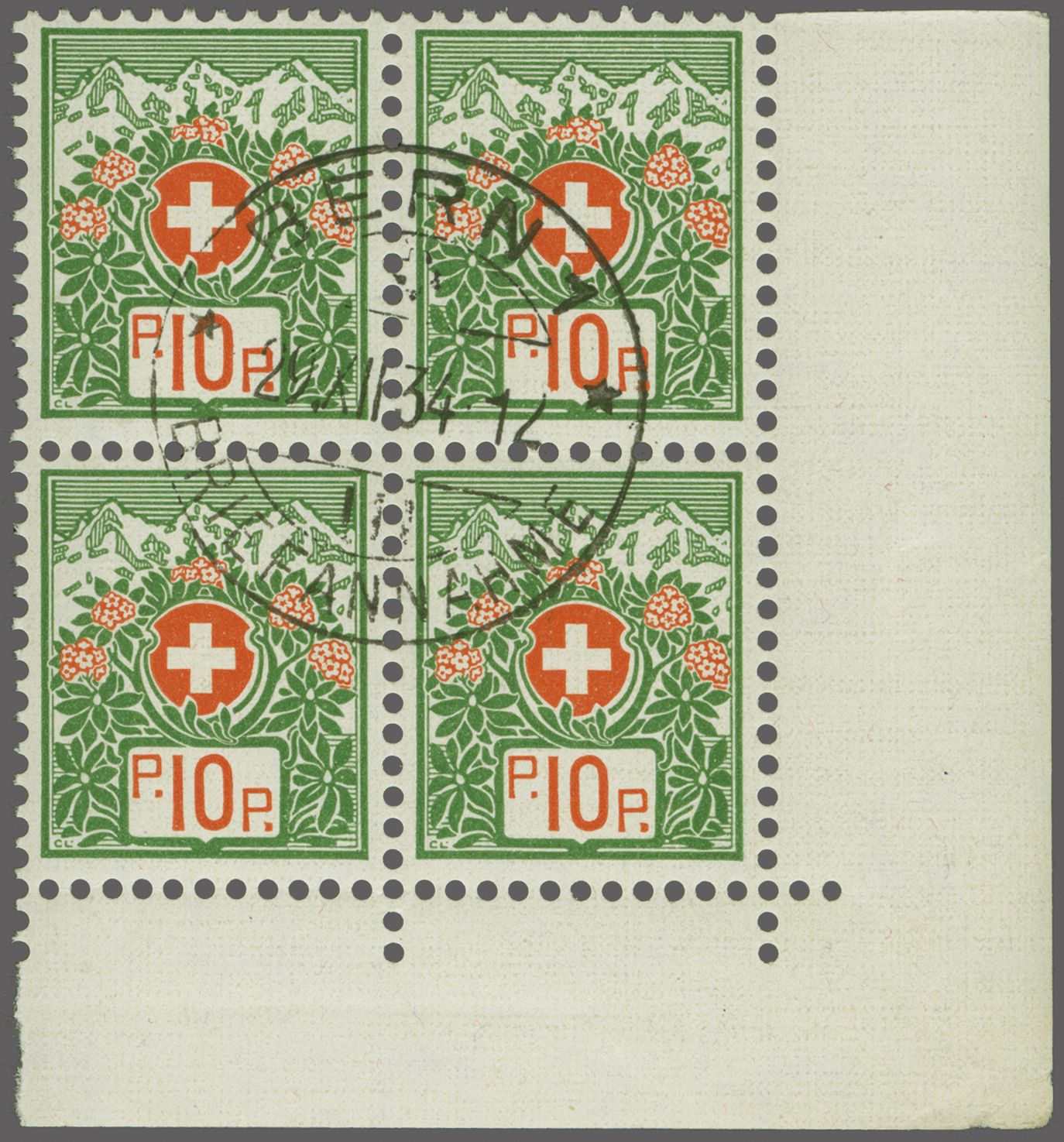 Portofreiheitsmarken 1934: Alpenrosen auf gekreidetem geriffeltem Faserpapier, ohne Kontrollnummer, 10 Rp. grün & zinnoberrot im Viererblock von der rechten unteren Bogenecke, zentrisch entw. "BERN 1 BRIEFANNAHME 20 XII 34