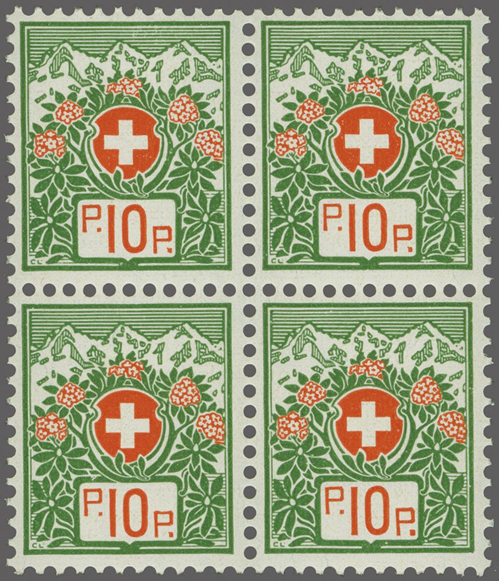 Portofreiheitsmarken 1934: Alpenrosen auf gekreidetem geriffeltem Faserpapier, ohne Kontrollnummer, 10 Rp. grün & zinnoberrot im Viererblock in perfekter postfrischer Erhaltung. SBK = CH 2'000 für vier Einzelwerte (Image 1)