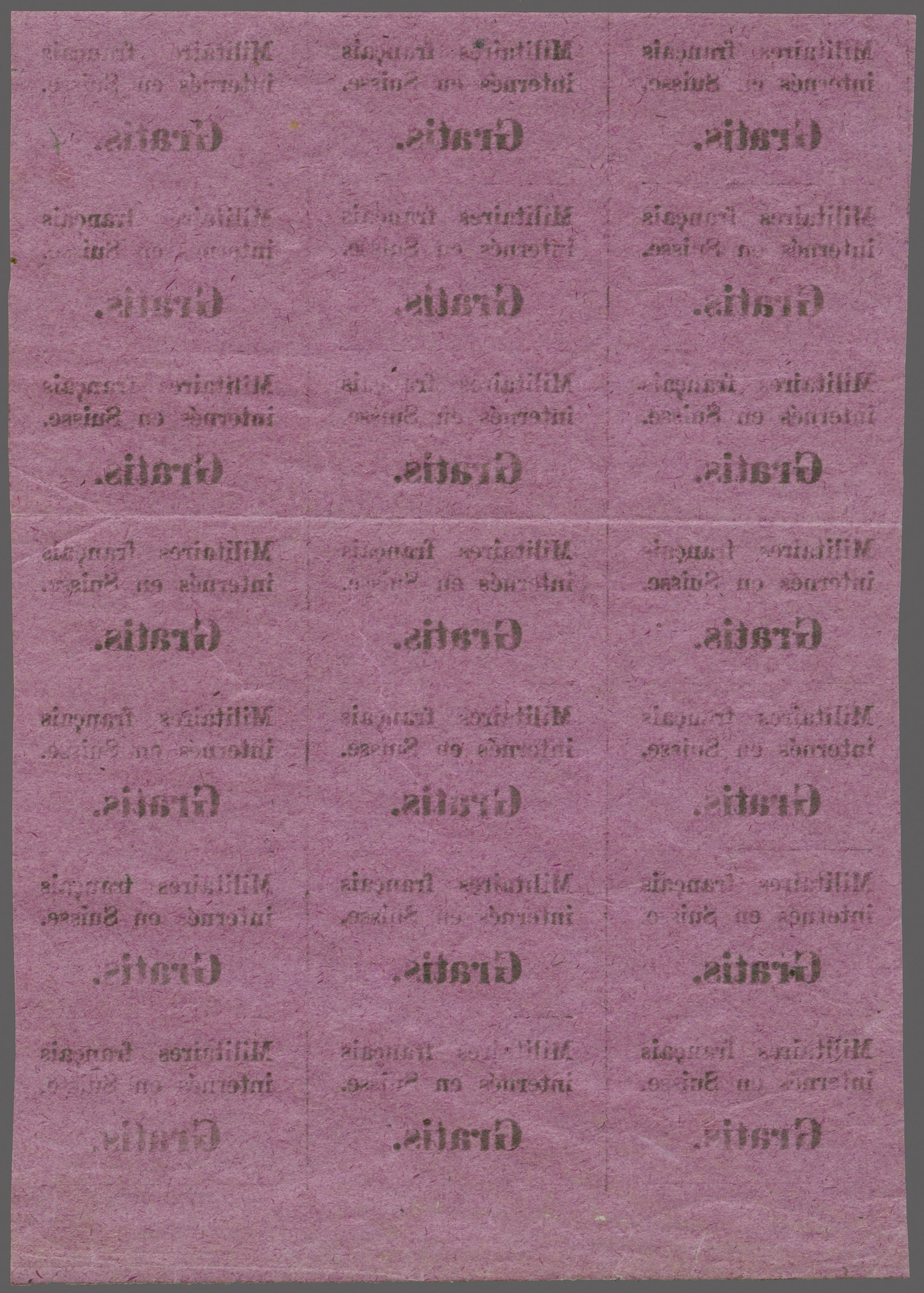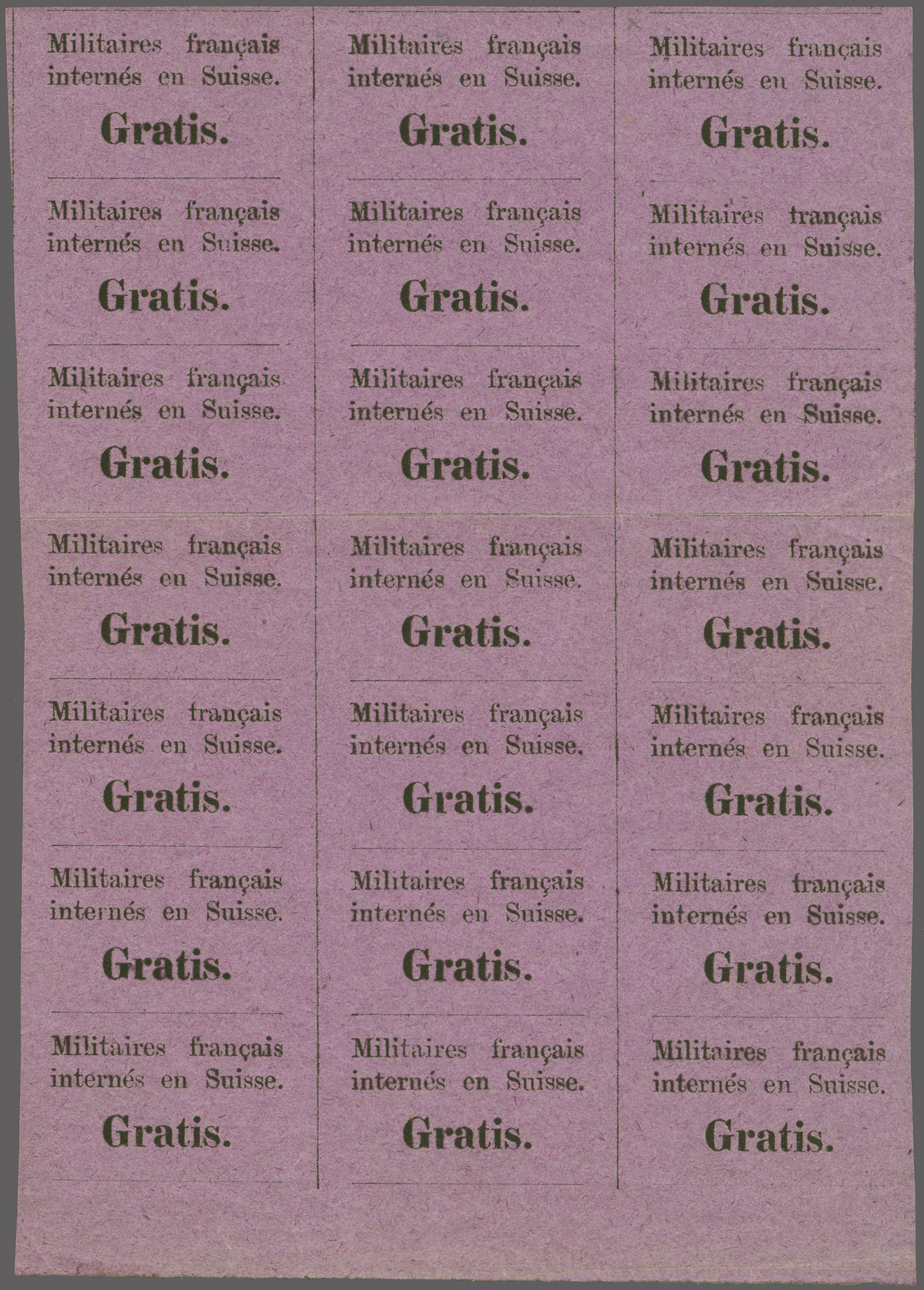 1871: Portofreiheits-Vignette "Militaires français internés en Suisse / Gratis." purpurlila, im Teilbogen zu 21 Vignetten (3 x 7) mit Bogenrand unten, ungebraucht mit Originalgummi, zwei Marken rechts oben mit Anhaftungen,