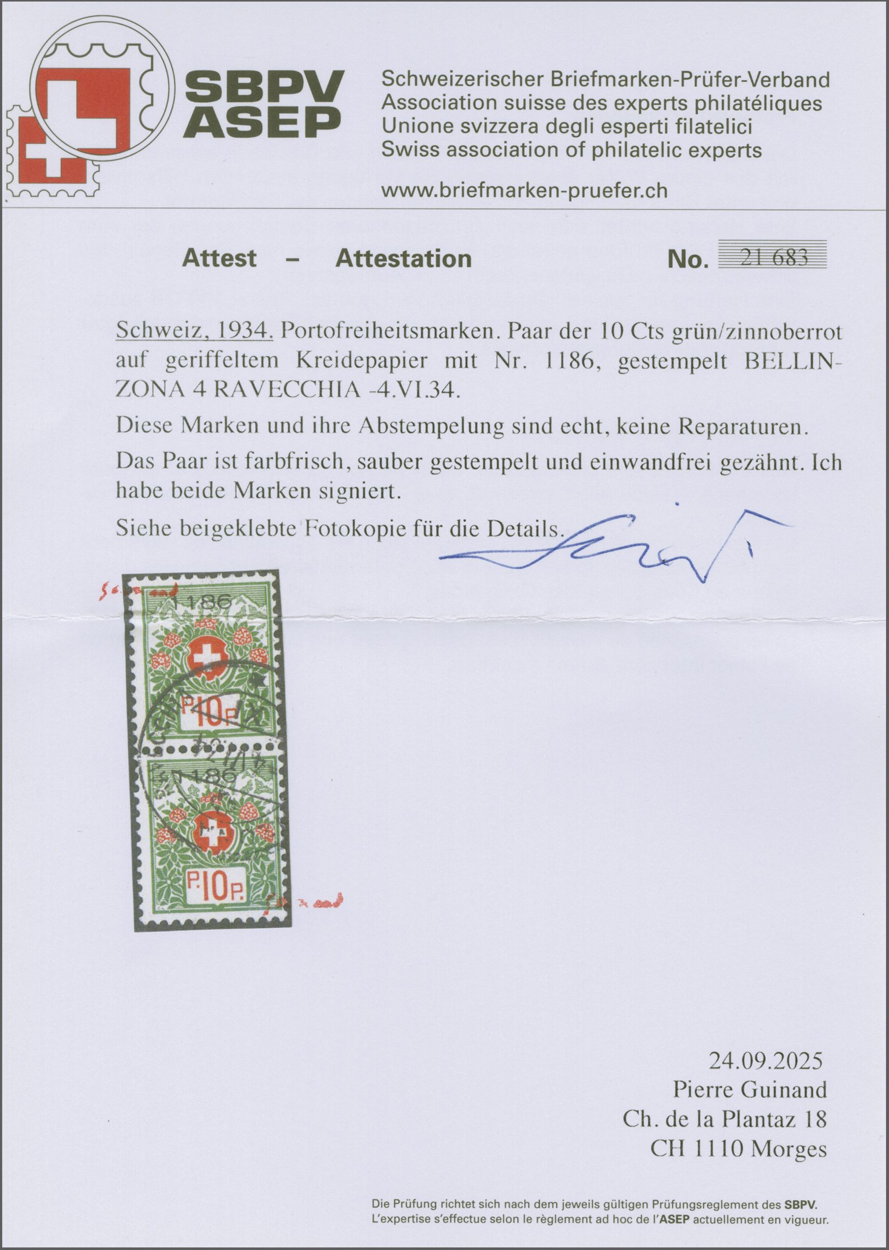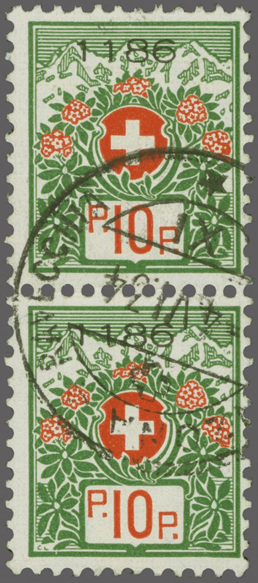 1934: Schweizer Wappen und Alpenrose 10 Rp. auf gekreidetem Faserpapier mit geriffelter Gummierung im senkr. Paar, Kontrollnummer '1186' (Casa Bambini San Marco, Bellinzona), gut gez., leicht und sauber gest. "BELLINZONA -