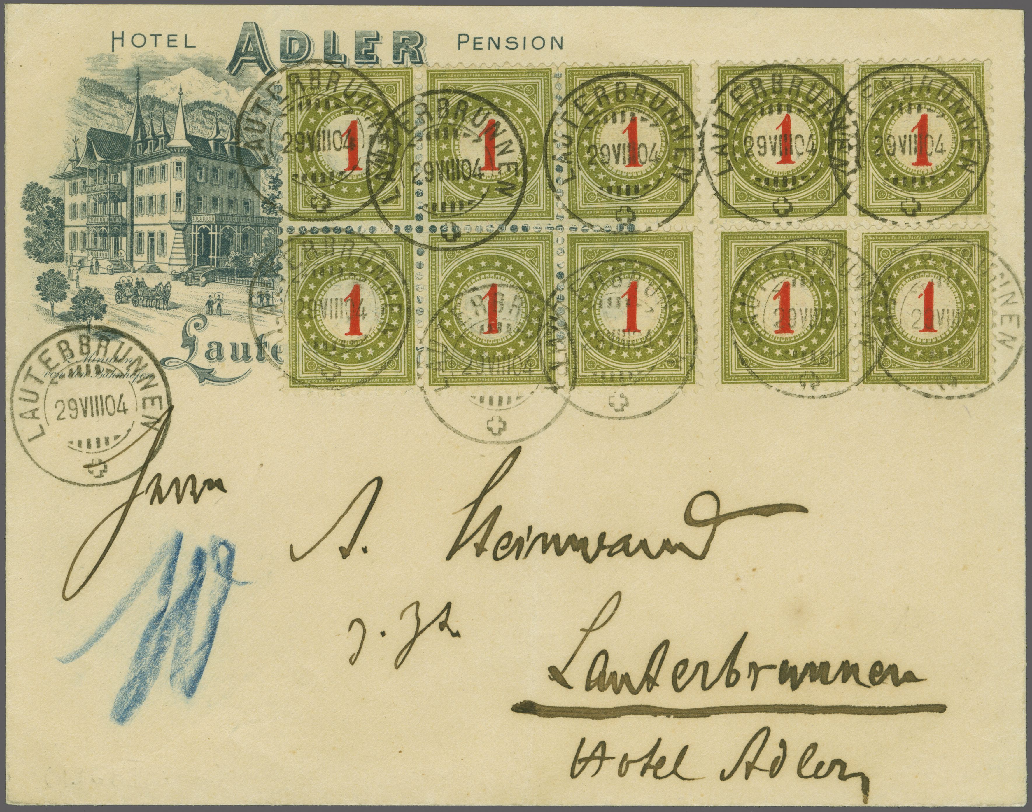 1904: 'Hotel-Pension ADLER' in Lauterbrunnen, illustr. Umschlag, vollständig fehlende Frankatur mit 10er-Block der 1 Rp. Porto austaxiert, jede Marke sehr dekorativ mit Vollstempel "Lauterbrunnen 29 VIII 04" entwertet,