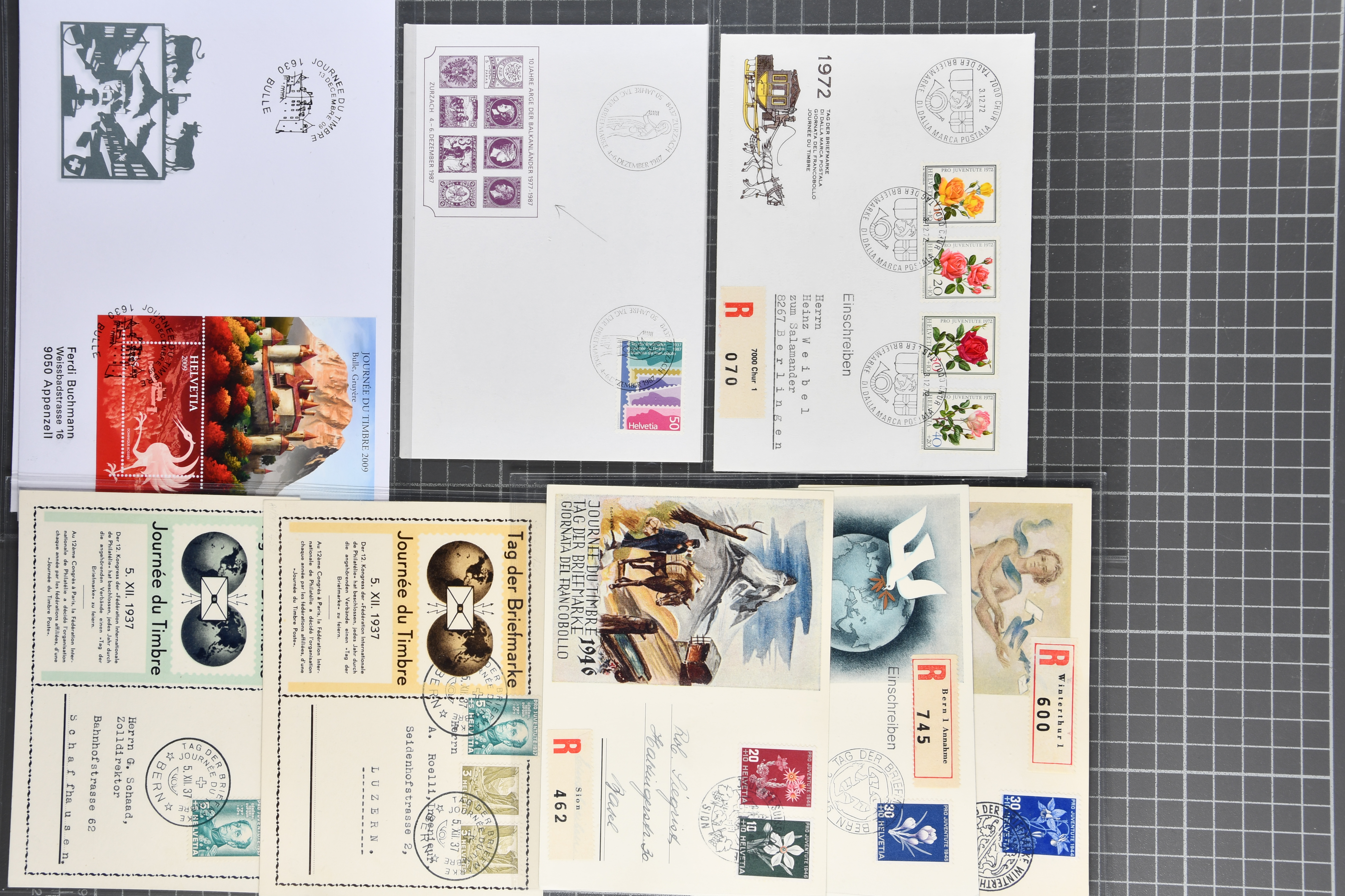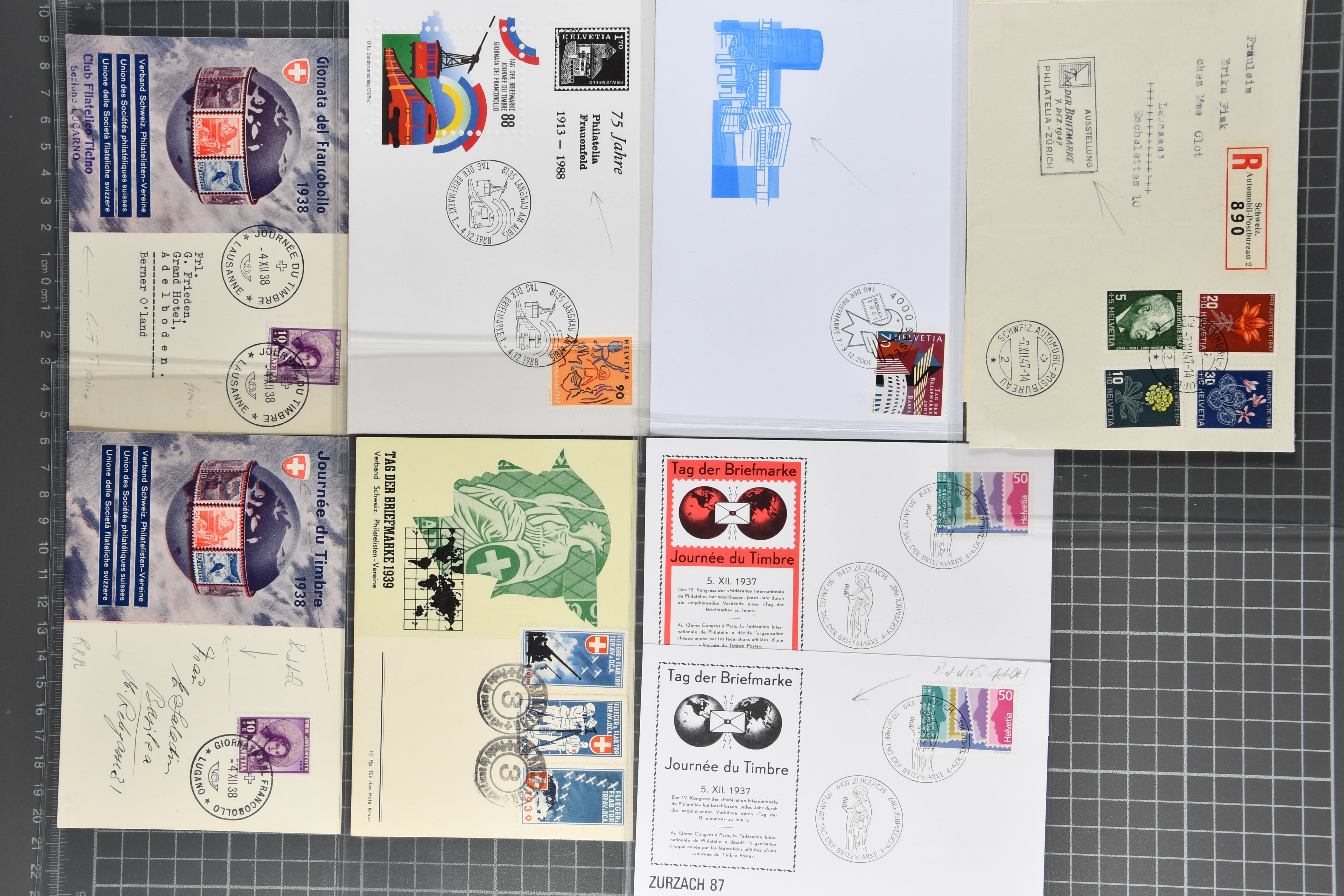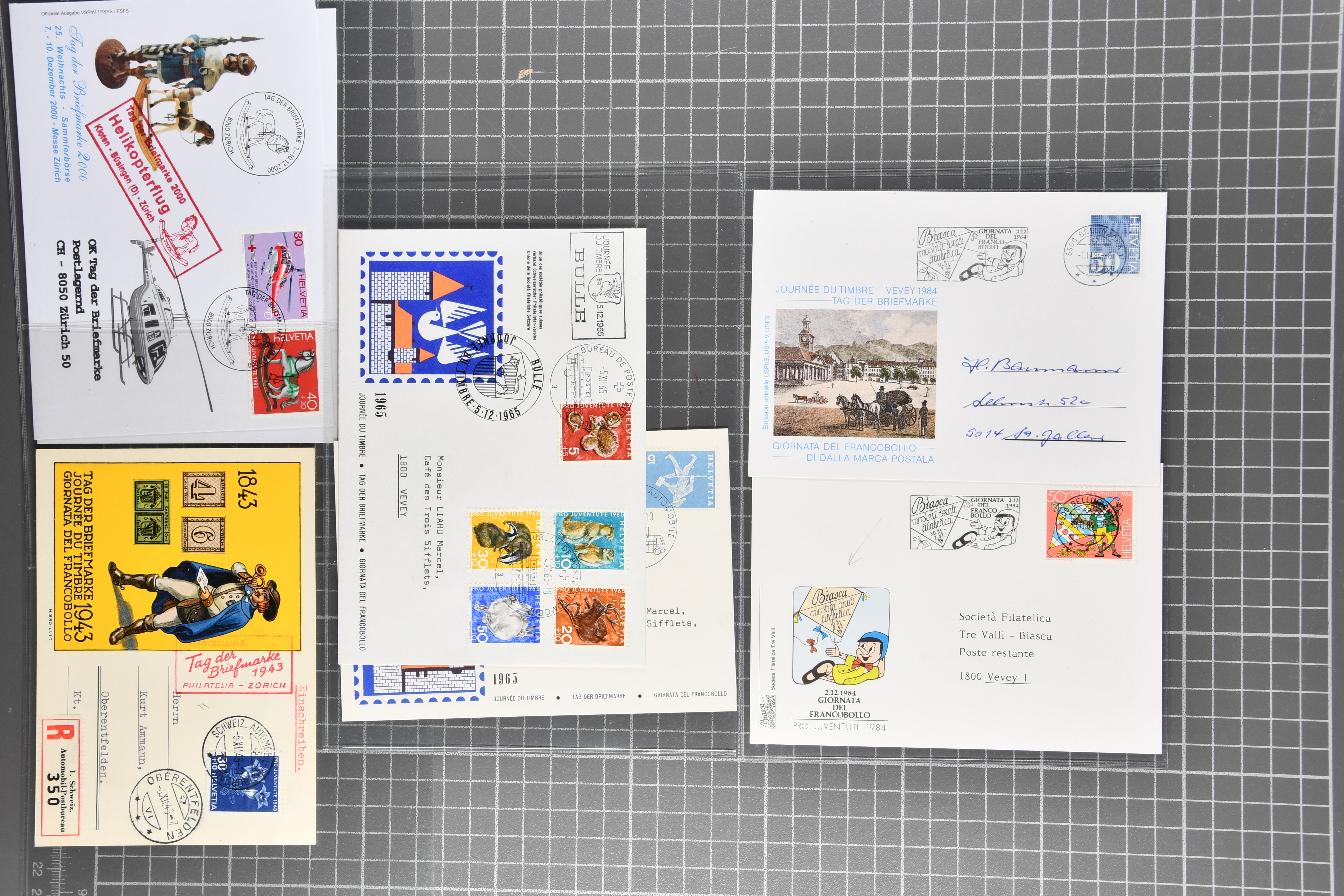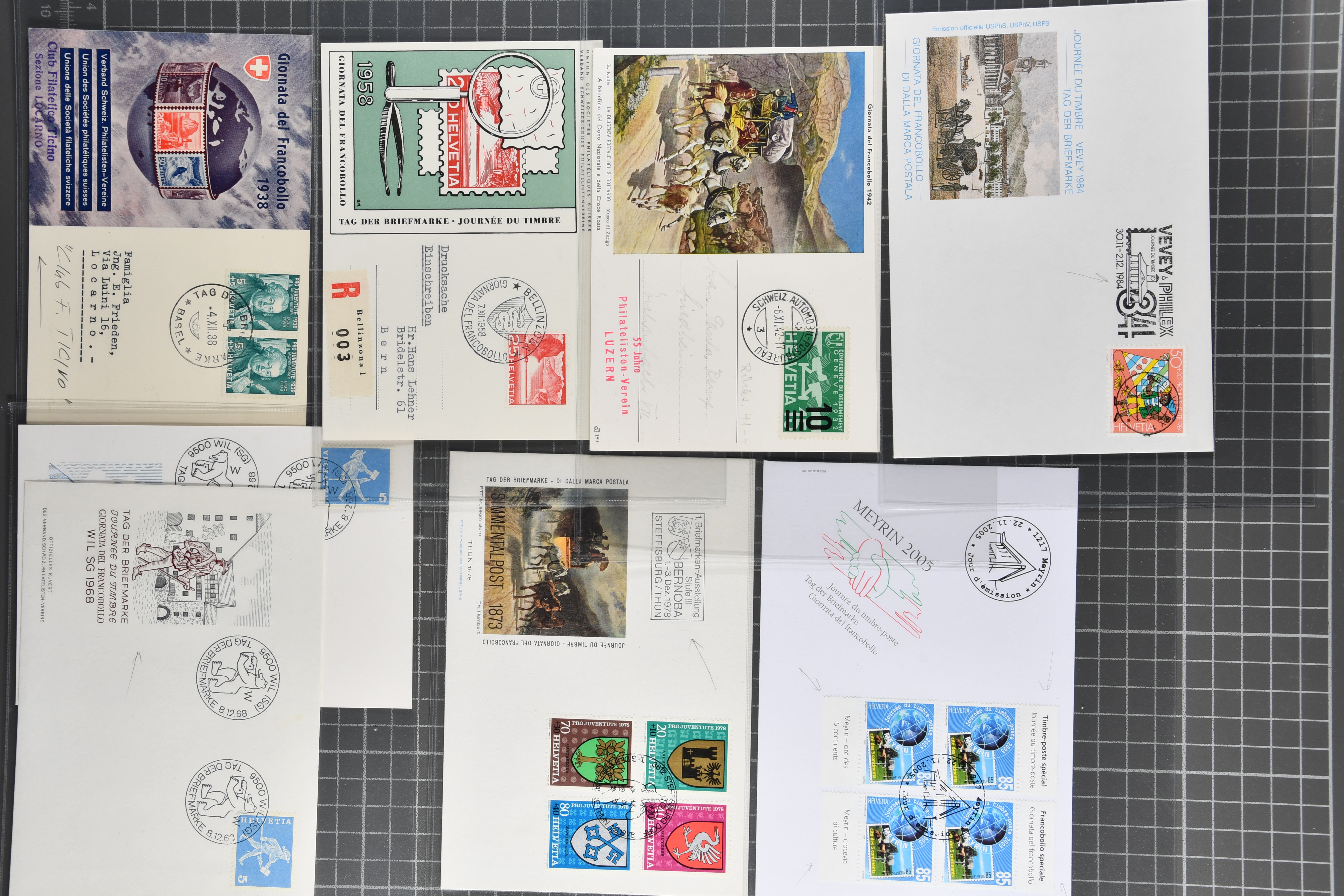 1938/2000: Tag der Briefmarke, aus einer Sammlungsauflösung, 35 Karten/Briefe, dabei viele bessere Ausgaben und Spezialitäten, insbesondere mit seltenen Zusatz-Stempeln oder auch Illustrationen, auch aus