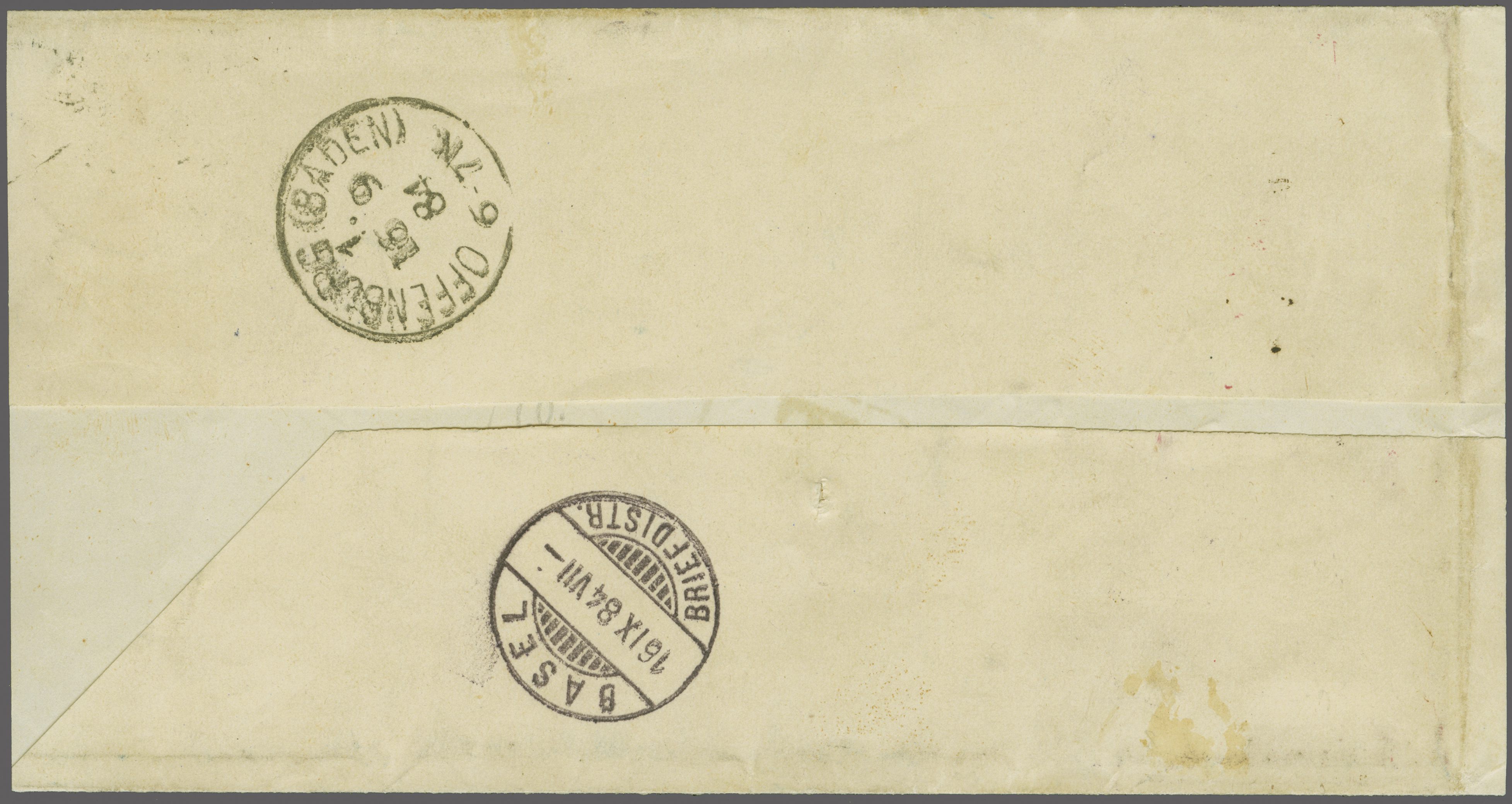 1884: 75 Rp.-Nachportofrankatur mit 3 versch. Werten aus versch. Ausgaben auf Brief von Offenburg (15 9 84) nach Basel adressiert, zwei Zustellversuche, letztlich refusiert nach DE und rot mehrfach "ungültig" gestempelt in