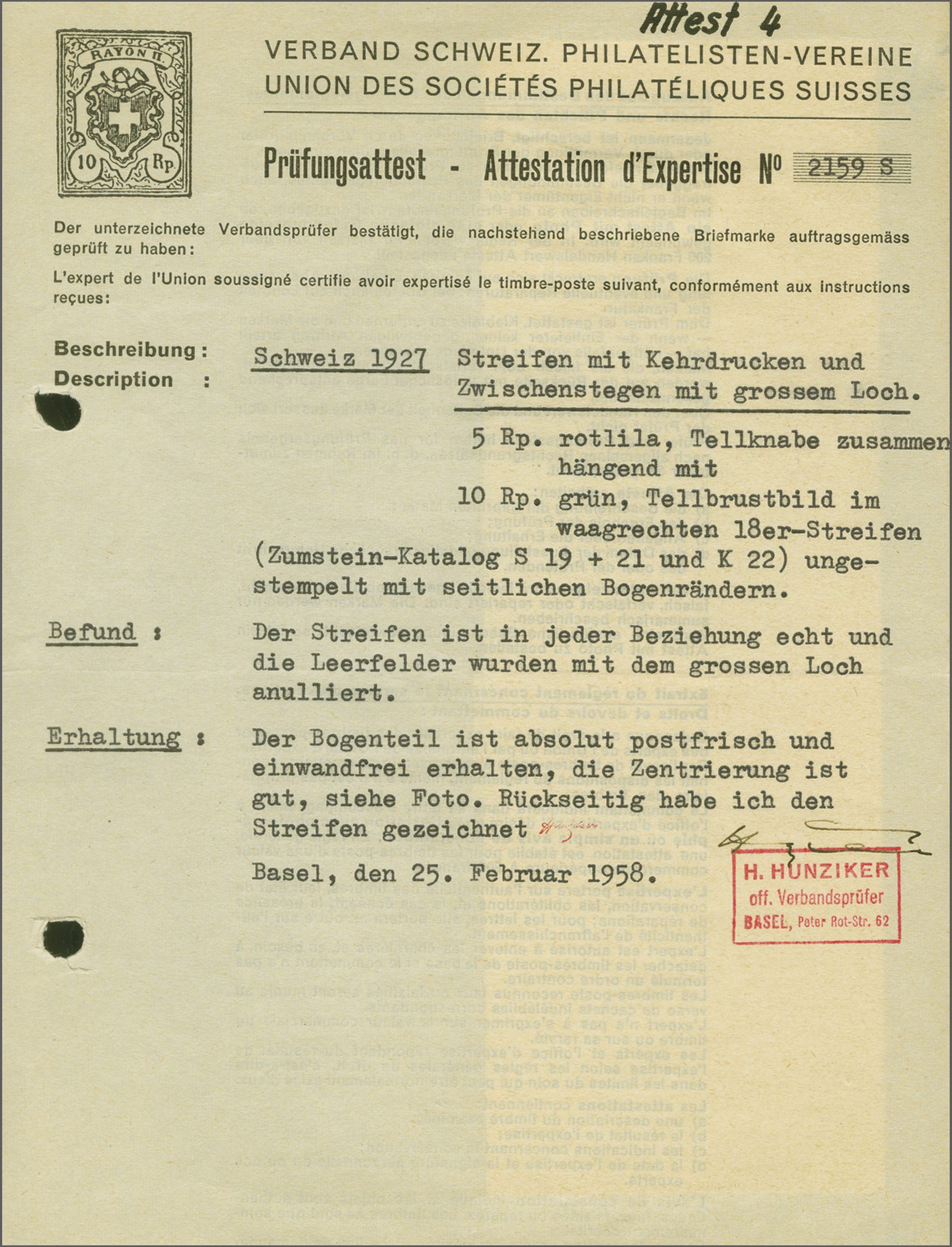 kleine Lochung S28 gestempelt. Gut in Steckbuch präsentiert, zwei Befunde, SBK = CHF 21'685 n. A. des Einlieferers (Image 1)