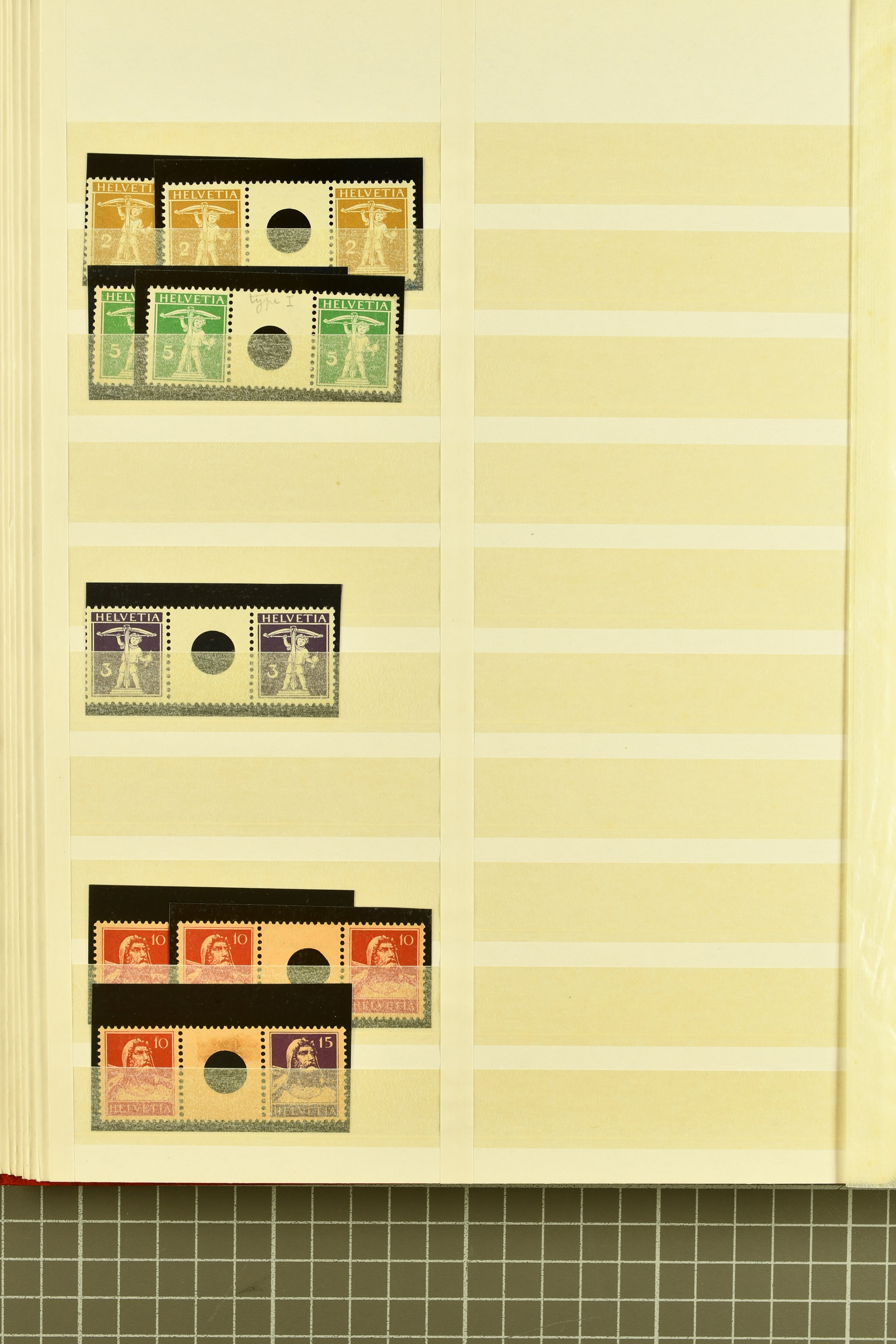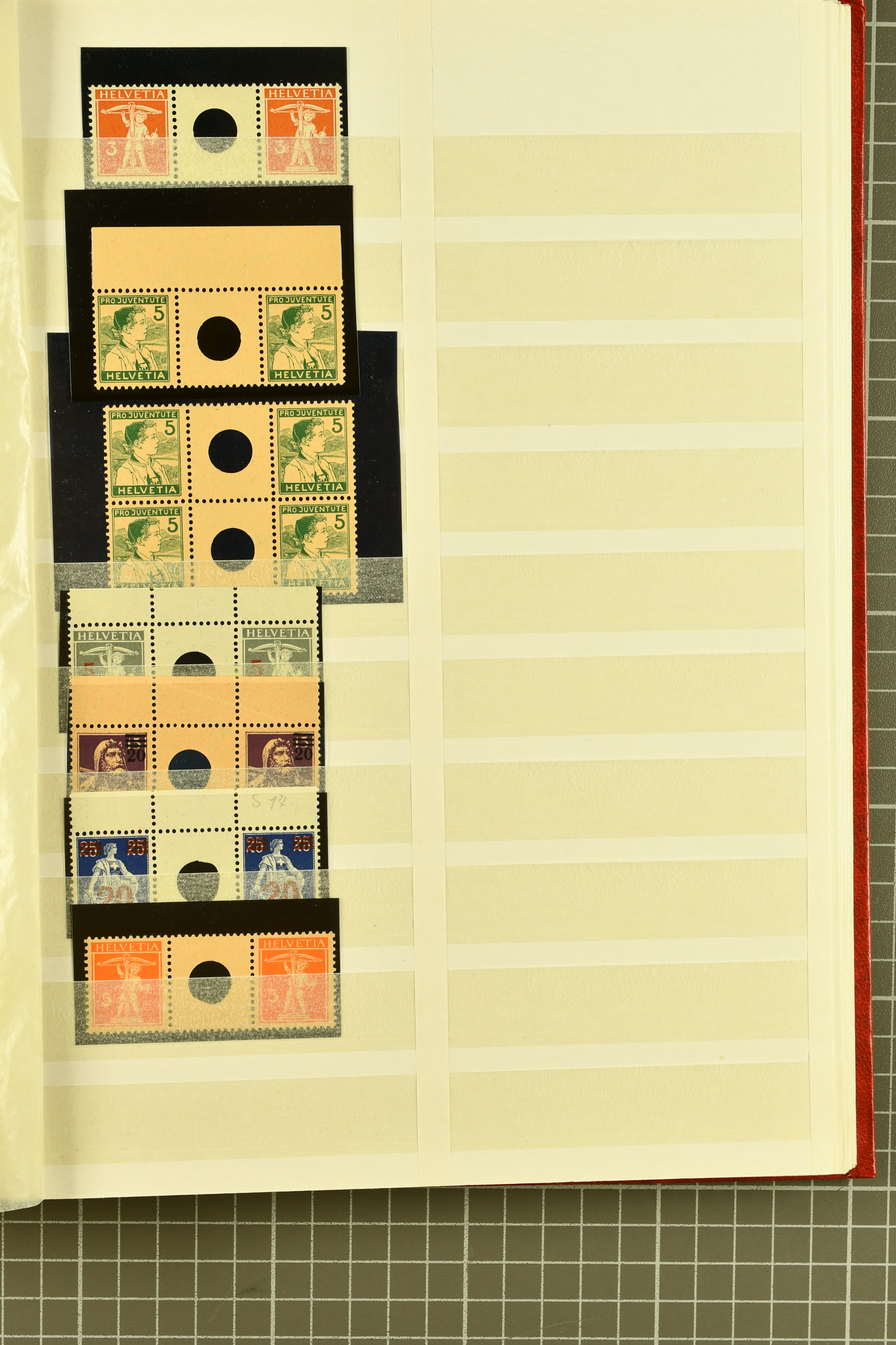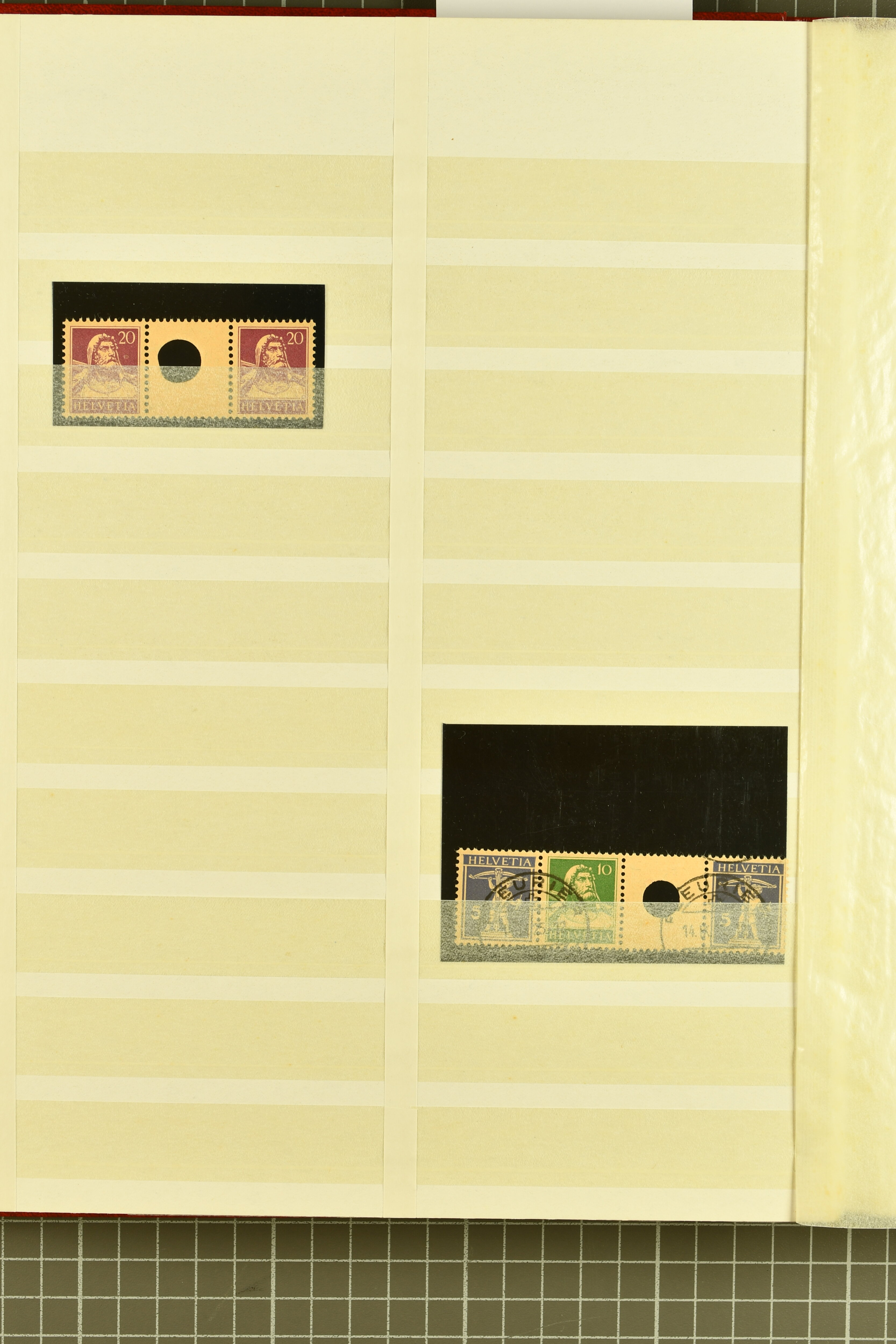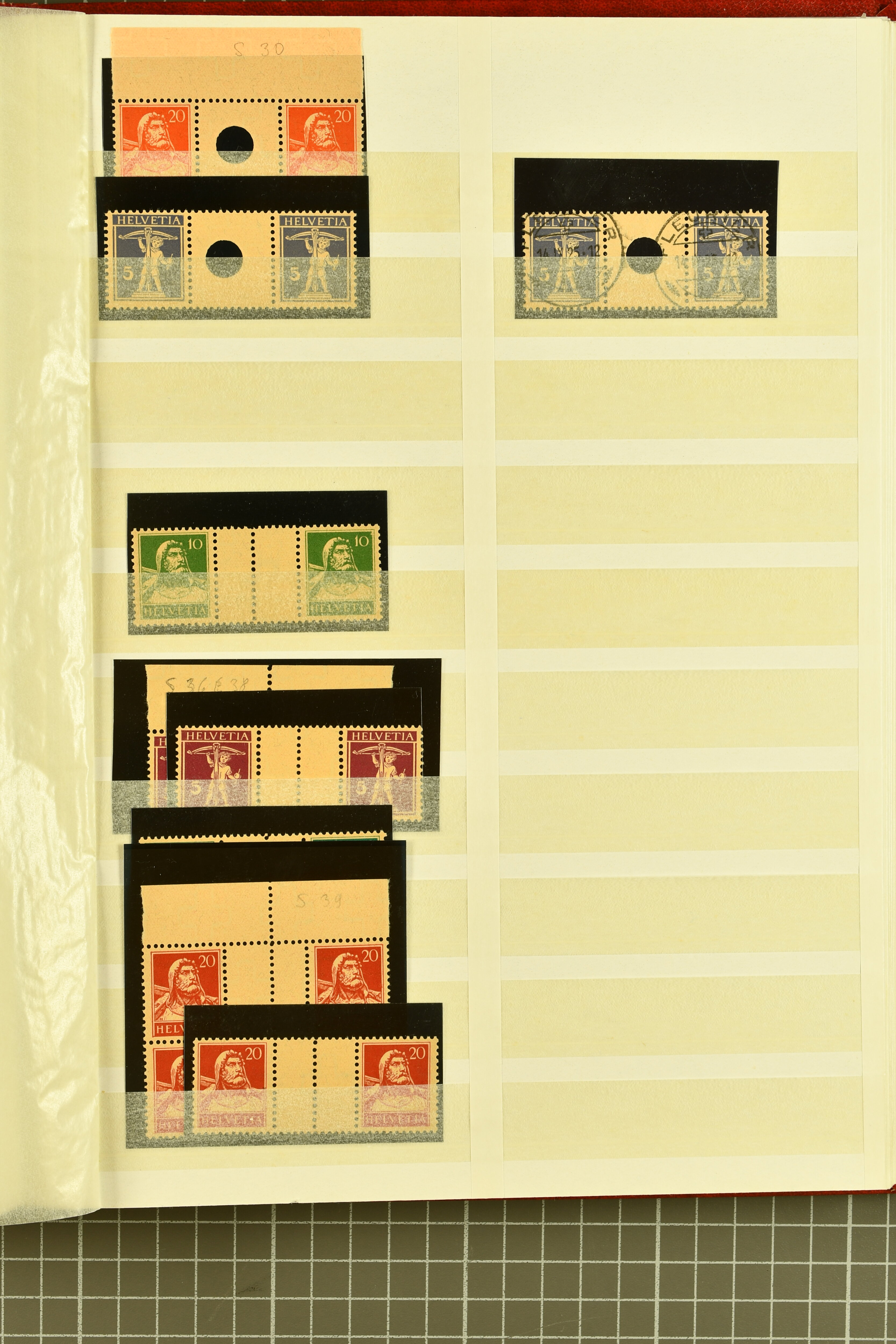 1927: Tellknabe 5 Rp. rotlila und Tellbrustbild 10 Rp. grün im Zwanzigerbogenteil, worin 5 Rp. rotlila im Zwischenstegpaar mit grosser Lochung, 5 Rp. rotlila und 10 Rp. grün im Zwischenstegpaar mit grosser Lochung und zwei