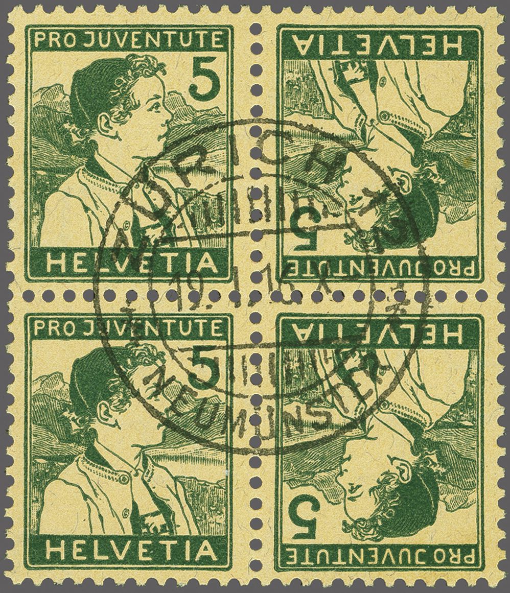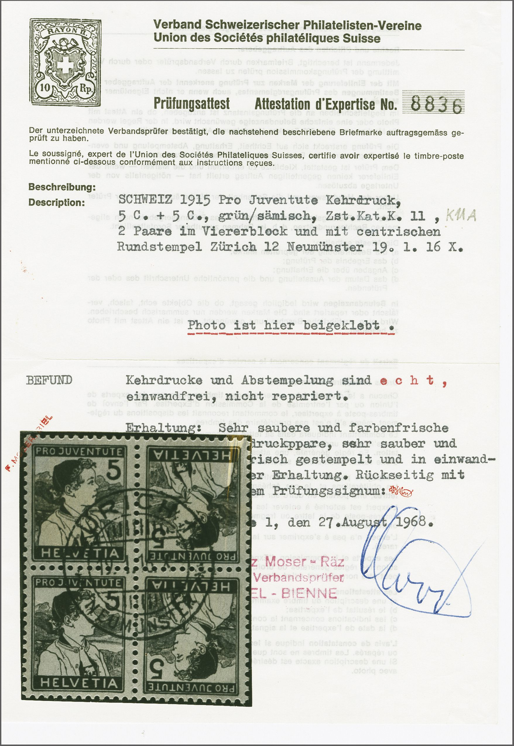 1915: Appenzellerknabe 5 Rp. grün, Doppelstück des Kehrdrucks (wie Viererblock), gest. "ZÜRICH 12 NEUMÜNSTER 19.1.16 X.", Attest und sign. Moser (1968), Zu Spez = CHF 2'800 (Image 1)