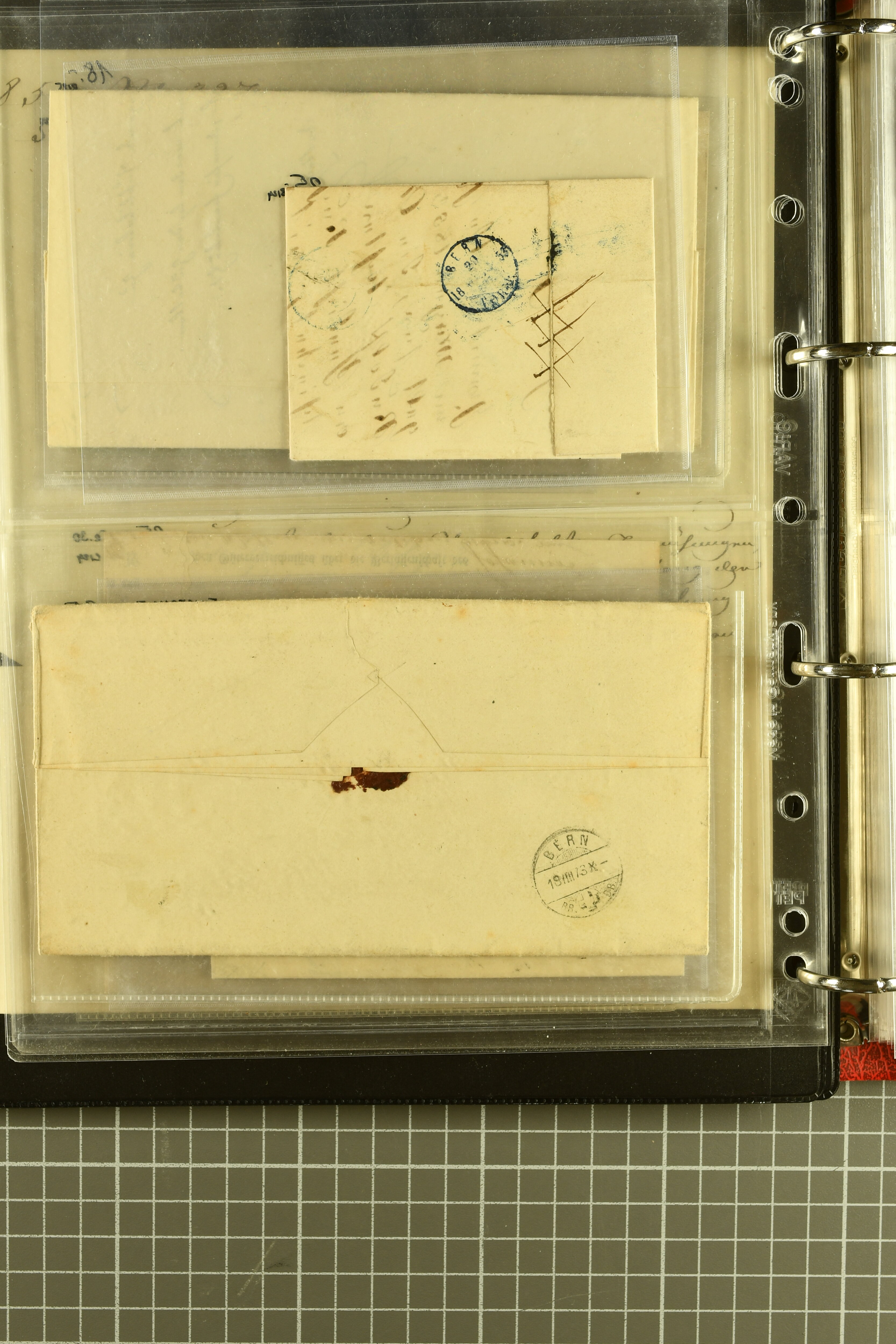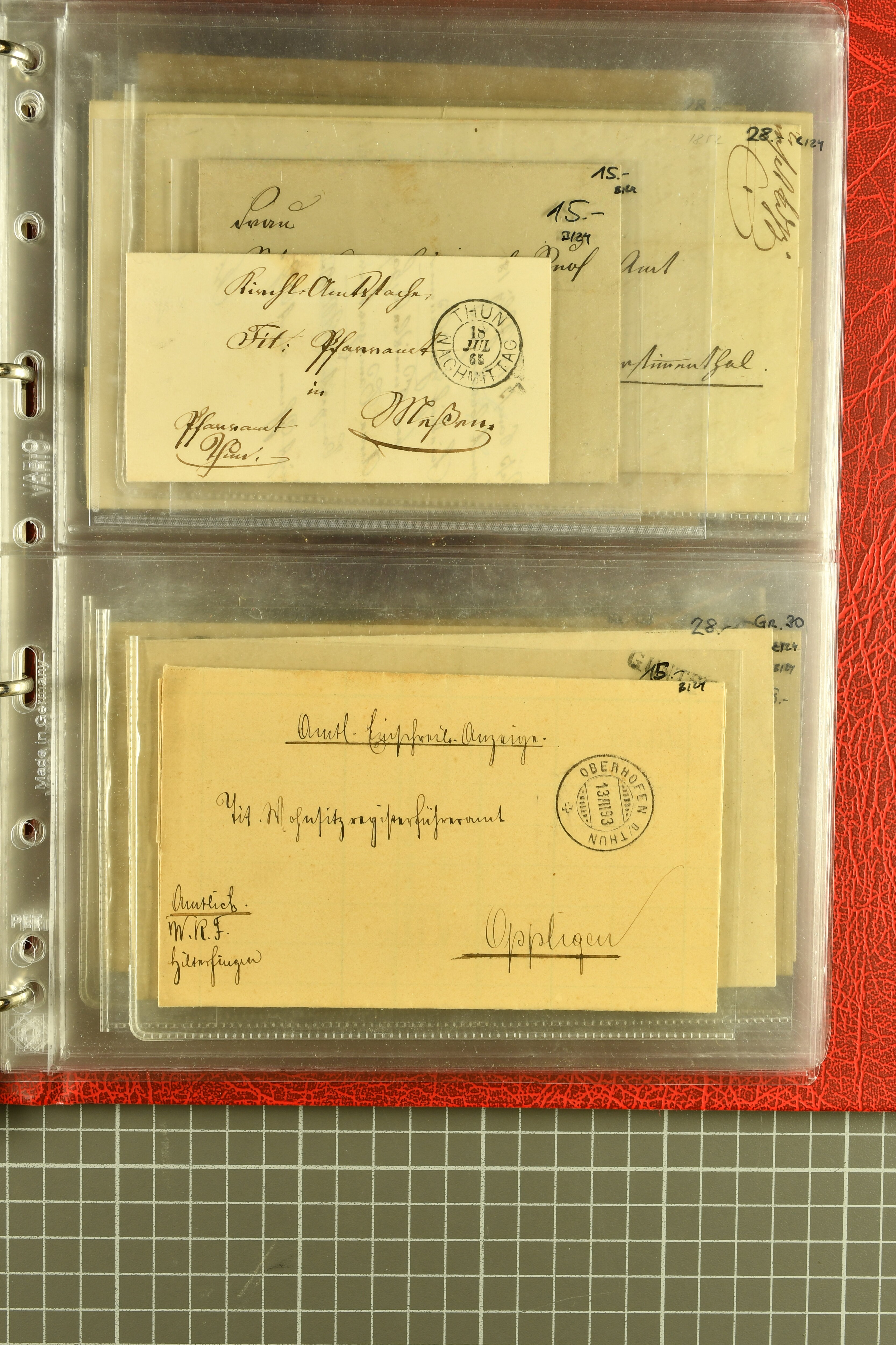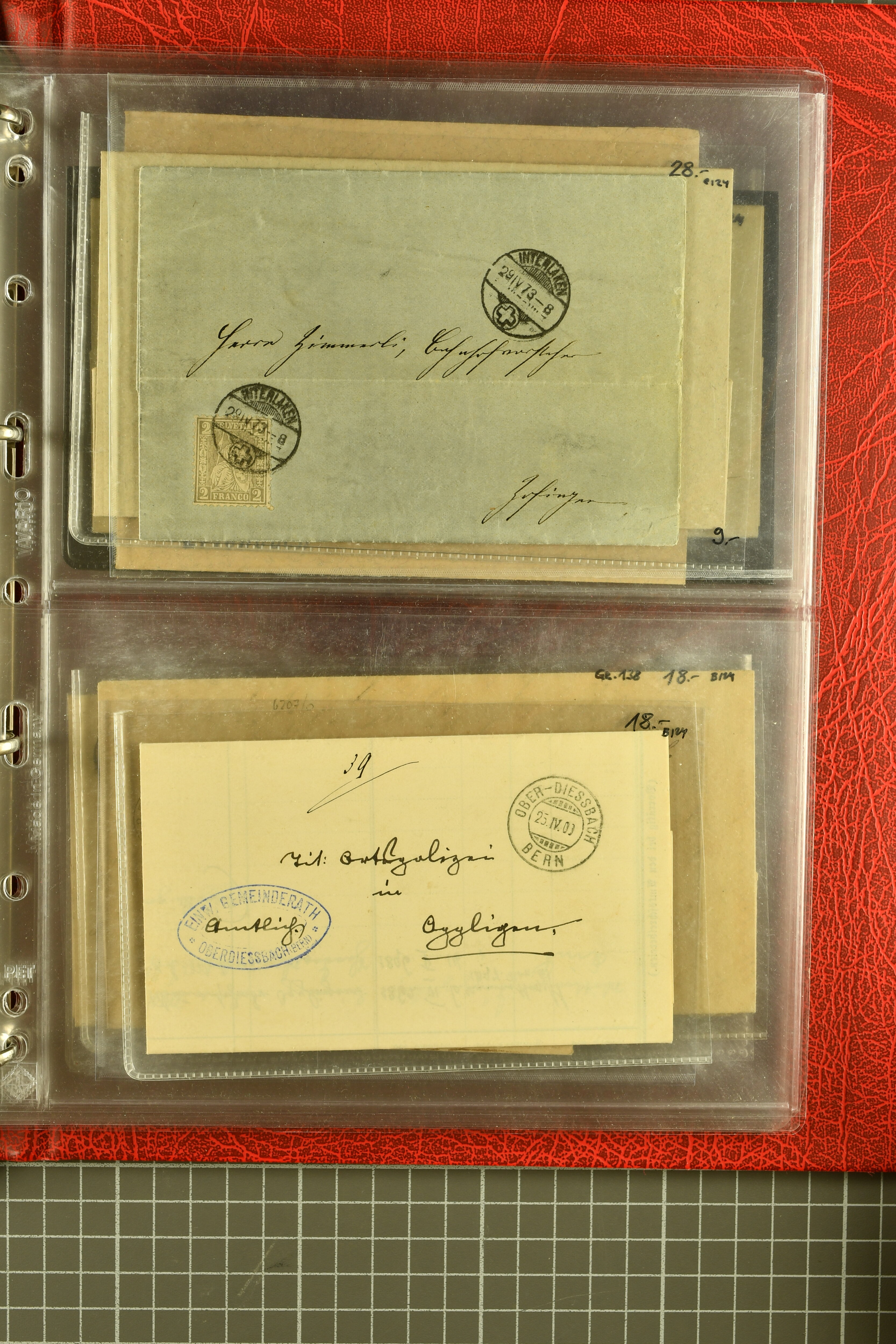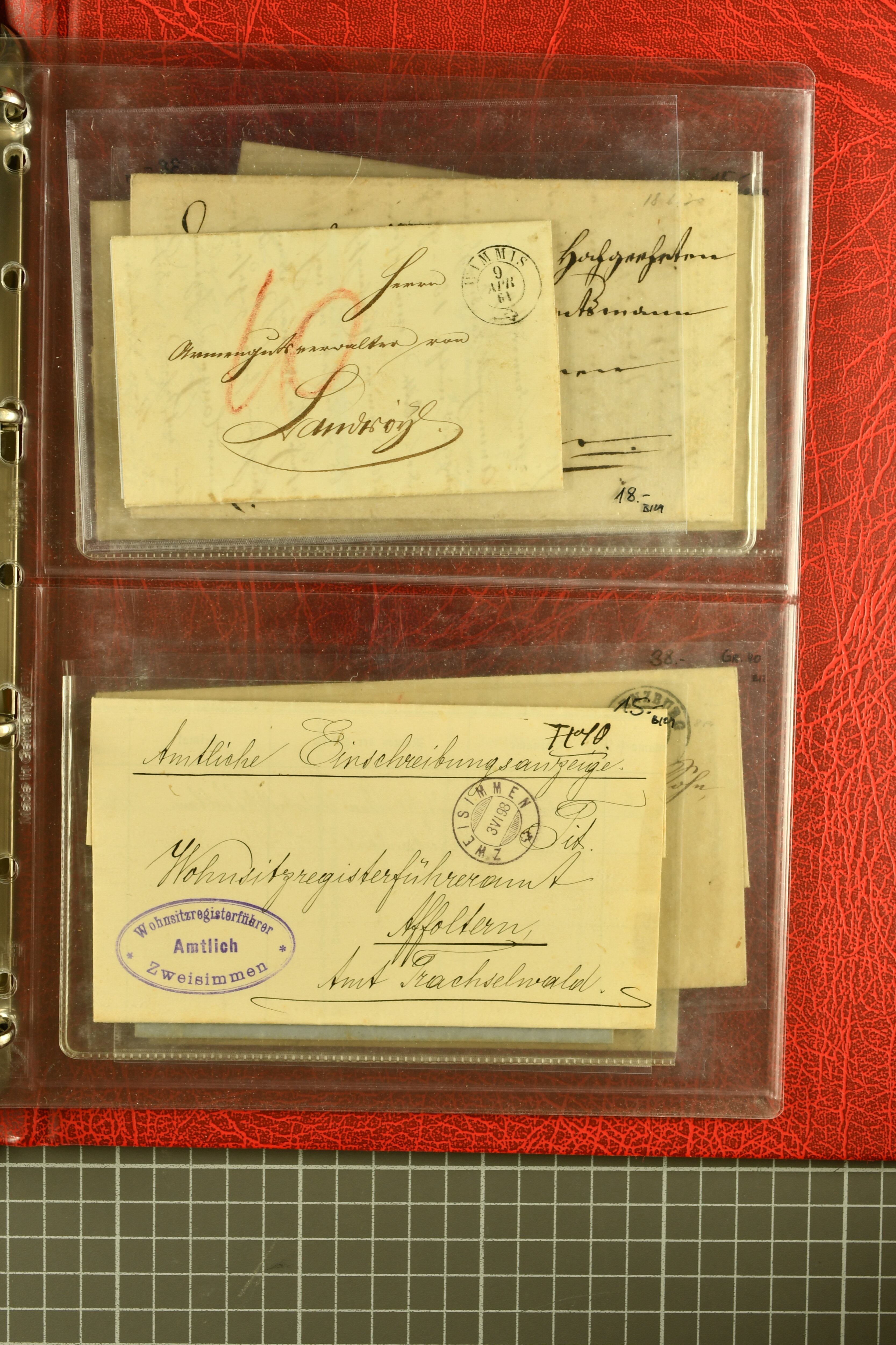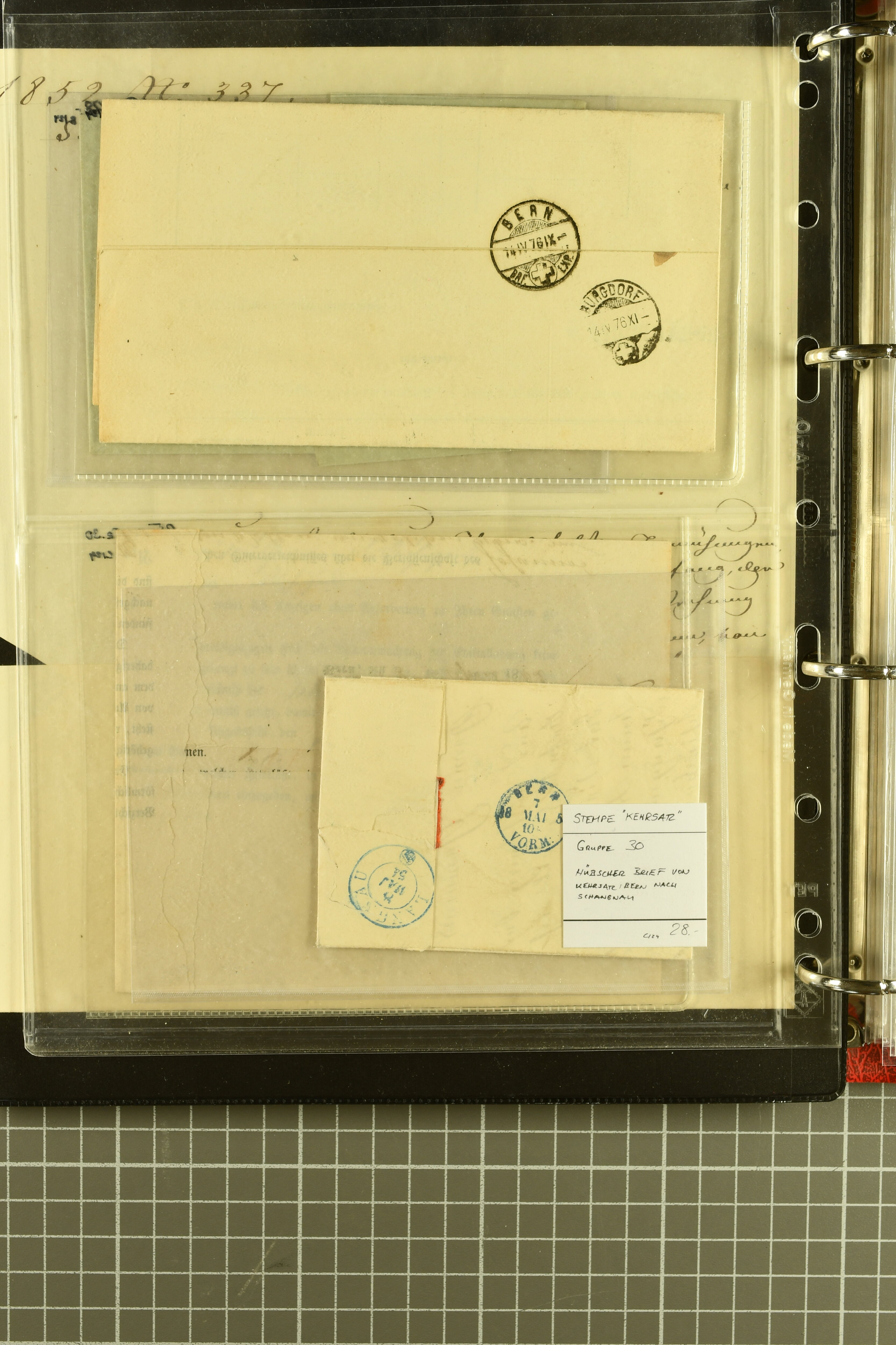 9873 cover imageKt. Bern 1835/1909: Lot 50 Briefe, dabei 1853 Rayon III Typen 7 & 9 auf Einschreibebrief gest. "Bern 8 Feb. 53 DB" (Befund Marchand), Chargé-Brief frankiert mit Sitz. Helvetia 20 Rp. von Blankenburg, Ziffer 15 Rp. gelb auf Nachnahme von "Rüthi b/Riggisberg 12.1.88" nach Schwarzenburg, weiter div. amtliche Briefe ohne Marken aus dem Kanton Bern, dabei Brief vom 'Statthalteramt Seftigen via Belp (1854) nach Schwarzenburg, dazu Stabstp. auf Briefen von Brodhaus nach Oberwyl, Amsoldingen, Boll, Boltigen, Gunten, Heimberg, Kehrsatz, Mülinen, Oberwyl, Reutigen, Rueggisberg, Wangen, Zweisimmen. Ein schönes Angebot (Image 1) (Image 2) (Image 3) (Image 4) (Image 5) (Image 6) (Image 7) (Image 8) (Image 9) (Image 10) (Image 11) (Image 12) (Image 13) (Image 14) (Image 15) (Image 16) (Image 17) (Image 18) (Image 19) (Image 20) (Image 21) (Image 22) (Image 23) (Image 24) (Image 25) (Image 26) (Image 27) (Image 28) (Image 29) (Image 30) (Image 31) (Image 32) (Image 33) (Image 34) (Image 35) (Image 36) (Image 37) (Image 38) (Image 39) (Image 40) (Image 41) (Image 42) (Image 43) (Image 44) (Image 45) (Image 46) (Image 47) (Image 48) (Image 49) (Image 50)