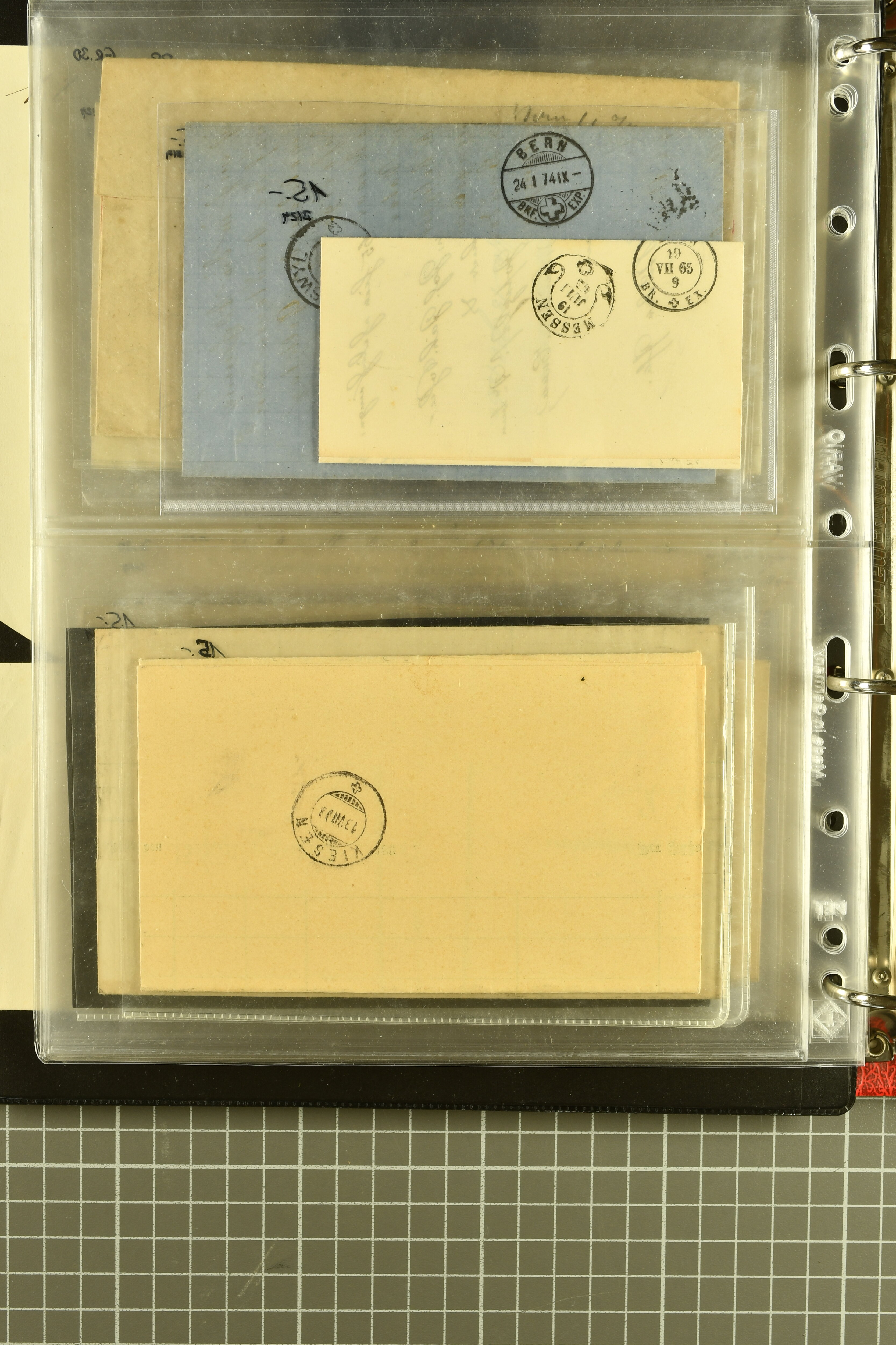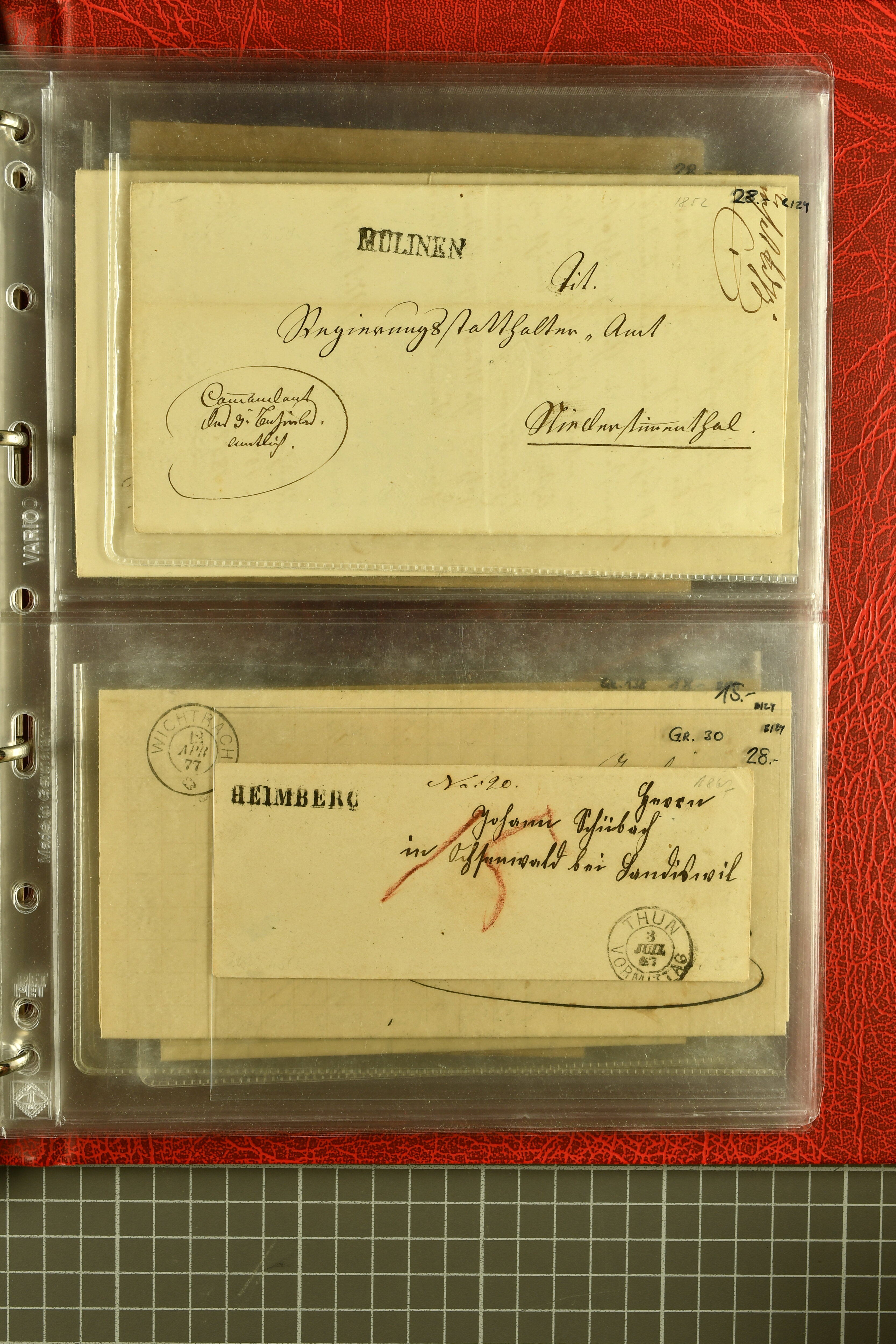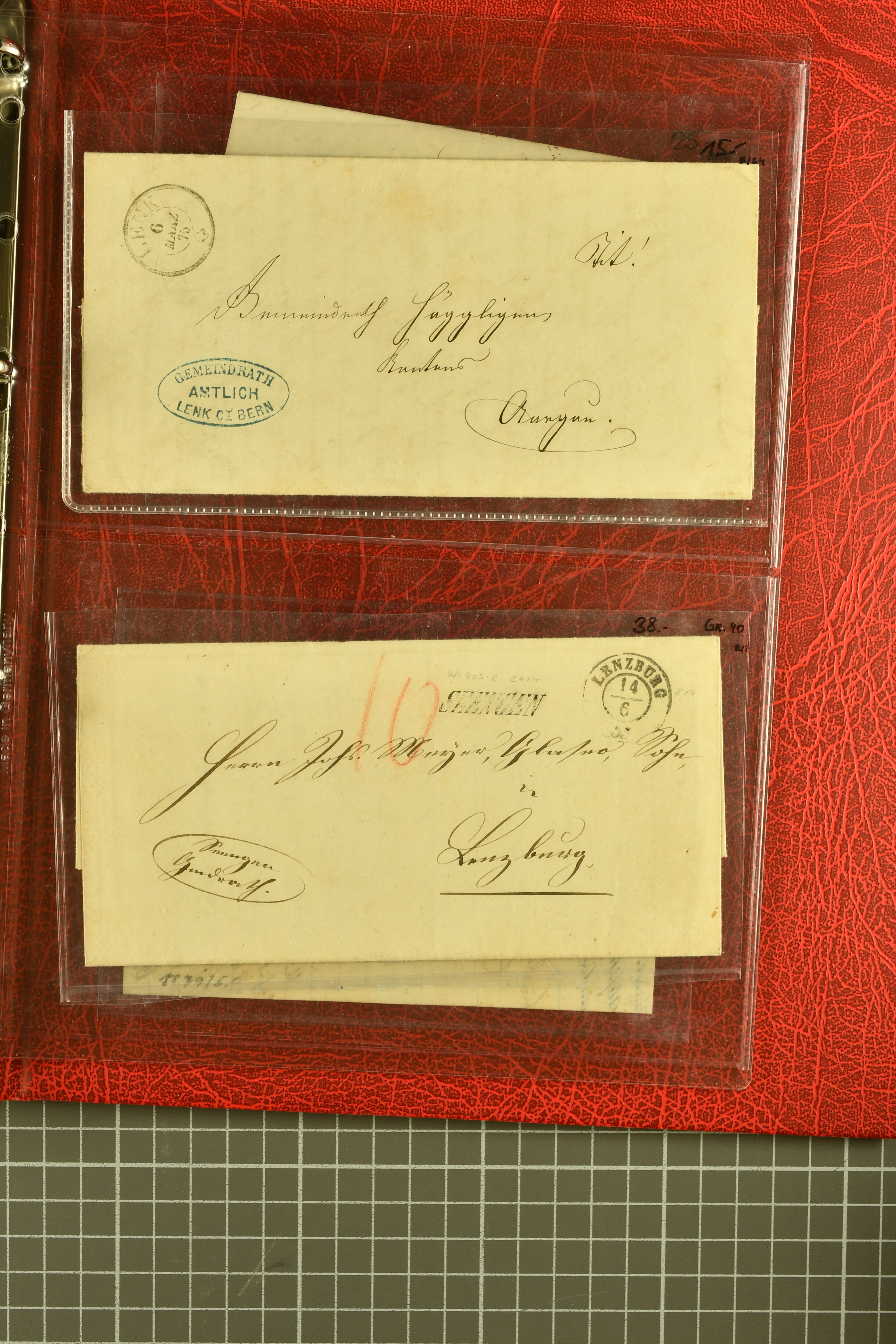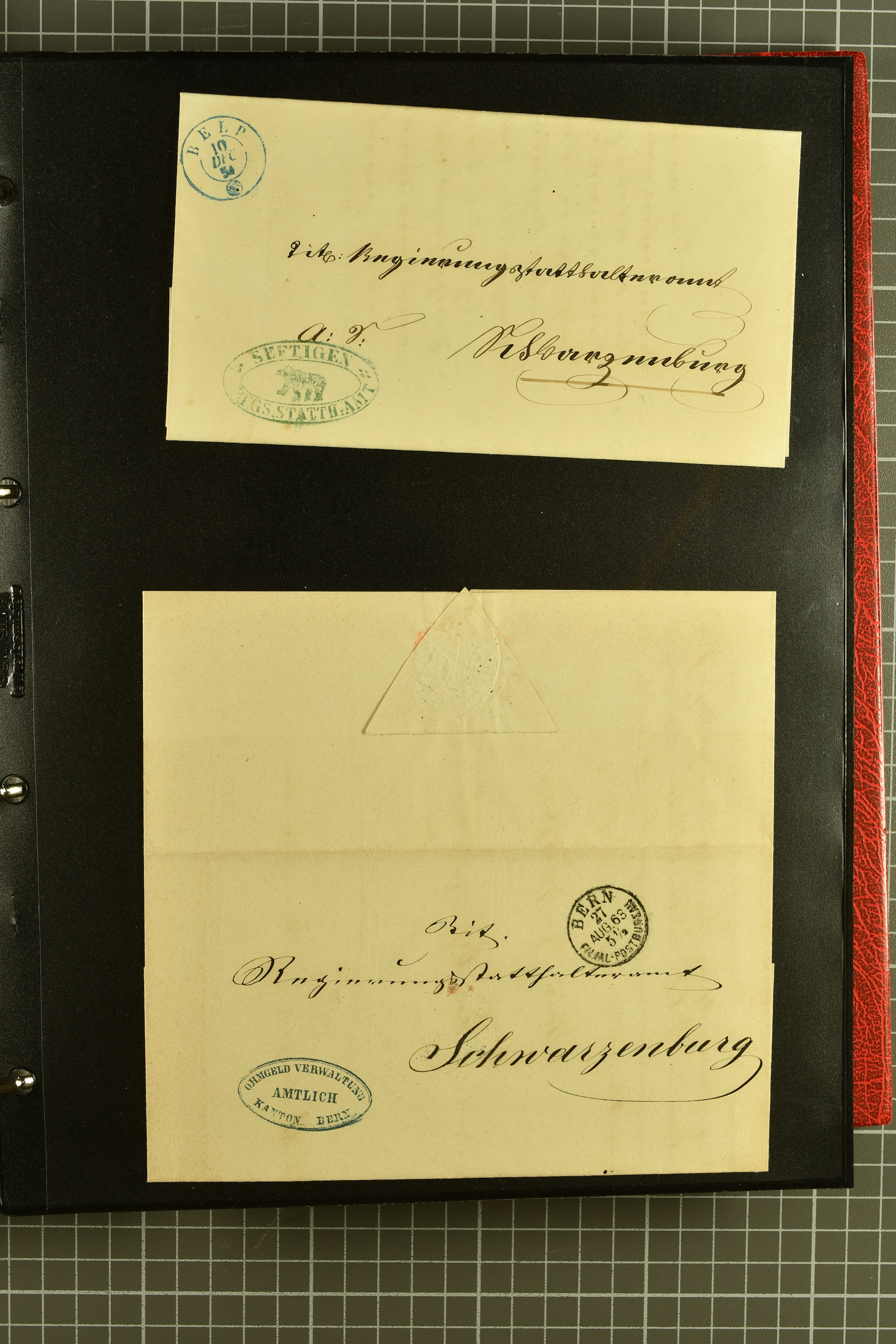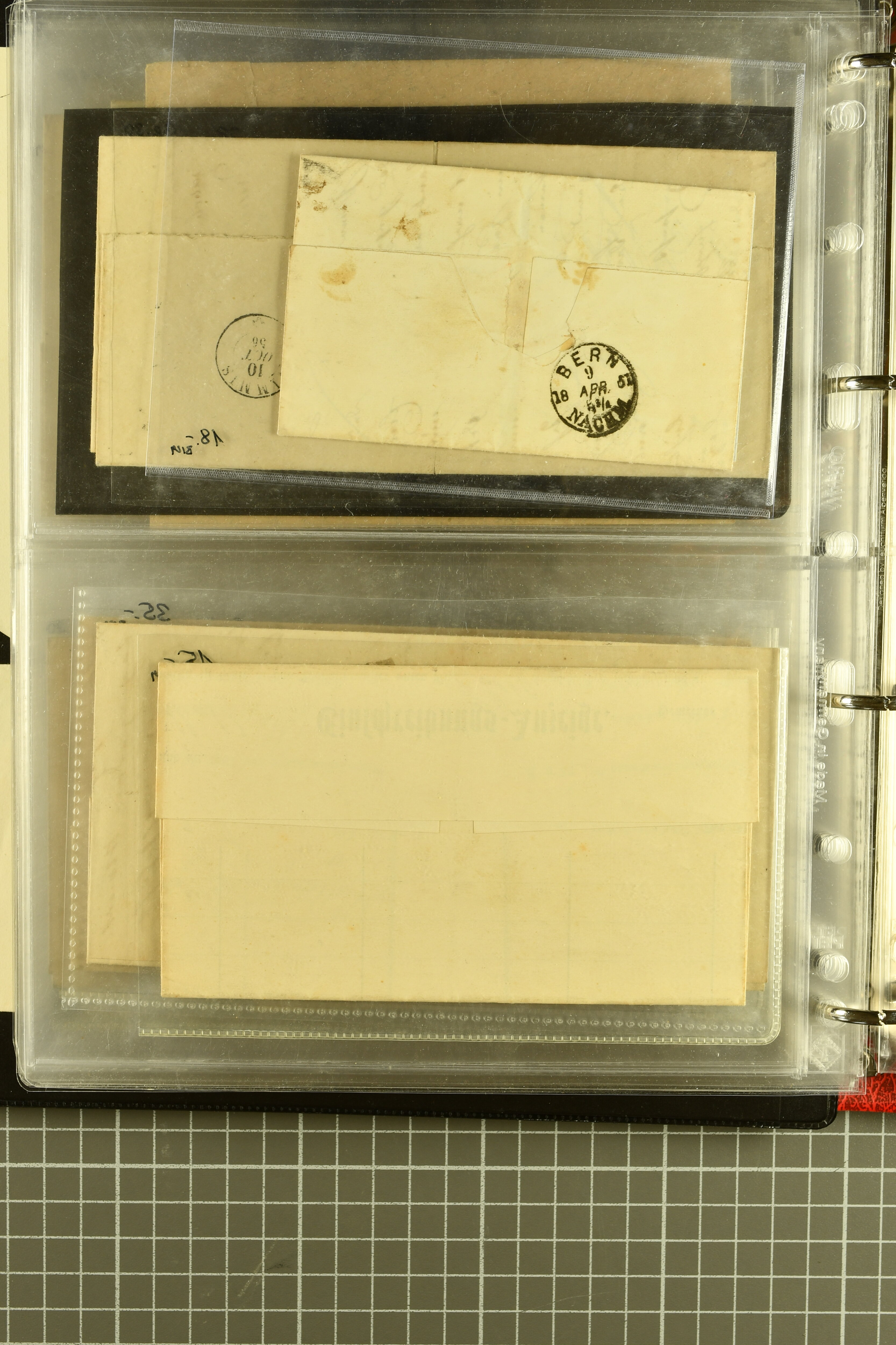 9873 cover imageKt. Bern 1835/1909: Lot 50 Briefe, dabei 1853 Rayon III Typen 7 & 9 auf Einschreibebrief gest. "Bern 8 Feb. 53 DB" (Befund Marchand), Chargé-Brief frankiert mit Sitz. Helvetia 20 Rp. von Blankenburg, Ziffer 15 Rp. gelb auf Nachnahme von "Rüthi b/Riggisberg 12.1.88" nach Schwarzenburg, weiter div. amtliche Briefe ohne Marken aus dem Kanton Bern, dabei Brief vom 'Statthalteramt Seftigen via Belp (1854) nach Schwarzenburg, dazu Stabstp. auf Briefen von Brodhaus nach Oberwyl, Amsoldingen, Boll, Boltigen, Gunten, Heimberg, Kehrsatz, Mülinen, Oberwyl, Reutigen, Rueggisberg, Wangen, Zweisimmen. Ein schönes Angebot (Image 1) (Image 2) (Image 3) (Image 4) (Image 5) (Image 6) (Image 7) (Image 8) (Image 9) (Image 10) (Image 11) (Image 12) (Image 13) (Image 14) (Image 15) (Image 16) (Image 17) (Image 18) (Image 19) (Image 20) (Image 21) (Image 22) (Image 23) (Image 24) (Image 25) (Image 26) (Image 27) (Image 28) (Image 29) (Image 30) (Image 31) (Image 32) (Image 33) (Image 34) (Image 35) (Image 36) (Image 37) (Image 38) (Image 39) (Image 40) (Image 41) (Image 42) (Image 43) (Image 44) (Image 45) (Image 46) (Image 47) (Image 48) (Image 49) (Image 50)