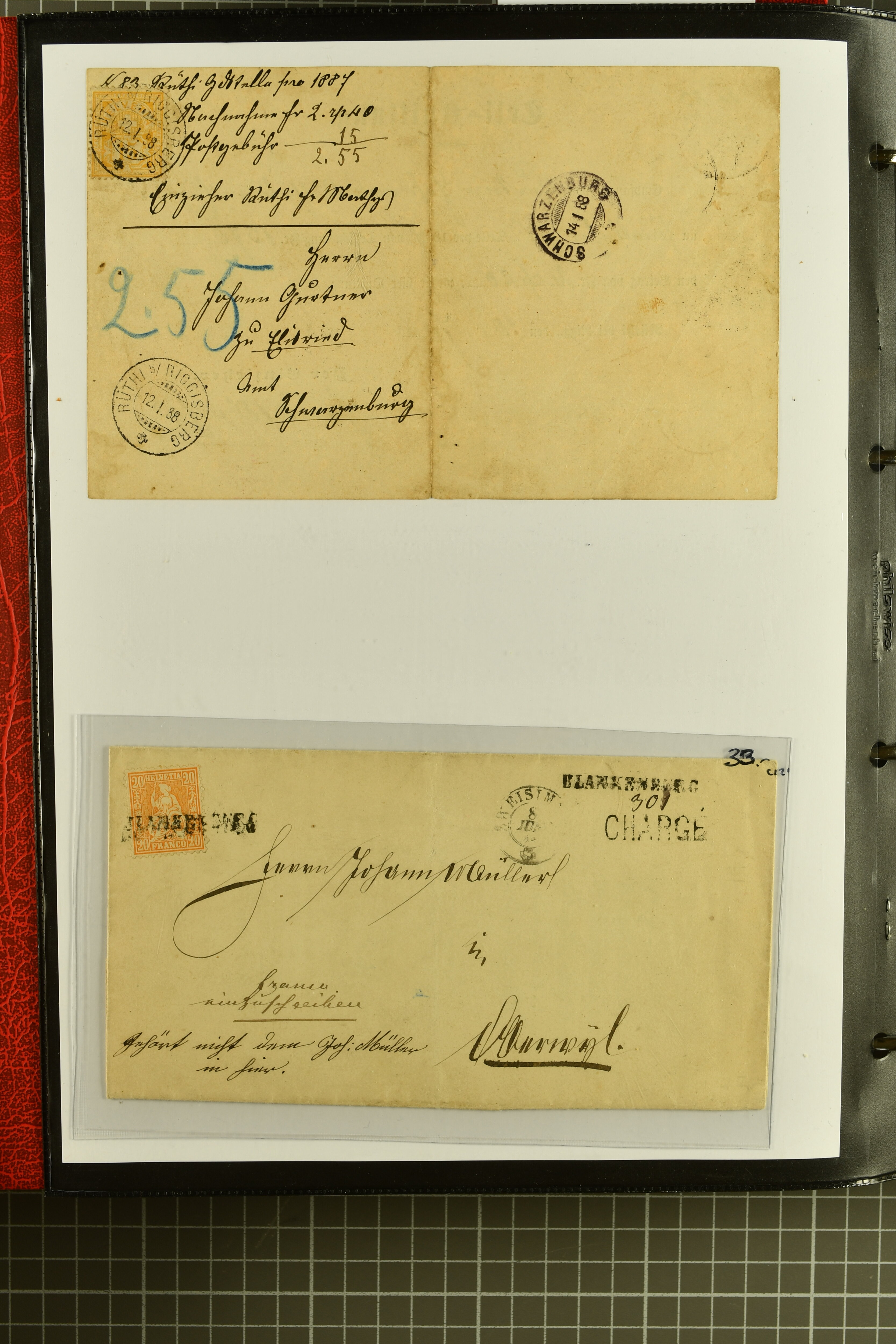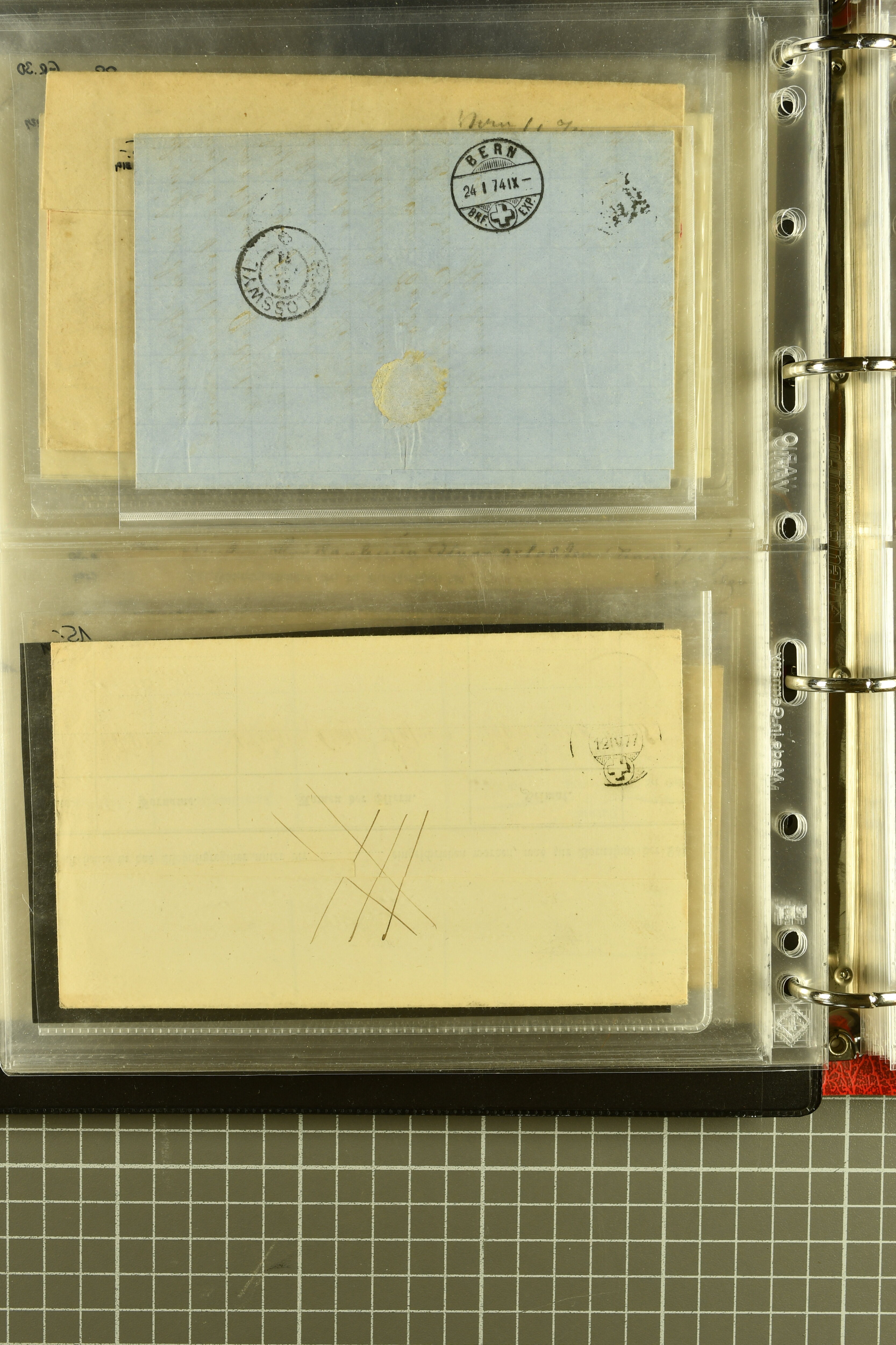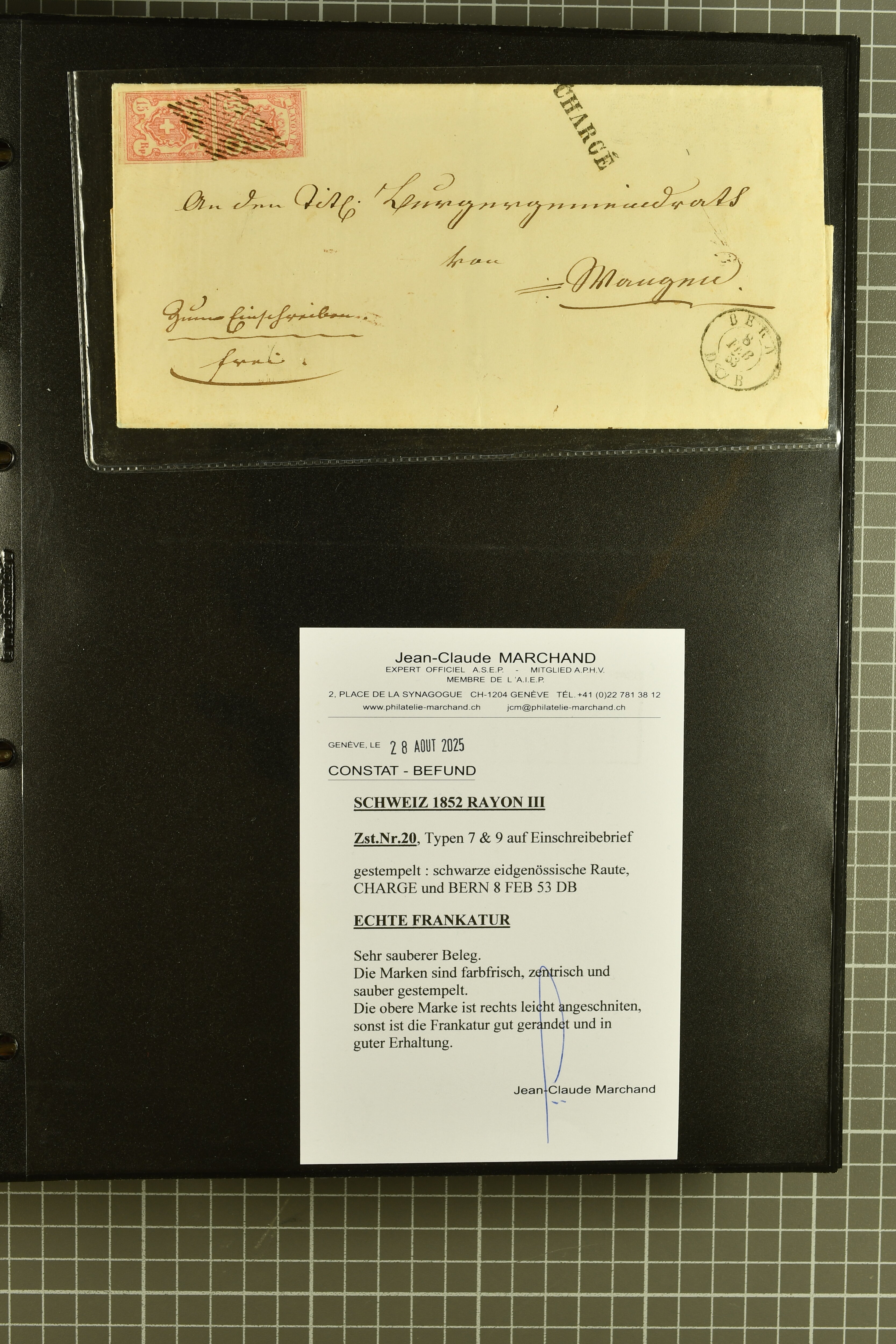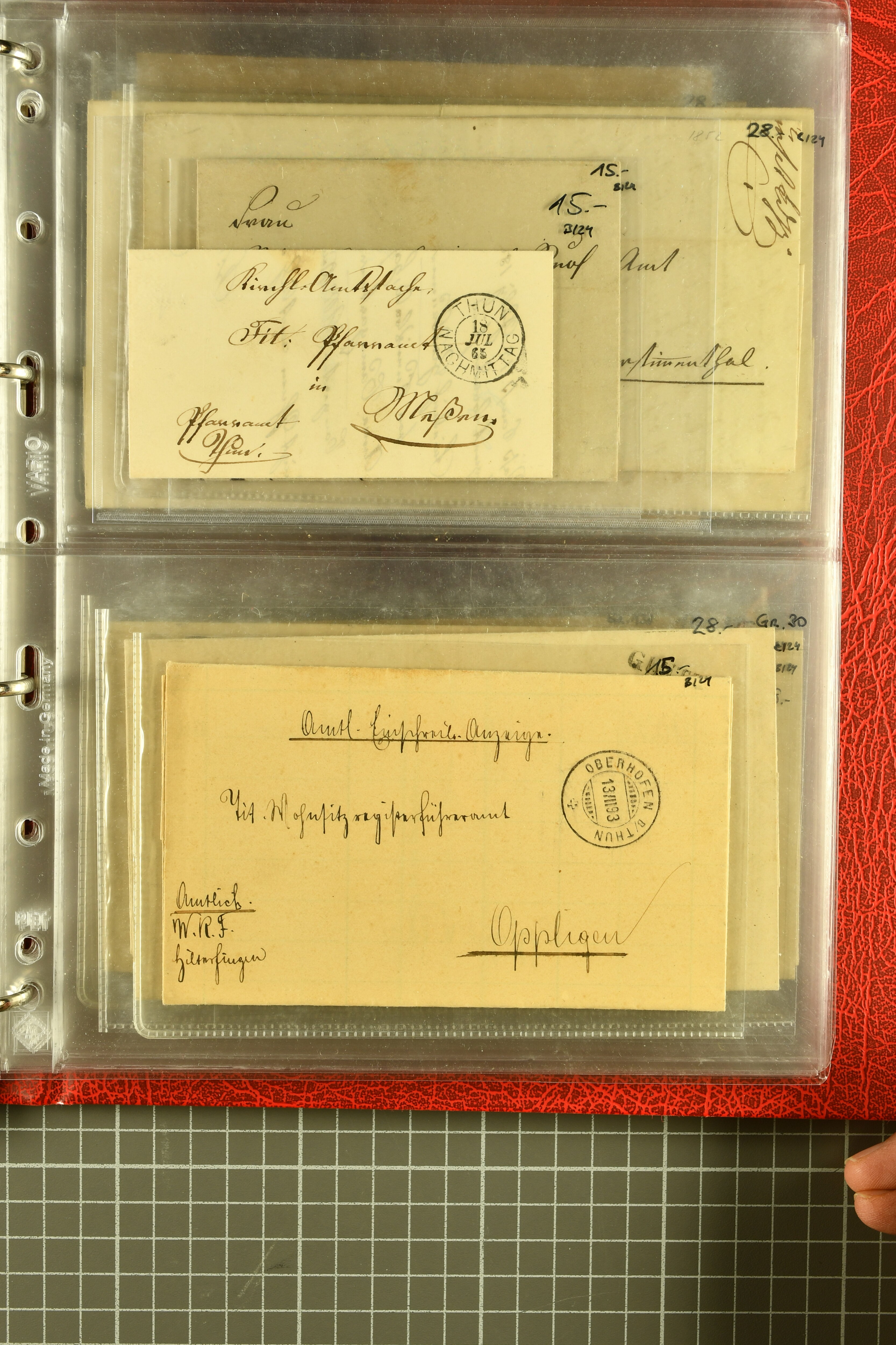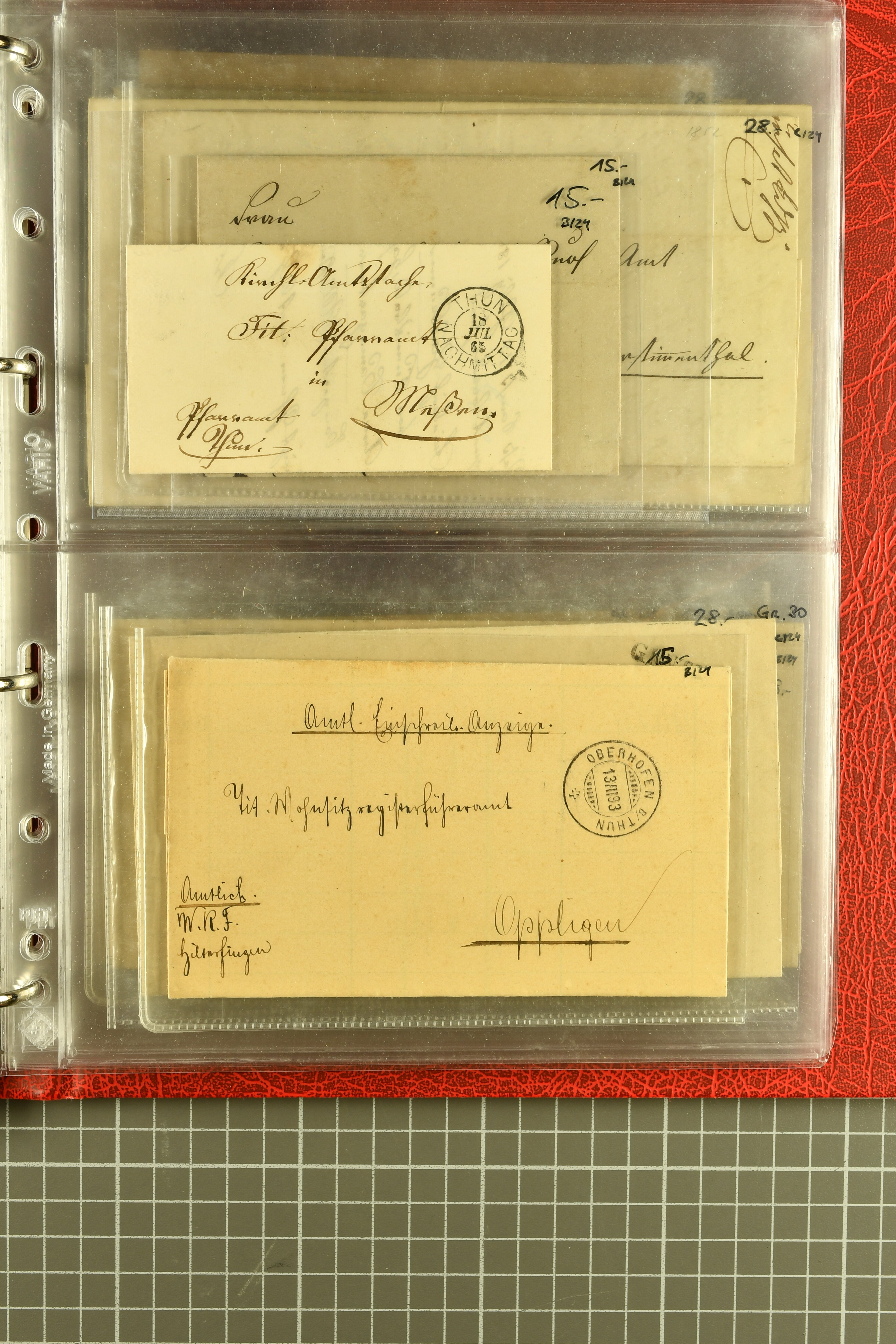 9873 cover imageKt. Bern 1835/1909: Lot 50 Briefe, dabei 1853 Rayon III Typen 7 & 9 auf Einschreibebrief gest. "Bern 8 Feb. 53 DB" (Befund Marchand), Chargé-Brief frankiert mit Sitz. Helvetia 20 Rp. von Blankenburg, Ziffer 15 Rp. gelb auf Nachnahme von "Rüthi b/Riggisberg 12.1.88" nach Schwarzenburg, weiter div. amtliche Briefe ohne Marken aus dem Kanton Bern, dabei Brief vom 'Statthalteramt Seftigen via Belp (1854) nach Schwarzenburg, dazu Stabstp. auf Briefen von Brodhaus nach Oberwyl, Amsoldingen, Boll, Boltigen, Gunten, Heimberg, Kehrsatz, Mülinen, Oberwyl, Reutigen, Rueggisberg, Wangen, Zweisimmen. Ein schönes Angebot (Image 1) (Image 2) (Image 3) (Image 4) (Image 5) (Image 6) (Image 7) (Image 8) (Image 9) (Image 10) (Image 11) (Image 12) (Image 13) (Image 14) (Image 15) (Image 16) (Image 17) (Image 18) (Image 19) (Image 20) (Image 21) (Image 22) (Image 23) (Image 24) (Image 25) (Image 26) (Image 27) (Image 28) (Image 29) (Image 30) (Image 31) (Image 32) (Image 33) (Image 34) (Image 35) (Image 36) (Image 37) (Image 38) (Image 39) (Image 40) (Image 41) (Image 42) (Image 43) (Image 44) (Image 45) (Image 46) (Image 47) (Image 48) (Image 49) (Image 50)