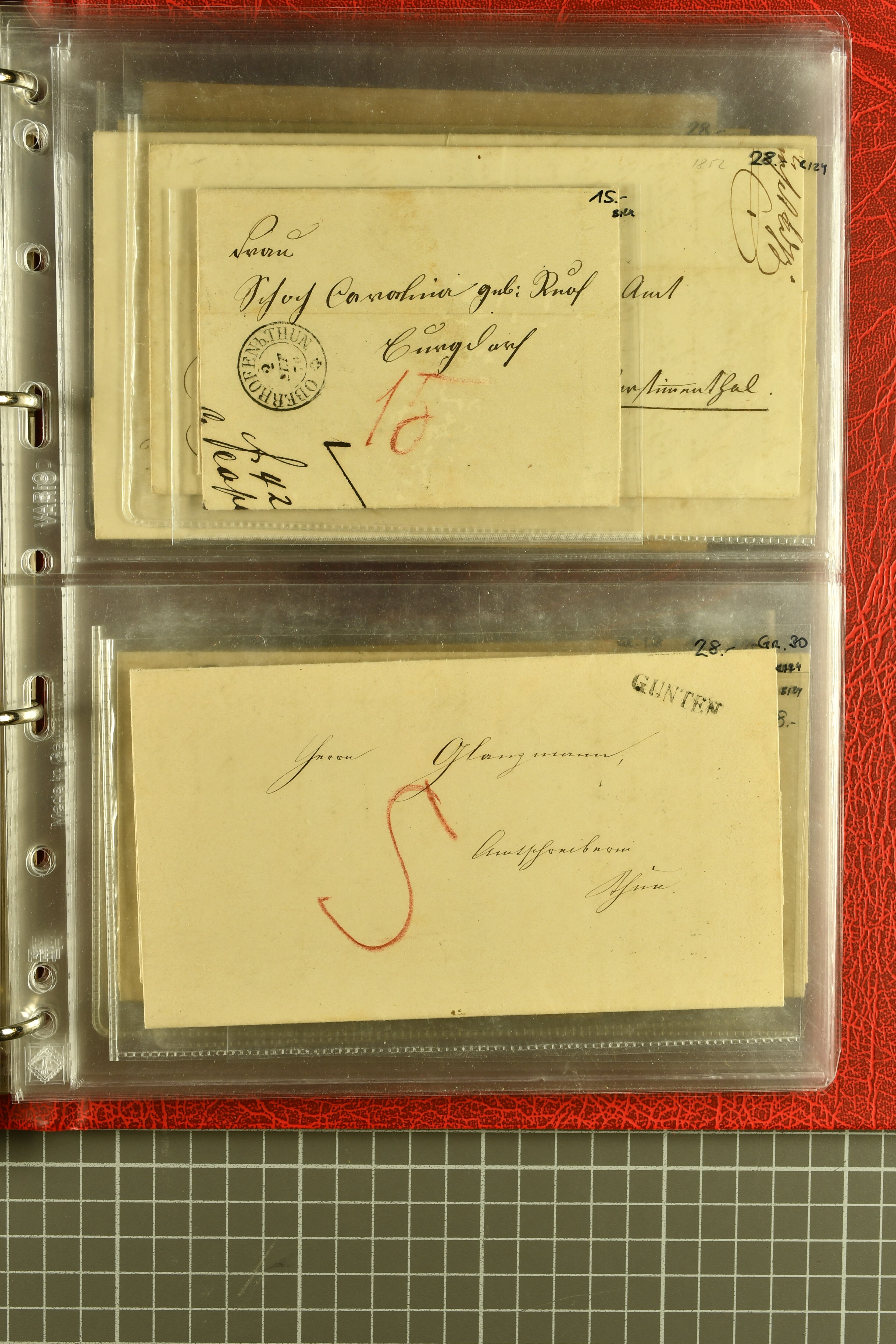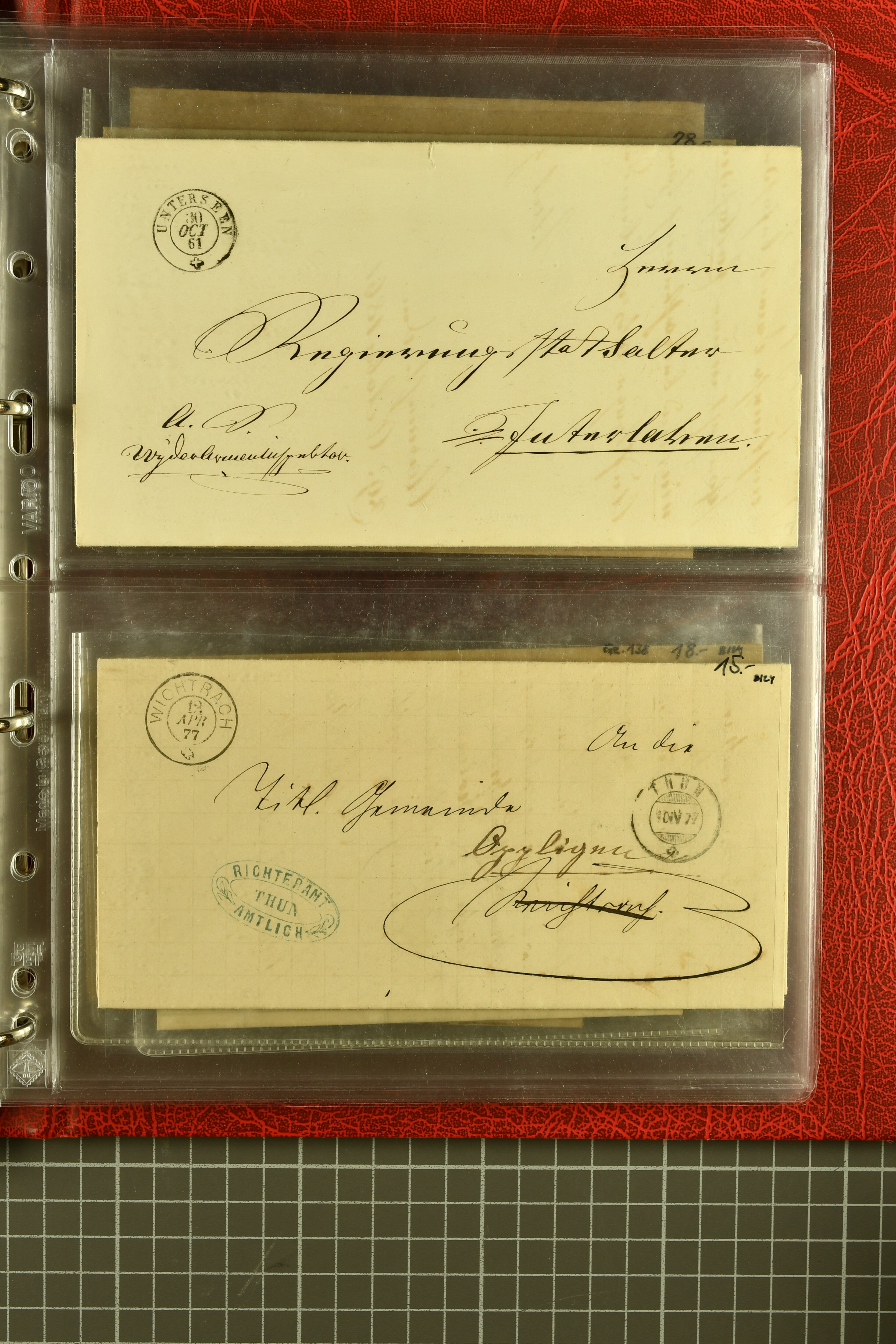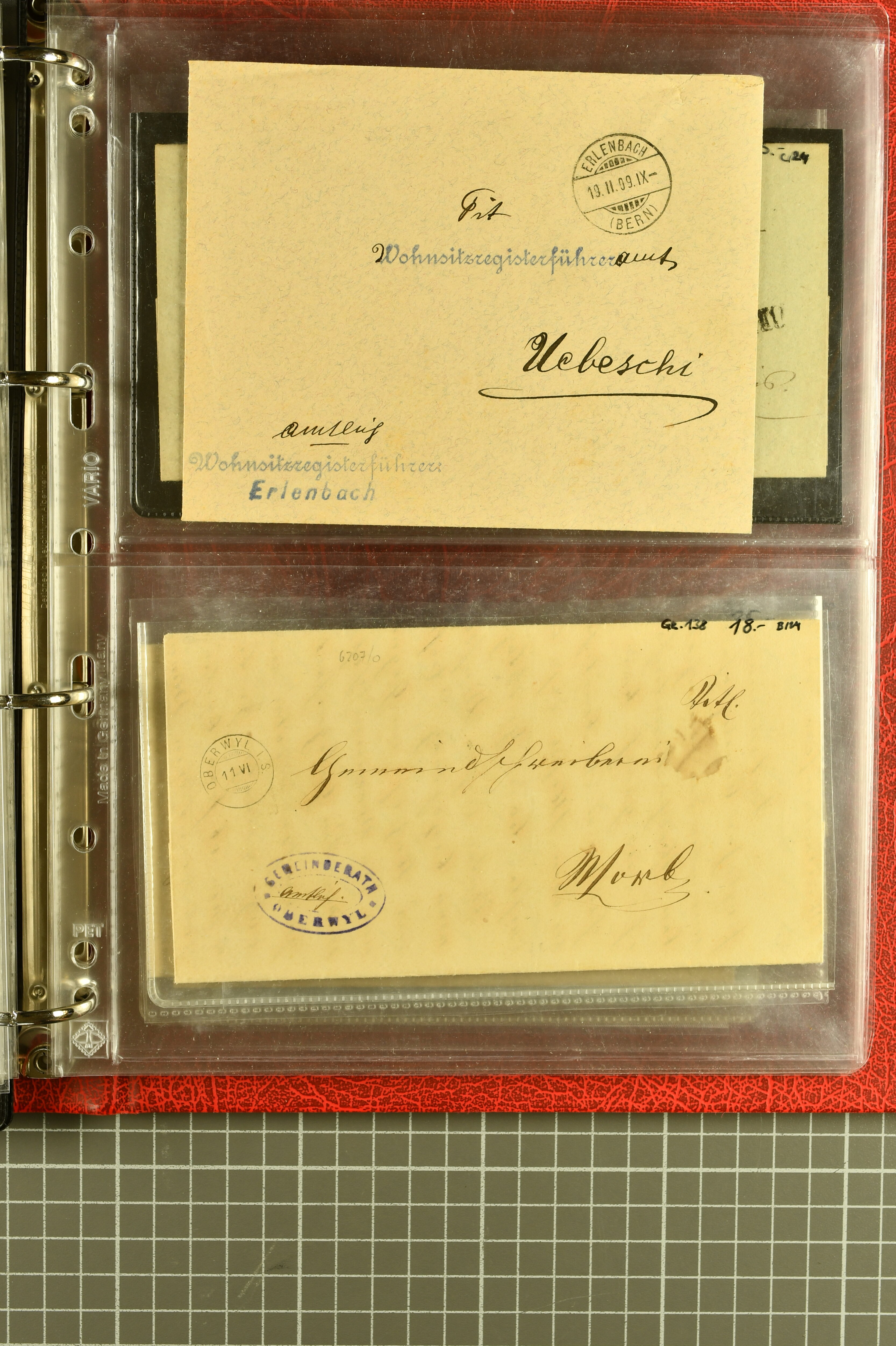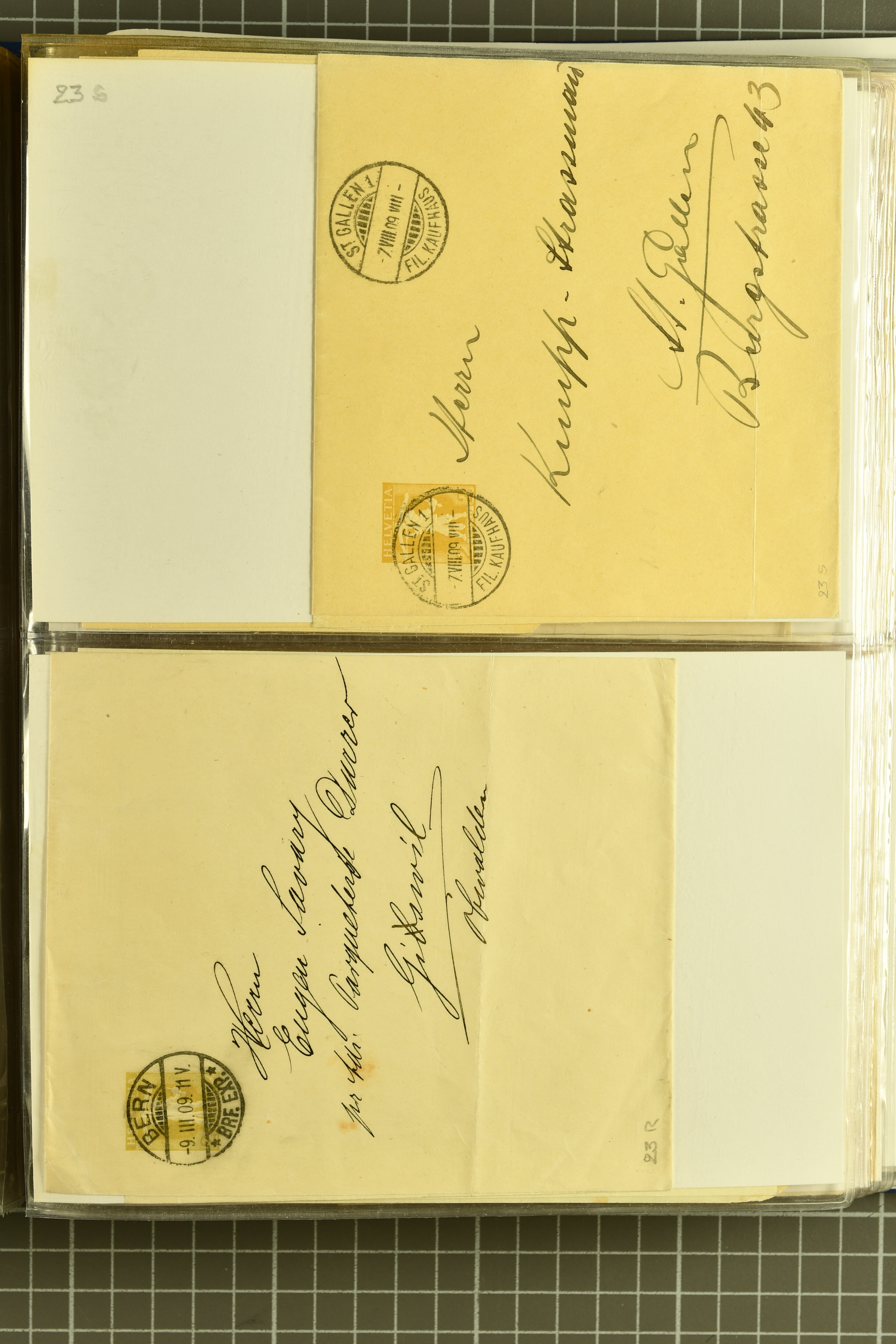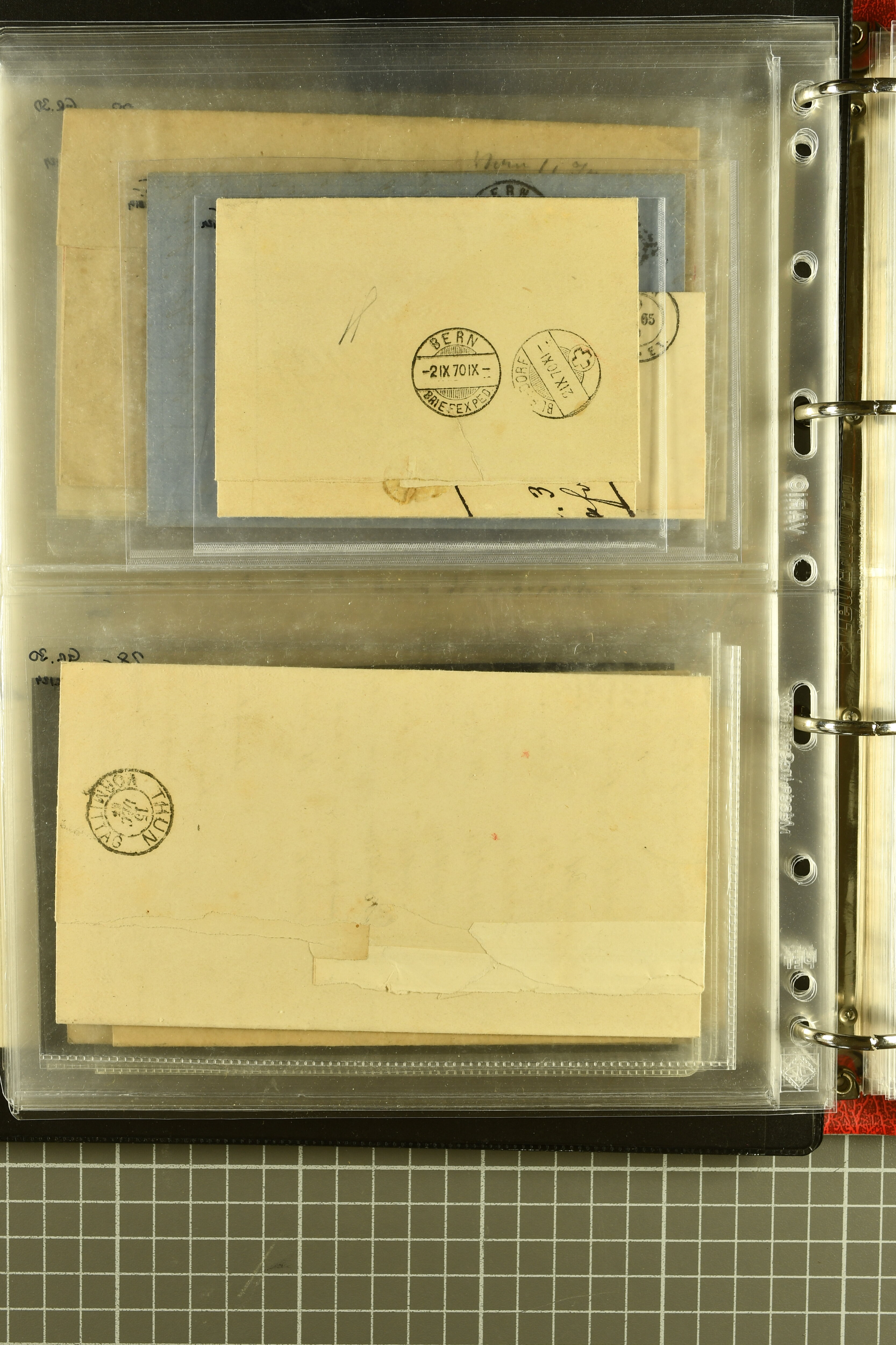 9873 cover imageKt. Bern 1835/1909: Lot 50 Briefe, dabei 1853 Rayon III Typen 7 & 9 auf Einschreibebrief gest. "Bern 8 Feb. 53 DB" (Befund Marchand), Chargé-Brief frankiert mit Sitz. Helvetia 20 Rp. von Blankenburg, Ziffer 15 Rp. gelb auf Nachnahme von "Rüthi b/Riggisberg 12.1.88" nach Schwarzenburg, weiter div. amtliche Briefe ohne Marken aus dem Kanton Bern, dabei Brief vom 'Statthalteramt Seftigen via Belp (1854) nach Schwarzenburg, dazu Stabstp. auf Briefen von Brodhaus nach Oberwyl, Amsoldingen, Boll, Boltigen, Gunten, Heimberg, Kehrsatz, Mülinen, Oberwyl, Reutigen, Rueggisberg, Wangen, Zweisimmen. Ein schönes Angebot (Image 1) (Image 2) (Image 3) (Image 4) (Image 5) (Image 6) (Image 7) (Image 8) (Image 9) (Image 10) (Image 11) (Image 12) (Image 13) (Image 14) (Image 15) (Image 16) (Image 17) (Image 18) (Image 19) (Image 20) (Image 21) (Image 22) (Image 23) (Image 24) (Image 25) (Image 26) (Image 27) (Image 28) (Image 29) (Image 30) (Image 31) (Image 32) (Image 33) (Image 34) (Image 35) (Image 36) (Image 37) (Image 38) (Image 39) (Image 40) (Image 41) (Image 42) (Image 43) (Image 44) (Image 45) (Image 46) (Image 47) (Image 48) (Image 49) (Image 50)