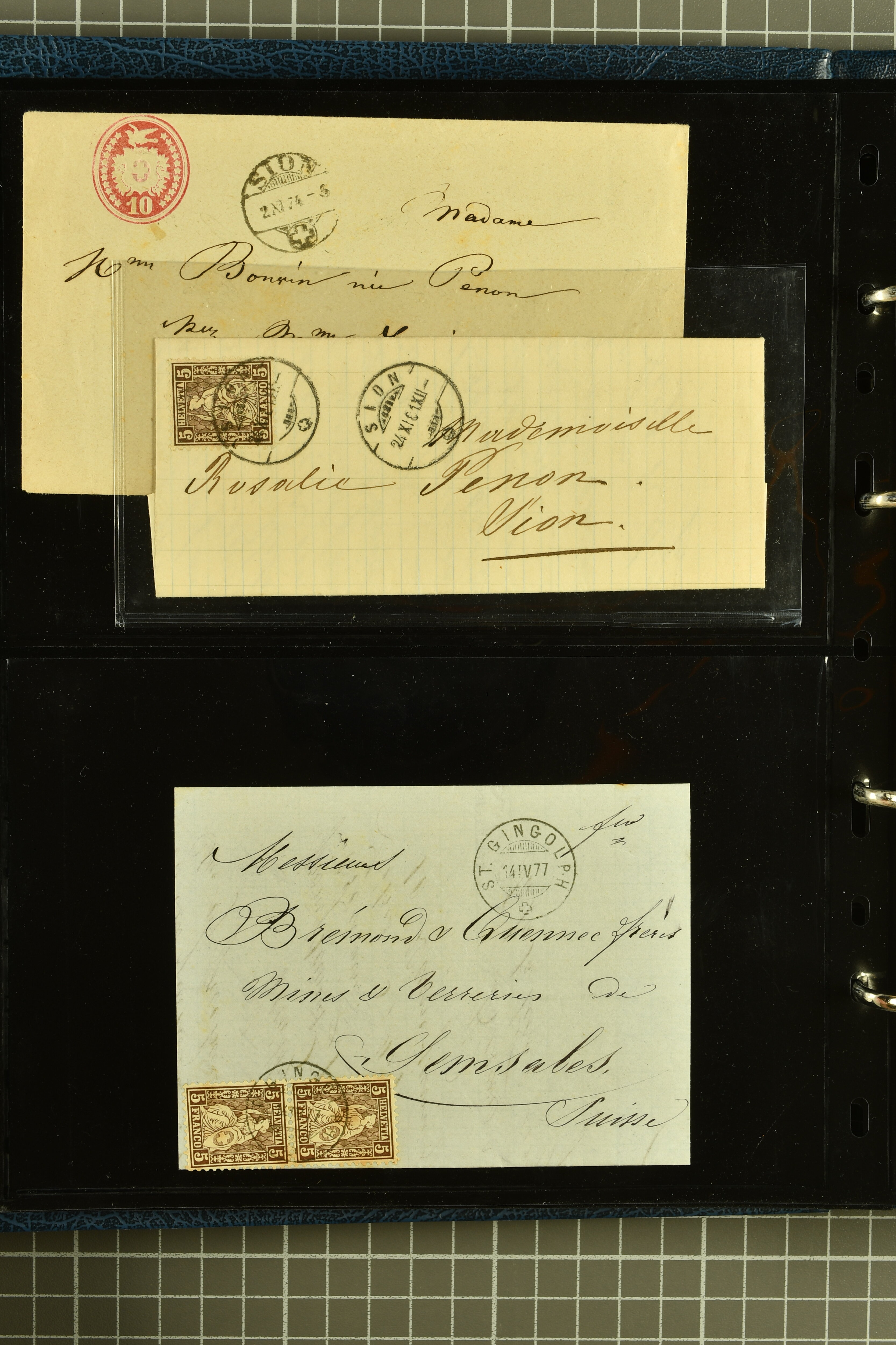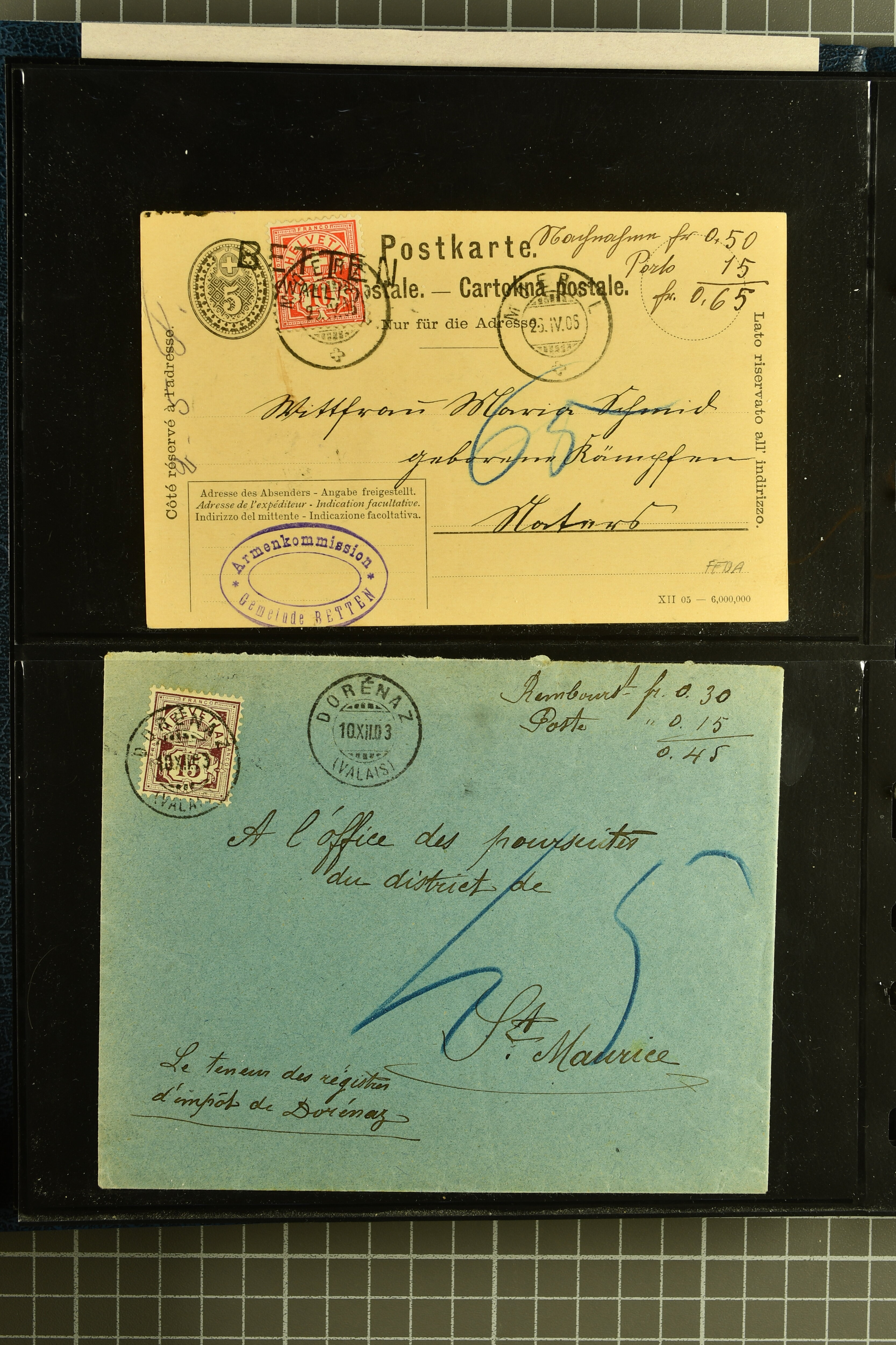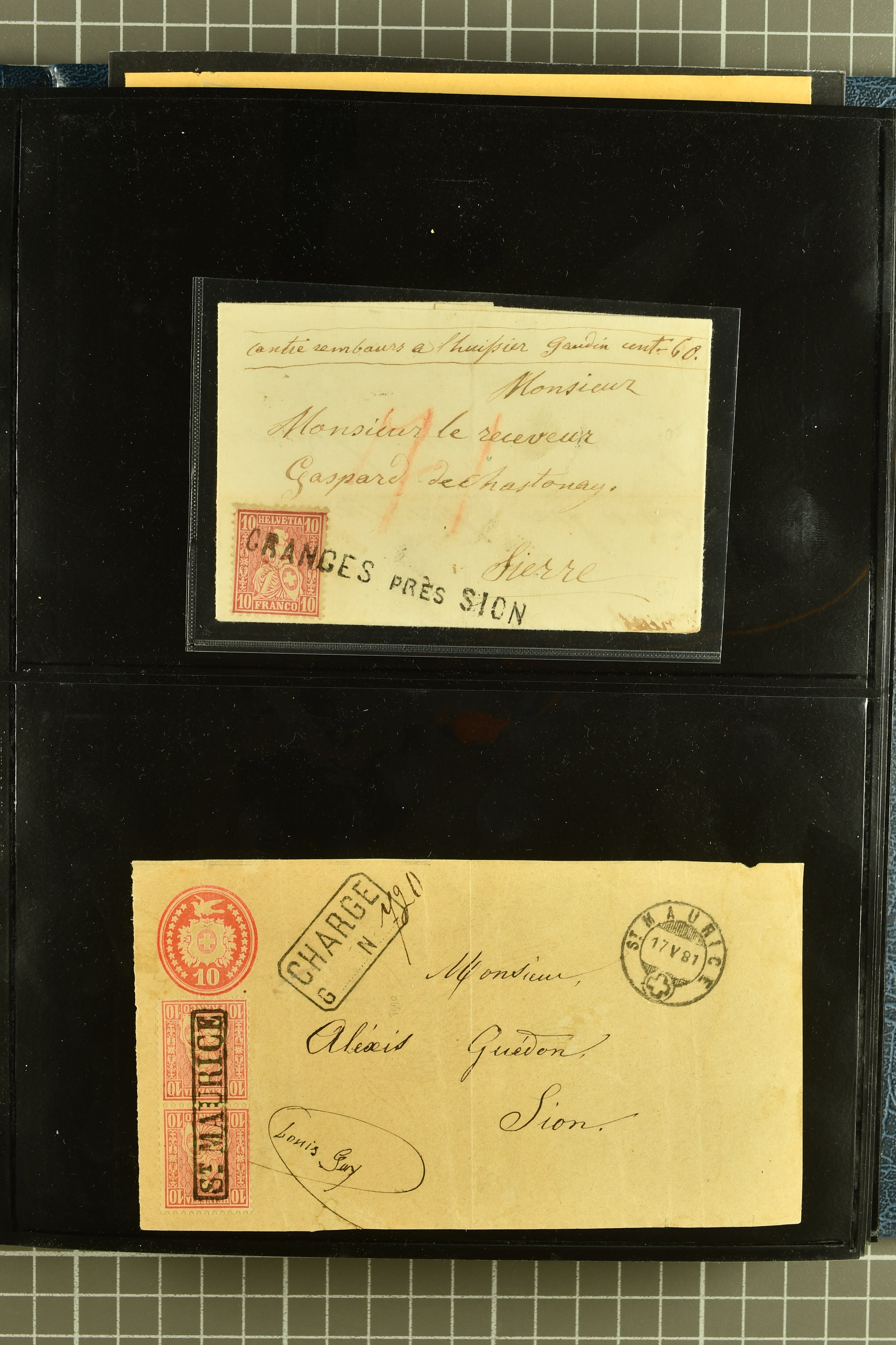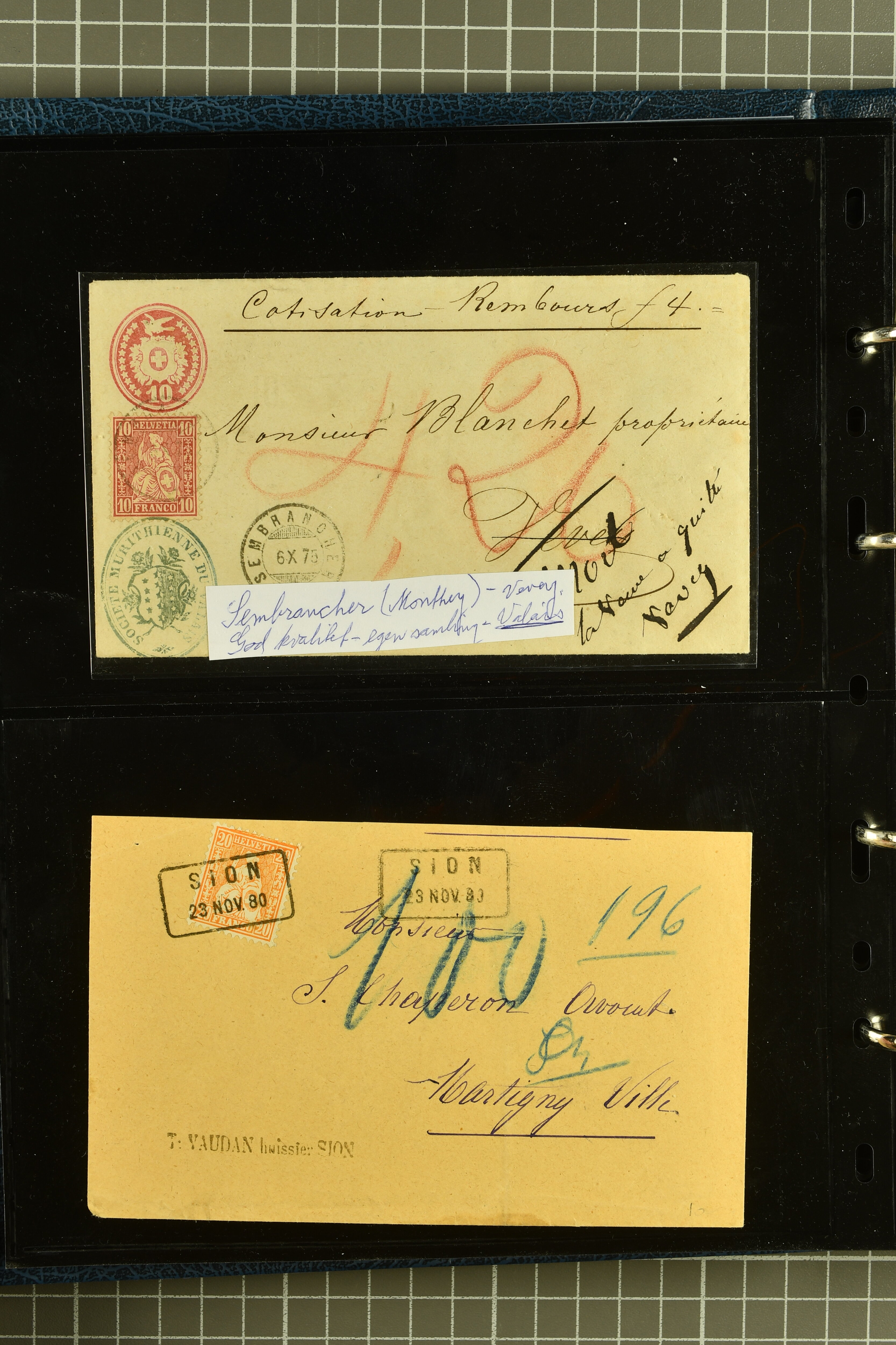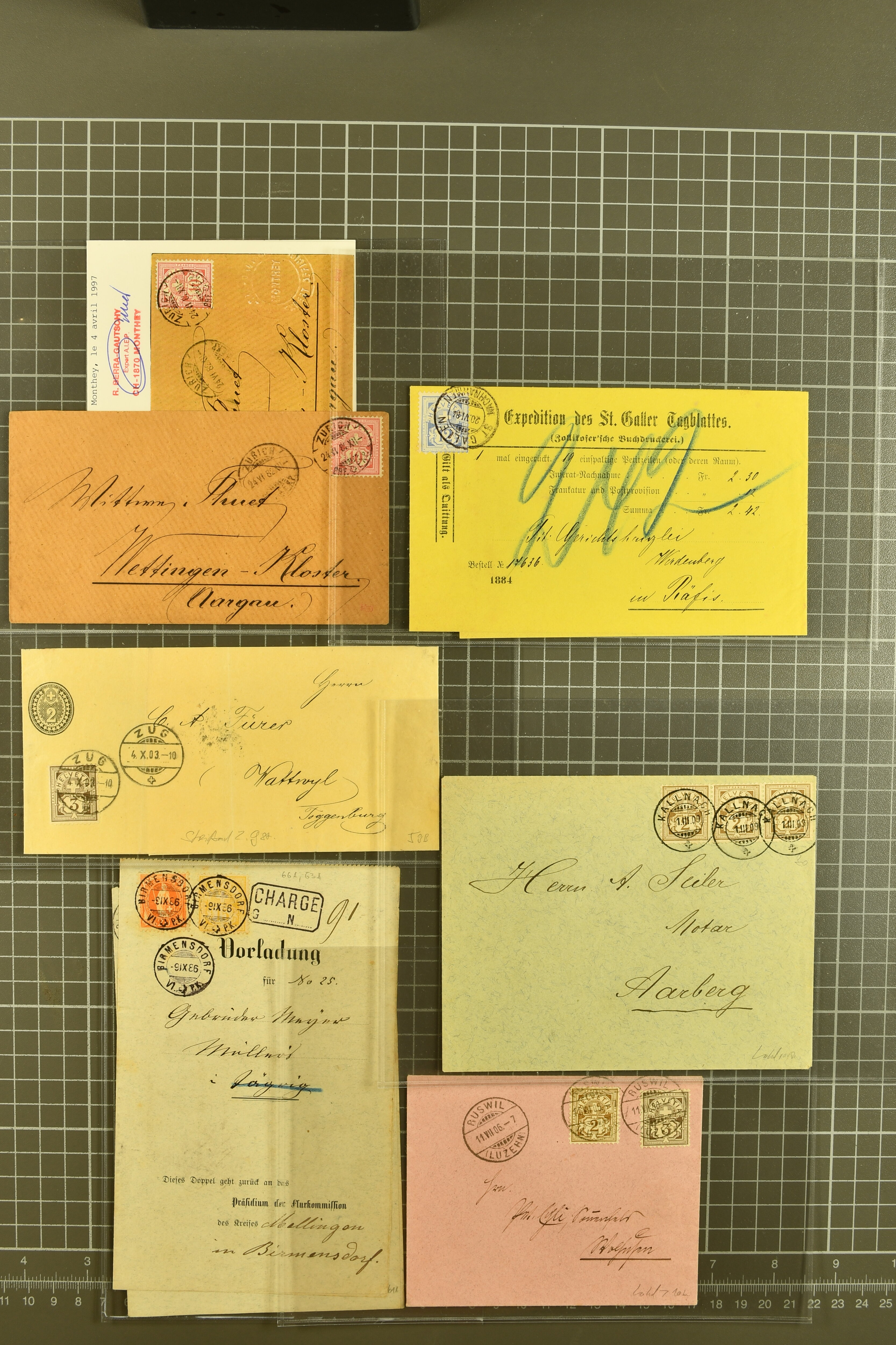 9882 cover imagePostgeschichte Kanton Wallis 1850/1970 (ca.): Bemerkenswerte Sammlung von über 200 Briefen und Karten. Beginnend mit Rayon I hellblau, Unbekannter Stein: Typen 7 + 13 l/o auf sauberem Faltbrief von Martigny nach Ardon sowie Buntfrankatur Rayon II, Stein B: Type 23 r/u und Rayon I hellblau, Stein B3: Type 40 l/u auf Faltbrief von St. Maurice nach Lausanne folgen drei Strubelfrankaturen inkl. einem Auslandsbrief von St. Bernard nach Besançon, Frankreich und eine starke Partie Sitzende Helvetia mit seltenen Entwertungen wie gefasstem Stabstp. "ST. MAURICE" (AW 3435) auf 10 Rp. rot im senkr. Paar als Zusatzfrankatur auf eingeschriebenem Tüblibrief 10 Rp. rot (Vorders.) nach Sion, Druckschrift-Stabstp. "SALVAN" (AW 2931) oder "GRANGES PRÈS SION" (AW 3089) jeweils als Entwertungsstp., kl. Zweikreisstp. "BOURG DE CONTHEY 25 FEV. 80" ideal klar auf 15 Rp. gelb als Einzelfrankatur auf Nachnahme-Couvert über Fr. 1.65 nach Sion aber auch Bahnpoststp., refüsierte Sendungen, Drucksachen, Nachnahmen, Auslandsfrankaturen etc sowie Ganzsachen wie Tüblibrief 10 Rp. rot entw. mit seltenerweise über dem Wertstempel aufges. Stabstp. "GONDO" oder Inlands-Doppelpostkarte 5 Rp. braun, Antwortteil (SGSSV: PK.005.A) mit seltenem zweizeiligem Stabstp. "LOUËSCHE / BAINS" (AW 2239) nach Bern (1877). Später Ziffermuster und Stehende Helvetia mit einigen hohen Nachnahmefrankaturen, Auslandsbriefen inkl. 50 Rp. blau in der "groben" Zähnung 9¾:9¼ (SBK 70B) auf eingeschr. Brief von Champéry nach Prag oder 25 Rp. grün in derselben Zähnung auf Brief von Zermatt nach Berlin, seltene Stabstp. wie zweizeilige "COURRIER FRANCAIS / CHAMONIX-CHTELARD", "BETTEN / (WALLIS)" oder "GRENGIOLS / (WALLIS)", seltener Stationsstempel "VERNAYAZ 18 AOUT 86" in violett oder zahlreiche Hotelstempel. Auch die späteren Ausgaben sind mit seltenen "Fleuron-" oder Stabstempel kleiner Ortschaften, attraktiven illustrierten Briefen und Karten, Telegrammen interessanten Frankaturen wie Tellbrustbild 10 Rp. rot, Type I (SBK 126/I) auf Nachnahmekarte von La Croix (Martigny) nach Saxon, schönen Pro Juventute-Frankaturen, Dienstleistungen wie Eilsendung von Riddes nach Paris, Postformularen wie "Rück- oder Auszahlungsschein" von Brig nach Varen mit entspr. Stabstp. oder kompl. Anrechnungskarte mit Helvetia mit Schwert 50 Rp. grün von Versegères gut vertreten. Eine vielseitige Sammlung in meist guter Erhaltung; zwei Befunde, drei Atteste (Image 1) (Image 2) (Image 3) (Image 4) (Image 5) (Image 6) (Image 7) (Image 8) (Image 9) (Image 10) (Image 11) (Image 12) (Image 13) (Image 14) (Image 15) (Image 16) (Image 17) (Image 18) (Image 19) (Image 20) (Image 21) (Image 22) (Image 23) (Image 24) (Image 25) (Image 26) (Image 27) (Image 28) (Image 29) (Image 30) (Image 31) (Image 32) (Image 33) (Image 34) (Image 35) (Image 36) (Image 37) (Image 38) (Image 39) (Image 40) (Image 41) (Image 42) (Image 43) (Image 44) (Image 45) (Image 46) (Image 47) (Image 48) (Image 49) (Image 50)
