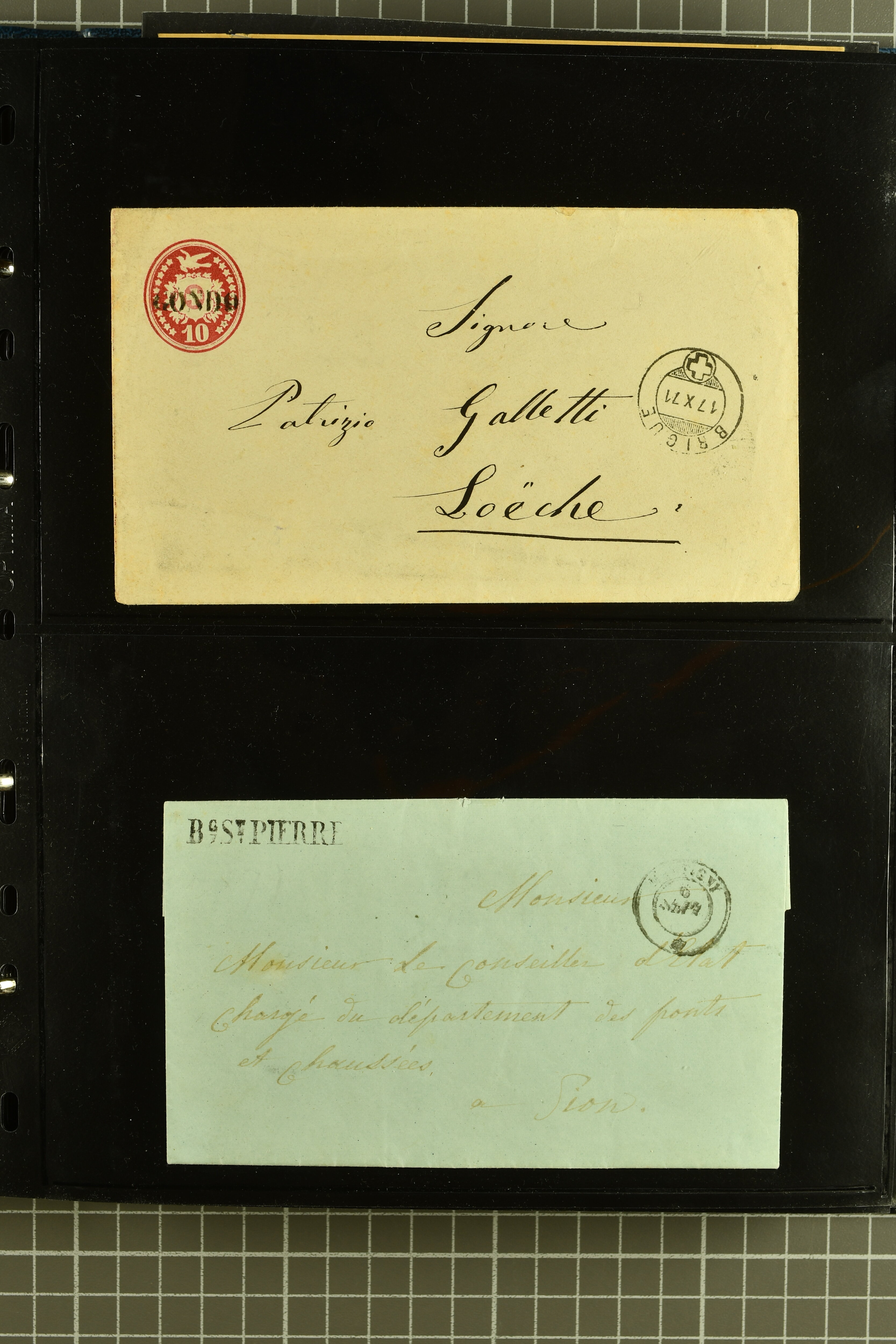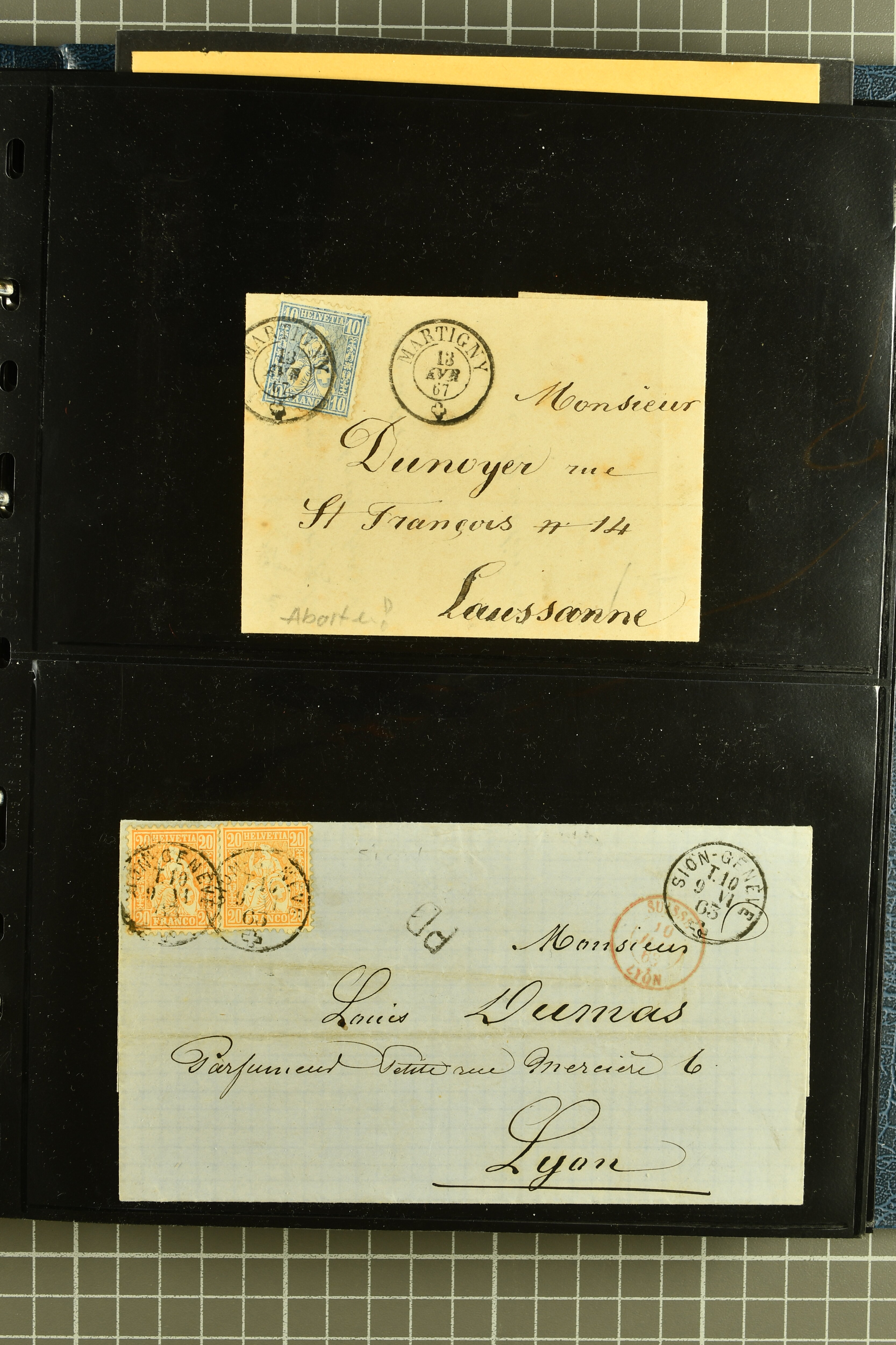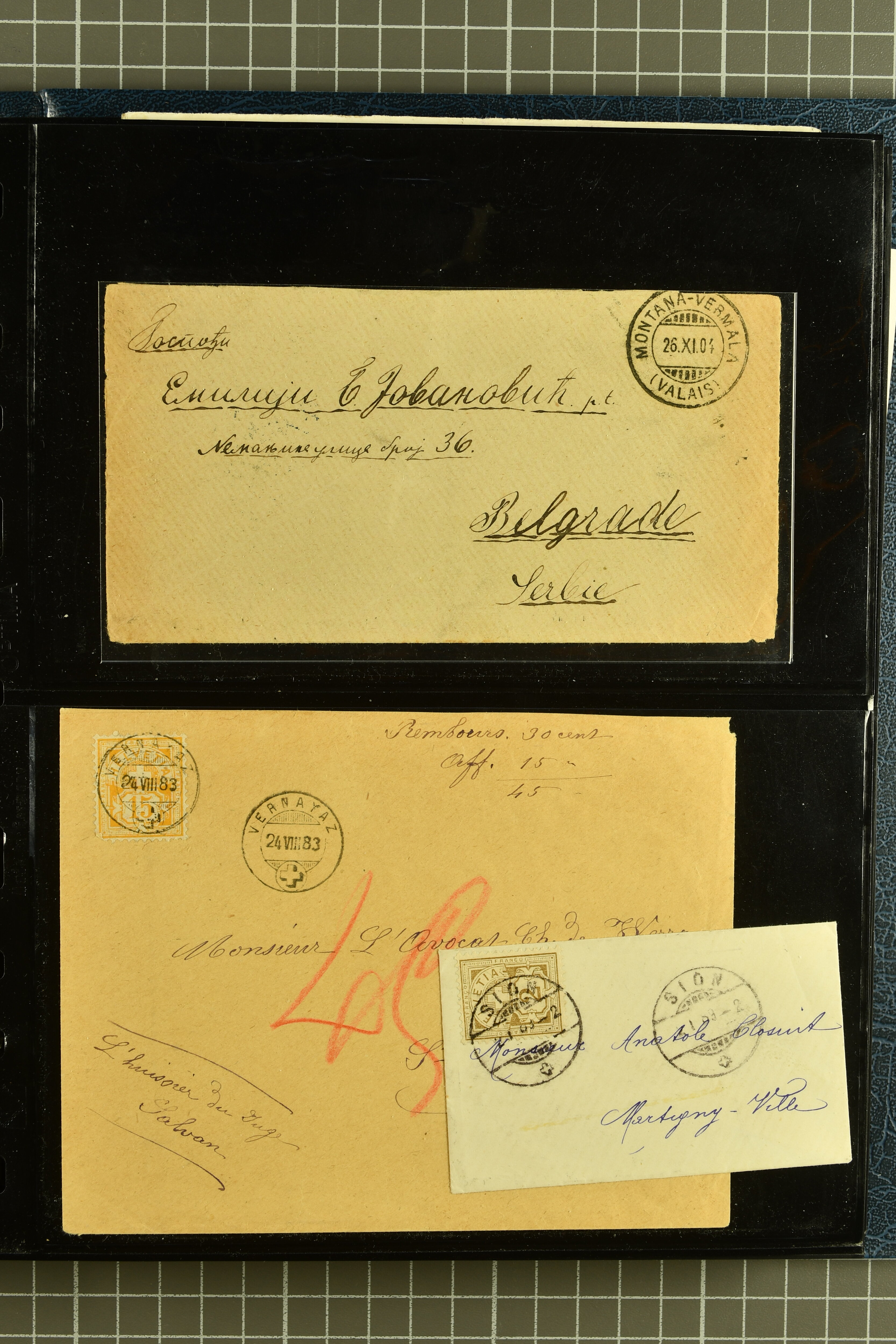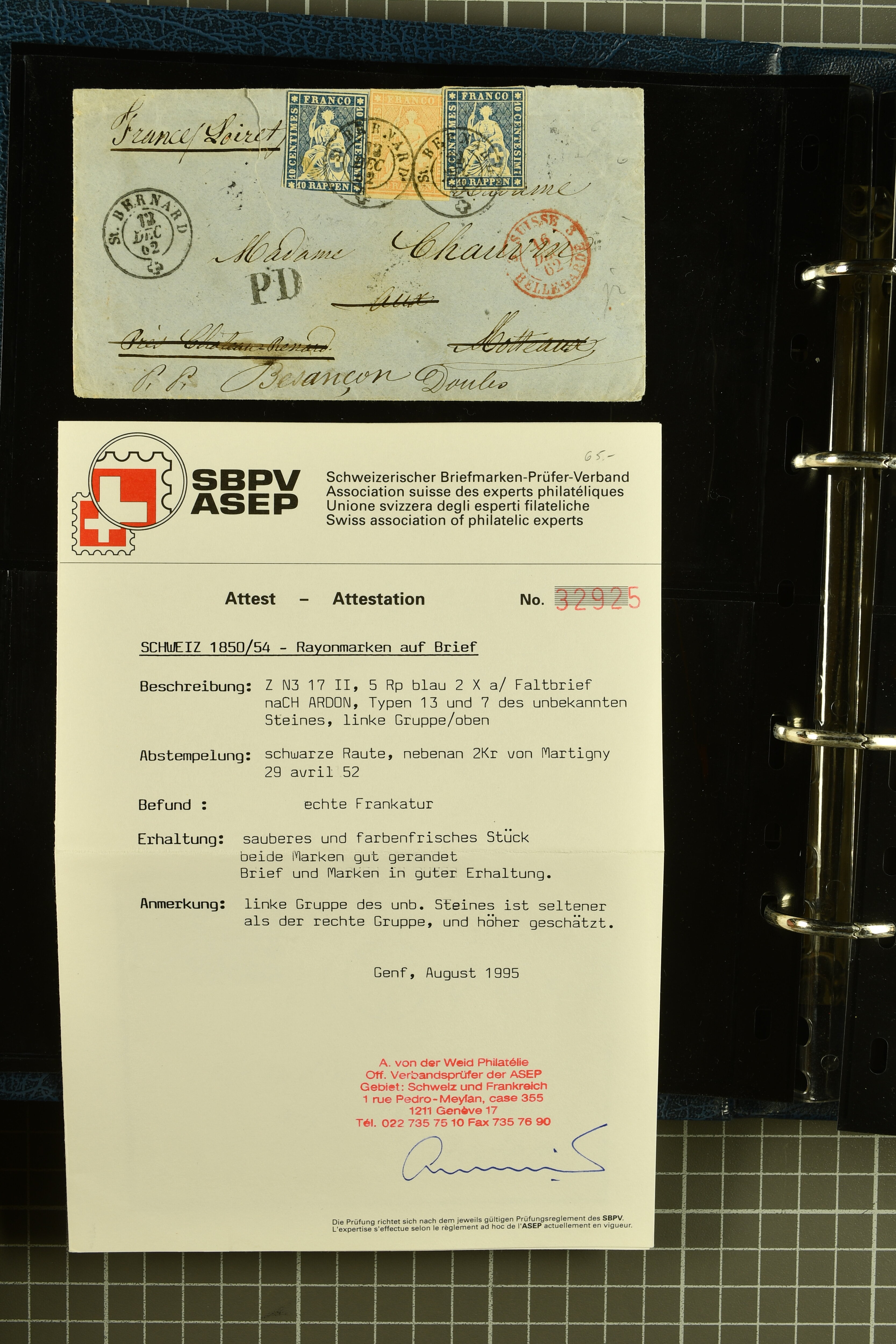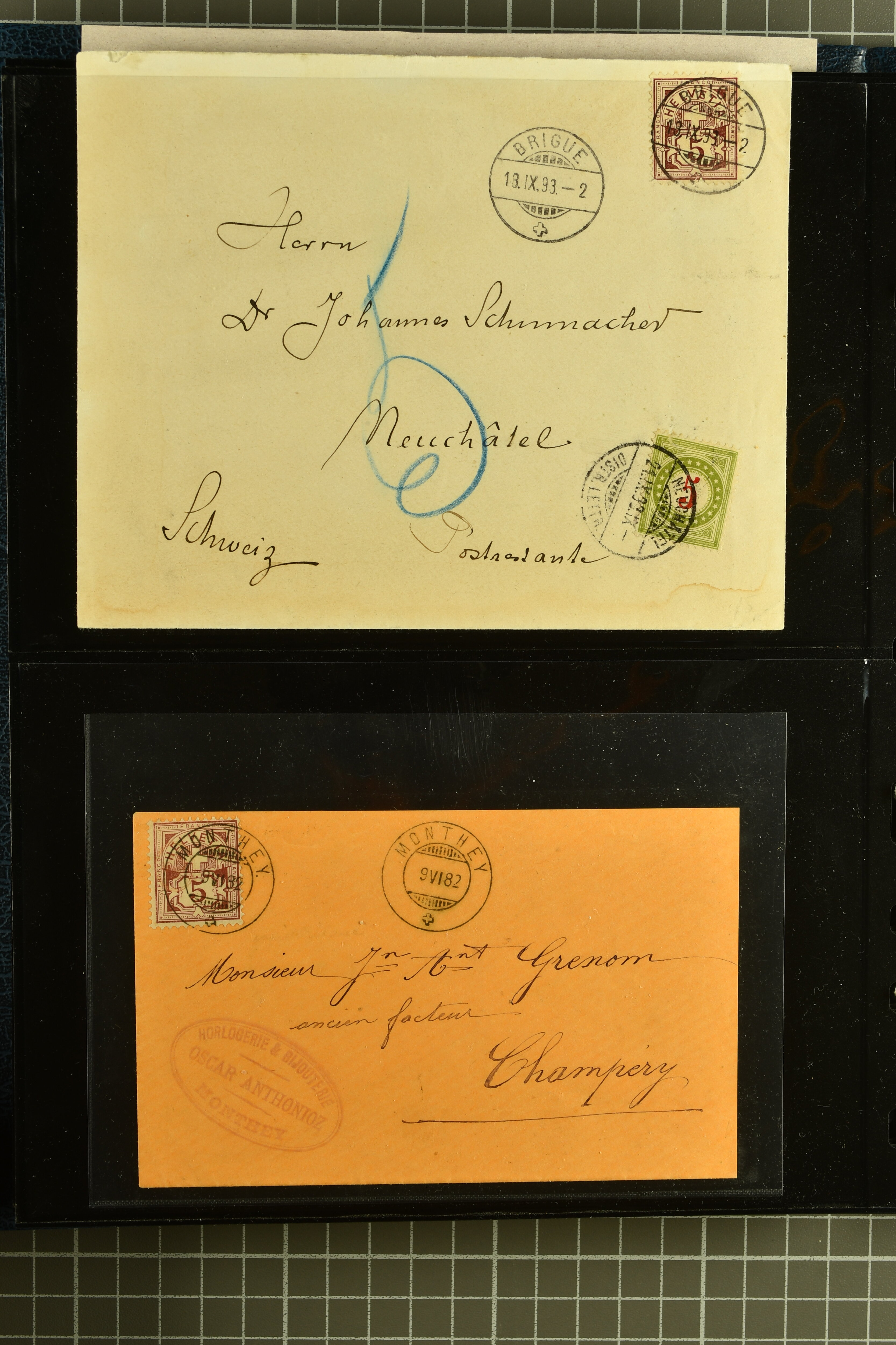 9882 cover imagePostgeschichte Kanton Wallis 1850/1970 (ca.): Bemerkenswerte Sammlung von über 200 Briefen und Karten. Beginnend mit Rayon I hellblau, Unbekannter Stein: Typen 7 + 13 l/o auf sauberem Faltbrief von Martigny nach Ardon sowie Buntfrankatur Rayon II, Stein B: Type 23 r/u und Rayon I hellblau, Stein B3: Type 40 l/u auf Faltbrief von St. Maurice nach Lausanne folgen drei Strubelfrankaturen inkl. einem Auslandsbrief von St. Bernard nach Besançon, Frankreich und eine starke Partie Sitzende Helvetia mit seltenen Entwertungen wie gefasstem Stabstp. "ST. MAURICE" (AW 3435) auf 10 Rp. rot im senkr. Paar als Zusatzfrankatur auf eingeschriebenem Tüblibrief 10 Rp. rot (Vorders.) nach Sion, Druckschrift-Stabstp. "SALVAN" (AW 2931) oder "GRANGES PRÈS SION" (AW 3089) jeweils als Entwertungsstp., kl. Zweikreisstp. "BOURG DE CONTHEY 25 FEV. 80" ideal klar auf 15 Rp. gelb als Einzelfrankatur auf Nachnahme-Couvert über Fr. 1.65 nach Sion aber auch Bahnpoststp., refüsierte Sendungen, Drucksachen, Nachnahmen, Auslandsfrankaturen etc sowie Ganzsachen wie Tüblibrief 10 Rp. rot entw. mit seltenerweise über dem Wertstempel aufges. Stabstp. "GONDO" oder Inlands-Doppelpostkarte 5 Rp. braun, Antwortteil (SGSSV: PK.005.A) mit seltenem zweizeiligem Stabstp. "LOUËSCHE / BAINS" (AW 2239) nach Bern (1877). Später Ziffermuster und Stehende Helvetia mit einigen hohen Nachnahmefrankaturen, Auslandsbriefen inkl. 50 Rp. blau in der "groben" Zähnung 9¾:9¼ (SBK 70B) auf eingeschr. Brief von Champéry nach Prag oder 25 Rp. grün in derselben Zähnung auf Brief von Zermatt nach Berlin, seltene Stabstp. wie zweizeilige "COURRIER FRANCAIS / CHAMONIX-CHTELARD", "BETTEN / (WALLIS)" oder "GRENGIOLS / (WALLIS)", seltener Stationsstempel "VERNAYAZ 18 AOUT 86" in violett oder zahlreiche Hotelstempel. Auch die späteren Ausgaben sind mit seltenen "Fleuron-" oder Stabstempel kleiner Ortschaften, attraktiven illustrierten Briefen und Karten, Telegrammen interessanten Frankaturen wie Tellbrustbild 10 Rp. rot, Type I (SBK 126/I) auf Nachnahmekarte von La Croix (Martigny) nach Saxon, schönen Pro Juventute-Frankaturen, Dienstleistungen wie Eilsendung von Riddes nach Paris, Postformularen wie "Rück- oder Auszahlungsschein" von Brig nach Varen mit entspr. Stabstp. oder kompl. Anrechnungskarte mit Helvetia mit Schwert 50 Rp. grün von Versegères gut vertreten. Eine vielseitige Sammlung in meist guter Erhaltung; zwei Befunde, drei Atteste (Image 1) (Image 2) (Image 3) (Image 4) (Image 5) (Image 6) (Image 7) (Image 8) (Image 9) (Image 10) (Image 11) (Image 12) (Image 13) (Image 14) (Image 15) (Image 16) (Image 17) (Image 18) (Image 19) (Image 20) (Image 21) (Image 22) (Image 23) (Image 24) (Image 25) (Image 26) (Image 27) (Image 28) (Image 29) (Image 30) (Image 31) (Image 32) (Image 33) (Image 34) (Image 35) (Image 36) (Image 37) (Image 38) (Image 39) (Image 40) (Image 41) (Image 42) (Image 43) (Image 44) (Image 45) (Image 46) (Image 47) (Image 48) (Image 49) (Image 50)