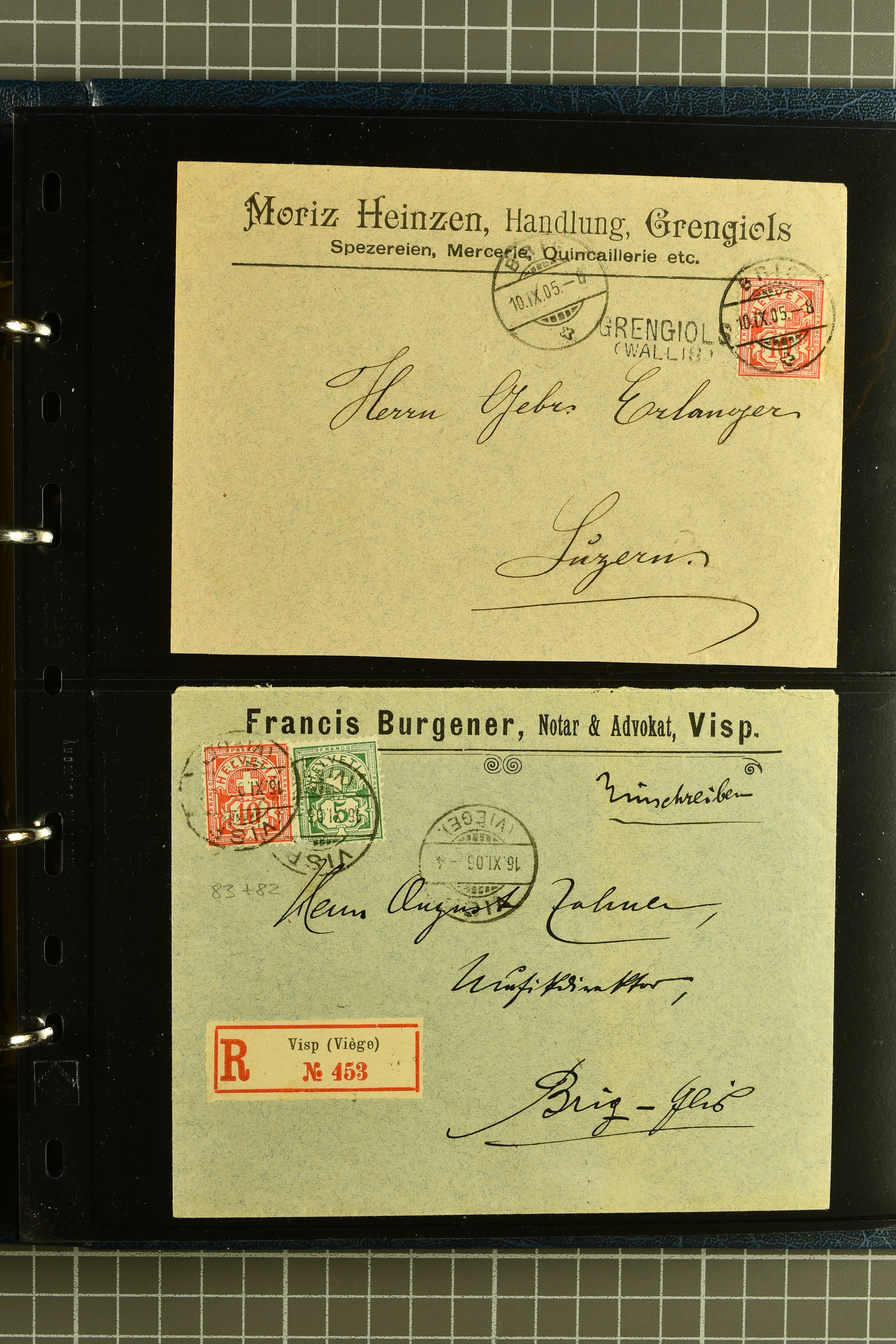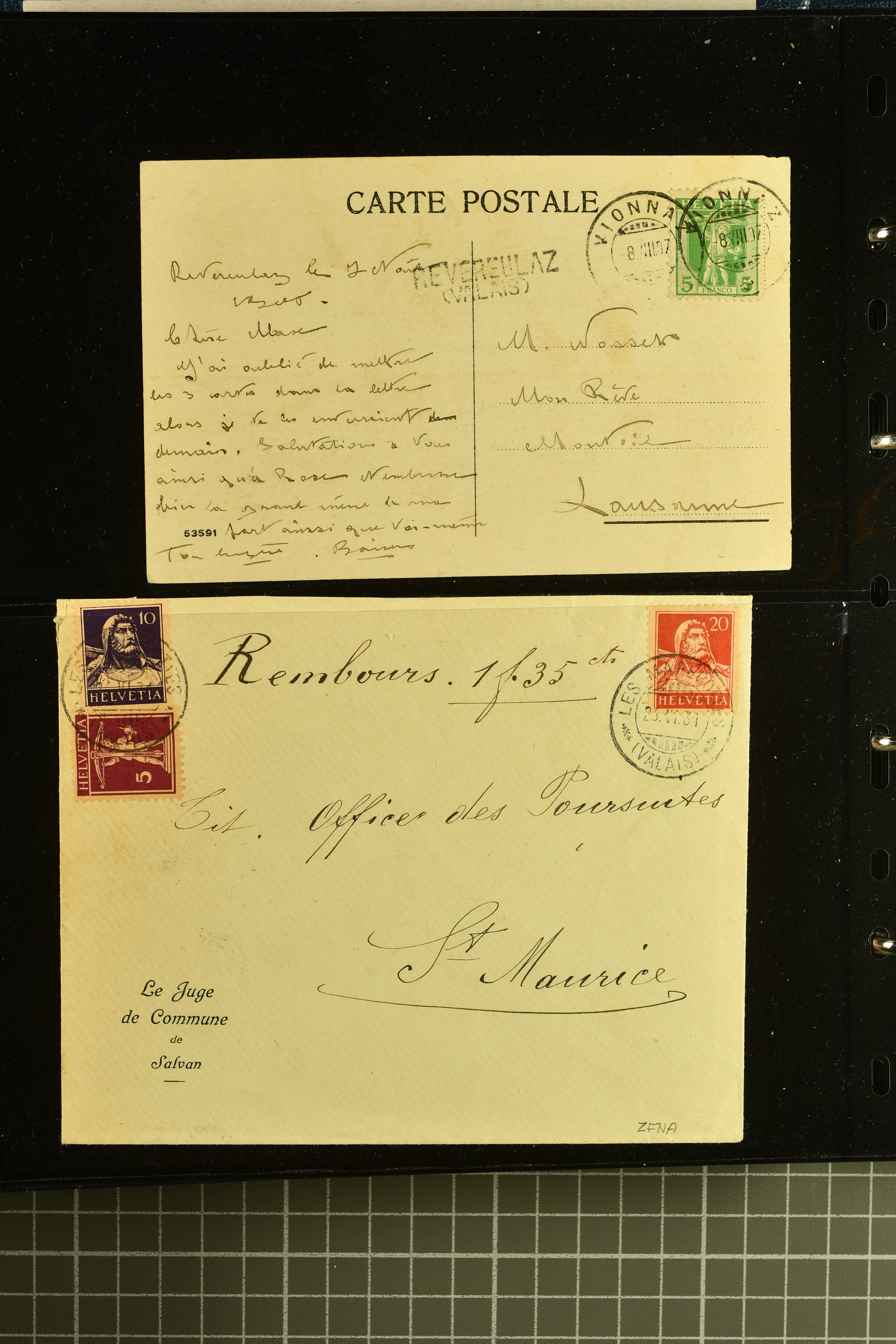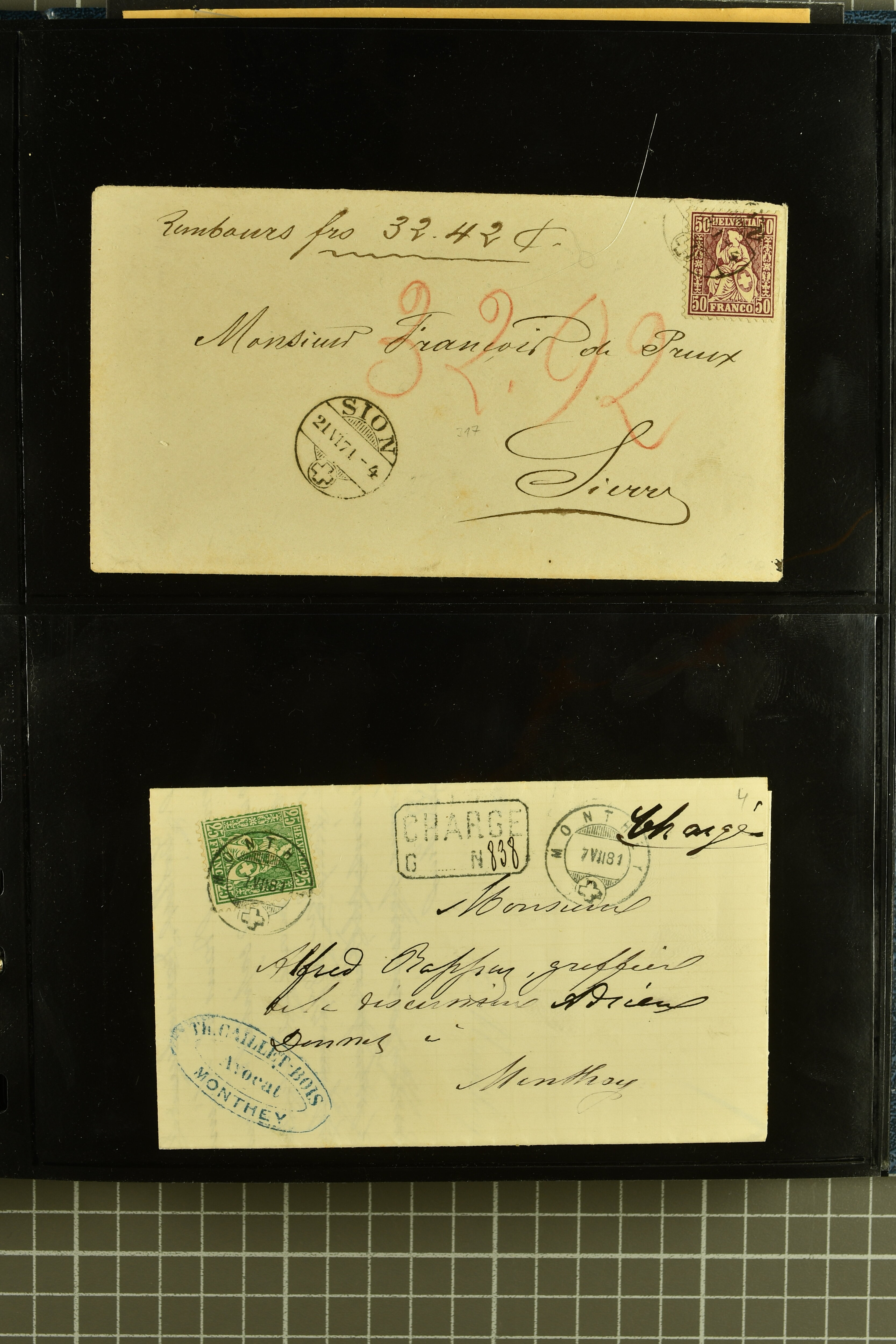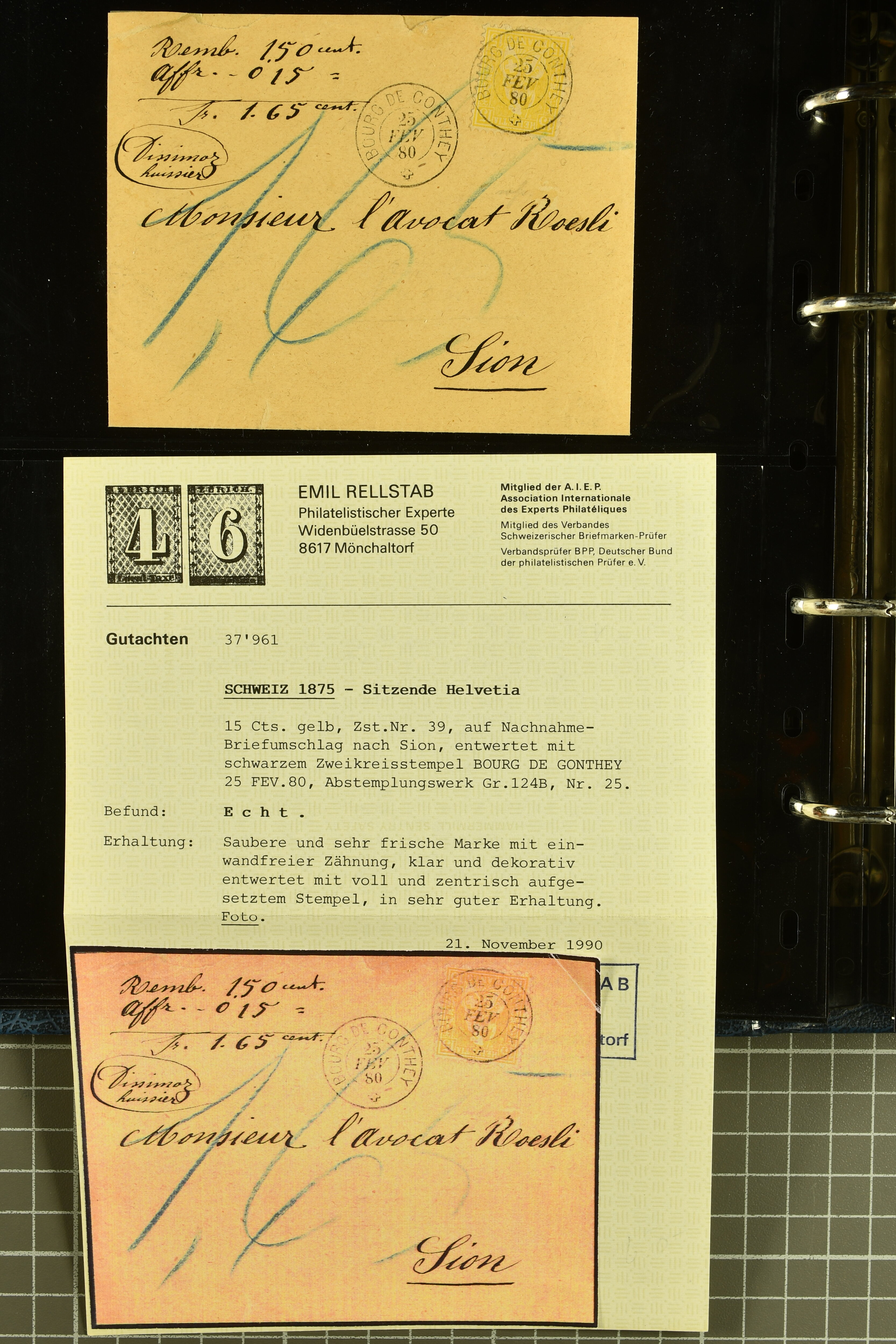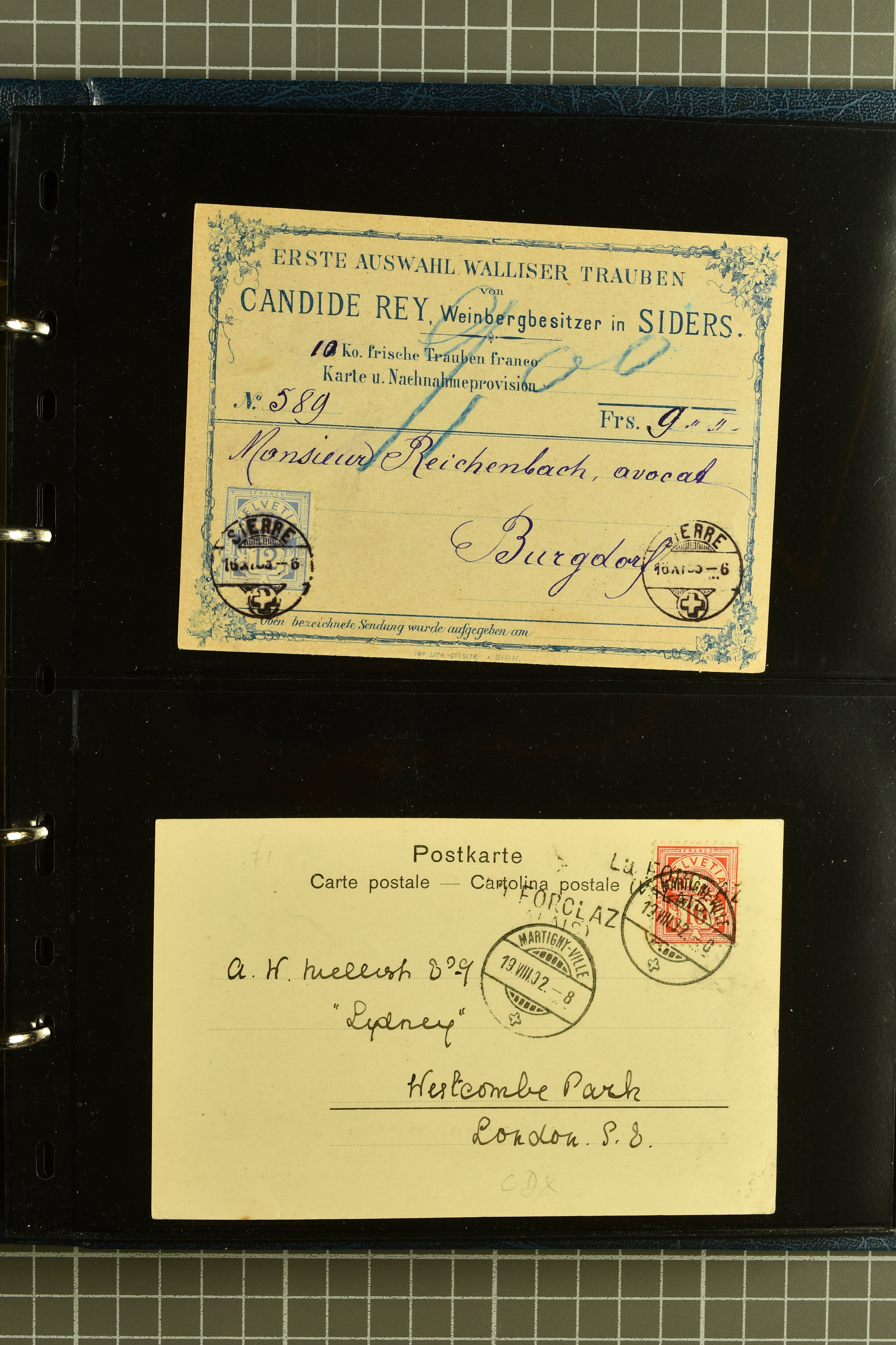 9882 cover imagePostgeschichte Kanton Wallis 1850/1970 (ca.): Bemerkenswerte Sammlung von über 200 Briefen und Karten. Beginnend mit Rayon I hellblau, Unbekannter Stein: Typen 7 + 13 l/o auf sauberem Faltbrief von Martigny nach Ardon sowie Buntfrankatur Rayon II, Stein B: Type 23 r/u und Rayon I hellblau, Stein B3: Type 40 l/u auf Faltbrief von St. Maurice nach Lausanne folgen drei Strubelfrankaturen inkl. einem Auslandsbrief von St. Bernard nach Besançon, Frankreich und eine starke Partie Sitzende Helvetia mit seltenen Entwertungen wie gefasstem Stabstp. "ST. MAURICE" (AW 3435) auf 10 Rp. rot im senkr. Paar als Zusatzfrankatur auf eingeschriebenem Tüblibrief 10 Rp. rot (Vorders.) nach Sion, Druckschrift-Stabstp. "SALVAN" (AW 2931) oder "GRANGES PRÈS SION" (AW 3089) jeweils als Entwertungsstp., kl. Zweikreisstp. "BOURG DE CONTHEY 25 FEV. 80" ideal klar auf 15 Rp. gelb als Einzelfrankatur auf Nachnahme-Couvert über Fr. 1.65 nach Sion aber auch Bahnpoststp., refüsierte Sendungen, Drucksachen, Nachnahmen, Auslandsfrankaturen etc sowie Ganzsachen wie Tüblibrief 10 Rp. rot entw. mit seltenerweise über dem Wertstempel aufges. Stabstp. "GONDO" oder Inlands-Doppelpostkarte 5 Rp. braun, Antwortteil (SGSSV: PK.005.A) mit seltenem zweizeiligem Stabstp. "LOUËSCHE / BAINS" (AW 2239) nach Bern (1877). Später Ziffermuster und Stehende Helvetia mit einigen hohen Nachnahmefrankaturen, Auslandsbriefen inkl. 50 Rp. blau in der "groben" Zähnung 9¾:9¼ (SBK 70B) auf eingeschr. Brief von Champéry nach Prag oder 25 Rp. grün in derselben Zähnung auf Brief von Zermatt nach Berlin, seltene Stabstp. wie zweizeilige "COURRIER FRANCAIS / CHAMONIX-CHTELARD", "BETTEN / (WALLIS)" oder "GRENGIOLS / (WALLIS)", seltener Stationsstempel "VERNAYAZ 18 AOUT 86" in violett oder zahlreiche Hotelstempel. Auch die späteren Ausgaben sind mit seltenen "Fleuron-" oder Stabstempel kleiner Ortschaften, attraktiven illustrierten Briefen und Karten, Telegrammen interessanten Frankaturen wie Tellbrustbild 10 Rp. rot, Type I (SBK 126/I) auf Nachnahmekarte von La Croix (Martigny) nach Saxon, schönen Pro Juventute-Frankaturen, Dienstleistungen wie Eilsendung von Riddes nach Paris, Postformularen wie "Rück- oder Auszahlungsschein" von Brig nach Varen mit entspr. Stabstp. oder kompl. Anrechnungskarte mit Helvetia mit Schwert 50 Rp. grün von Versegères gut vertreten. Eine vielseitige Sammlung in meist guter Erhaltung; zwei Befunde, drei Atteste (Image 1) (Image 2) (Image 3) (Image 4) (Image 5) (Image 6) (Image 7) (Image 8) (Image 9) (Image 10) (Image 11) (Image 12) (Image 13) (Image 14) (Image 15) (Image 16) (Image 17) (Image 18) (Image 19) (Image 20) (Image 21) (Image 22) (Image 23) (Image 24) (Image 25) (Image 26) (Image 27) (Image 28) (Image 29) (Image 30) (Image 31) (Image 32) (Image 33) (Image 34) (Image 35) (Image 36) (Image 37) (Image 38) (Image 39) (Image 40) (Image 41) (Image 42) (Image 43) (Image 44) (Image 45) (Image 46) (Image 47) (Image 48) (Image 49) (Image 50)