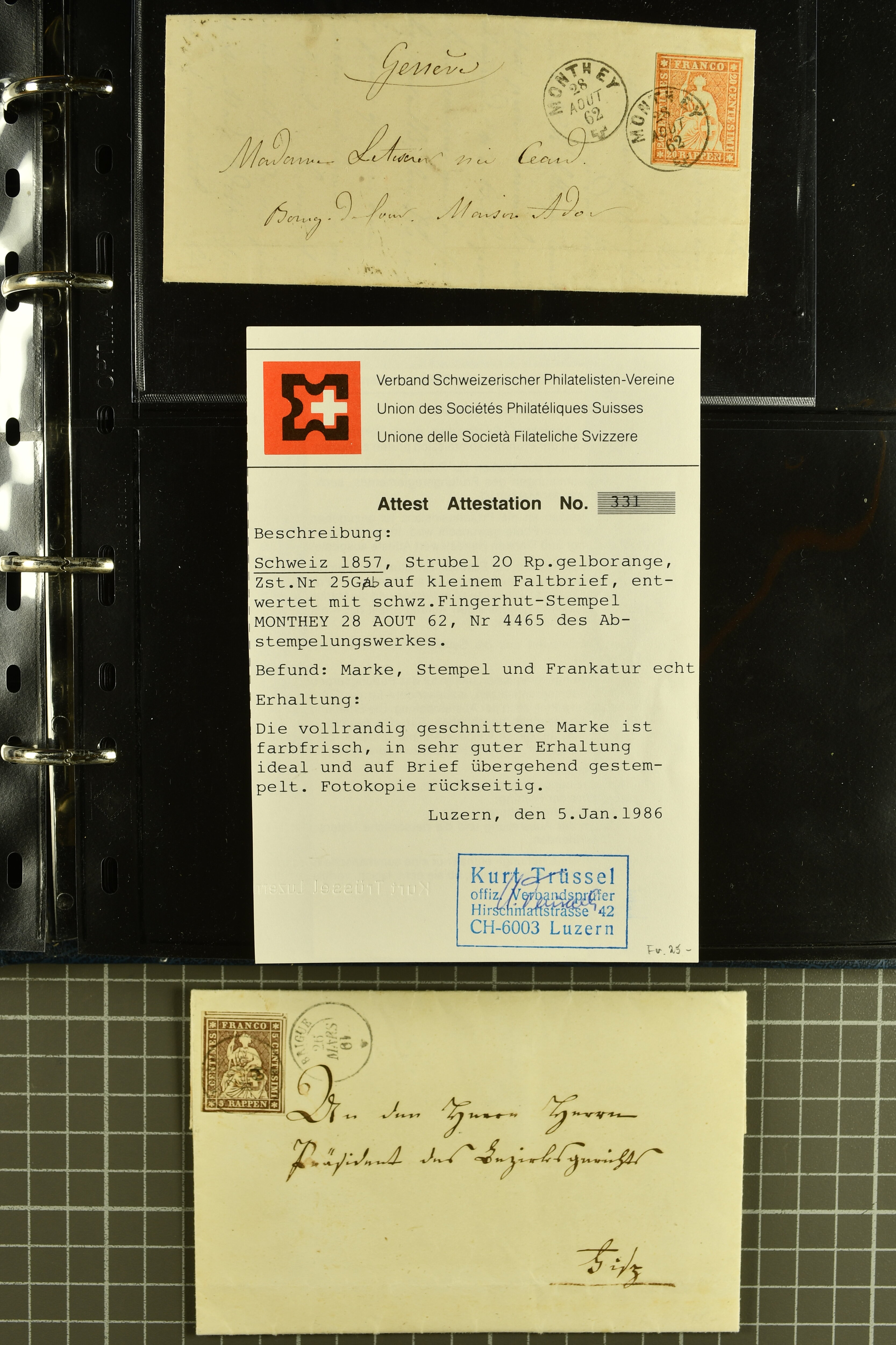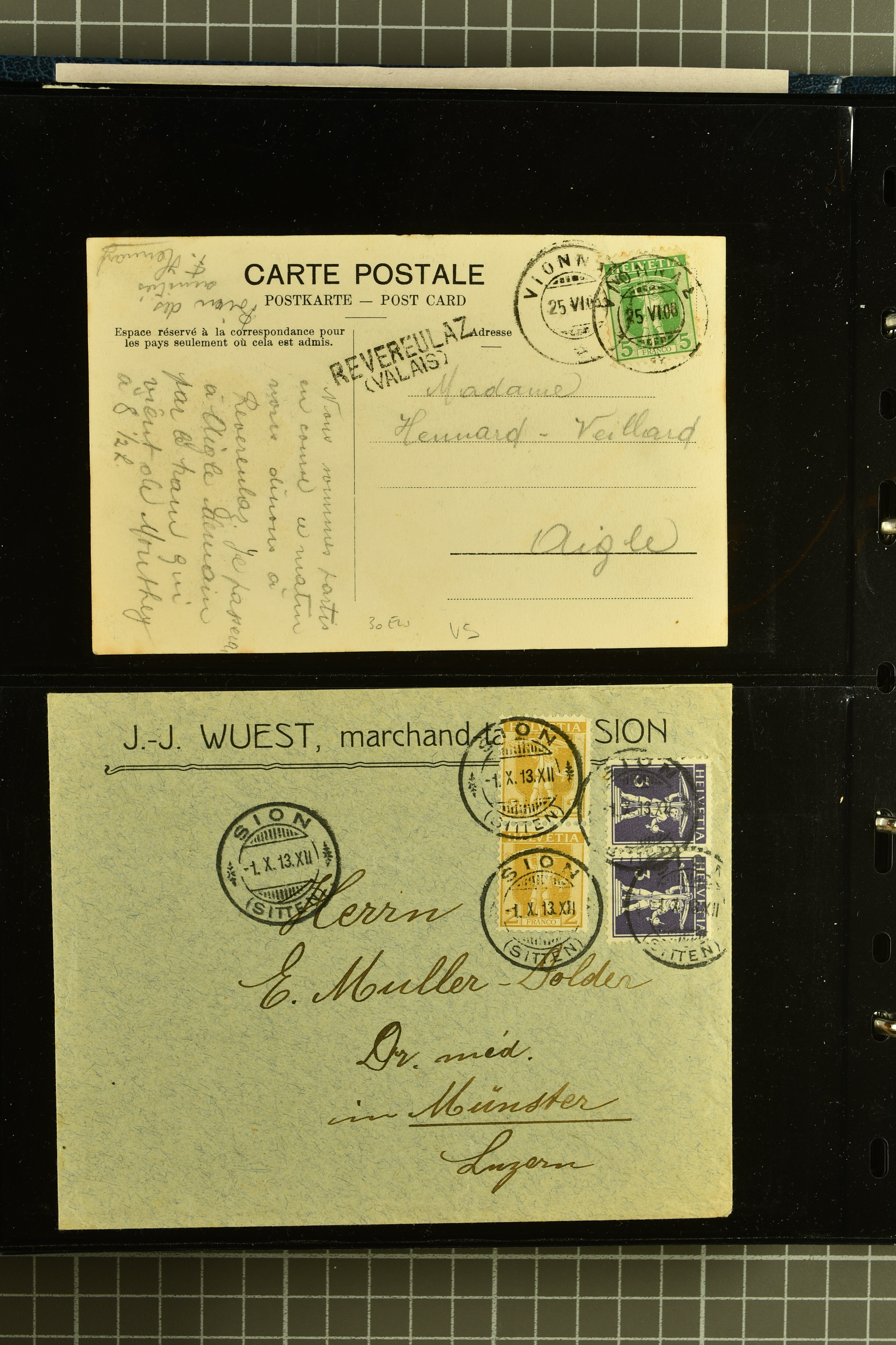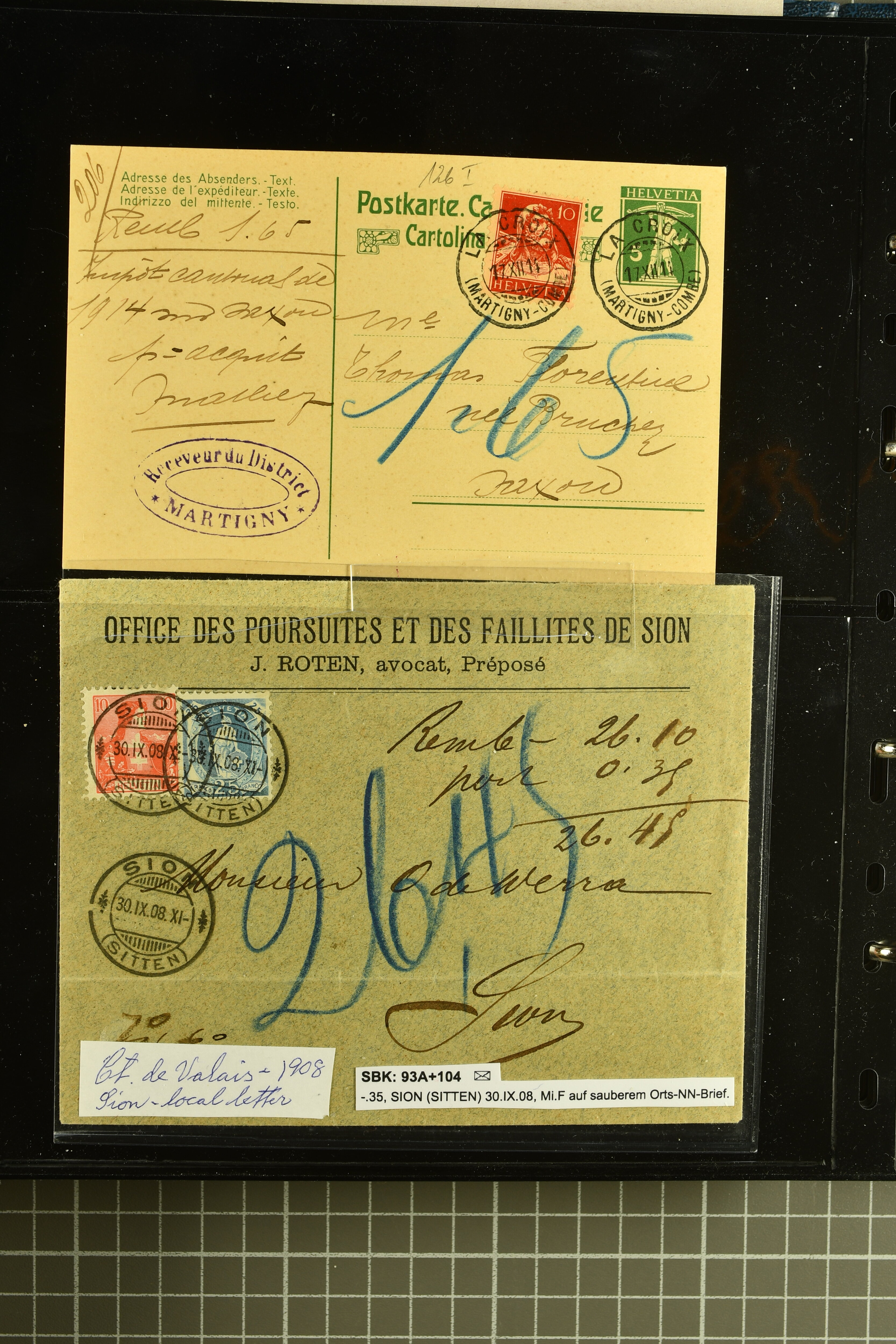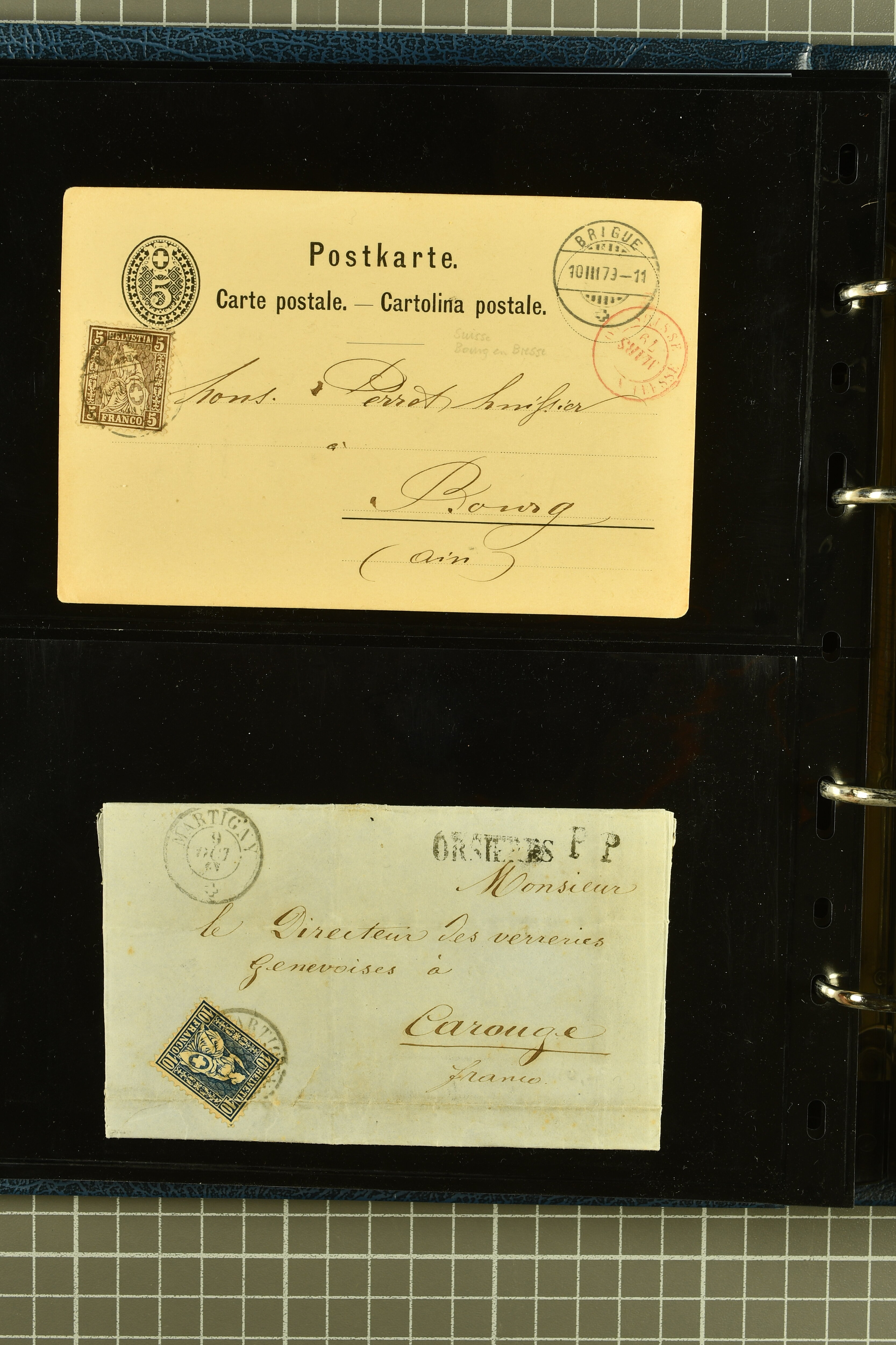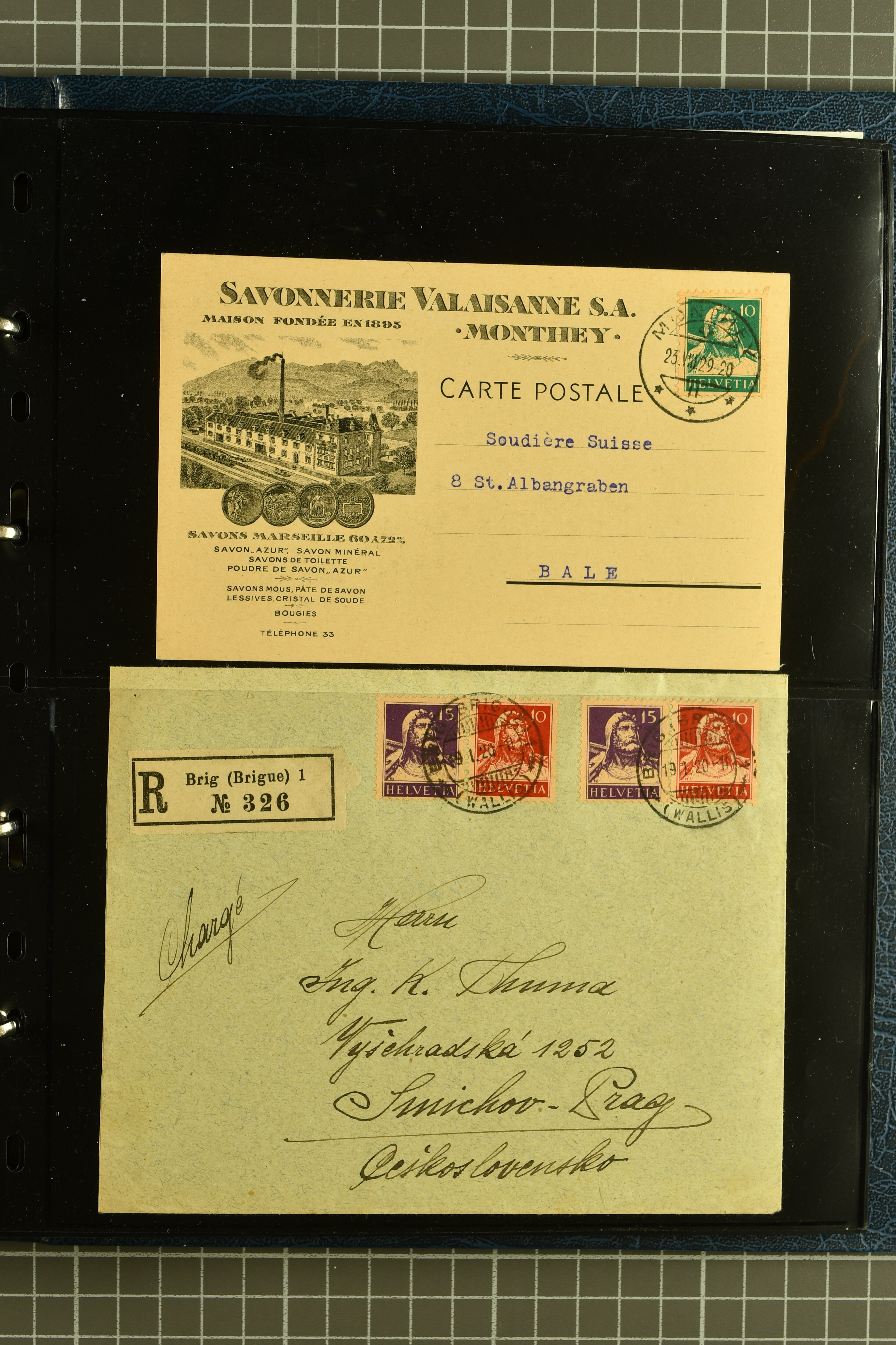 9882 cover imagePostgeschichte Kanton Wallis 1850/1970 (ca.): Bemerkenswerte Sammlung von über 200 Briefen und Karten. Beginnend mit Rayon I hellblau, Unbekannter Stein: Typen 7 + 13 l/o auf sauberem Faltbrief von Martigny nach Ardon sowie Buntfrankatur Rayon II, Stein B: Type 23 r/u und Rayon I hellblau, Stein B3: Type 40 l/u auf Faltbrief von St. Maurice nach Lausanne folgen drei Strubelfrankaturen inkl. einem Auslandsbrief von St. Bernard nach Besançon, Frankreich und eine starke Partie Sitzende Helvetia mit seltenen Entwertungen wie gefasstem Stabstp. "ST. MAURICE" (AW 3435) auf 10 Rp. rot im senkr. Paar als Zusatzfrankatur auf eingeschriebenem Tüblibrief 10 Rp. rot (Vorders.) nach Sion, Druckschrift-Stabstp. "SALVAN" (AW 2931) oder "GRANGES PRÈS SION" (AW 3089) jeweils als Entwertungsstp., kl. Zweikreisstp. "BOURG DE CONTHEY 25 FEV. 80" ideal klar auf 15 Rp. gelb als Einzelfrankatur auf Nachnahme-Couvert über Fr. 1.65 nach Sion aber auch Bahnpoststp., refüsierte Sendungen, Drucksachen, Nachnahmen, Auslandsfrankaturen etc sowie Ganzsachen wie Tüblibrief 10 Rp. rot entw. mit seltenerweise über dem Wertstempel aufges. Stabstp. "GONDO" oder Inlands-Doppelpostkarte 5 Rp. braun, Antwortteil (SGSSV: PK.005.A) mit seltenem zweizeiligem Stabstp. "LOUËSCHE / BAINS" (AW 2239) nach Bern (1877). Später Ziffermuster und Stehende Helvetia mit einigen hohen Nachnahmefrankaturen, Auslandsbriefen inkl. 50 Rp. blau in der "groben" Zähnung 9¾:9¼ (SBK 70B) auf eingeschr. Brief von Champéry nach Prag oder 25 Rp. grün in derselben Zähnung auf Brief von Zermatt nach Berlin, seltene Stabstp. wie zweizeilige "COURRIER FRANCAIS / CHAMONIX-CHTELARD", "BETTEN / (WALLIS)" oder "GRENGIOLS / (WALLIS)", seltener Stationsstempel "VERNAYAZ 18 AOUT 86" in violett oder zahlreiche Hotelstempel. Auch die späteren Ausgaben sind mit seltenen "Fleuron-" oder Stabstempel kleiner Ortschaften, attraktiven illustrierten Briefen und Karten, Telegrammen interessanten Frankaturen wie Tellbrustbild 10 Rp. rot, Type I (SBK 126/I) auf Nachnahmekarte von La Croix (Martigny) nach Saxon, schönen Pro Juventute-Frankaturen, Dienstleistungen wie Eilsendung von Riddes nach Paris, Postformularen wie "Rück- oder Auszahlungsschein" von Brig nach Varen mit entspr. Stabstp. oder kompl. Anrechnungskarte mit Helvetia mit Schwert 50 Rp. grün von Versegères gut vertreten. Eine vielseitige Sammlung in meist guter Erhaltung; zwei Befunde, drei Atteste (Image 1) (Image 2) (Image 3) (Image 4) (Image 5) (Image 6) (Image 7) (Image 8) (Image 9) (Image 10) (Image 11) (Image 12) (Image 13) (Image 14) (Image 15) (Image 16) (Image 17) (Image 18) (Image 19) (Image 20) (Image 21) (Image 22) (Image 23) (Image 24) (Image 25) (Image 26) (Image 27) (Image 28) (Image 29) (Image 30) (Image 31) (Image 32) (Image 33) (Image 34) (Image 35) (Image 36) (Image 37) (Image 38) (Image 39) (Image 40) (Image 41) (Image 42) (Image 43) (Image 44) (Image 45) (Image 46) (Image 47) (Image 48) (Image 49) (Image 50)
