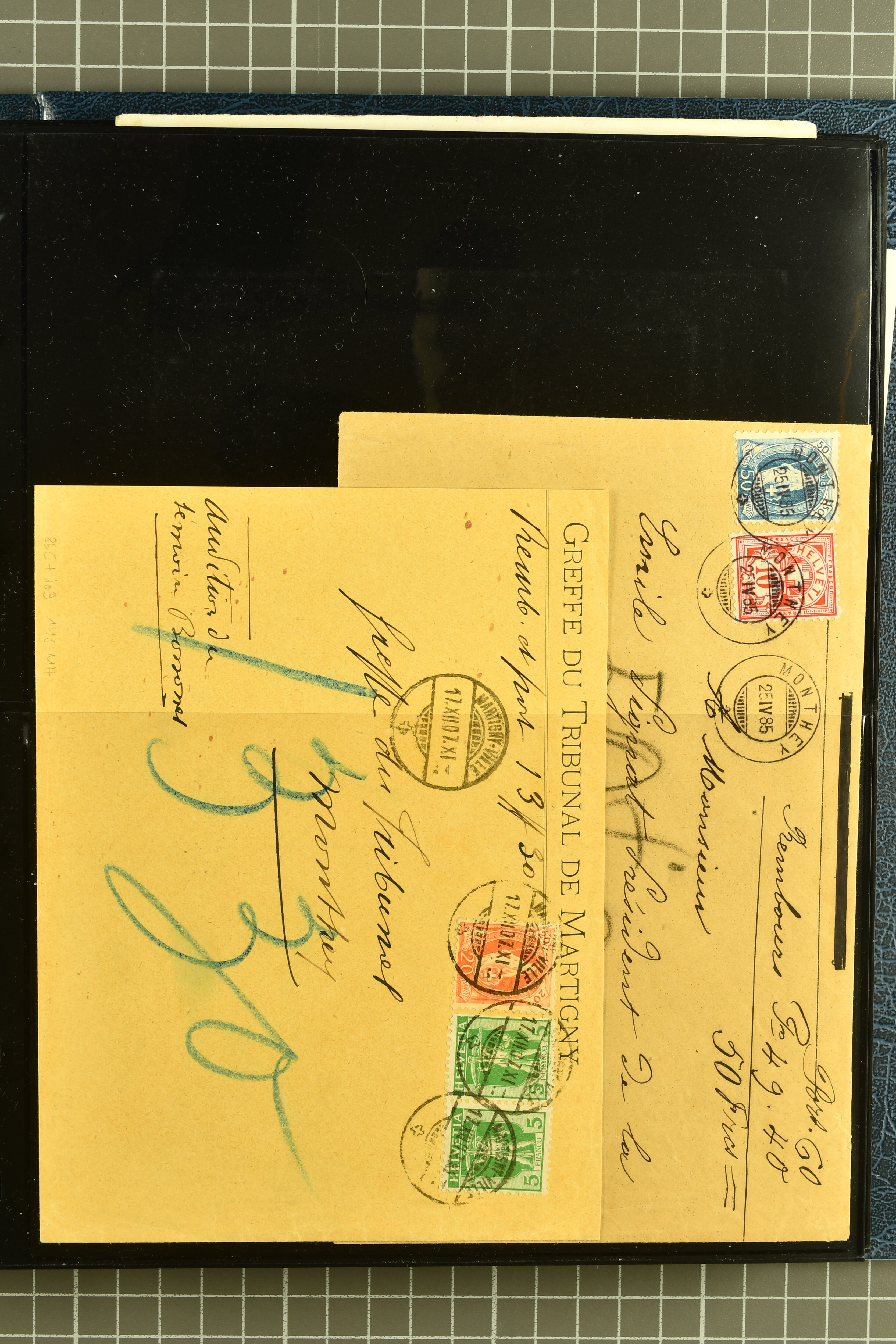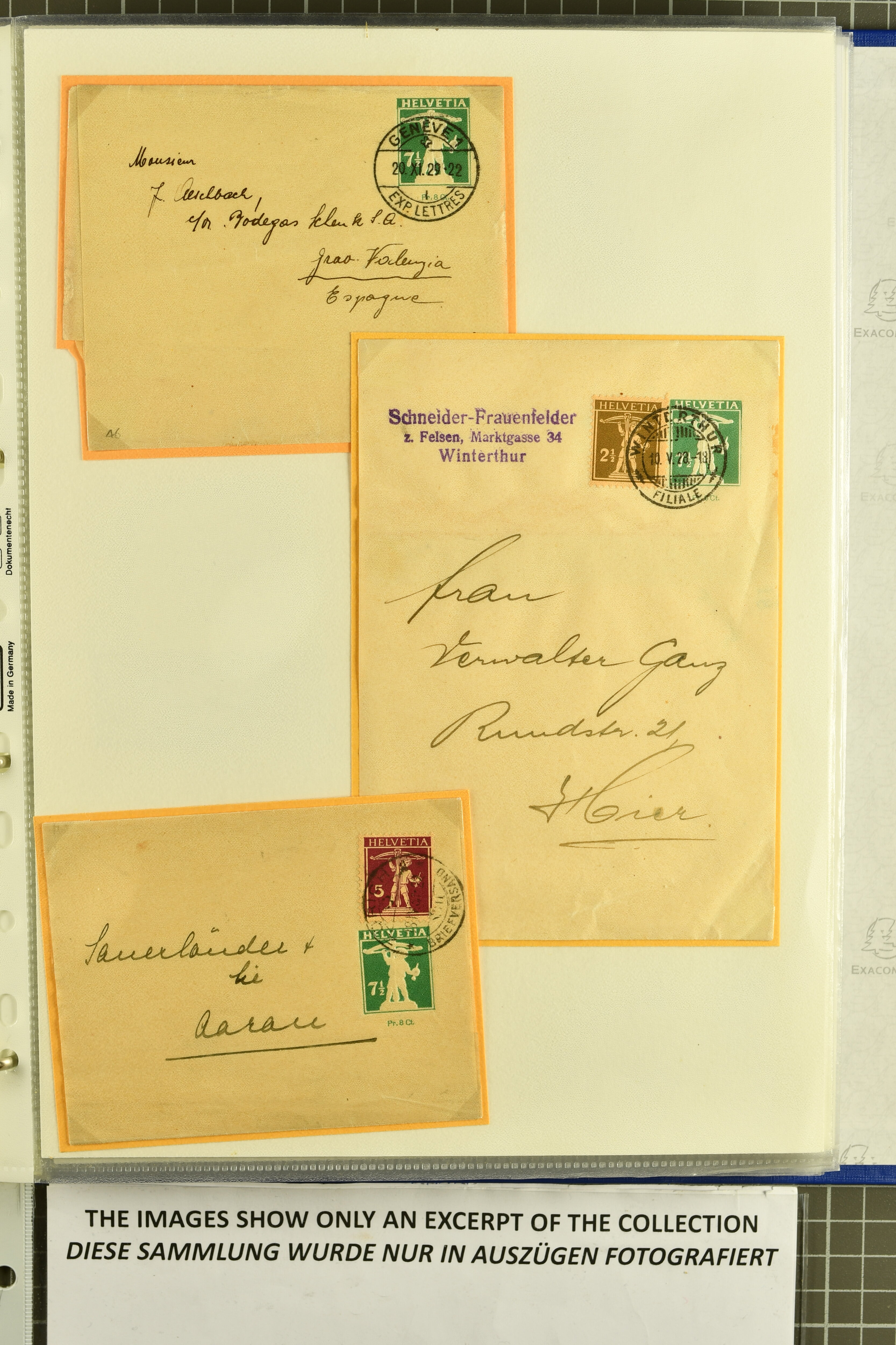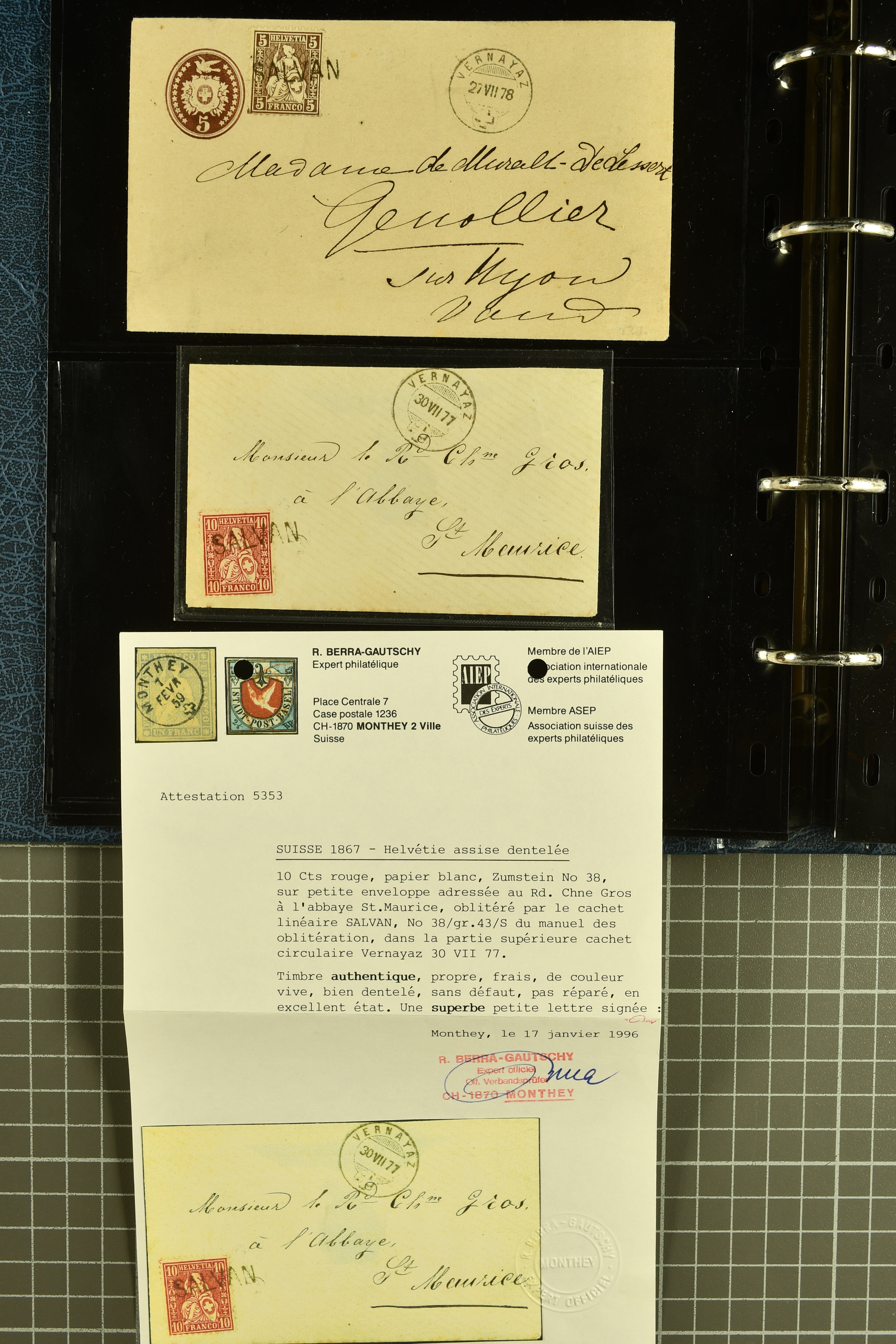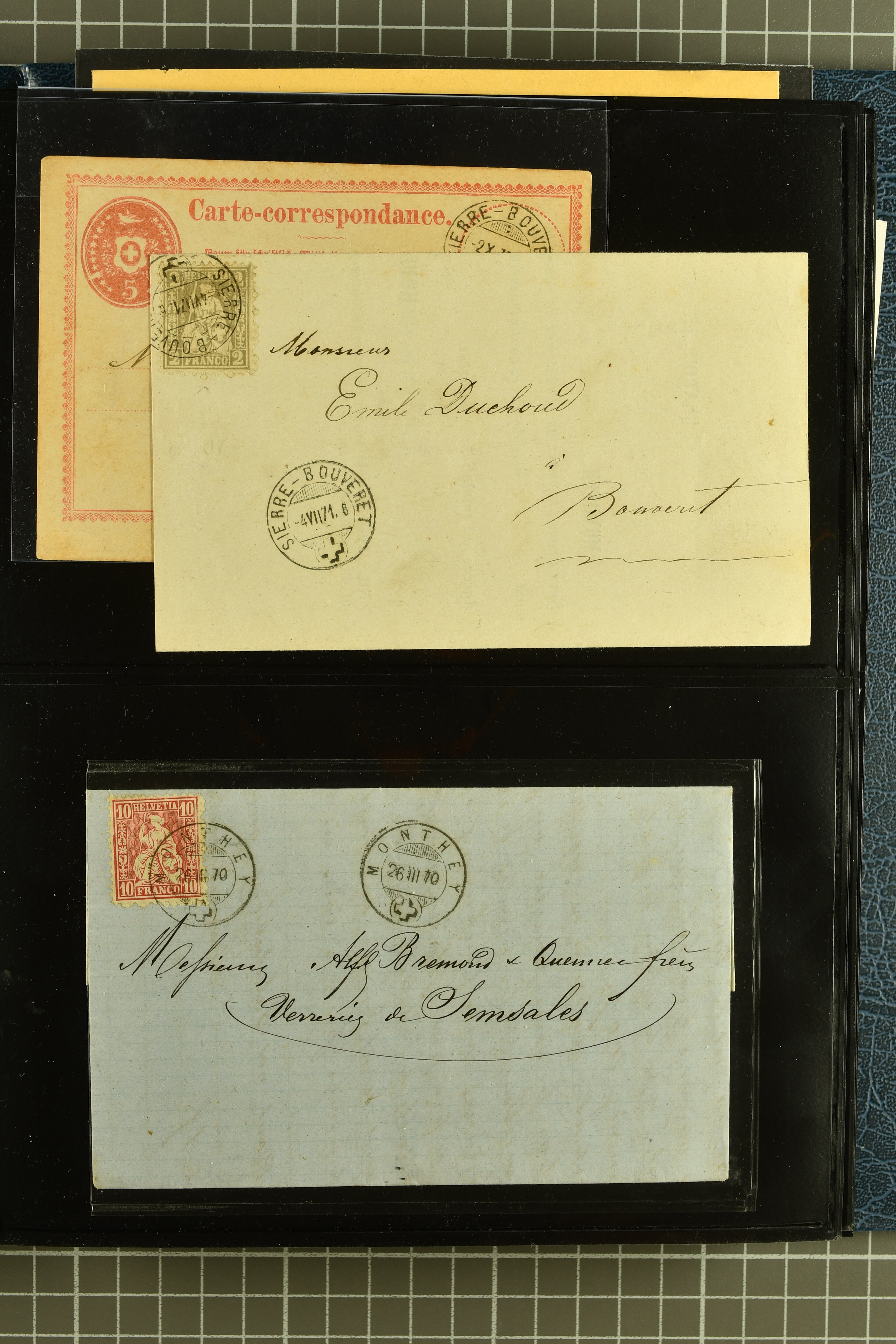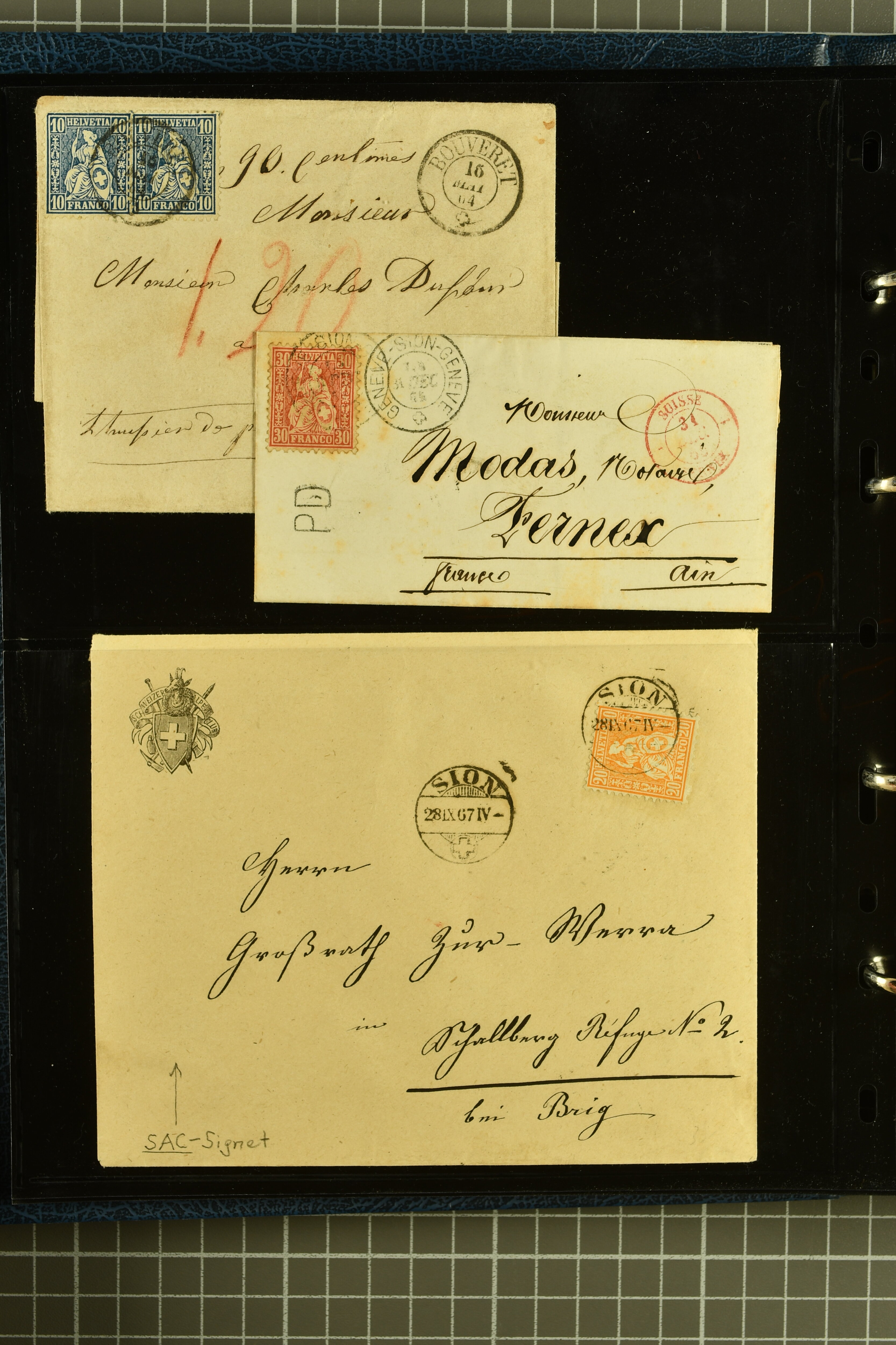 9882 cover imagePostgeschichte Kanton Wallis 1850/1970 (ca.): Bemerkenswerte Sammlung von über 200 Briefen und Karten. Beginnend mit Rayon I hellblau, Unbekannter Stein: Typen 7 + 13 l/o auf sauberem Faltbrief von Martigny nach Ardon sowie Buntfrankatur Rayon II, Stein B: Type 23 r/u und Rayon I hellblau, Stein B3: Type 40 l/u auf Faltbrief von St. Maurice nach Lausanne folgen drei Strubelfrankaturen inkl. einem Auslandsbrief von St. Bernard nach Besançon, Frankreich und eine starke Partie Sitzende Helvetia mit seltenen Entwertungen wie gefasstem Stabstp. "ST. MAURICE" (AW 3435) auf 10 Rp. rot im senkr. Paar als Zusatzfrankatur auf eingeschriebenem Tüblibrief 10 Rp. rot (Vorders.) nach Sion, Druckschrift-Stabstp. "SALVAN" (AW 2931) oder "GRANGES PRÈS SION" (AW 3089) jeweils als Entwertungsstp., kl. Zweikreisstp. "BOURG DE CONTHEY 25 FEV. 80" ideal klar auf 15 Rp. gelb als Einzelfrankatur auf Nachnahme-Couvert über Fr. 1.65 nach Sion aber auch Bahnpoststp., refüsierte Sendungen, Drucksachen, Nachnahmen, Auslandsfrankaturen etc sowie Ganzsachen wie Tüblibrief 10 Rp. rot entw. mit seltenerweise über dem Wertstempel aufges. Stabstp. "GONDO" oder Inlands-Doppelpostkarte 5 Rp. braun, Antwortteil (SGSSV: PK.005.A) mit seltenem zweizeiligem Stabstp. "LOUËSCHE / BAINS" (AW 2239) nach Bern (1877). Später Ziffermuster und Stehende Helvetia mit einigen hohen Nachnahmefrankaturen, Auslandsbriefen inkl. 50 Rp. blau in der "groben" Zähnung 9¾:9¼ (SBK 70B) auf eingeschr. Brief von Champéry nach Prag oder 25 Rp. grün in derselben Zähnung auf Brief von Zermatt nach Berlin, seltene Stabstp. wie zweizeilige "COURRIER FRANCAIS / CHAMONIX-CHTELARD", "BETTEN / (WALLIS)" oder "GRENGIOLS / (WALLIS)", seltener Stationsstempel "VERNAYAZ 18 AOUT 86" in violett oder zahlreiche Hotelstempel. Auch die späteren Ausgaben sind mit seltenen "Fleuron-" oder Stabstempel kleiner Ortschaften, attraktiven illustrierten Briefen und Karten, Telegrammen interessanten Frankaturen wie Tellbrustbild 10 Rp. rot, Type I (SBK 126/I) auf Nachnahmekarte von La Croix (Martigny) nach Saxon, schönen Pro Juventute-Frankaturen, Dienstleistungen wie Eilsendung von Riddes nach Paris, Postformularen wie "Rück- oder Auszahlungsschein" von Brig nach Varen mit entspr. Stabstp. oder kompl. Anrechnungskarte mit Helvetia mit Schwert 50 Rp. grün von Versegères gut vertreten. Eine vielseitige Sammlung in meist guter Erhaltung; zwei Befunde, drei Atteste (Image 1) (Image 2) (Image 3) (Image 4) (Image 5) (Image 6) (Image 7) (Image 8) (Image 9) (Image 10) (Image 11) (Image 12) (Image 13) (Image 14) (Image 15) (Image 16) (Image 17) (Image 18) (Image 19) (Image 20) (Image 21) (Image 22) (Image 23) (Image 24) (Image 25) (Image 26) (Image 27) (Image 28) (Image 29) (Image 30) (Image 31) (Image 32) (Image 33) (Image 34) (Image 35) (Image 36) (Image 37) (Image 38) (Image 39) (Image 40) (Image 41) (Image 42) (Image 43) (Image 44) (Image 45) (Image 46) (Image 47) (Image 48) (Image 49) (Image 50)