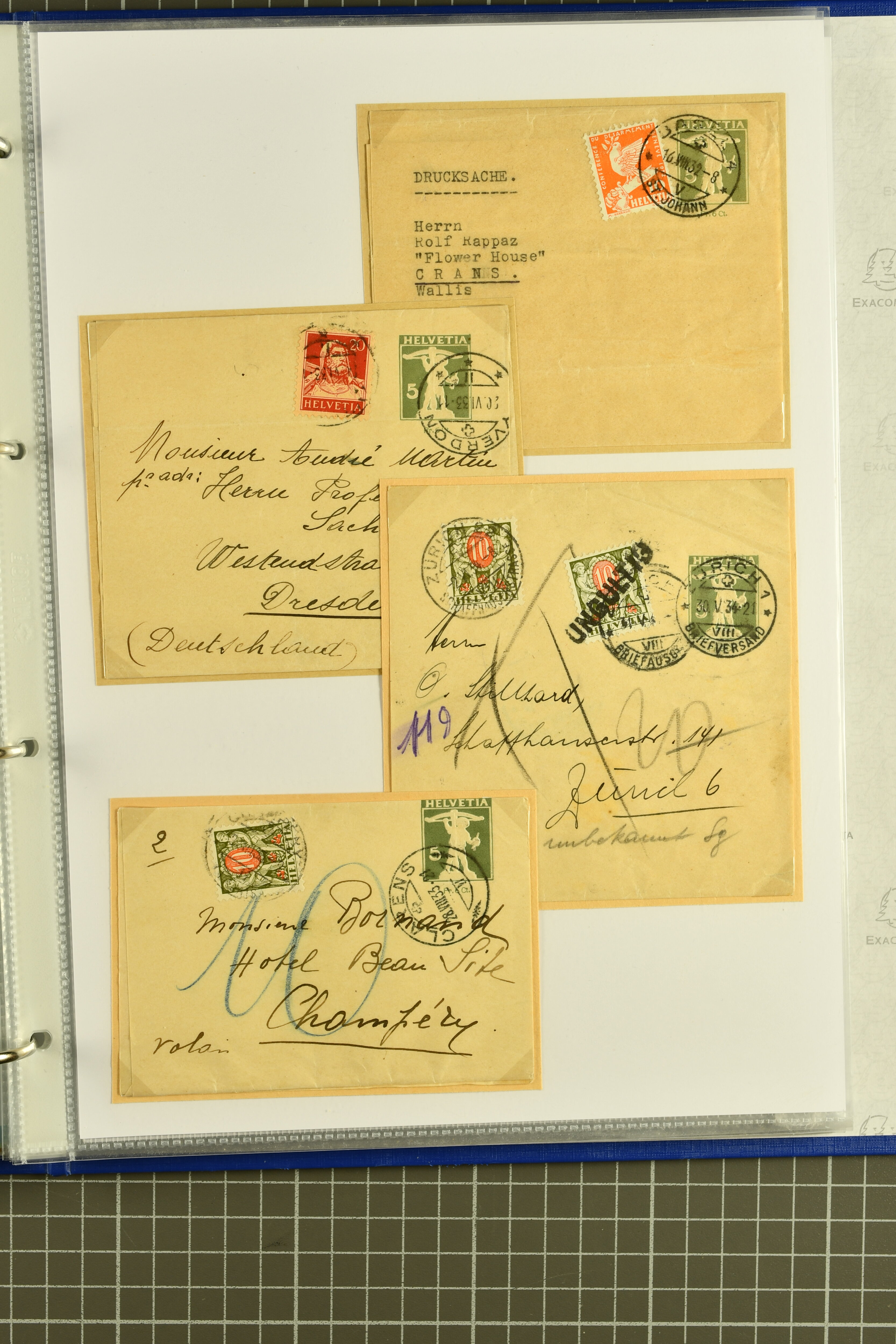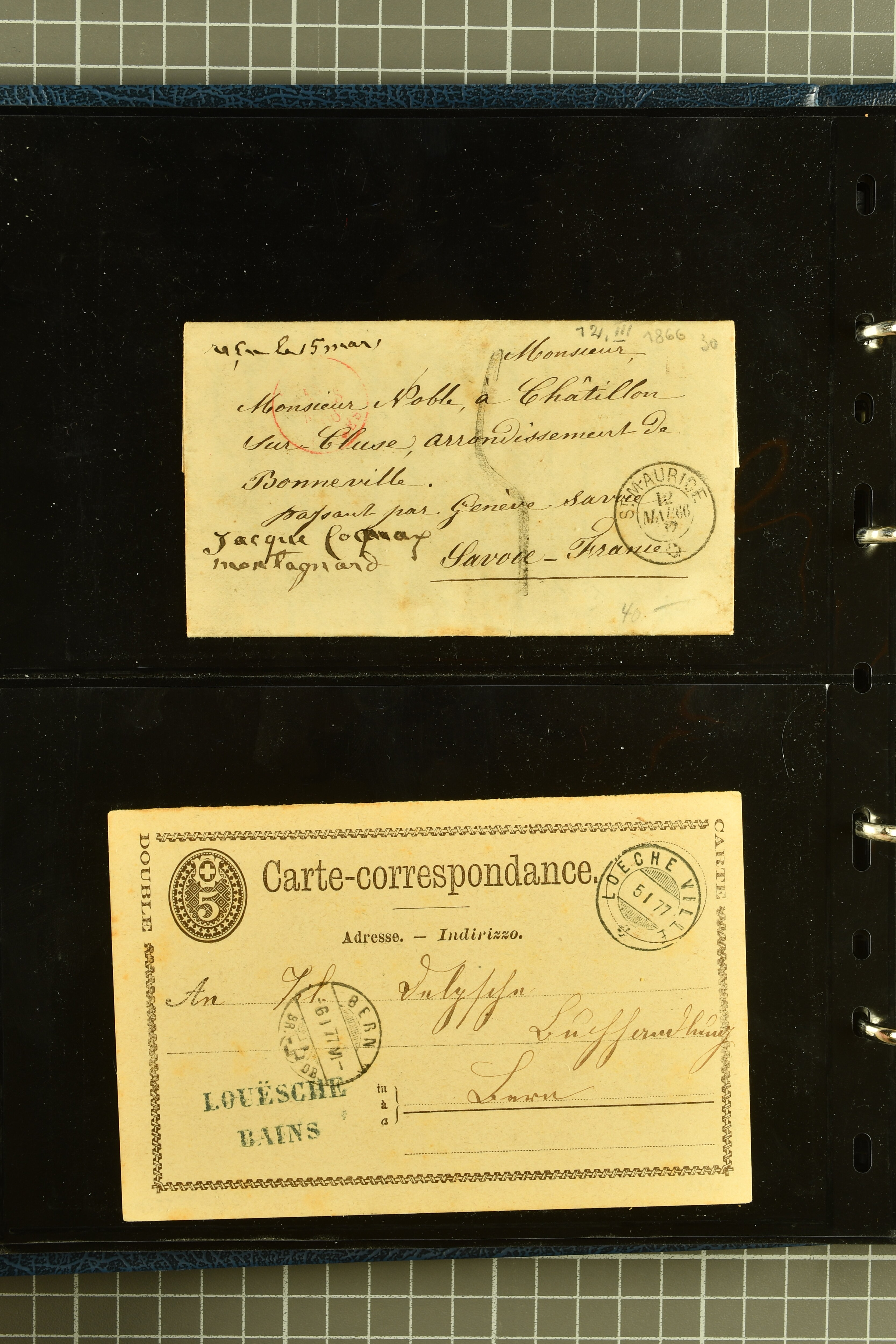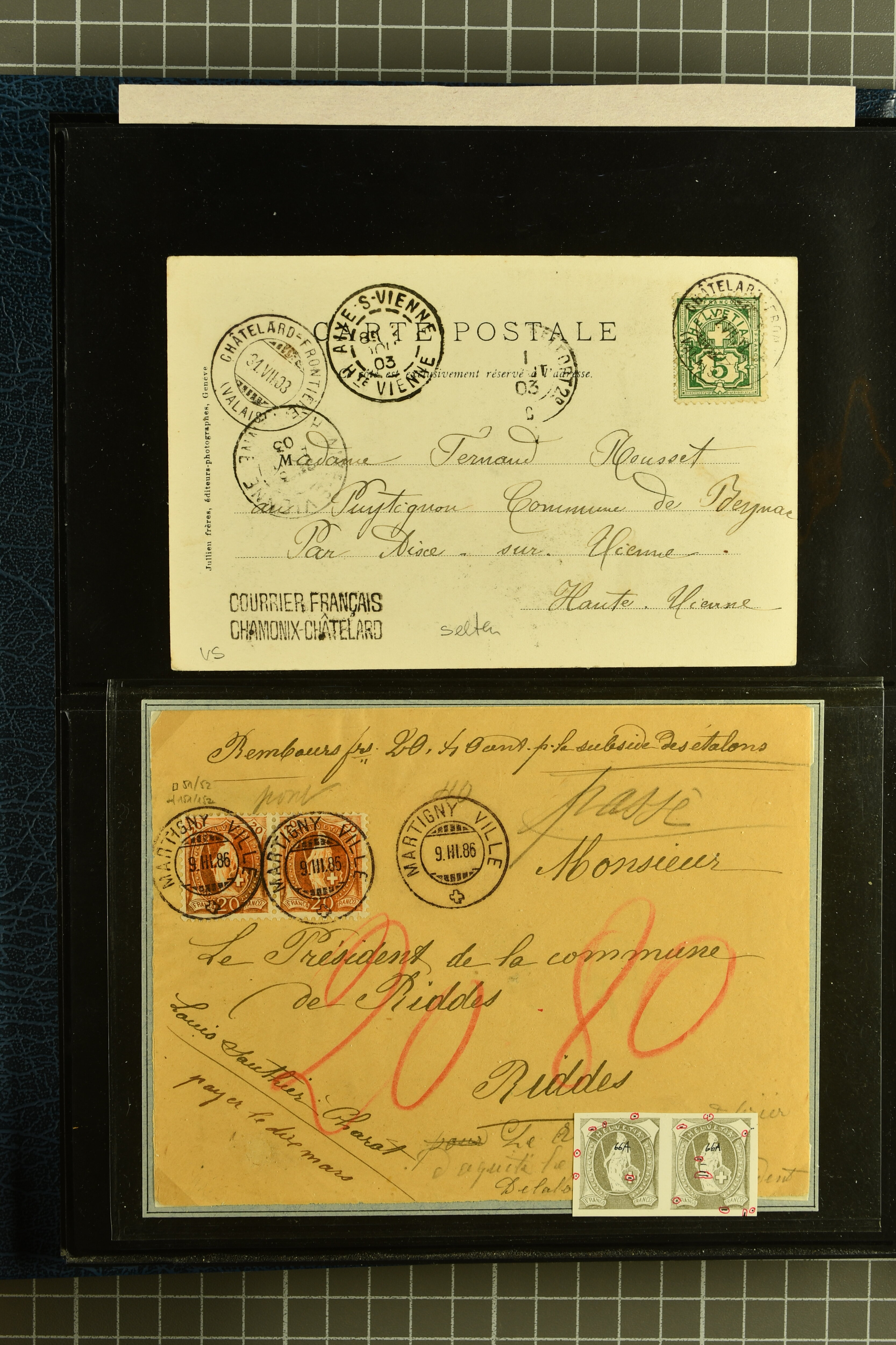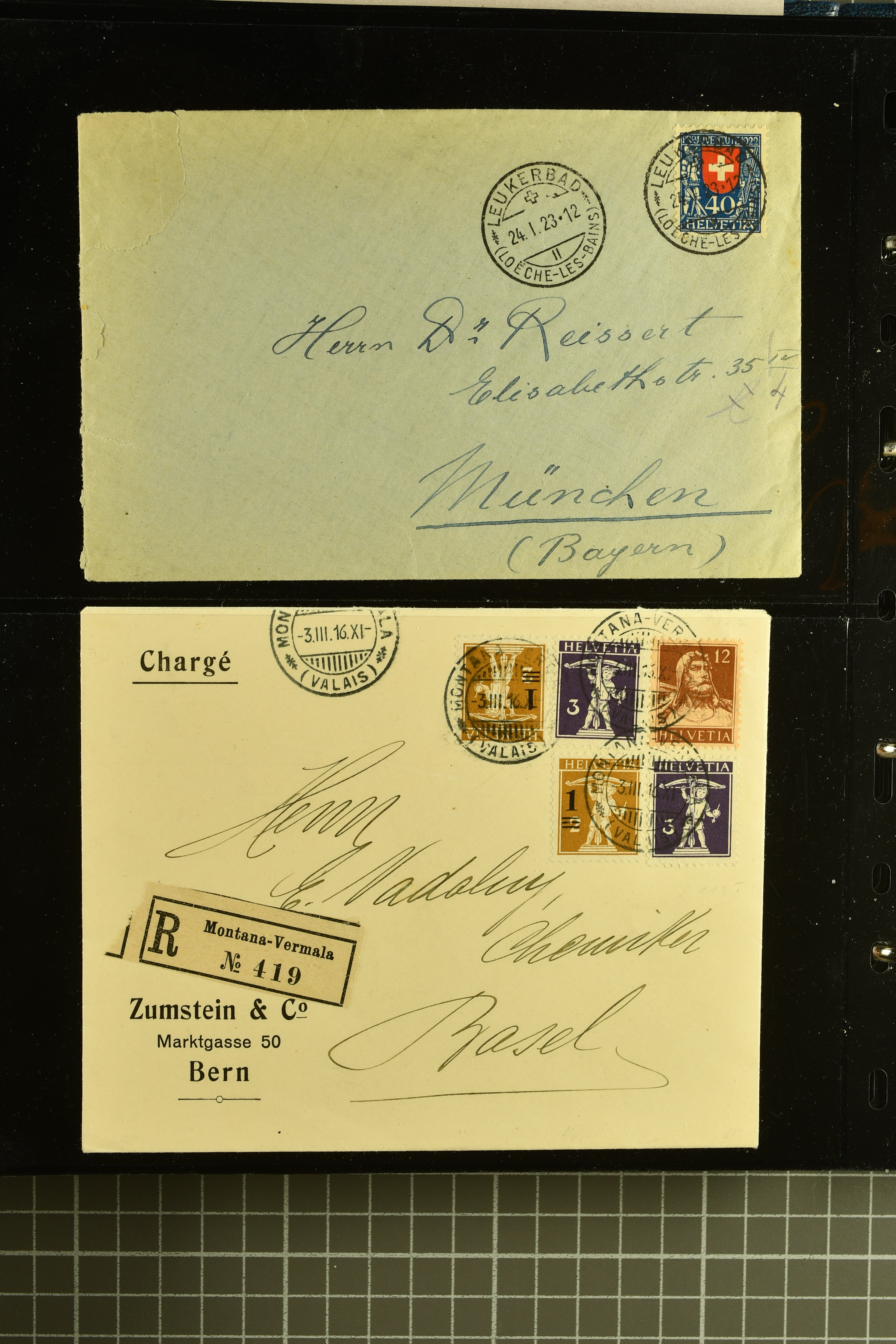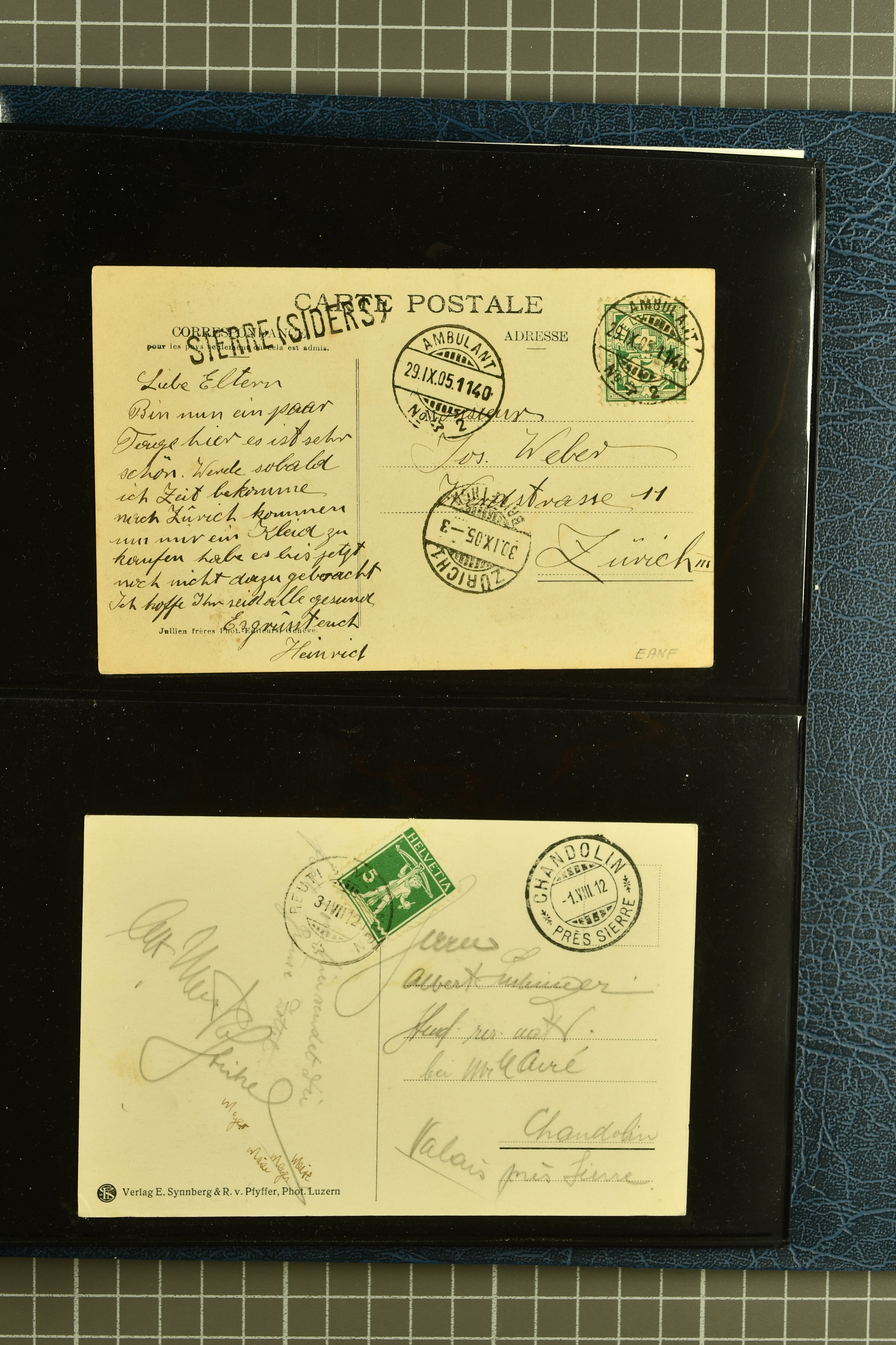 9882 cover imagePostgeschichte Kanton Wallis 1850/1970 (ca.): Bemerkenswerte Sammlung von über 200 Briefen und Karten. Beginnend mit Rayon I hellblau, Unbekannter Stein: Typen 7 + 13 l/o auf sauberem Faltbrief von Martigny nach Ardon sowie Buntfrankatur Rayon II, Stein B: Type 23 r/u und Rayon I hellblau, Stein B3: Type 40 l/u auf Faltbrief von St. Maurice nach Lausanne folgen drei Strubelfrankaturen inkl. einem Auslandsbrief von St. Bernard nach Besançon, Frankreich und eine starke Partie Sitzende Helvetia mit seltenen Entwertungen wie gefasstem Stabstp. "ST. MAURICE" (AW 3435) auf 10 Rp. rot im senkr. Paar als Zusatzfrankatur auf eingeschriebenem Tüblibrief 10 Rp. rot (Vorders.) nach Sion, Druckschrift-Stabstp. "SALVAN" (AW 2931) oder "GRANGES PRÈS SION" (AW 3089) jeweils als Entwertungsstp., kl. Zweikreisstp. "BOURG DE CONTHEY 25 FEV. 80" ideal klar auf 15 Rp. gelb als Einzelfrankatur auf Nachnahme-Couvert über Fr. 1.65 nach Sion aber auch Bahnpoststp., refüsierte Sendungen, Drucksachen, Nachnahmen, Auslandsfrankaturen etc sowie Ganzsachen wie Tüblibrief 10 Rp. rot entw. mit seltenerweise über dem Wertstempel aufges. Stabstp. "GONDO" oder Inlands-Doppelpostkarte 5 Rp. braun, Antwortteil (SGSSV: PK.005.A) mit seltenem zweizeiligem Stabstp. "LOUËSCHE / BAINS" (AW 2239) nach Bern (1877). Später Ziffermuster und Stehende Helvetia mit einigen hohen Nachnahmefrankaturen, Auslandsbriefen inkl. 50 Rp. blau in der "groben" Zähnung 9¾:9¼ (SBK 70B) auf eingeschr. Brief von Champéry nach Prag oder 25 Rp. grün in derselben Zähnung auf Brief von Zermatt nach Berlin, seltene Stabstp. wie zweizeilige "COURRIER FRANCAIS / CHAMONIX-CHTELARD", "BETTEN / (WALLIS)" oder "GRENGIOLS / (WALLIS)", seltener Stationsstempel "VERNAYAZ 18 AOUT 86" in violett oder zahlreiche Hotelstempel. Auch die späteren Ausgaben sind mit seltenen "Fleuron-" oder Stabstempel kleiner Ortschaften, attraktiven illustrierten Briefen und Karten, Telegrammen interessanten Frankaturen wie Tellbrustbild 10 Rp. rot, Type I (SBK 126/I) auf Nachnahmekarte von La Croix (Martigny) nach Saxon, schönen Pro Juventute-Frankaturen, Dienstleistungen wie Eilsendung von Riddes nach Paris, Postformularen wie "Rück- oder Auszahlungsschein" von Brig nach Varen mit entspr. Stabstp. oder kompl. Anrechnungskarte mit Helvetia mit Schwert 50 Rp. grün von Versegères gut vertreten. Eine vielseitige Sammlung in meist guter Erhaltung; zwei Befunde, drei Atteste (Image 1) (Image 2) (Image 3) (Image 4) (Image 5) (Image 6) (Image 7) (Image 8) (Image 9) (Image 10) (Image 11) (Image 12) (Image 13) (Image 14) (Image 15) (Image 16) (Image 17) (Image 18) (Image 19) (Image 20) (Image 21) (Image 22) (Image 23) (Image 24) (Image 25) (Image 26) (Image 27) (Image 28) (Image 29) (Image 30) (Image 31) (Image 32) (Image 33) (Image 34) (Image 35) (Image 36) (Image 37) (Image 38) (Image 39) (Image 40) (Image 41) (Image 42) (Image 43) (Image 44) (Image 45) (Image 46) (Image 47) (Image 48) (Image 49) (Image 50)