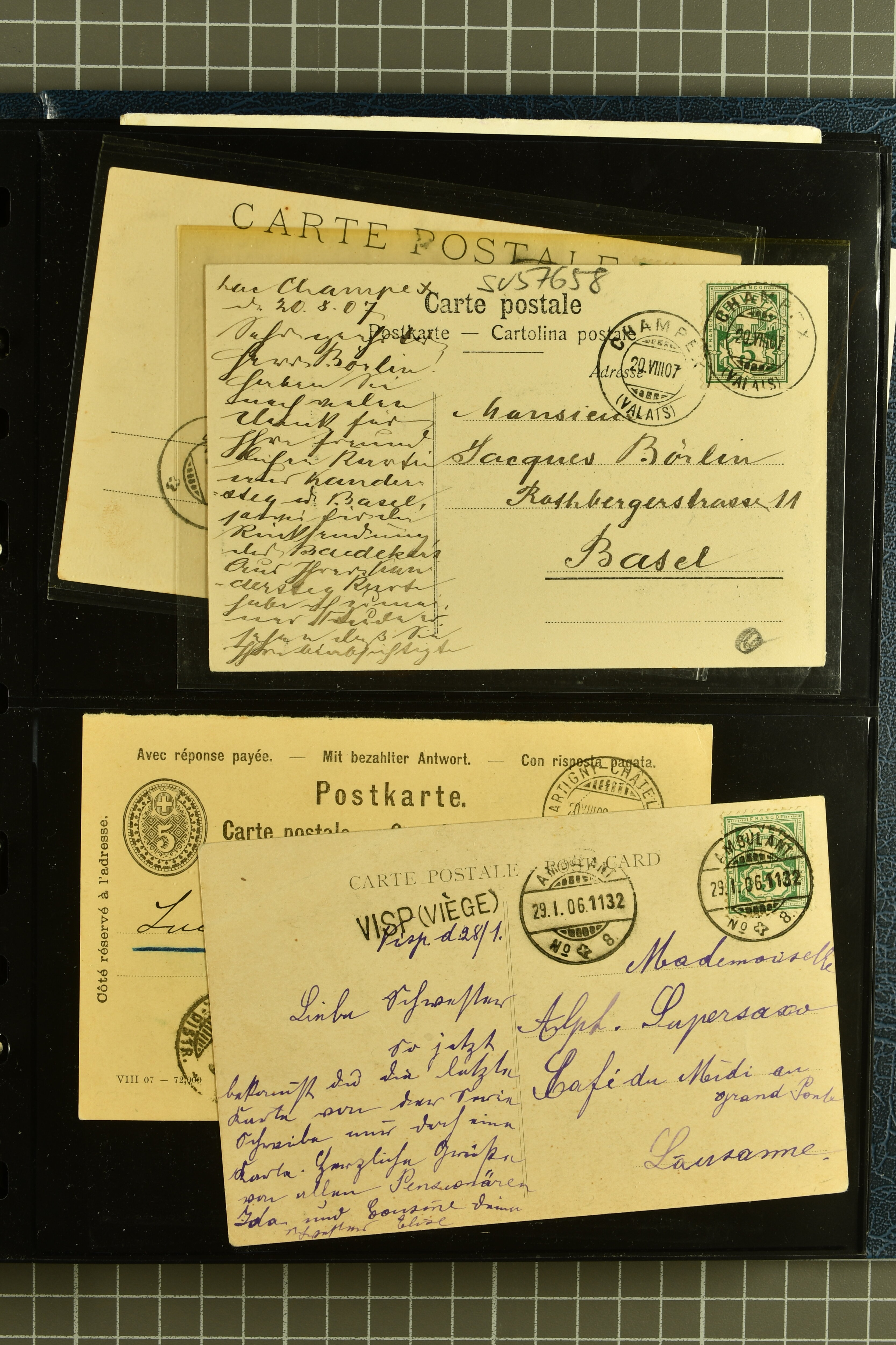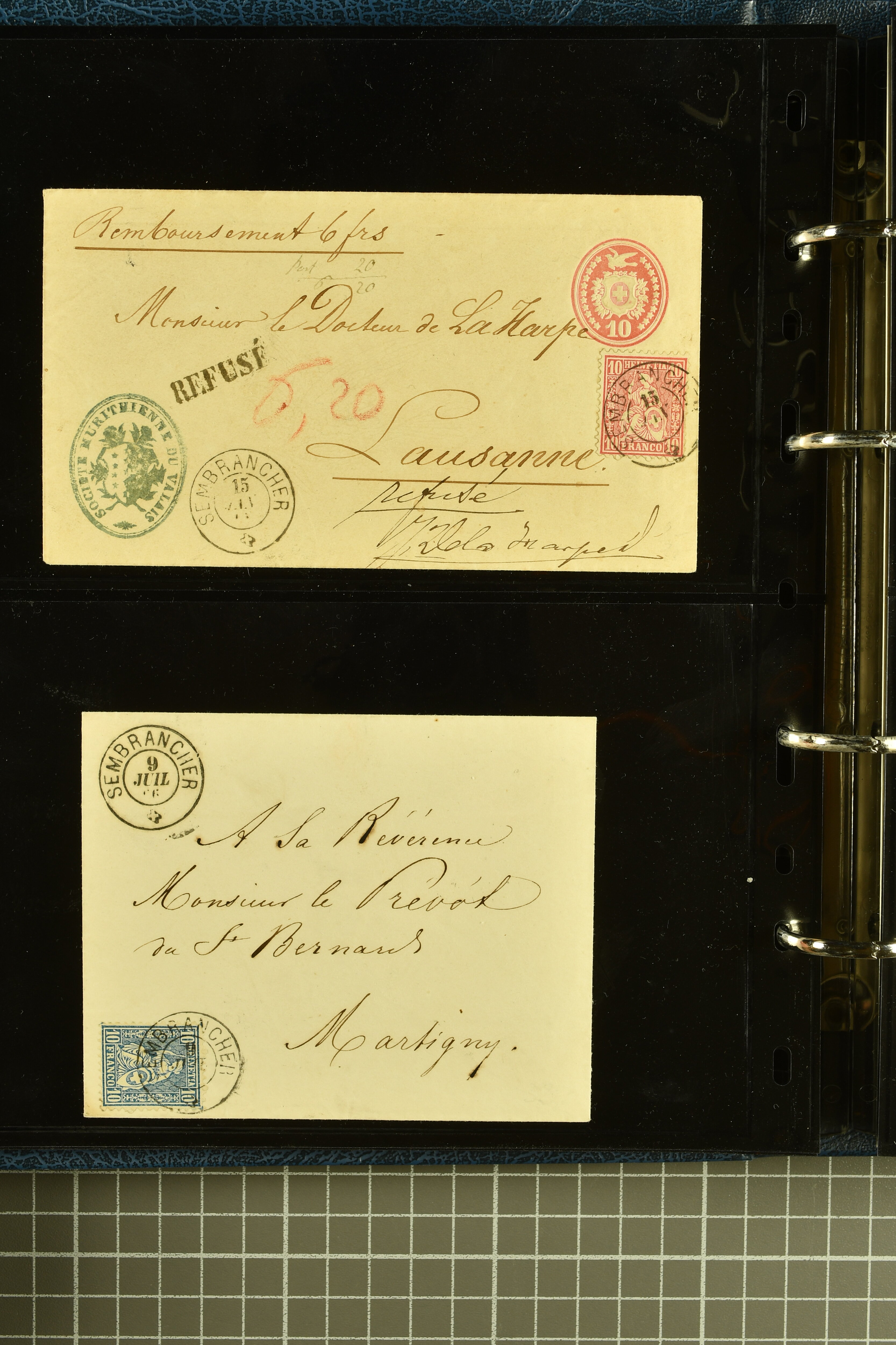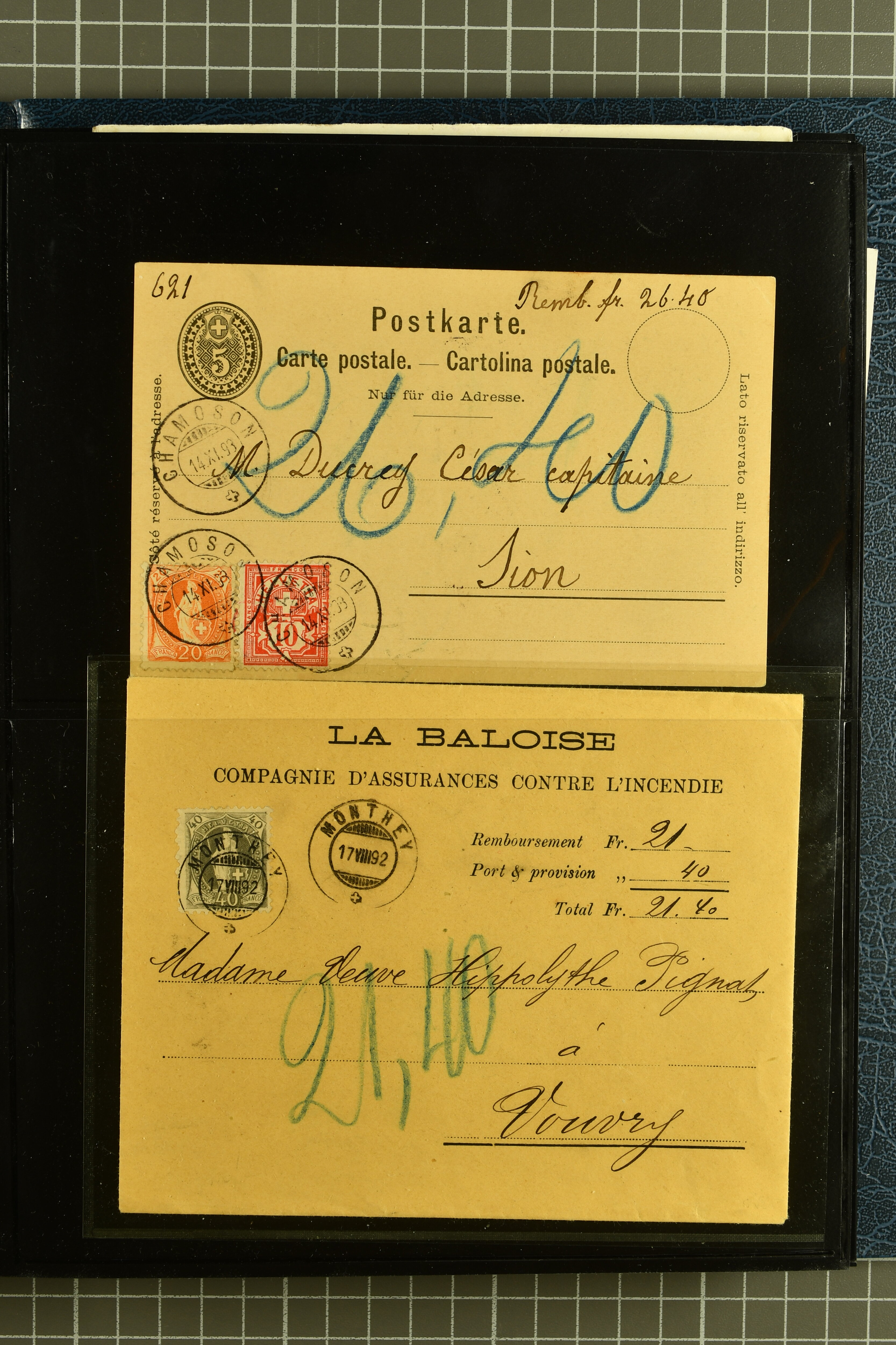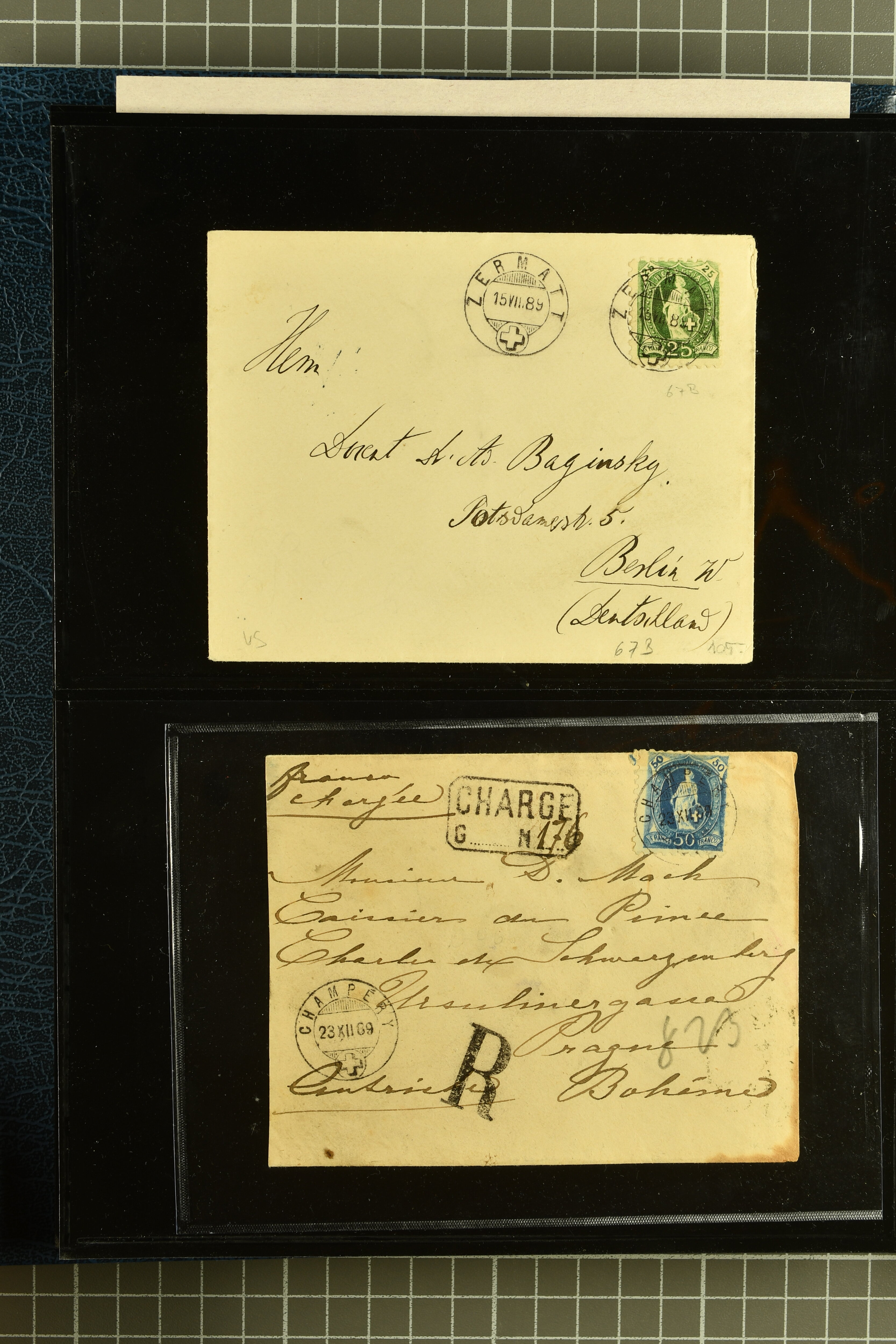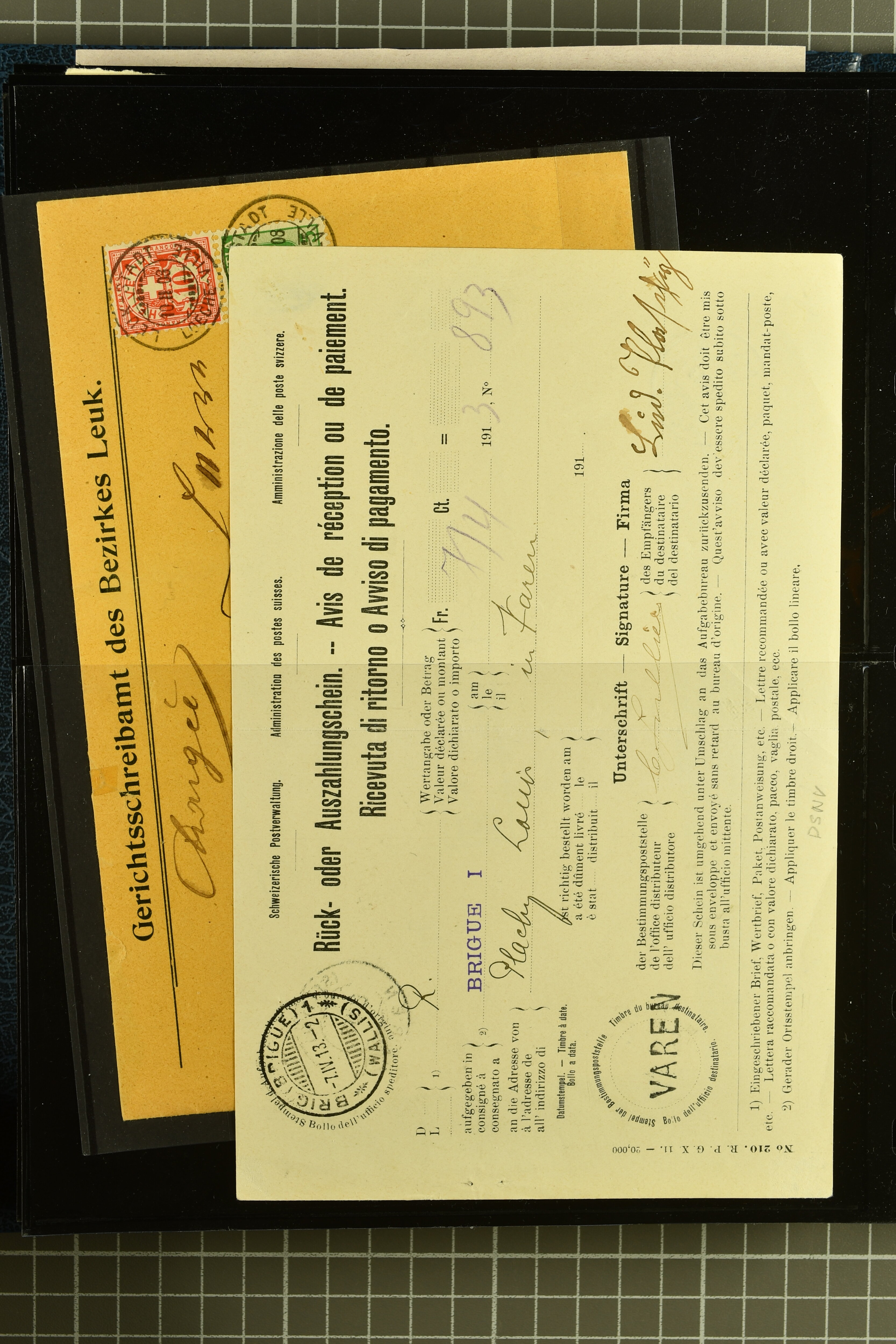 9882 cover imagePostgeschichte Kanton Wallis 1850/1970 (ca.): Bemerkenswerte Sammlung von über 200 Briefen und Karten. Beginnend mit Rayon I hellblau, Unbekannter Stein: Typen 7 + 13 l/o auf sauberem Faltbrief von Martigny nach Ardon sowie Buntfrankatur Rayon II, Stein B: Type 23 r/u und Rayon I hellblau, Stein B3: Type 40 l/u auf Faltbrief von St. Maurice nach Lausanne folgen drei Strubelfrankaturen inkl. einem Auslandsbrief von St. Bernard nach Besançon, Frankreich und eine starke Partie Sitzende Helvetia mit seltenen Entwertungen wie gefasstem Stabstp. "ST. MAURICE" (AW 3435) auf 10 Rp. rot im senkr. Paar als Zusatzfrankatur auf eingeschriebenem Tüblibrief 10 Rp. rot (Vorders.) nach Sion, Druckschrift-Stabstp. "SALVAN" (AW 2931) oder "GRANGES PRÈS SION" (AW 3089) jeweils als Entwertungsstp., kl. Zweikreisstp. "BOURG DE CONTHEY 25 FEV. 80" ideal klar auf 15 Rp. gelb als Einzelfrankatur auf Nachnahme-Couvert über Fr. 1.65 nach Sion aber auch Bahnpoststp., refüsierte Sendungen, Drucksachen, Nachnahmen, Auslandsfrankaturen etc sowie Ganzsachen wie Tüblibrief 10 Rp. rot entw. mit seltenerweise über dem Wertstempel aufges. Stabstp. "GONDO" oder Inlands-Doppelpostkarte 5 Rp. braun, Antwortteil (SGSSV: PK.005.A) mit seltenem zweizeiligem Stabstp. "LOUËSCHE / BAINS" (AW 2239) nach Bern (1877). Später Ziffermuster und Stehende Helvetia mit einigen hohen Nachnahmefrankaturen, Auslandsbriefen inkl. 50 Rp. blau in der "groben" Zähnung 9¾:9¼ (SBK 70B) auf eingeschr. Brief von Champéry nach Prag oder 25 Rp. grün in derselben Zähnung auf Brief von Zermatt nach Berlin, seltene Stabstp. wie zweizeilige "COURRIER FRANCAIS / CHAMONIX-CHTELARD", "BETTEN / (WALLIS)" oder "GRENGIOLS / (WALLIS)", seltener Stationsstempel "VERNAYAZ 18 AOUT 86" in violett oder zahlreiche Hotelstempel. Auch die späteren Ausgaben sind mit seltenen "Fleuron-" oder Stabstempel kleiner Ortschaften, attraktiven illustrierten Briefen und Karten, Telegrammen interessanten Frankaturen wie Tellbrustbild 10 Rp. rot, Type I (SBK 126/I) auf Nachnahmekarte von La Croix (Martigny) nach Saxon, schönen Pro Juventute-Frankaturen, Dienstleistungen wie Eilsendung von Riddes nach Paris, Postformularen wie "Rück- oder Auszahlungsschein" von Brig nach Varen mit entspr. Stabstp. oder kompl. Anrechnungskarte mit Helvetia mit Schwert 50 Rp. grün von Versegères gut vertreten. Eine vielseitige Sammlung in meist guter Erhaltung; zwei Befunde, drei Atteste (Image 1) (Image 2) (Image 3) (Image 4) (Image 5) (Image 6) (Image 7) (Image 8) (Image 9) (Image 10) (Image 11) (Image 12) (Image 13) (Image 14) (Image 15) (Image 16) (Image 17) (Image 18) (Image 19) (Image 20) (Image 21) (Image 22) (Image 23) (Image 24) (Image 25) (Image 26) (Image 27) (Image 28) (Image 29) (Image 30) (Image 31) (Image 32) (Image 33) (Image 34) (Image 35) (Image 36) (Image 37) (Image 38) (Image 39) (Image 40) (Image 41) (Image 42) (Image 43) (Image 44) (Image 45) (Image 46) (Image 47) (Image 48) (Image 49) (Image 50)