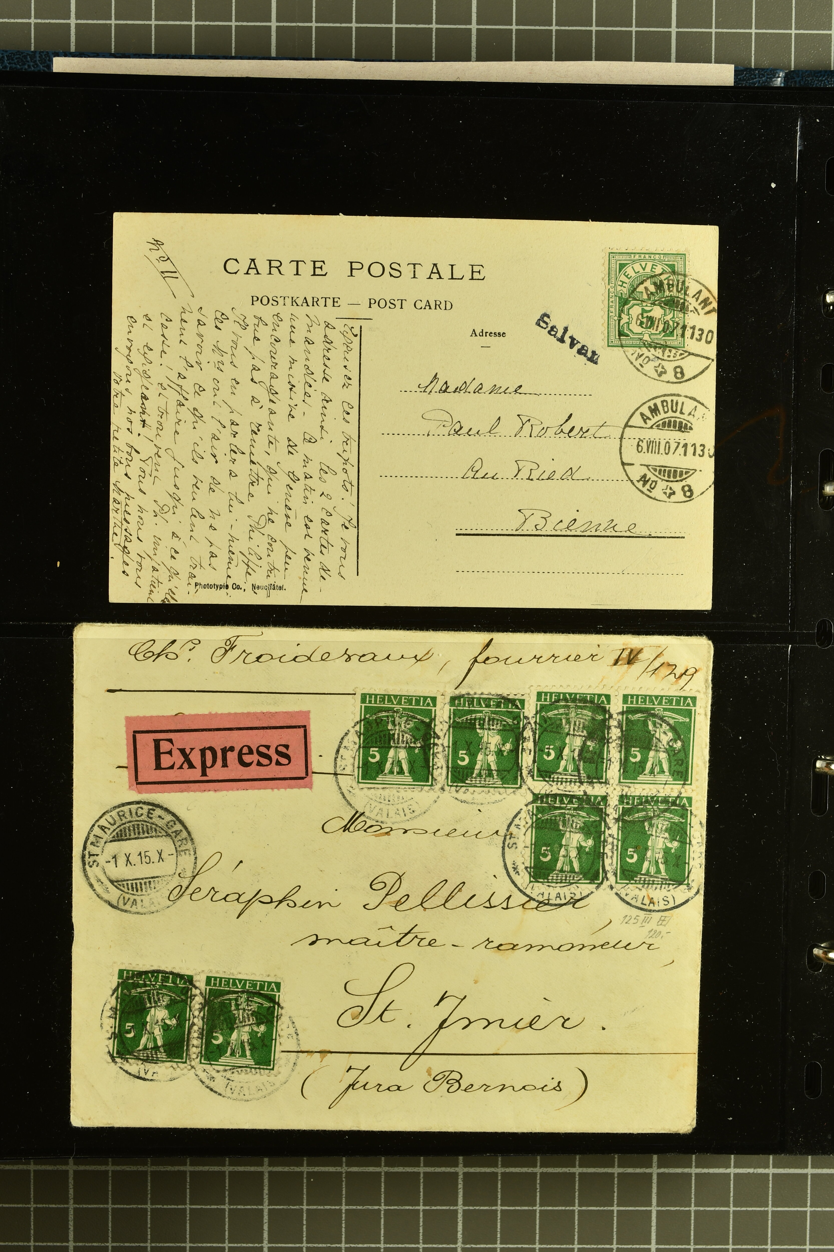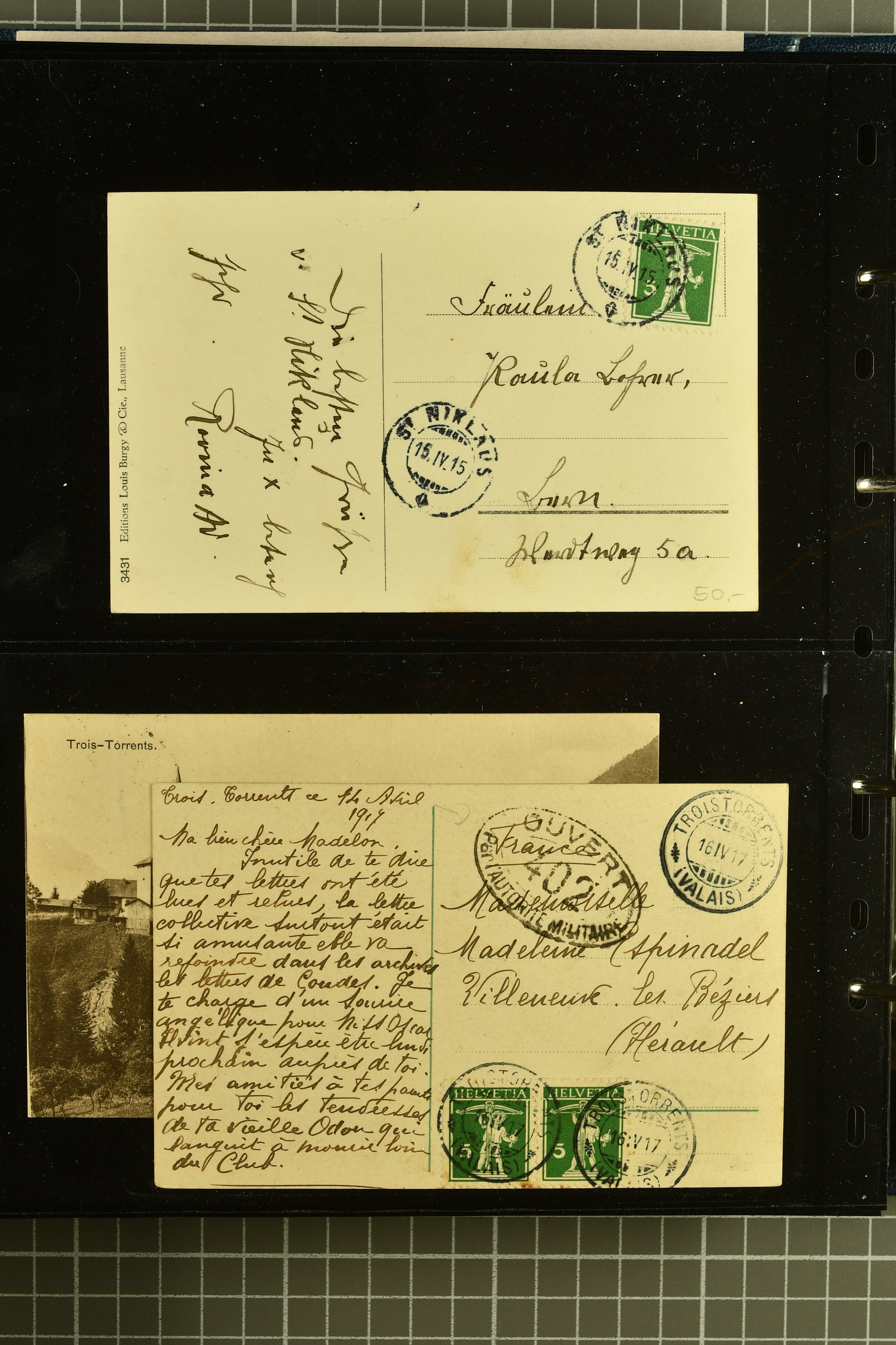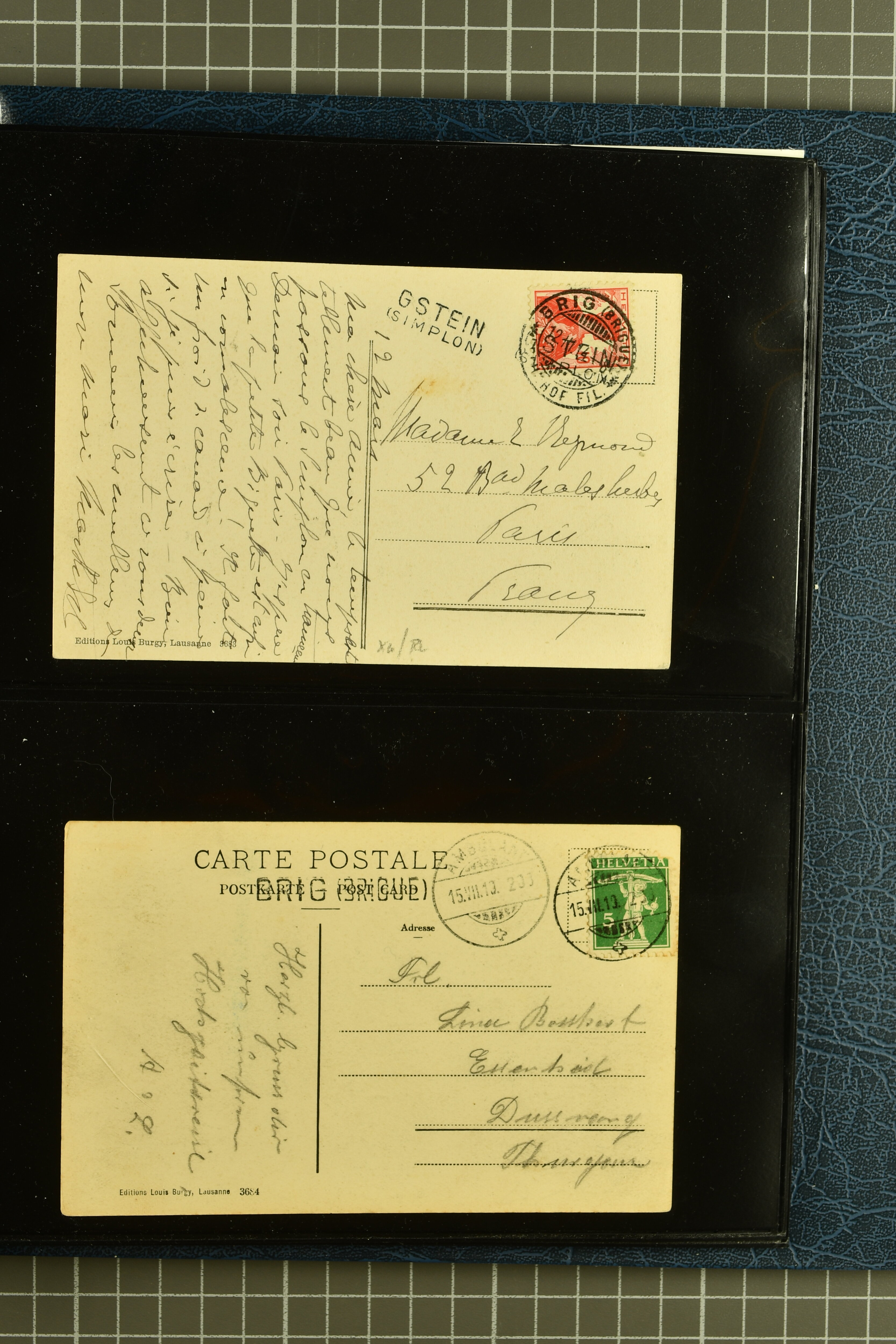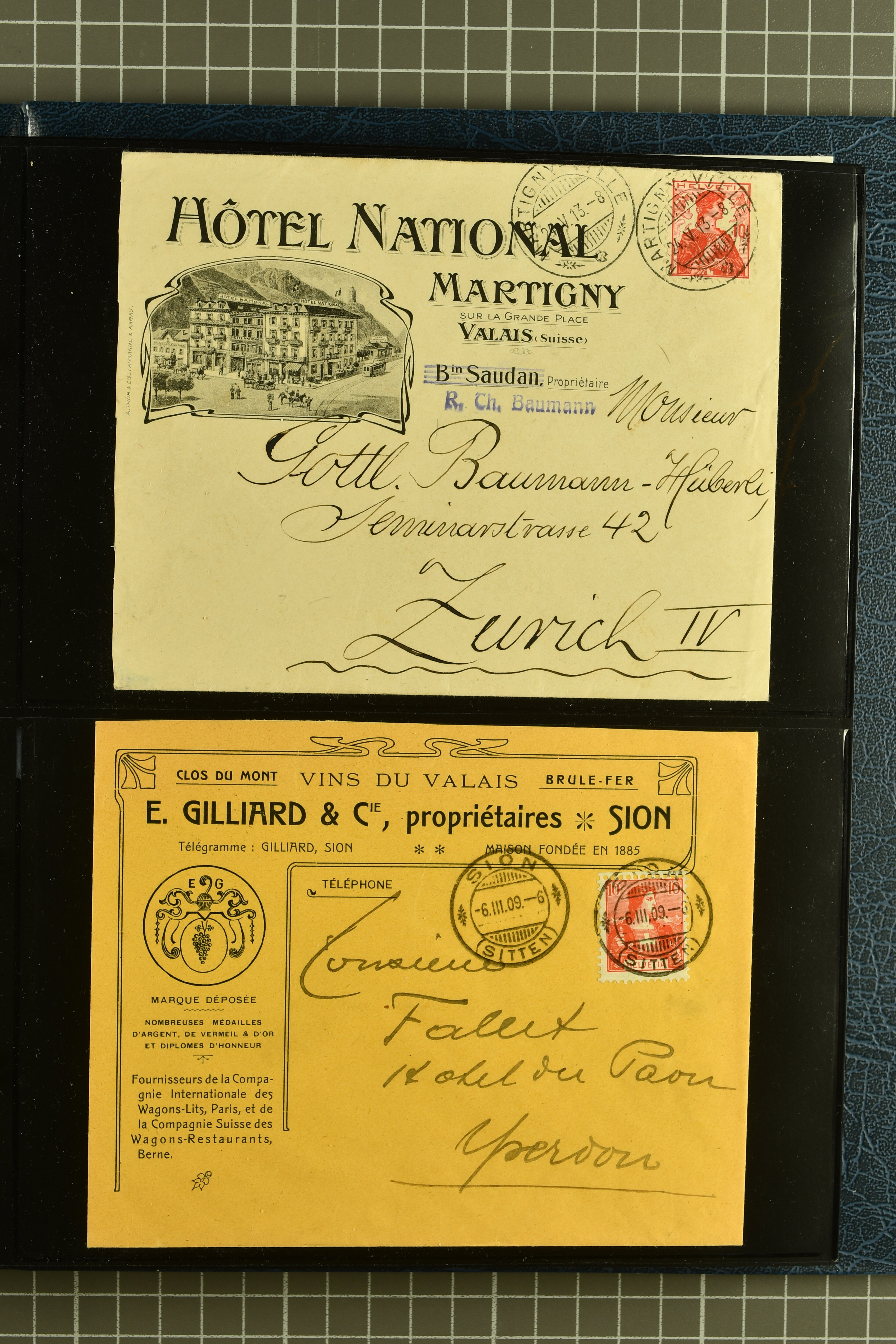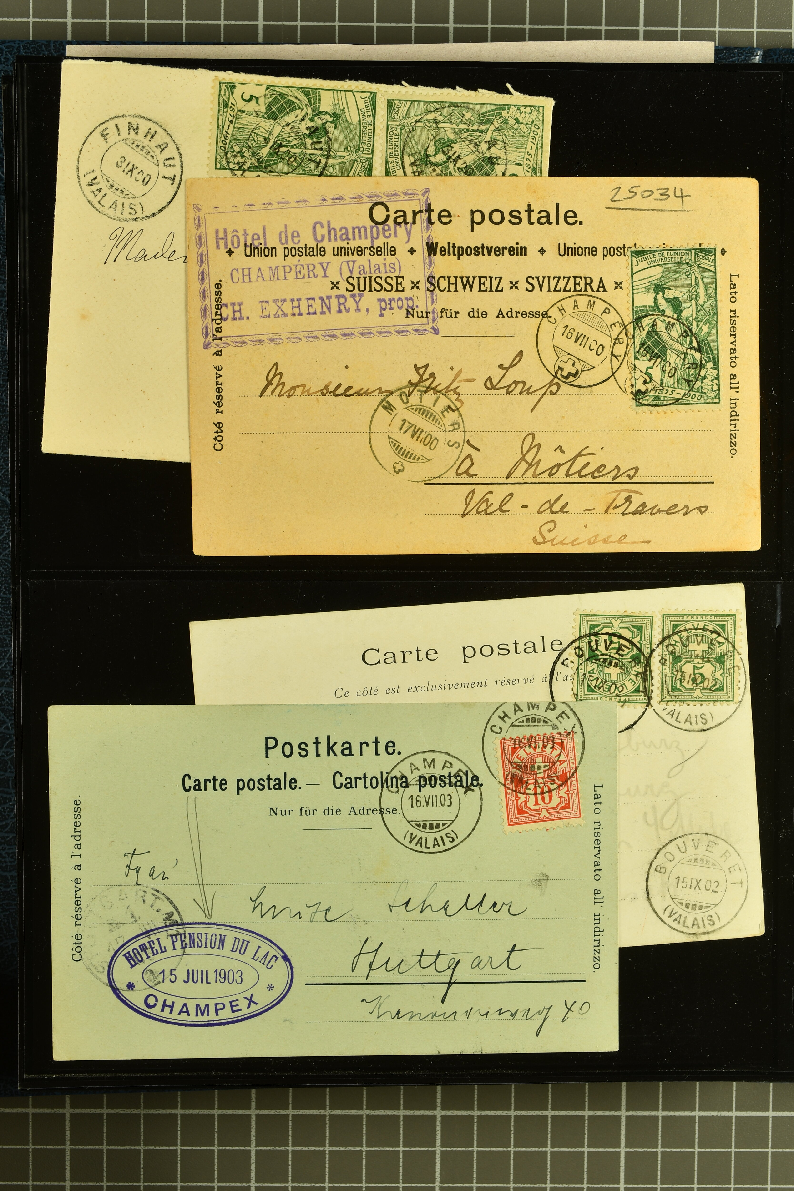 9882 cover imagePostgeschichte Kanton Wallis 1850/1970 (ca.): Bemerkenswerte Sammlung von über 200 Briefen und Karten. Beginnend mit Rayon I hellblau, Unbekannter Stein: Typen 7 + 13 l/o auf sauberem Faltbrief von Martigny nach Ardon sowie Buntfrankatur Rayon II, Stein B: Type 23 r/u und Rayon I hellblau, Stein B3: Type 40 l/u auf Faltbrief von St. Maurice nach Lausanne folgen drei Strubelfrankaturen inkl. einem Auslandsbrief von St. Bernard nach Besançon, Frankreich und eine starke Partie Sitzende Helvetia mit seltenen Entwertungen wie gefasstem Stabstp. "ST. MAURICE" (AW 3435) auf 10 Rp. rot im senkr. Paar als Zusatzfrankatur auf eingeschriebenem Tüblibrief 10 Rp. rot (Vorders.) nach Sion, Druckschrift-Stabstp. "SALVAN" (AW 2931) oder "GRANGES PRÈS SION" (AW 3089) jeweils als Entwertungsstp., kl. Zweikreisstp. "BOURG DE CONTHEY 25 FEV. 80" ideal klar auf 15 Rp. gelb als Einzelfrankatur auf Nachnahme-Couvert über Fr. 1.65 nach Sion aber auch Bahnpoststp., refüsierte Sendungen, Drucksachen, Nachnahmen, Auslandsfrankaturen etc sowie Ganzsachen wie Tüblibrief 10 Rp. rot entw. mit seltenerweise über dem Wertstempel aufges. Stabstp. "GONDO" oder Inlands-Doppelpostkarte 5 Rp. braun, Antwortteil (SGSSV: PK.005.A) mit seltenem zweizeiligem Stabstp. "LOUËSCHE / BAINS" (AW 2239) nach Bern (1877). Später Ziffermuster und Stehende Helvetia mit einigen hohen Nachnahmefrankaturen, Auslandsbriefen inkl. 50 Rp. blau in der "groben" Zähnung 9¾:9¼ (SBK 70B) auf eingeschr. Brief von Champéry nach Prag oder 25 Rp. grün in derselben Zähnung auf Brief von Zermatt nach Berlin, seltene Stabstp. wie zweizeilige "COURRIER FRANCAIS / CHAMONIX-CHTELARD", "BETTEN / (WALLIS)" oder "GRENGIOLS / (WALLIS)", seltener Stationsstempel "VERNAYAZ 18 AOUT 86" in violett oder zahlreiche Hotelstempel. Auch die späteren Ausgaben sind mit seltenen "Fleuron-" oder Stabstempel kleiner Ortschaften, attraktiven illustrierten Briefen und Karten, Telegrammen interessanten Frankaturen wie Tellbrustbild 10 Rp. rot, Type I (SBK 126/I) auf Nachnahmekarte von La Croix (Martigny) nach Saxon, schönen Pro Juventute-Frankaturen, Dienstleistungen wie Eilsendung von Riddes nach Paris, Postformularen wie "Rück- oder Auszahlungsschein" von Brig nach Varen mit entspr. Stabstp. oder kompl. Anrechnungskarte mit Helvetia mit Schwert 50 Rp. grün von Versegères gut vertreten. Eine vielseitige Sammlung in meist guter Erhaltung; zwei Befunde, drei Atteste (Image 1) (Image 2) (Image 3) (Image 4) (Image 5) (Image 6) (Image 7) (Image 8) (Image 9) (Image 10) (Image 11) (Image 12) (Image 13) (Image 14) (Image 15) (Image 16) (Image 17) (Image 18) (Image 19) (Image 20) (Image 21) (Image 22) (Image 23) (Image 24) (Image 25) (Image 26) (Image 27) (Image 28) (Image 29) (Image 30) (Image 31) (Image 32) (Image 33) (Image 34) (Image 35) (Image 36) (Image 37) (Image 38) (Image 39) (Image 40) (Image 41) (Image 42) (Image 43) (Image 44) (Image 45) (Image 46) (Image 47) (Image 48) (Image 49) (Image 50)
