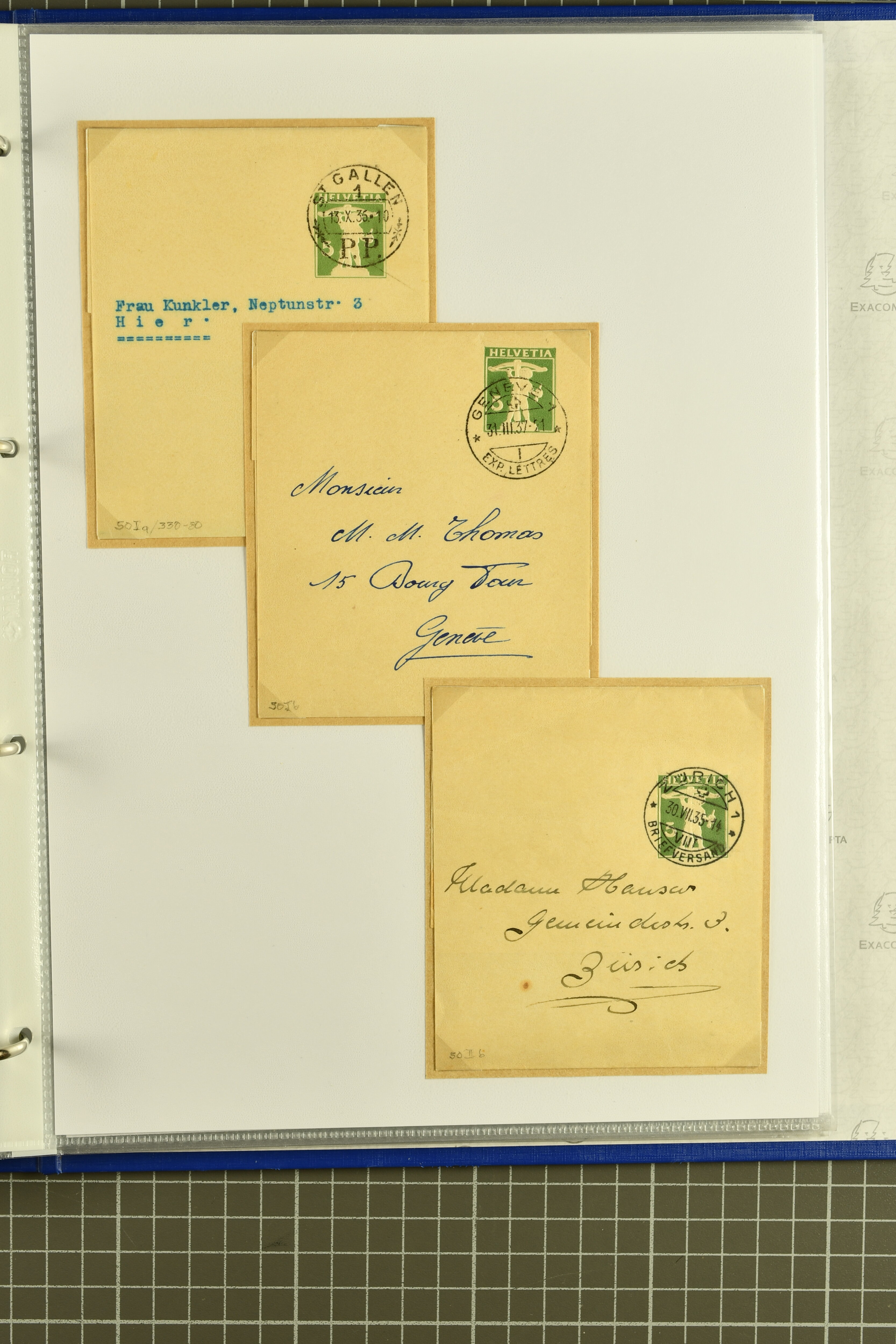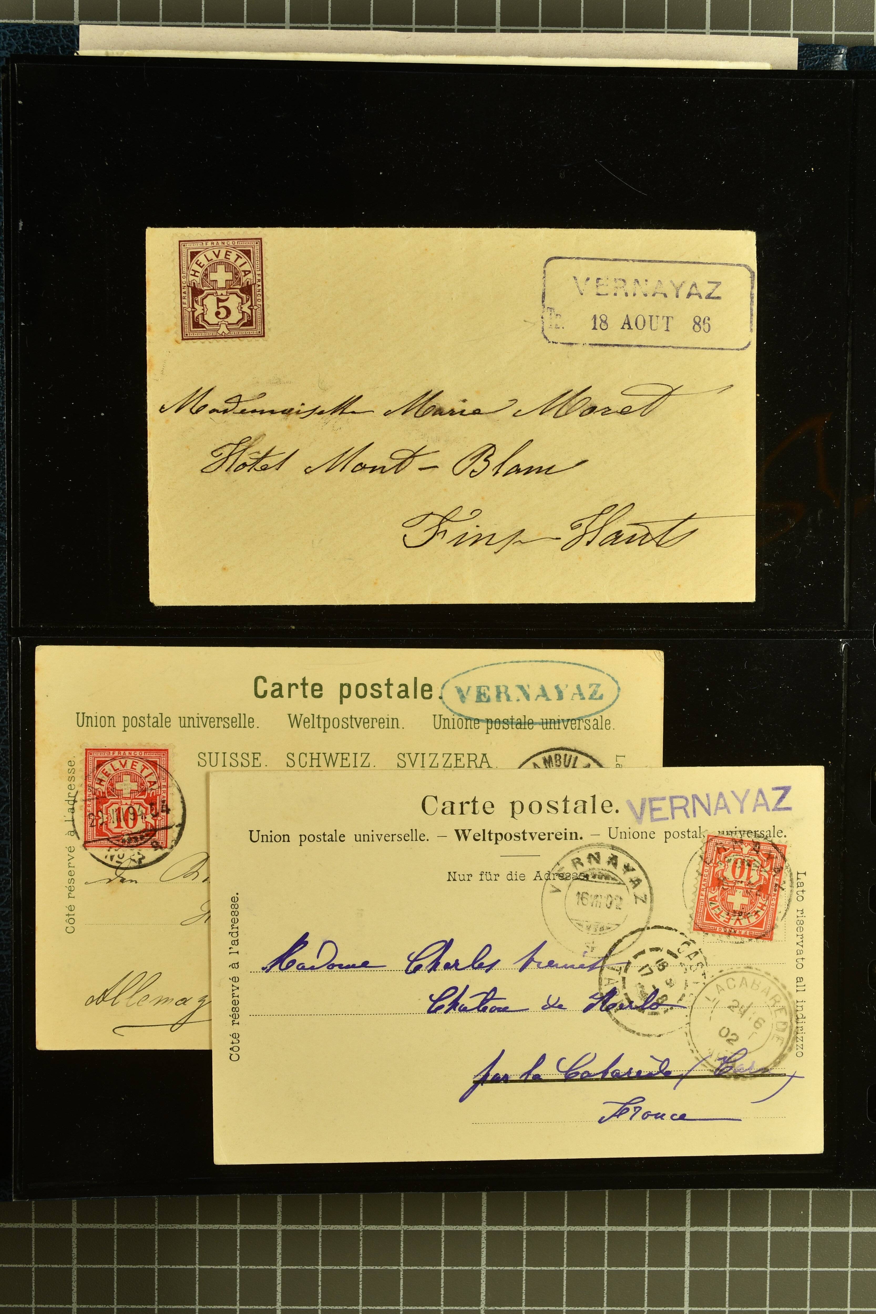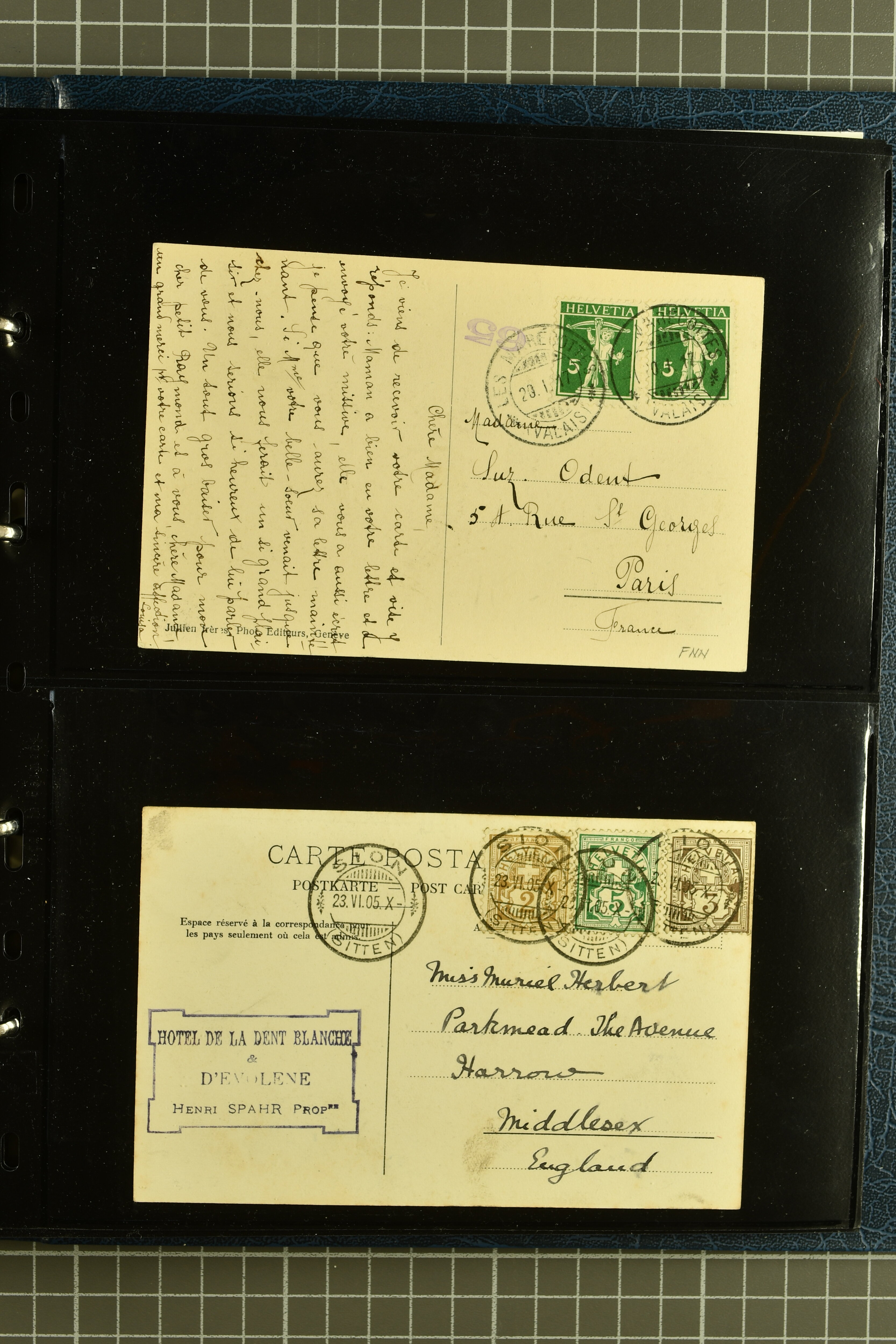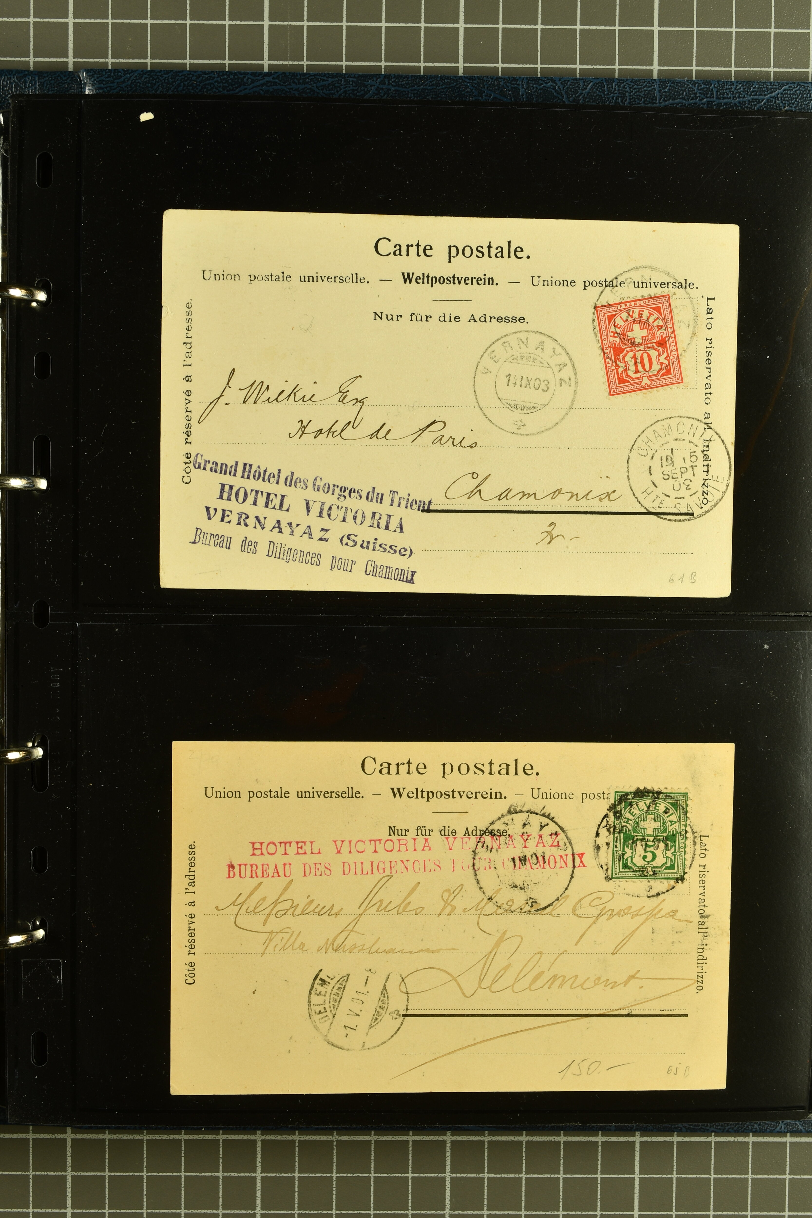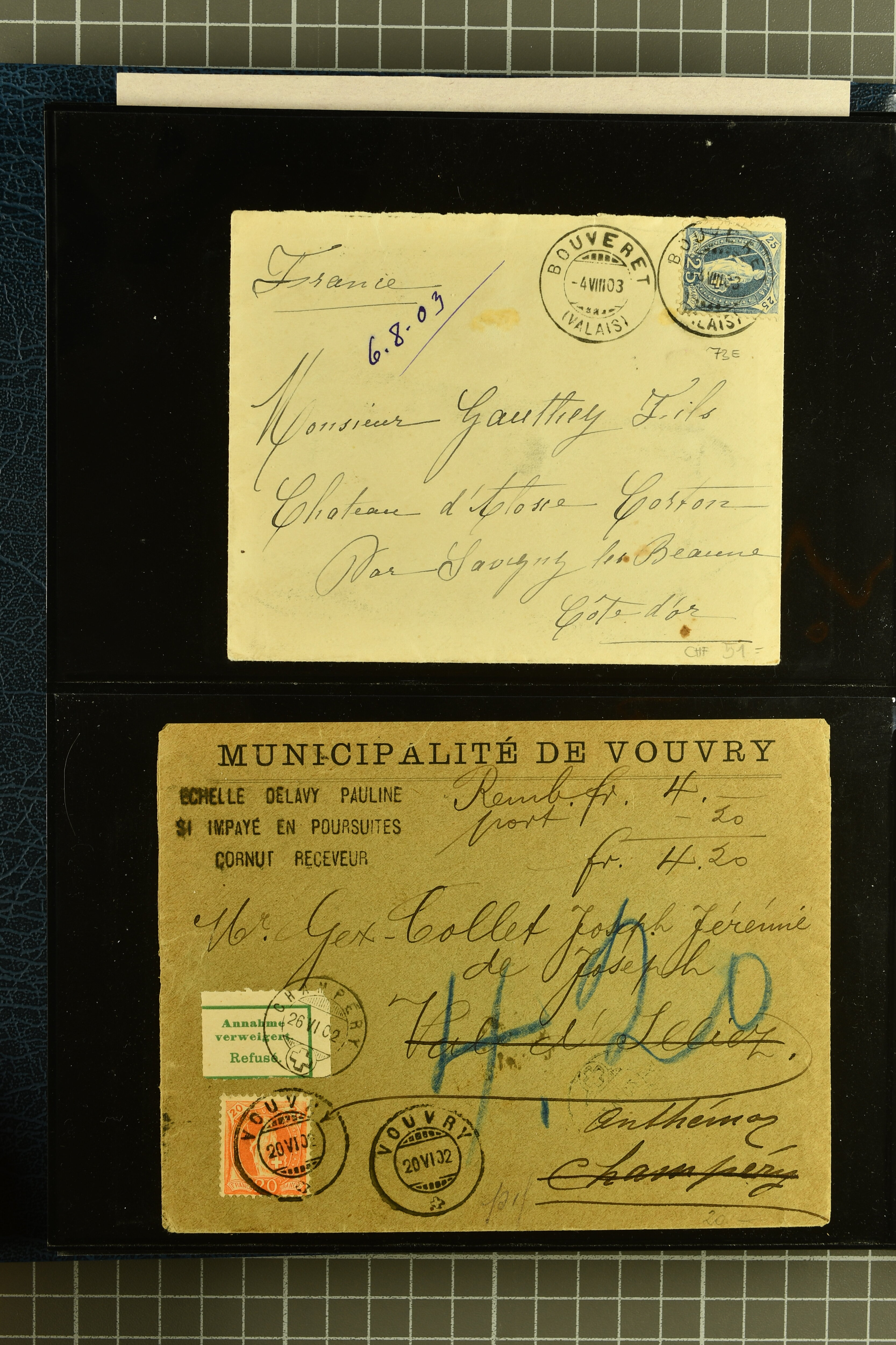 9882 cover imagePostgeschichte Kanton Wallis 1850/1970 (ca.): Bemerkenswerte Sammlung von über 200 Briefen und Karten. Beginnend mit Rayon I hellblau, Unbekannter Stein: Typen 7 + 13 l/o auf sauberem Faltbrief von Martigny nach Ardon sowie Buntfrankatur Rayon II, Stein B: Type 23 r/u und Rayon I hellblau, Stein B3: Type 40 l/u auf Faltbrief von St. Maurice nach Lausanne folgen drei Strubelfrankaturen inkl. einem Auslandsbrief von St. Bernard nach Besançon, Frankreich und eine starke Partie Sitzende Helvetia mit seltenen Entwertungen wie gefasstem Stabstp. "ST. MAURICE" (AW 3435) auf 10 Rp. rot im senkr. Paar als Zusatzfrankatur auf eingeschriebenem Tüblibrief 10 Rp. rot (Vorders.) nach Sion, Druckschrift-Stabstp. "SALVAN" (AW 2931) oder "GRANGES PRÈS SION" (AW 3089) jeweils als Entwertungsstp., kl. Zweikreisstp. "BOURG DE CONTHEY 25 FEV. 80" ideal klar auf 15 Rp. gelb als Einzelfrankatur auf Nachnahme-Couvert über Fr. 1.65 nach Sion aber auch Bahnpoststp., refüsierte Sendungen, Drucksachen, Nachnahmen, Auslandsfrankaturen etc sowie Ganzsachen wie Tüblibrief 10 Rp. rot entw. mit seltenerweise über dem Wertstempel aufges. Stabstp. "GONDO" oder Inlands-Doppelpostkarte 5 Rp. braun, Antwortteil (SGSSV: PK.005.A) mit seltenem zweizeiligem Stabstp. "LOUËSCHE / BAINS" (AW 2239) nach Bern (1877). Später Ziffermuster und Stehende Helvetia mit einigen hohen Nachnahmefrankaturen, Auslandsbriefen inkl. 50 Rp. blau in der "groben" Zähnung 9¾:9¼ (SBK 70B) auf eingeschr. Brief von Champéry nach Prag oder 25 Rp. grün in derselben Zähnung auf Brief von Zermatt nach Berlin, seltene Stabstp. wie zweizeilige "COURRIER FRANCAIS / CHAMONIX-CHTELARD", "BETTEN / (WALLIS)" oder "GRENGIOLS / (WALLIS)", seltener Stationsstempel "VERNAYAZ 18 AOUT 86" in violett oder zahlreiche Hotelstempel. Auch die späteren Ausgaben sind mit seltenen "Fleuron-" oder Stabstempel kleiner Ortschaften, attraktiven illustrierten Briefen und Karten, Telegrammen interessanten Frankaturen wie Tellbrustbild 10 Rp. rot, Type I (SBK 126/I) auf Nachnahmekarte von La Croix (Martigny) nach Saxon, schönen Pro Juventute-Frankaturen, Dienstleistungen wie Eilsendung von Riddes nach Paris, Postformularen wie "Rück- oder Auszahlungsschein" von Brig nach Varen mit entspr. Stabstp. oder kompl. Anrechnungskarte mit Helvetia mit Schwert 50 Rp. grün von Versegères gut vertreten. Eine vielseitige Sammlung in meist guter Erhaltung; zwei Befunde, drei Atteste (Image 1) (Image 2) (Image 3) (Image 4) (Image 5) (Image 6) (Image 7) (Image 8) (Image 9) (Image 10) (Image 11) (Image 12) (Image 13) (Image 14) (Image 15) (Image 16) (Image 17) (Image 18) (Image 19) (Image 20) (Image 21) (Image 22) (Image 23) (Image 24) (Image 25) (Image 26) (Image 27) (Image 28) (Image 29) (Image 30) (Image 31) (Image 32) (Image 33) (Image 34) (Image 35) (Image 36) (Image 37) (Image 38) (Image 39) (Image 40) (Image 41) (Image 42) (Image 43) (Image 44) (Image 45) (Image 46) (Image 47) (Image 48) (Image 49) (Image 50)