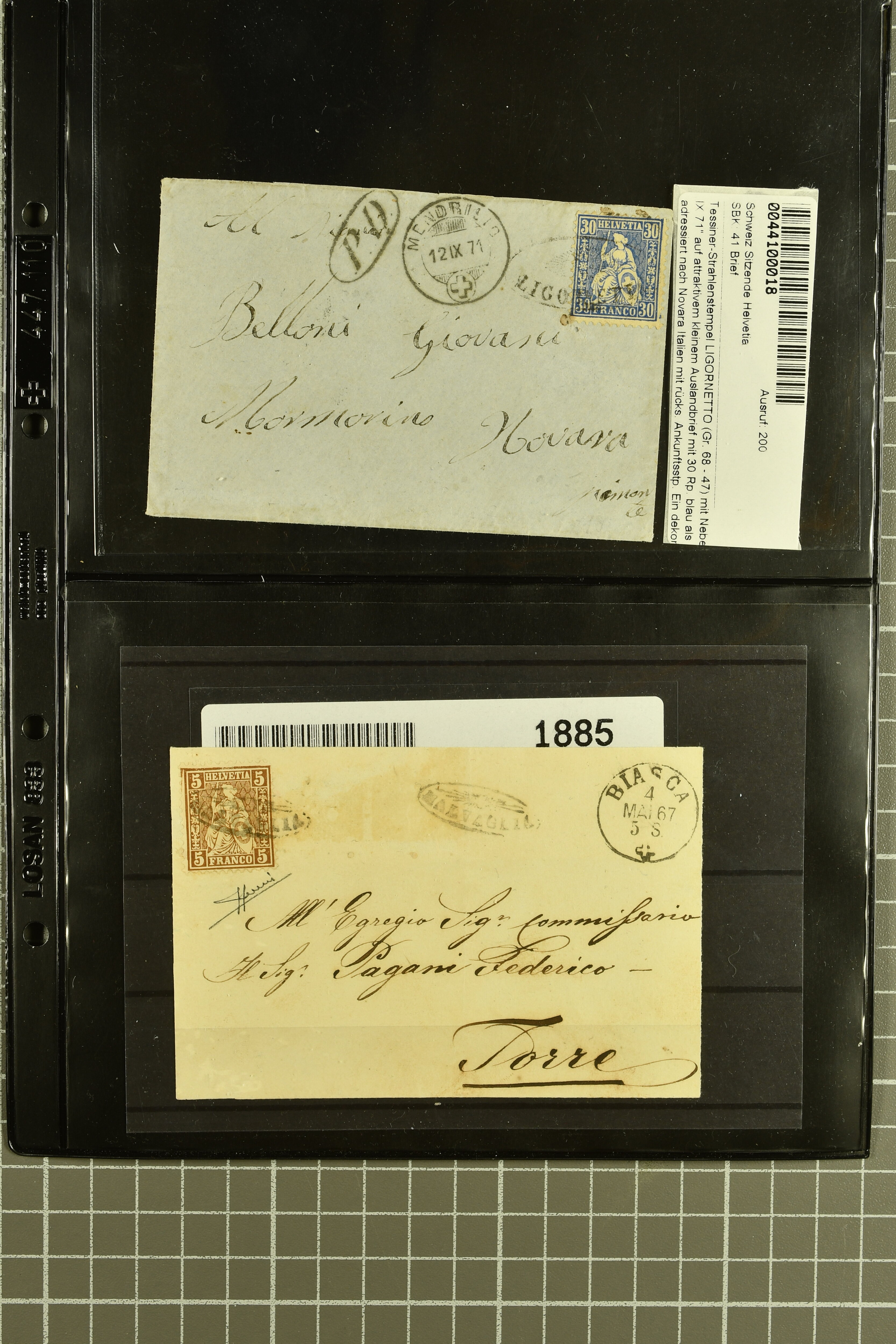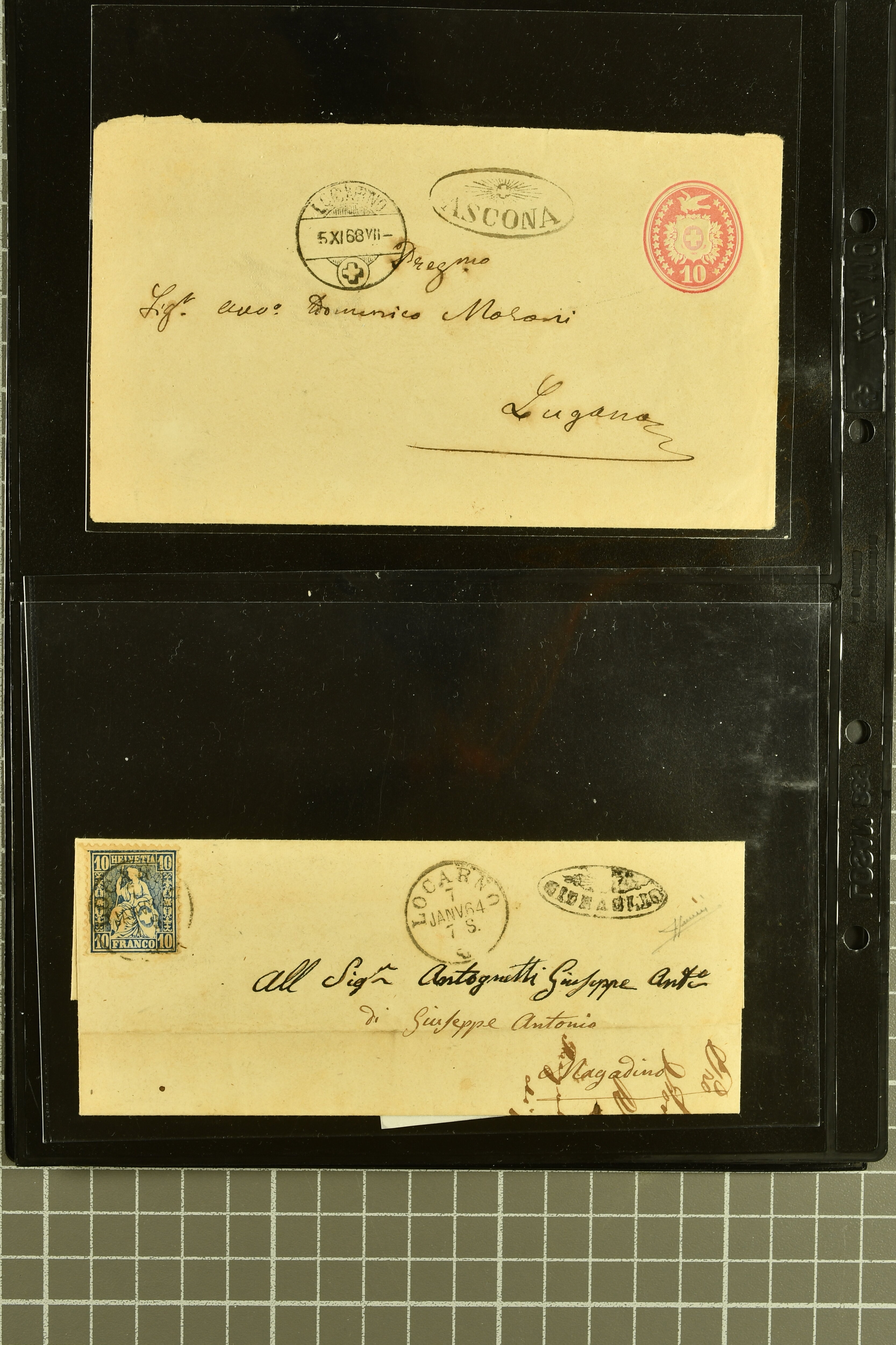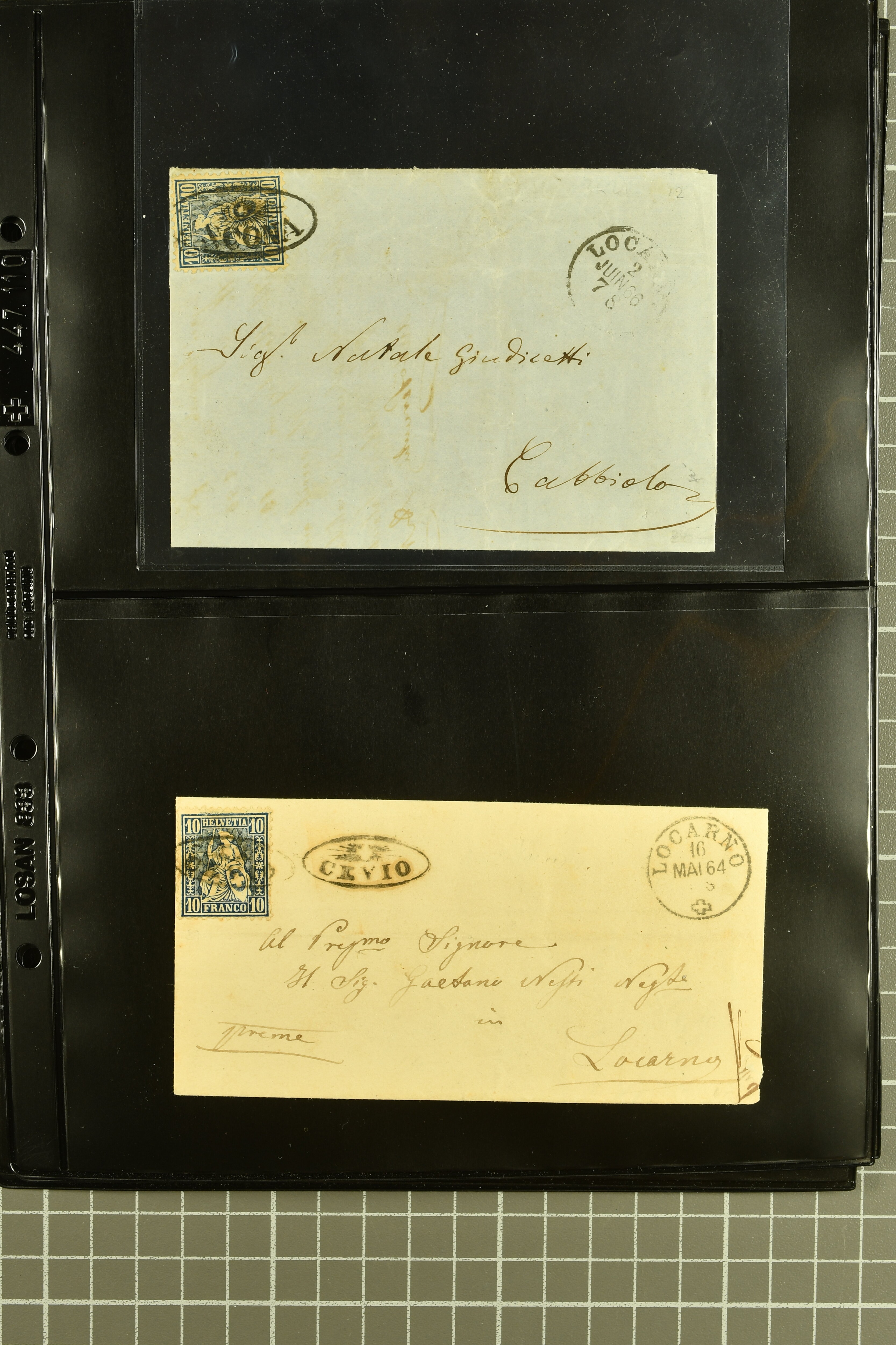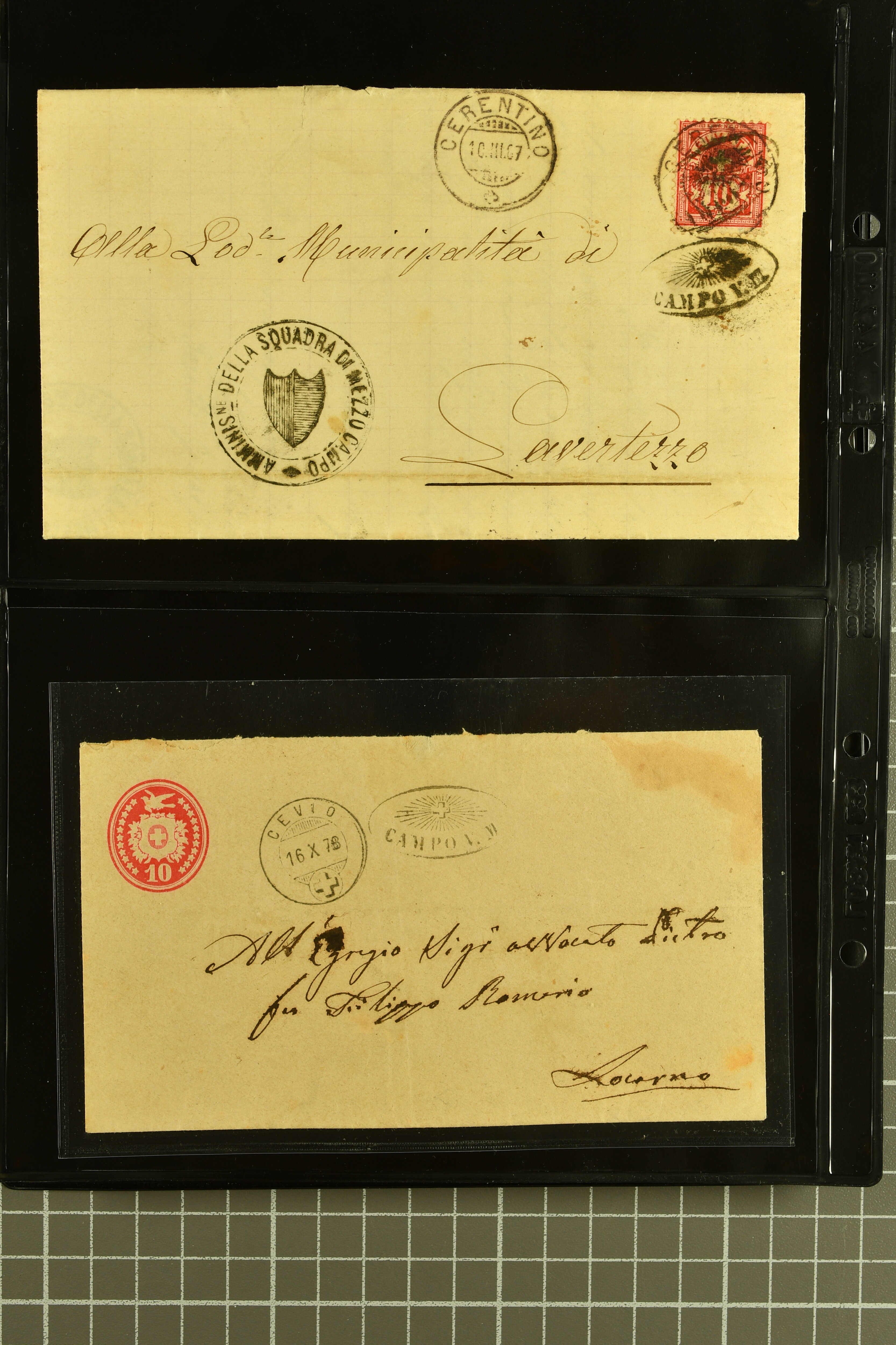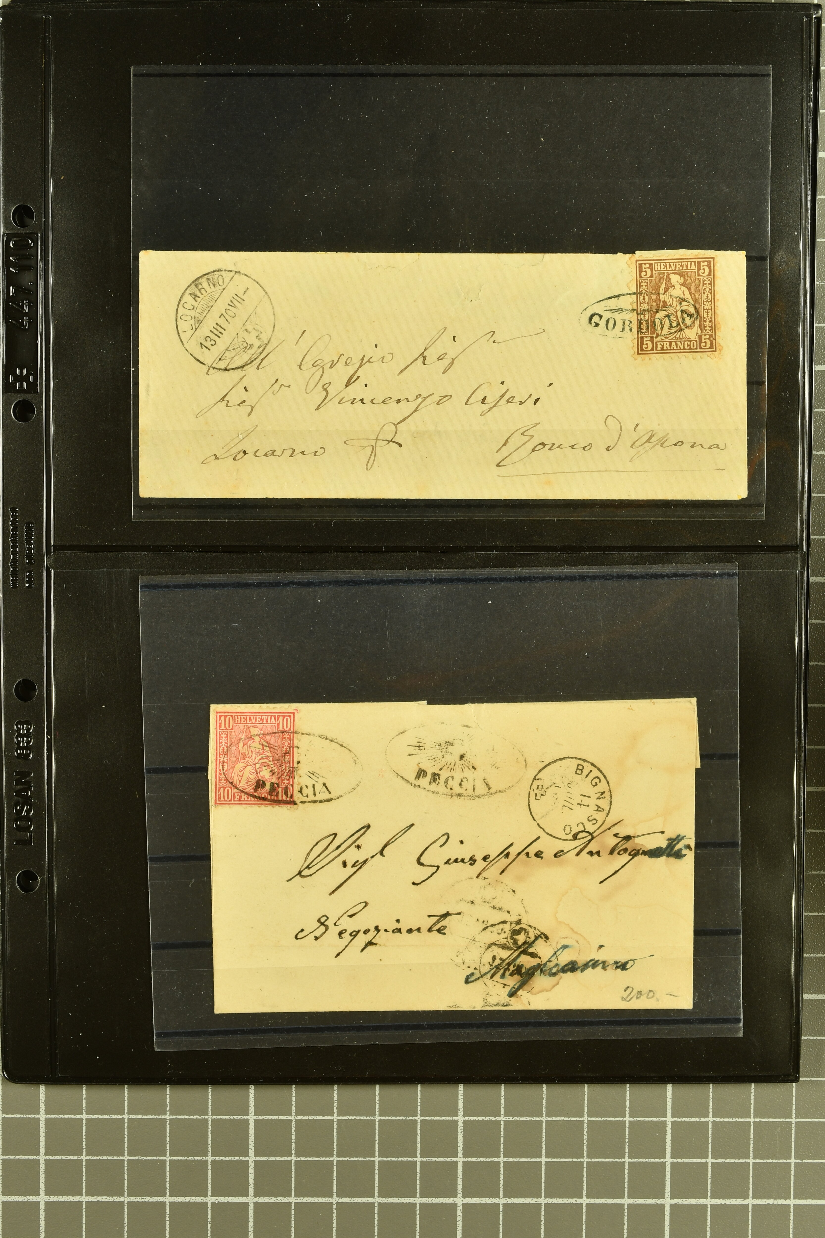 9878 cover imageStrahlenstempel Tessin, 1864/87: Auswahl 13 Briefe meist mit Sitzender, einer mit Ziffer sowie zwei Tübli-Briefe, bis auf zwei Briefe und die beiden Ganzsachen die Freimarken immer mit den Strahlenstempeln entwertet, eine ansprechende Auswahl mit generell klaren Abschlägen von ANCONA, CEVIO, CAMPO VM (2), MAGLIASO, SOMEO, MAGGIA, LOTTIGNA, GORDOLA, PECCIA, ASCONA, GIUMAGLIO, LIGORNETTO, MALVAGLIA und CAVIGLIANO (Image 1) (Image 2) (Image 3) (Image 4) (Image 5) (Image 6) (Image 7) (Image 8)