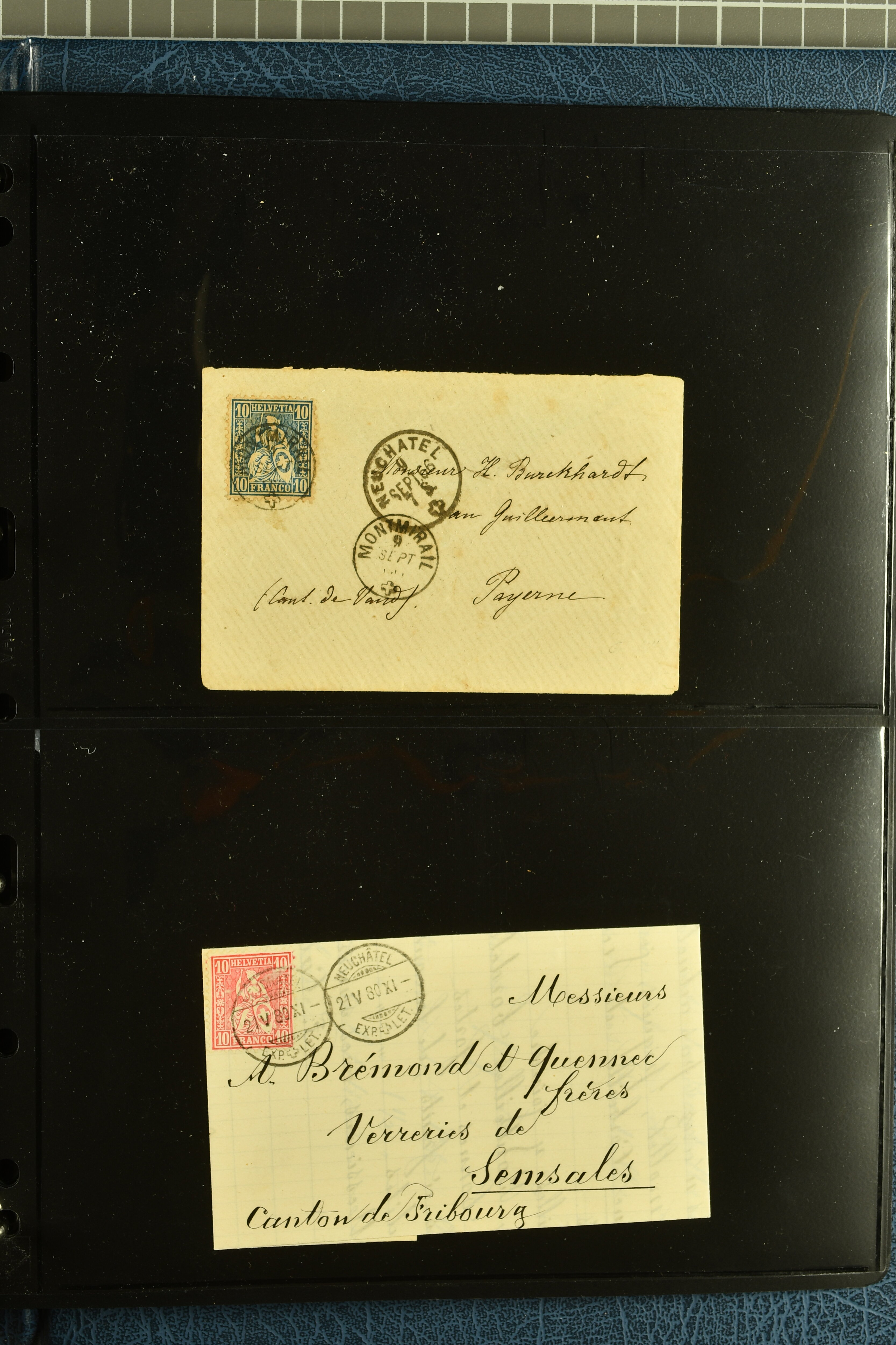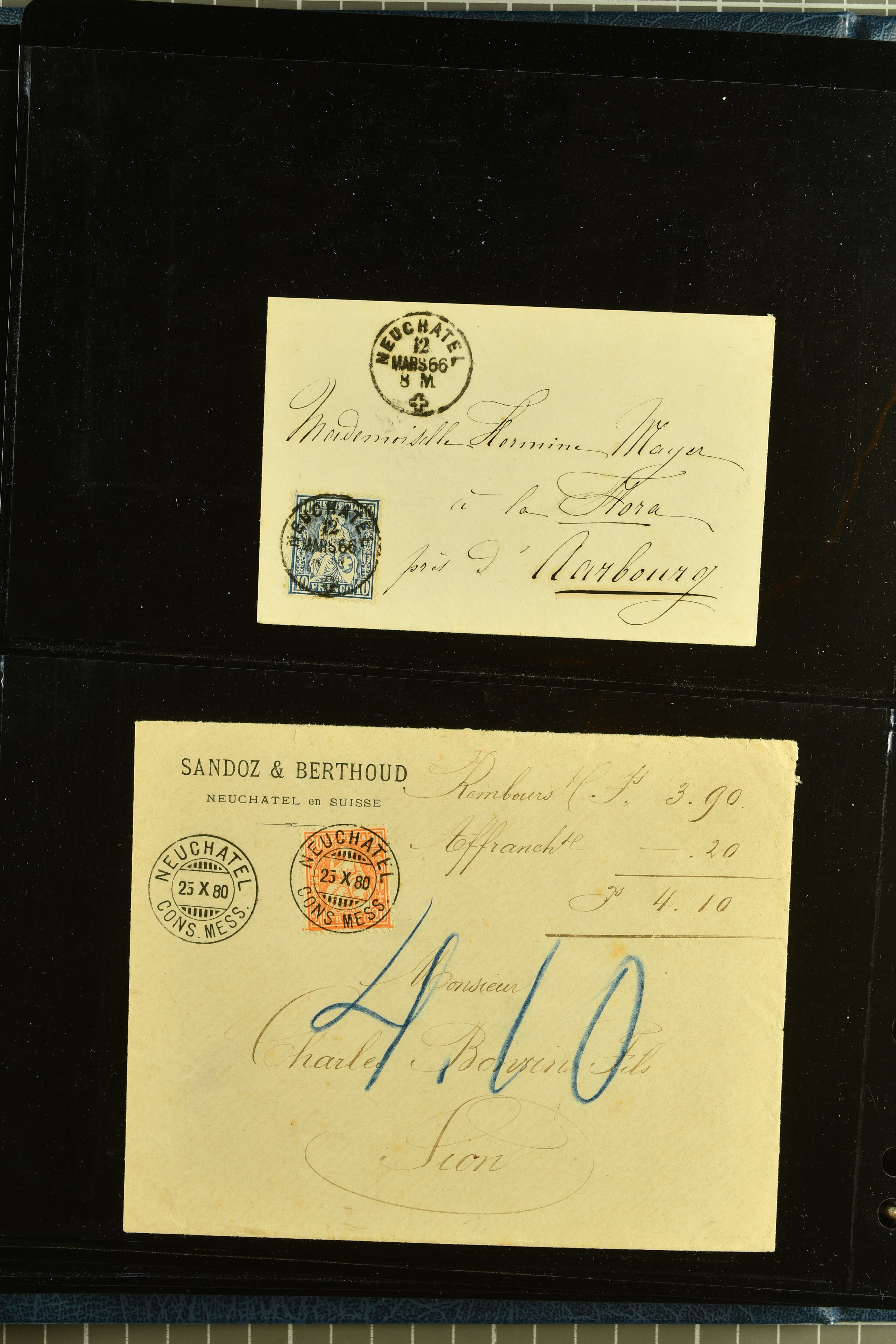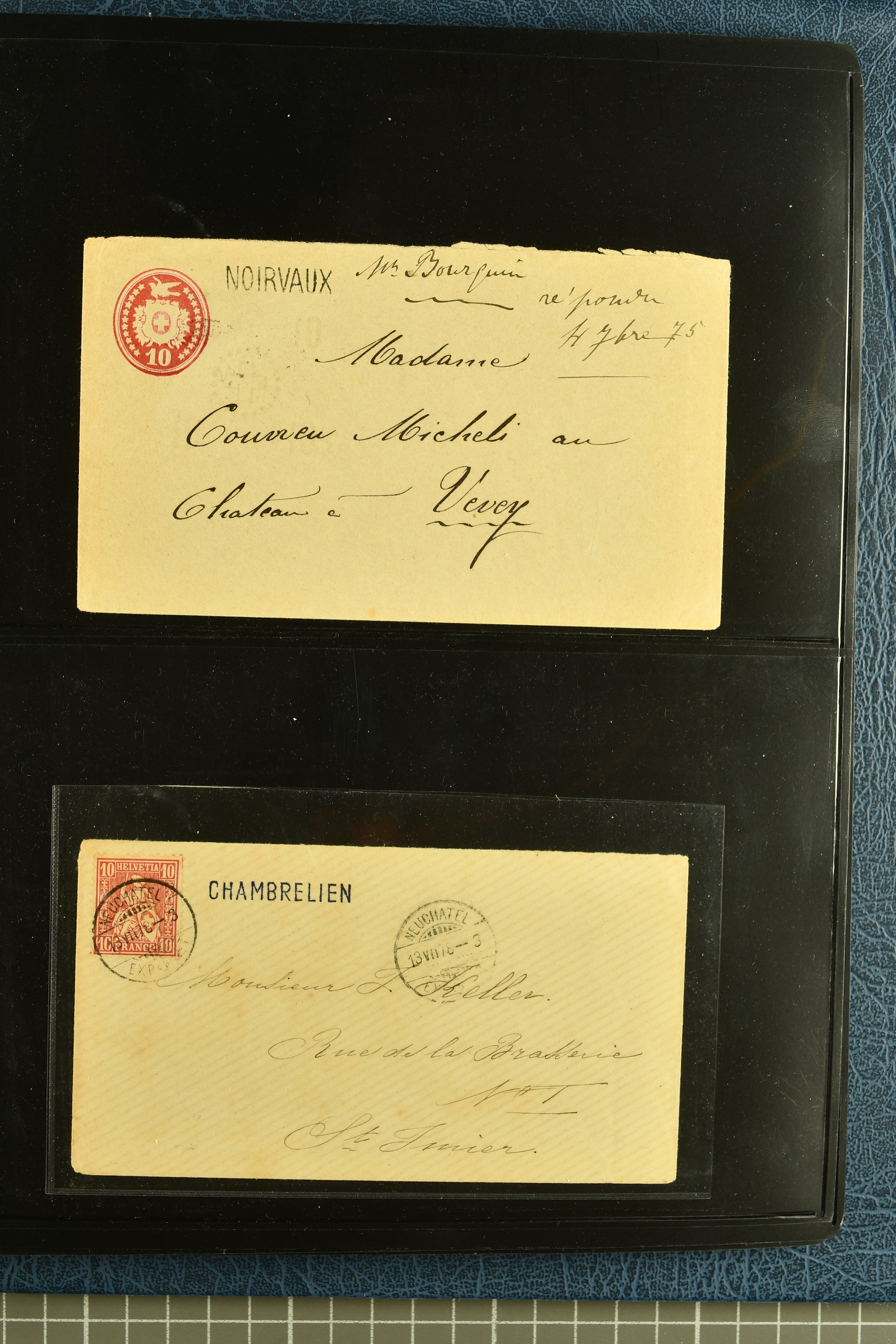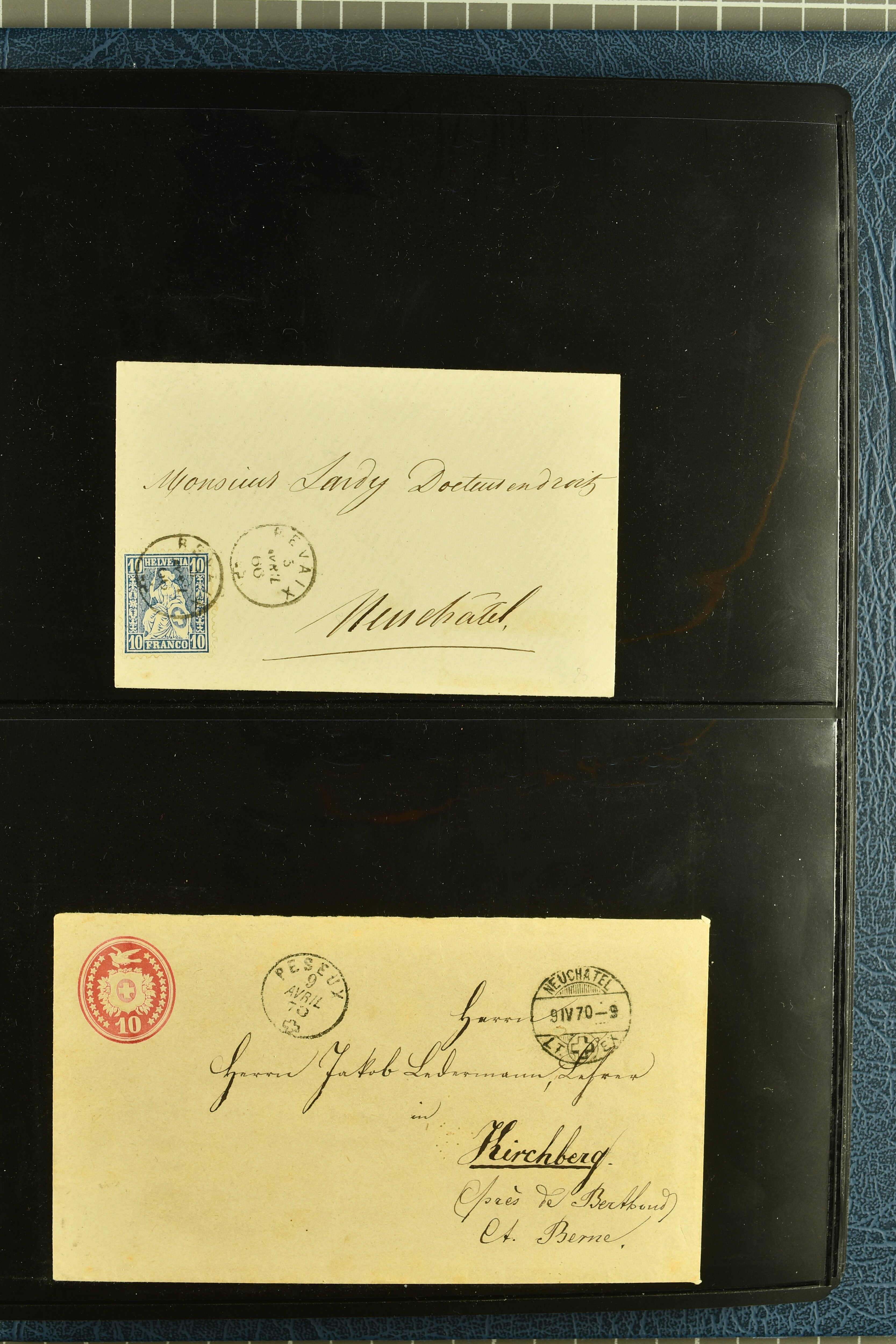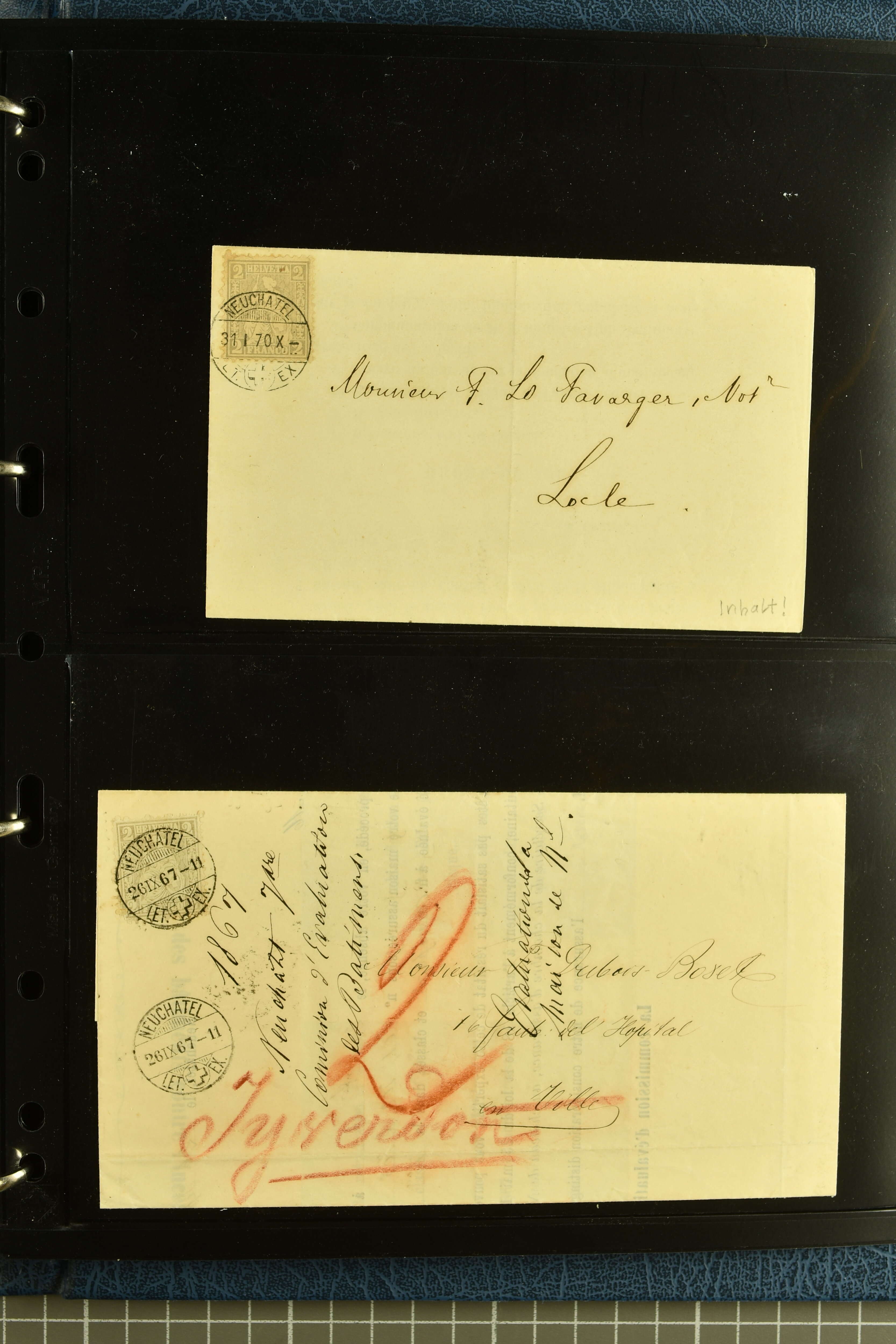 9880 cover imagePostgeschichte Kanton Neuenburg 1854/1940 (ca.): Sammlung 180 Briefe und Karten ab acht Strubelbriefen mit einigen interessanten Entwertungen wie gr. Zierkreisstempel "BOUDRY 28 JANV. 1861", div. Fingerhutstempel oder einem Faltbrief nach Frankreich. Später Sitzende Helvetia und Ganzsachen mit zahlreichen Fingerhutstempeln worunter "MONTMIRAIL 23. NOV. 74" in blau auf Tüblibrief 25 Rp. grün nach Goldberg, Schlesien (Polen) und viele weniger geläufige Stempel, Spätverwendungen der grossen Zierkreisstempel von Serrières, Saint-Sulpice und Auvernier, Stabstp. wie "St. Olivier" auf kleinformatigem Drucksachen-Umschlag mit 2 Rp. grau nach La Chaux-de-Fonds, "CHAMBRELIEN" in blau auf sauberem Briefumschlag mit 10 Rp. rot nach Neuchâtel, verschiedene Güller-Datumstp. in blau aber auch diverse Auslandsfrankaturen der Sitzenden Helvetia oder eine frühe Einladungskarte der "Société la Récréation" in La Chaux-de-Fonds frankiert mit 2 Rp. oliv (1878). Ausserdem Ziffermuster und Stehende Helvetia mit interessanten Auslands-Buntfrankaturen, dekorativen illustrierten Briefen und Karten oder div. Ambulant- und anderen Stabstempeln, UPU 1900 mit 10 Rp.-Ganzsachenpostkarte von La Chaux-de-Fonds nach St. Petersburg, Russland sowie die Ausgaben nach 1907 weiterhin mit interessanten Versandformen wie Expresspostkarten, Stempel wie Stabstp. "CLÉMESIN / NEUCHTEL" auf Postkarte von 1908, Destinationen wie zwei 10 Rp.-Ganzsachenpostkarten nach Chile und Uruguay (1909/14), Vignetten und besseren Frankaturen wie zwei Karten mit Pro Juventute-Vorläufer französisch (SBK JII). Eine interessante Sammlung in meist guter Erhaltung; vier Atteste (Image 1) (Image 2) (Image 3) (Image 4) (Image 5) (Image 6) (Image 7) (Image 8) (Image 9) (Image 10) (Image 11) (Image 12) (Image 13) (Image 14) (Image 15) (Image 16) (Image 17) (Image 18) (Image 19) (Image 20) (Image 21) (Image 22) (Image 23) (Image 24) (Image 25) (Image 26) (Image 27) (Image 28) (Image 29) (Image 30) (Image 31) (Image 32) (Image 33) (Image 34) (Image 35) (Image 36) (Image 37) (Image 38) (Image 39) (Image 40) (Image 41) (Image 42) (Image 43) (Image 44) (Image 45) (Image 46) (Image 47) (Image 48) (Image 49) (Image 50)