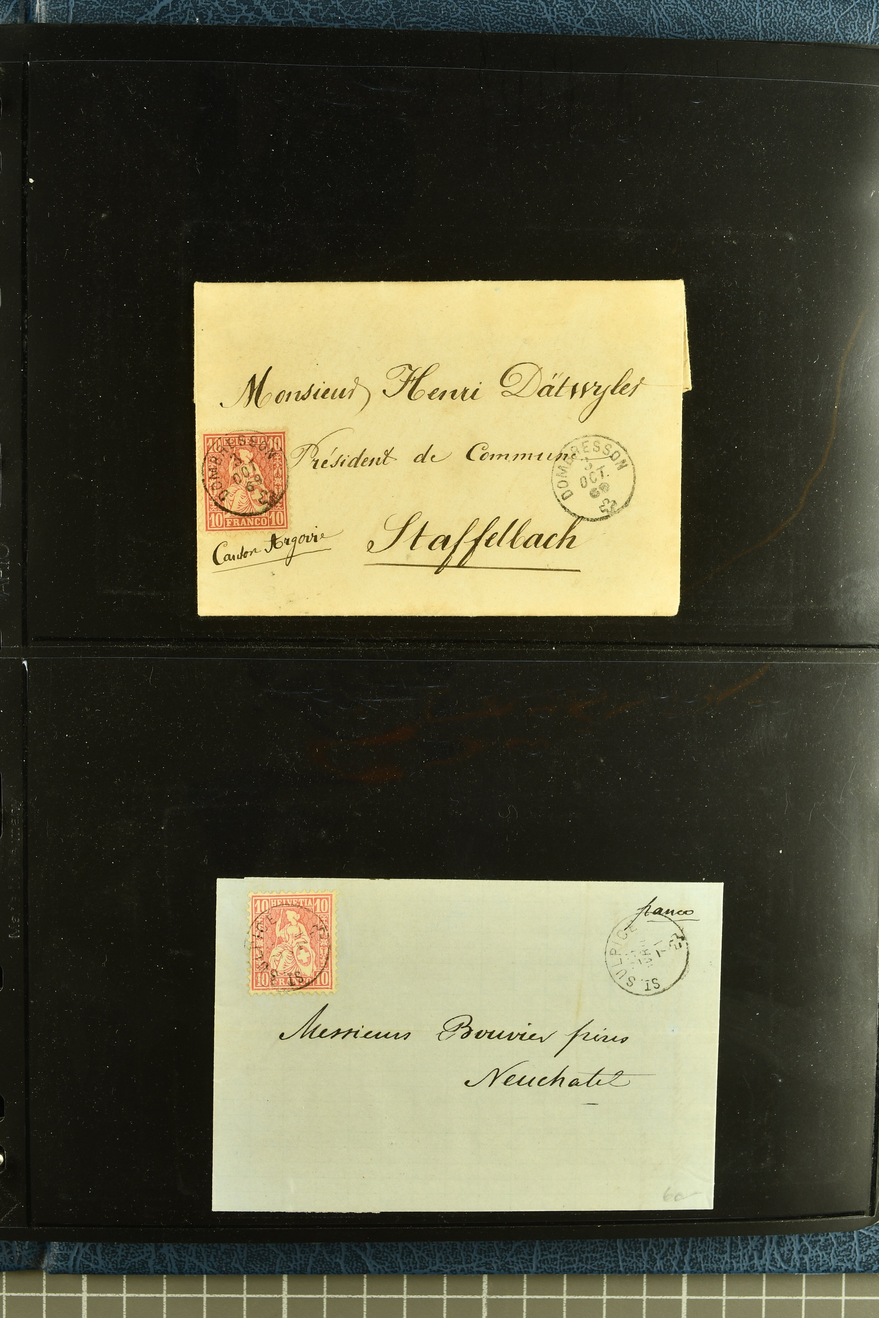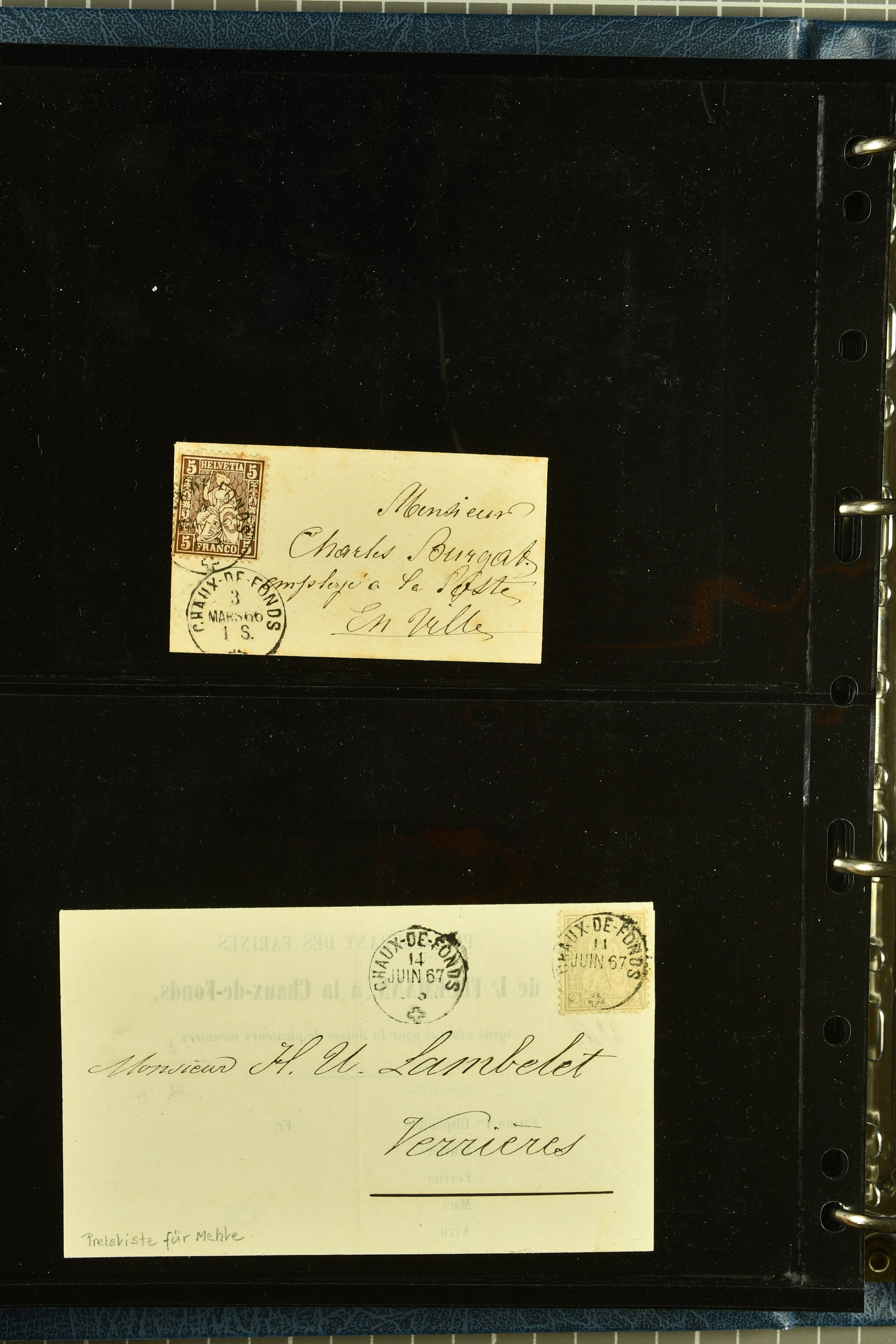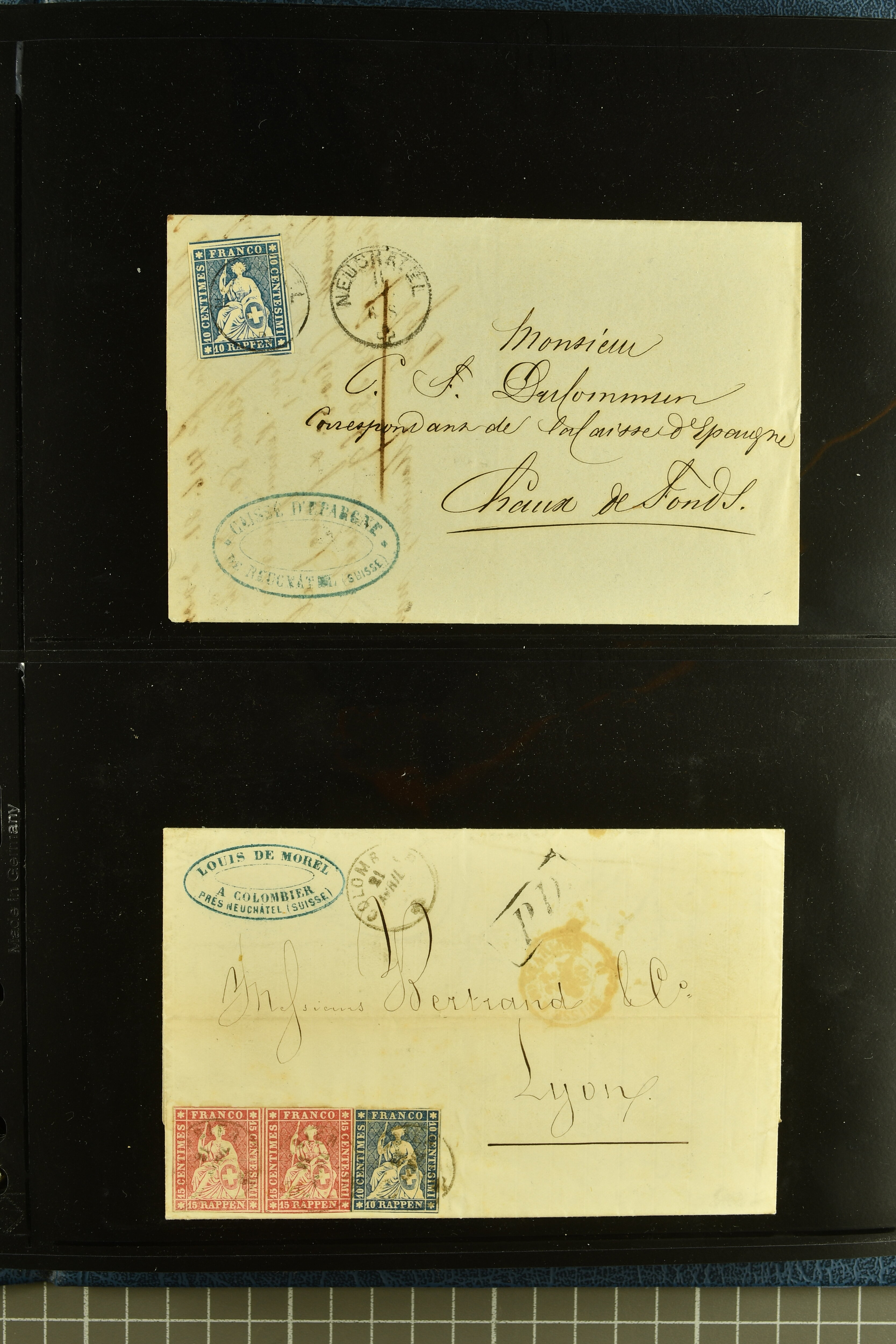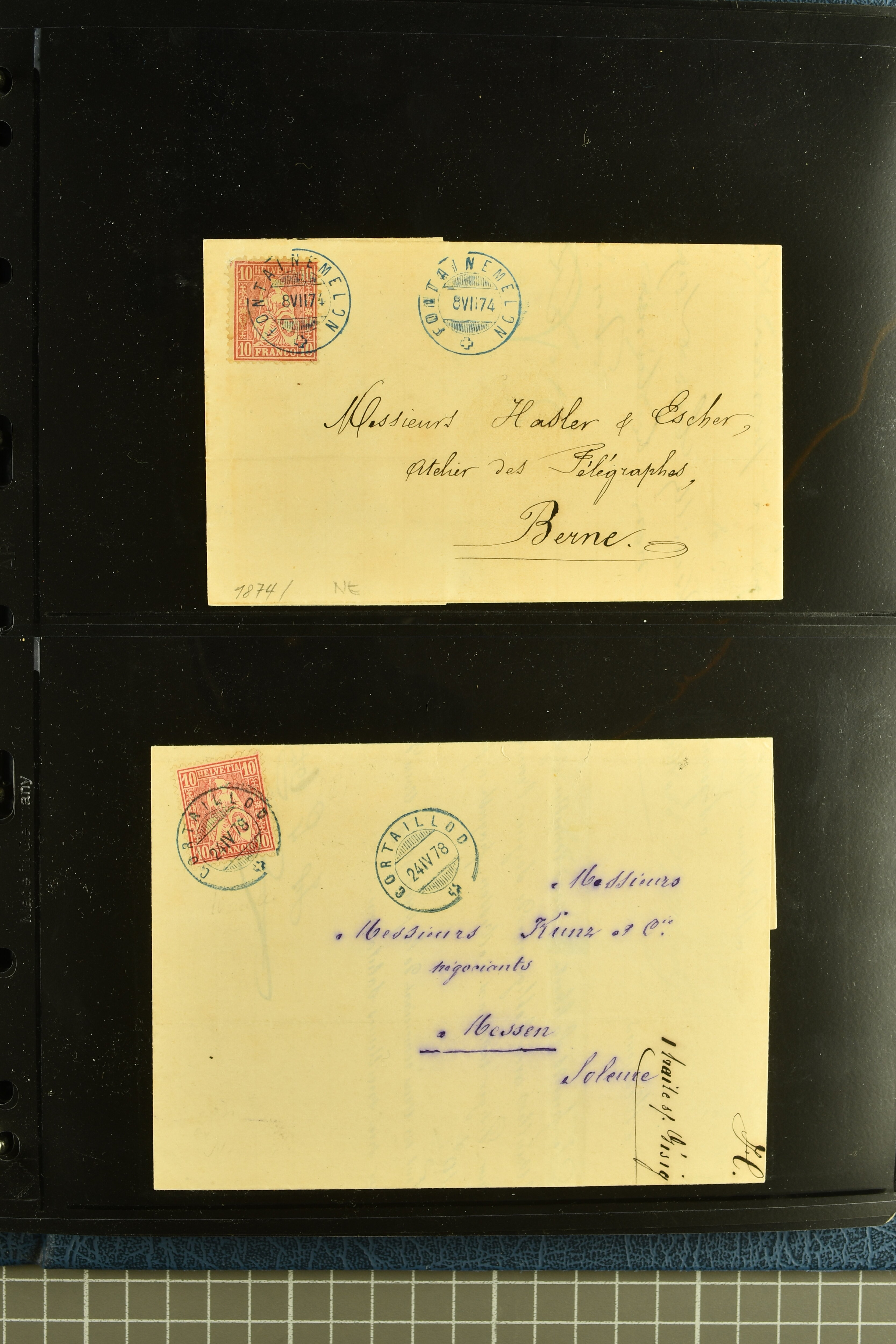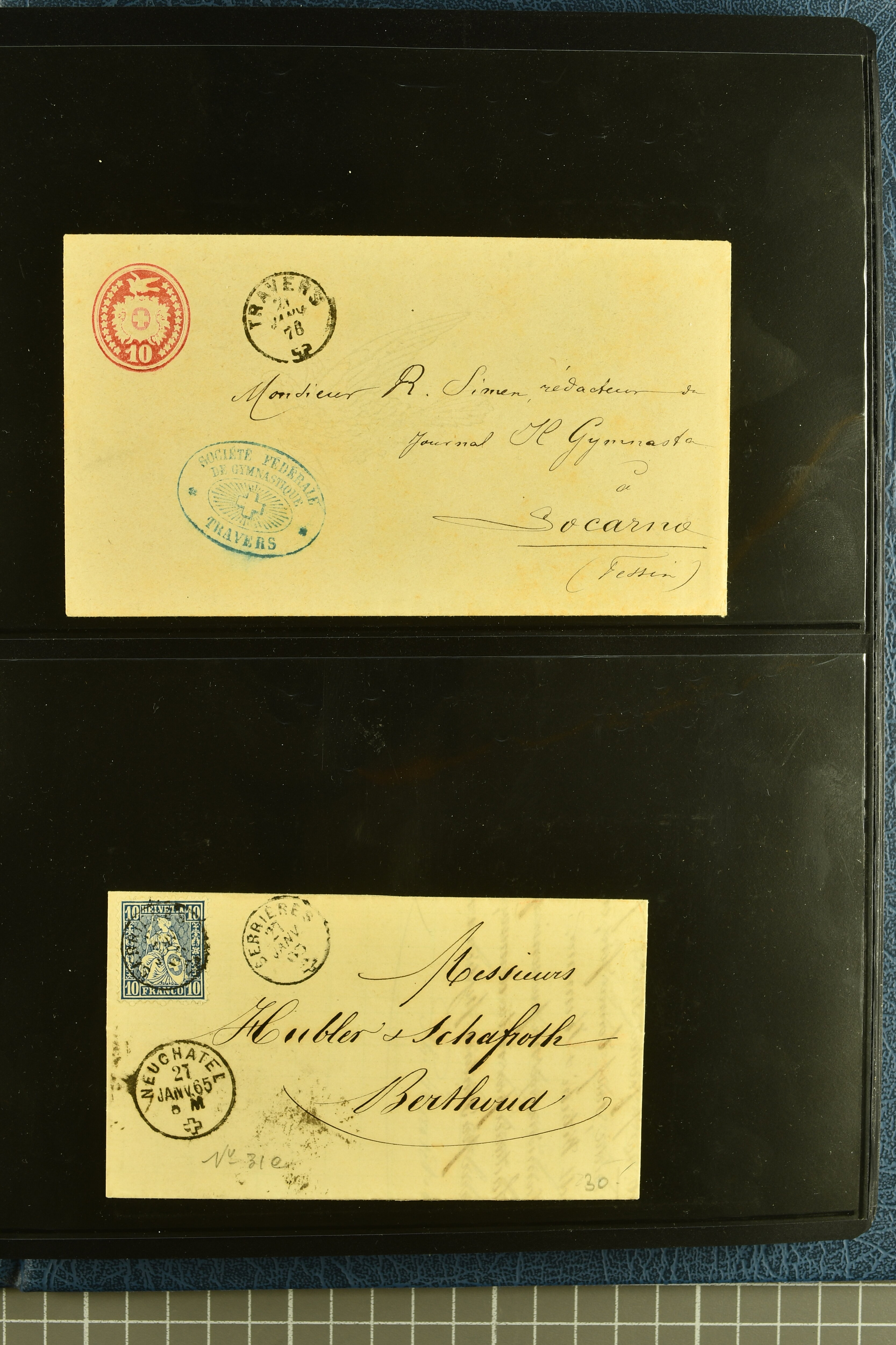 9880 cover imagePostgeschichte Kanton Neuenburg 1854/1940 (ca.): Sammlung 180 Briefe und Karten ab acht Strubelbriefen mit einigen interessanten Entwertungen wie gr. Zierkreisstempel "BOUDRY 28 JANV. 1861", div. Fingerhutstempel oder einem Faltbrief nach Frankreich. Später Sitzende Helvetia und Ganzsachen mit zahlreichen Fingerhutstempeln worunter "MONTMIRAIL 23. NOV. 74" in blau auf Tüblibrief 25 Rp. grün nach Goldberg, Schlesien (Polen) und viele weniger geläufige Stempel, Spätverwendungen der grossen Zierkreisstempel von Serrières, Saint-Sulpice und Auvernier, Stabstp. wie "St. Olivier" auf kleinformatigem Drucksachen-Umschlag mit 2 Rp. grau nach La Chaux-de-Fonds, "CHAMBRELIEN" in blau auf sauberem Briefumschlag mit 10 Rp. rot nach Neuchâtel, verschiedene Güller-Datumstp. in blau aber auch diverse Auslandsfrankaturen der Sitzenden Helvetia oder eine frühe Einladungskarte der "Société la Récréation" in La Chaux-de-Fonds frankiert mit 2 Rp. oliv (1878). Ausserdem Ziffermuster und Stehende Helvetia mit interessanten Auslands-Buntfrankaturen, dekorativen illustrierten Briefen und Karten oder div. Ambulant- und anderen Stabstempeln, UPU 1900 mit 10 Rp.-Ganzsachenpostkarte von La Chaux-de-Fonds nach St. Petersburg, Russland sowie die Ausgaben nach 1907 weiterhin mit interessanten Versandformen wie Expresspostkarten, Stempel wie Stabstp. "CLÉMESIN / NEUCHTEL" auf Postkarte von 1908, Destinationen wie zwei 10 Rp.-Ganzsachenpostkarten nach Chile und Uruguay (1909/14), Vignetten und besseren Frankaturen wie zwei Karten mit Pro Juventute-Vorläufer französisch (SBK JII). Eine interessante Sammlung in meist guter Erhaltung; vier Atteste (Image 1) (Image 2) (Image 3) (Image 4) (Image 5) (Image 6) (Image 7) (Image 8) (Image 9) (Image 10) (Image 11) (Image 12) (Image 13) (Image 14) (Image 15) (Image 16) (Image 17) (Image 18) (Image 19) (Image 20) (Image 21) (Image 22) (Image 23) (Image 24) (Image 25) (Image 26) (Image 27) (Image 28) (Image 29) (Image 30) (Image 31) (Image 32) (Image 33) (Image 34) (Image 35) (Image 36) (Image 37) (Image 38) (Image 39) (Image 40) (Image 41) (Image 42) (Image 43) (Image 44) (Image 45) (Image 46) (Image 47) (Image 48) (Image 49) (Image 50)