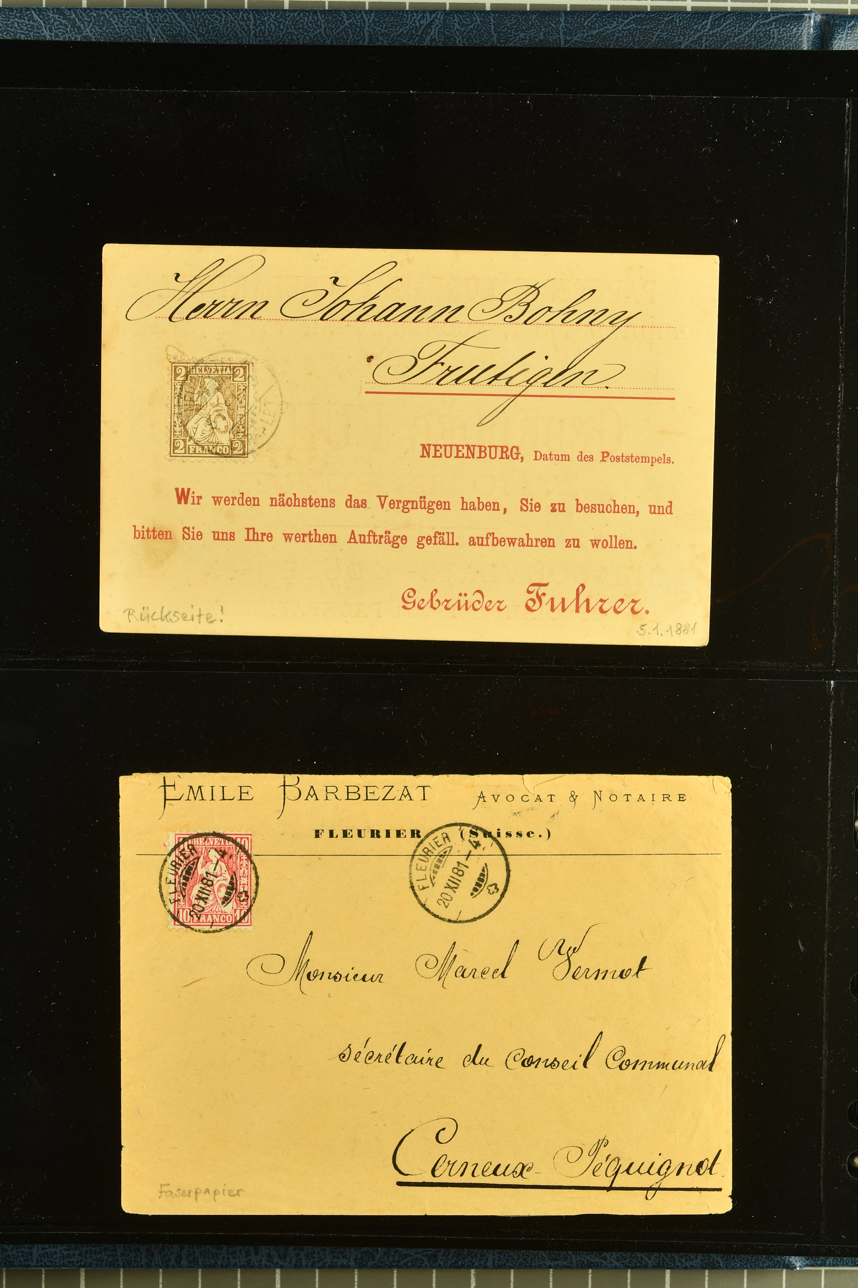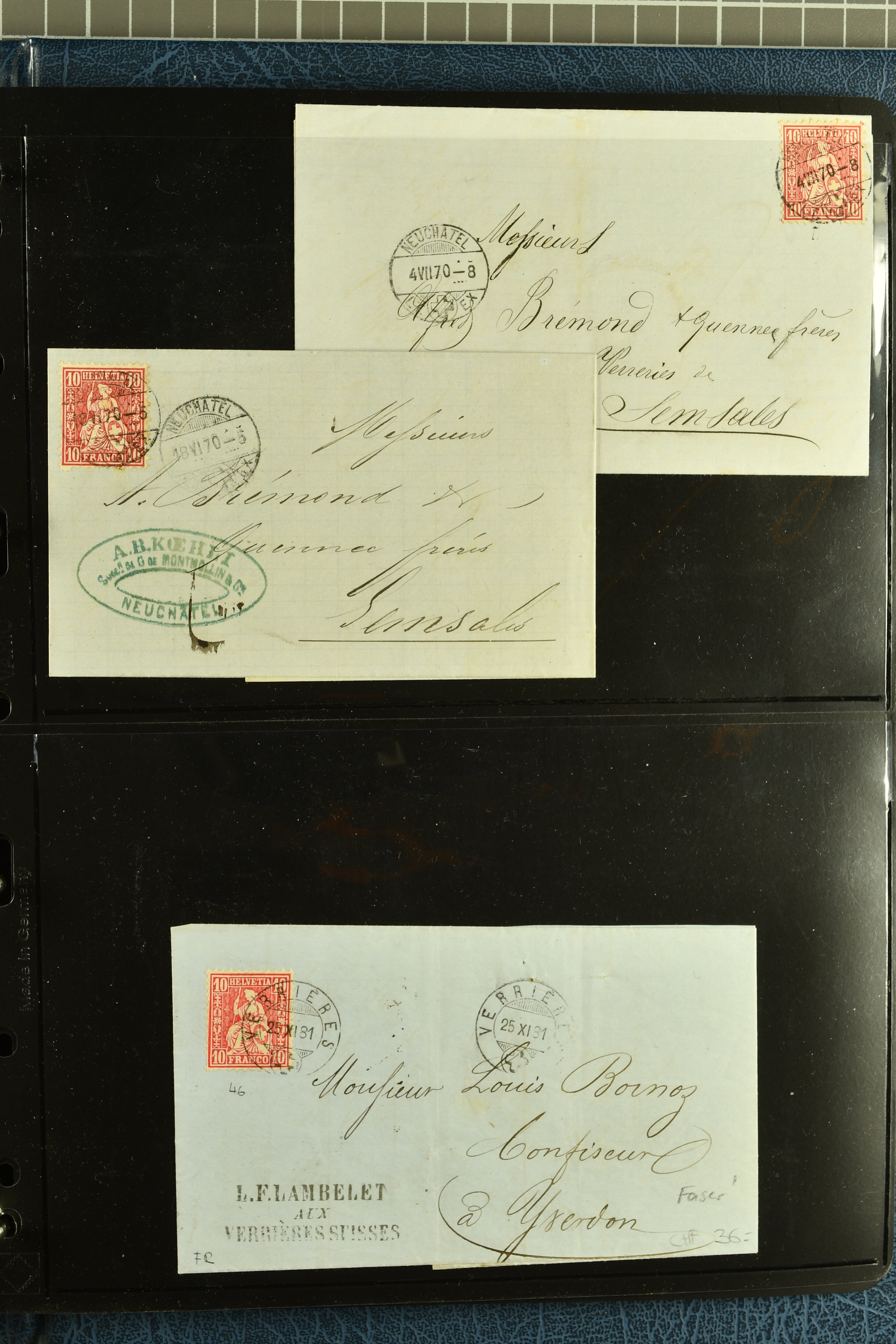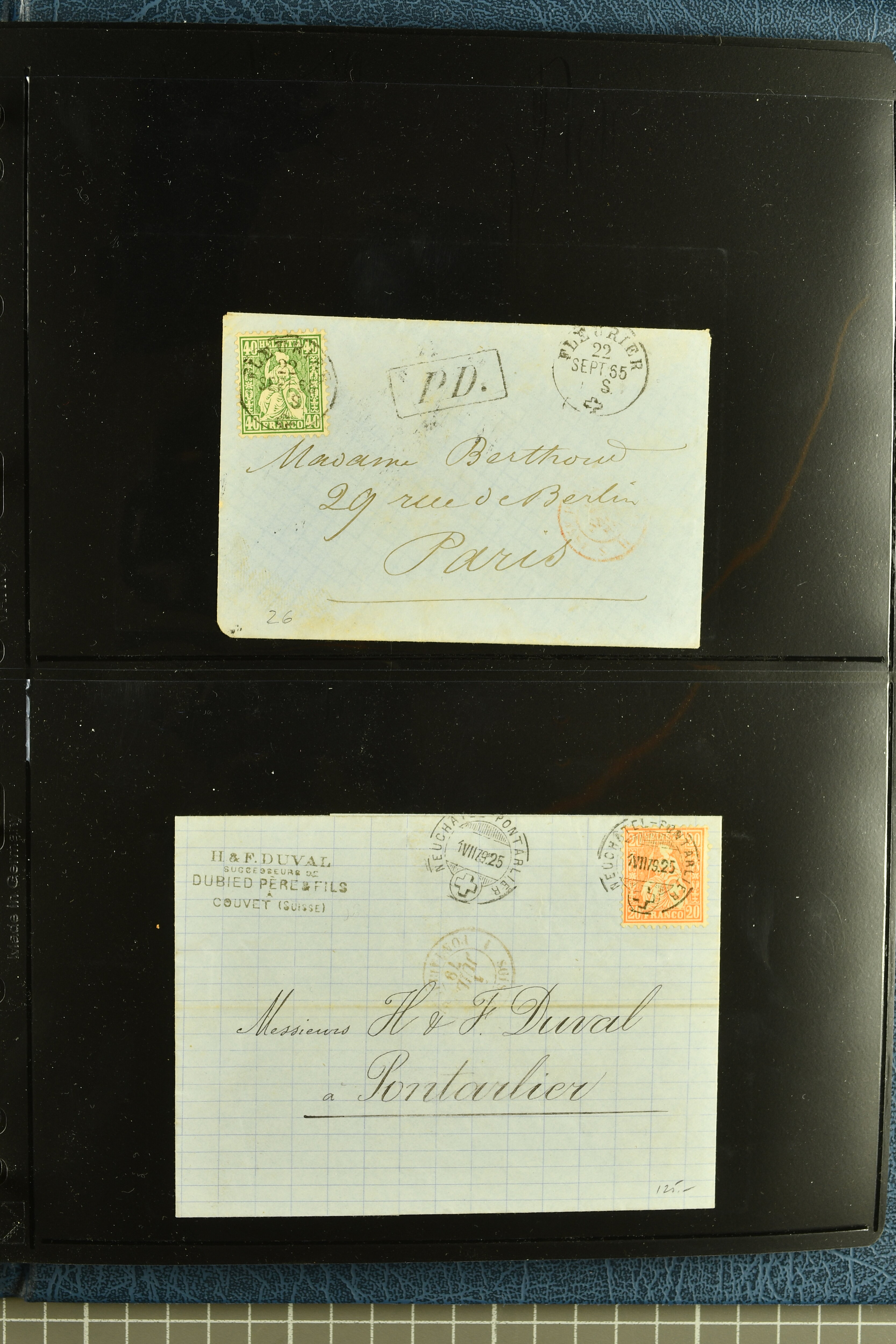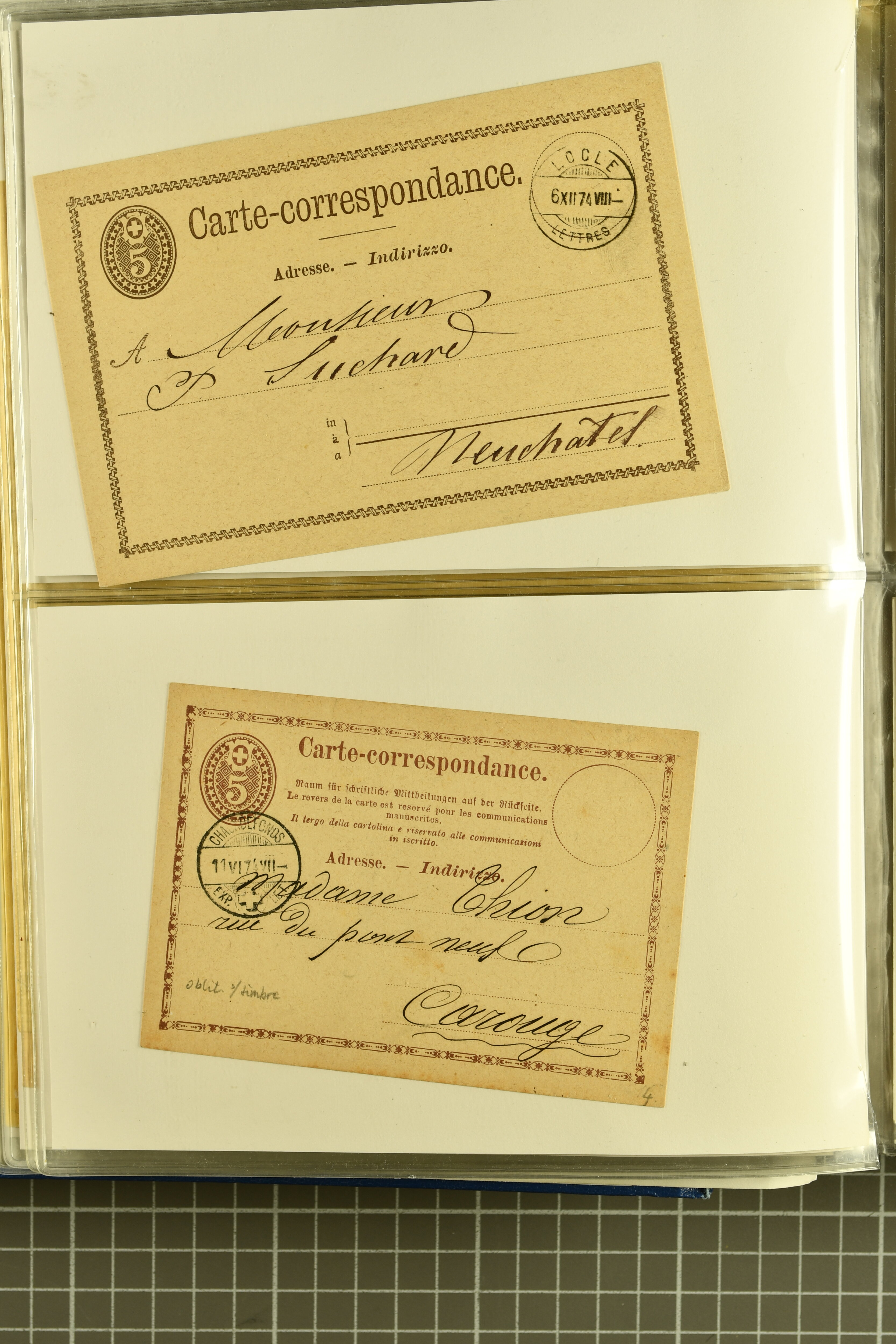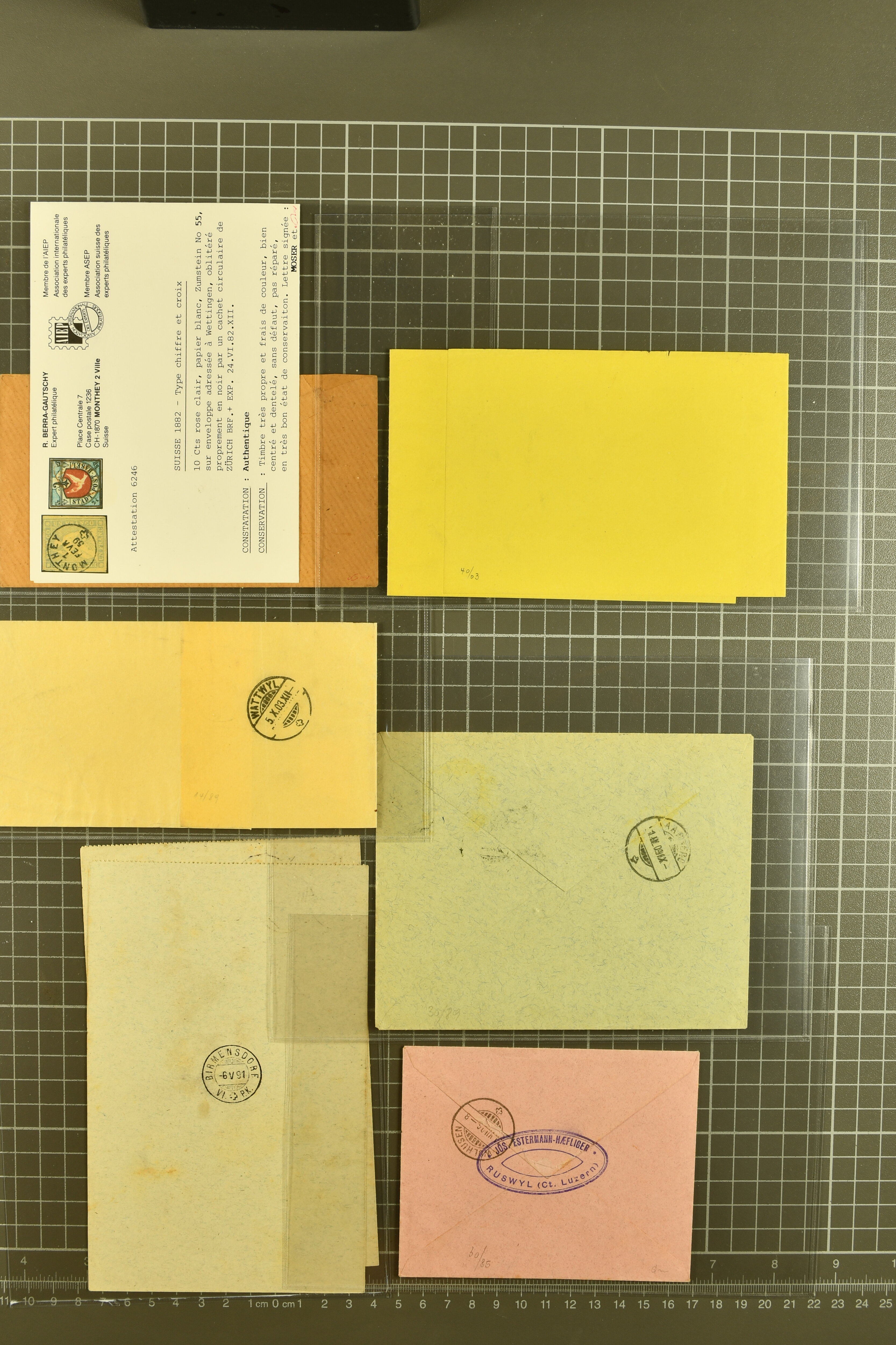 9880 cover imagePostgeschichte Kanton Neuenburg 1854/1940 (ca.): Sammlung 180 Briefe und Karten ab acht Strubelbriefen mit einigen interessanten Entwertungen wie gr. Zierkreisstempel "BOUDRY 28 JANV. 1861", div. Fingerhutstempel oder einem Faltbrief nach Frankreich. Später Sitzende Helvetia und Ganzsachen mit zahlreichen Fingerhutstempeln worunter "MONTMIRAIL 23. NOV. 74" in blau auf Tüblibrief 25 Rp. grün nach Goldberg, Schlesien (Polen) und viele weniger geläufige Stempel, Spätverwendungen der grossen Zierkreisstempel von Serrières, Saint-Sulpice und Auvernier, Stabstp. wie "St. Olivier" auf kleinformatigem Drucksachen-Umschlag mit 2 Rp. grau nach La Chaux-de-Fonds, "CHAMBRELIEN" in blau auf sauberem Briefumschlag mit 10 Rp. rot nach Neuchâtel, verschiedene Güller-Datumstp. in blau aber auch diverse Auslandsfrankaturen der Sitzenden Helvetia oder eine frühe Einladungskarte der "Société la Récréation" in La Chaux-de-Fonds frankiert mit 2 Rp. oliv (1878). Ausserdem Ziffermuster und Stehende Helvetia mit interessanten Auslands-Buntfrankaturen, dekorativen illustrierten Briefen und Karten oder div. Ambulant- und anderen Stabstempeln, UPU 1900 mit 10 Rp.-Ganzsachenpostkarte von La Chaux-de-Fonds nach St. Petersburg, Russland sowie die Ausgaben nach 1907 weiterhin mit interessanten Versandformen wie Expresspostkarten, Stempel wie Stabstp. "CLÉMESIN / NEUCHTEL" auf Postkarte von 1908, Destinationen wie zwei 10 Rp.-Ganzsachenpostkarten nach Chile und Uruguay (1909/14), Vignetten und besseren Frankaturen wie zwei Karten mit Pro Juventute-Vorläufer französisch (SBK JII). Eine interessante Sammlung in meist guter Erhaltung; vier Atteste (Image 1) (Image 2) (Image 3) (Image 4) (Image 5) (Image 6) (Image 7) (Image 8) (Image 9) (Image 10) (Image 11) (Image 12) (Image 13) (Image 14) (Image 15) (Image 16) (Image 17) (Image 18) (Image 19) (Image 20) (Image 21) (Image 22) (Image 23) (Image 24) (Image 25) (Image 26) (Image 27) (Image 28) (Image 29) (Image 30) (Image 31) (Image 32) (Image 33) (Image 34) (Image 35) (Image 36) (Image 37) (Image 38) (Image 39) (Image 40) (Image 41) (Image 42) (Image 43) (Image 44) (Image 45) (Image 46) (Image 47) (Image 48) (Image 49) (Image 50)