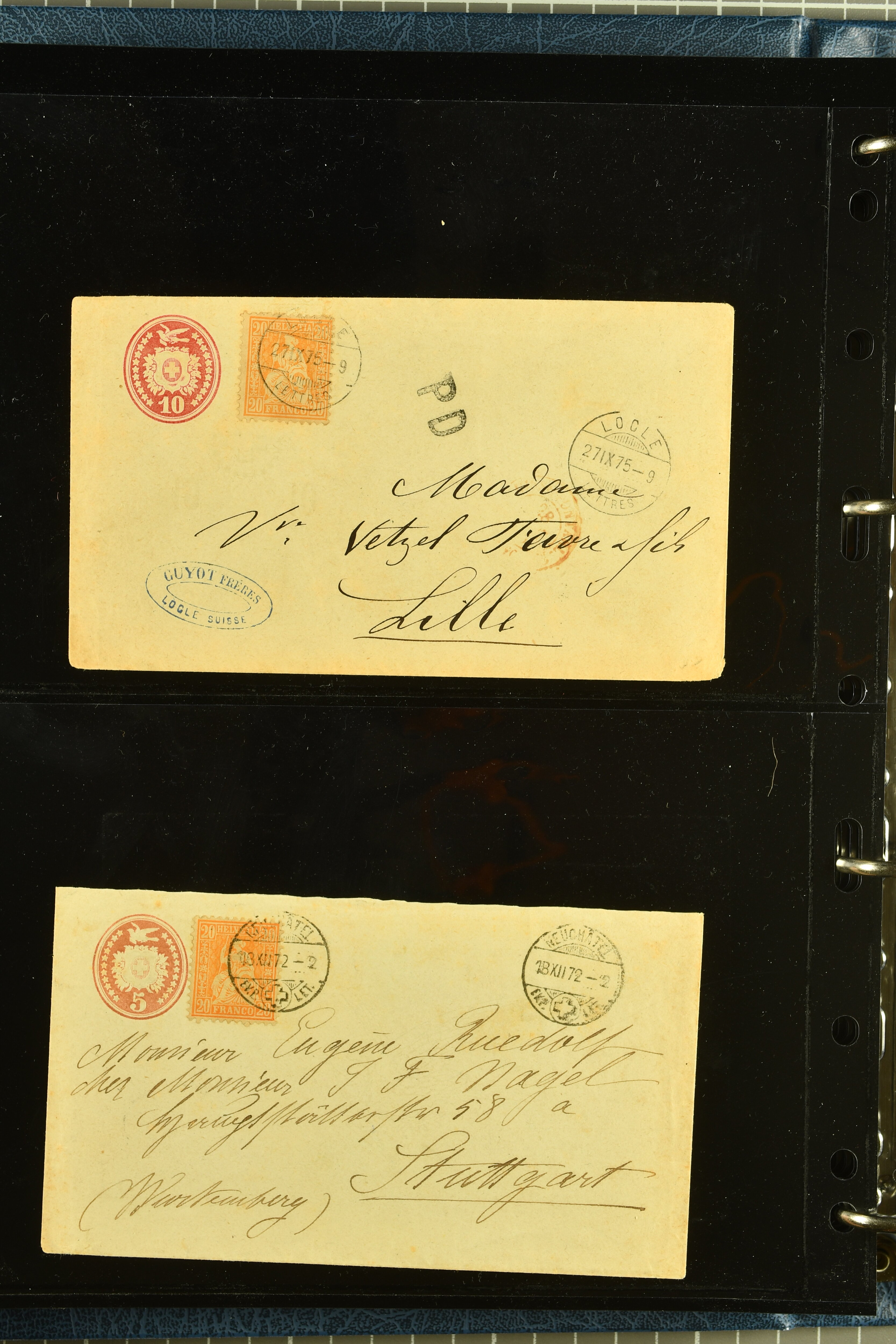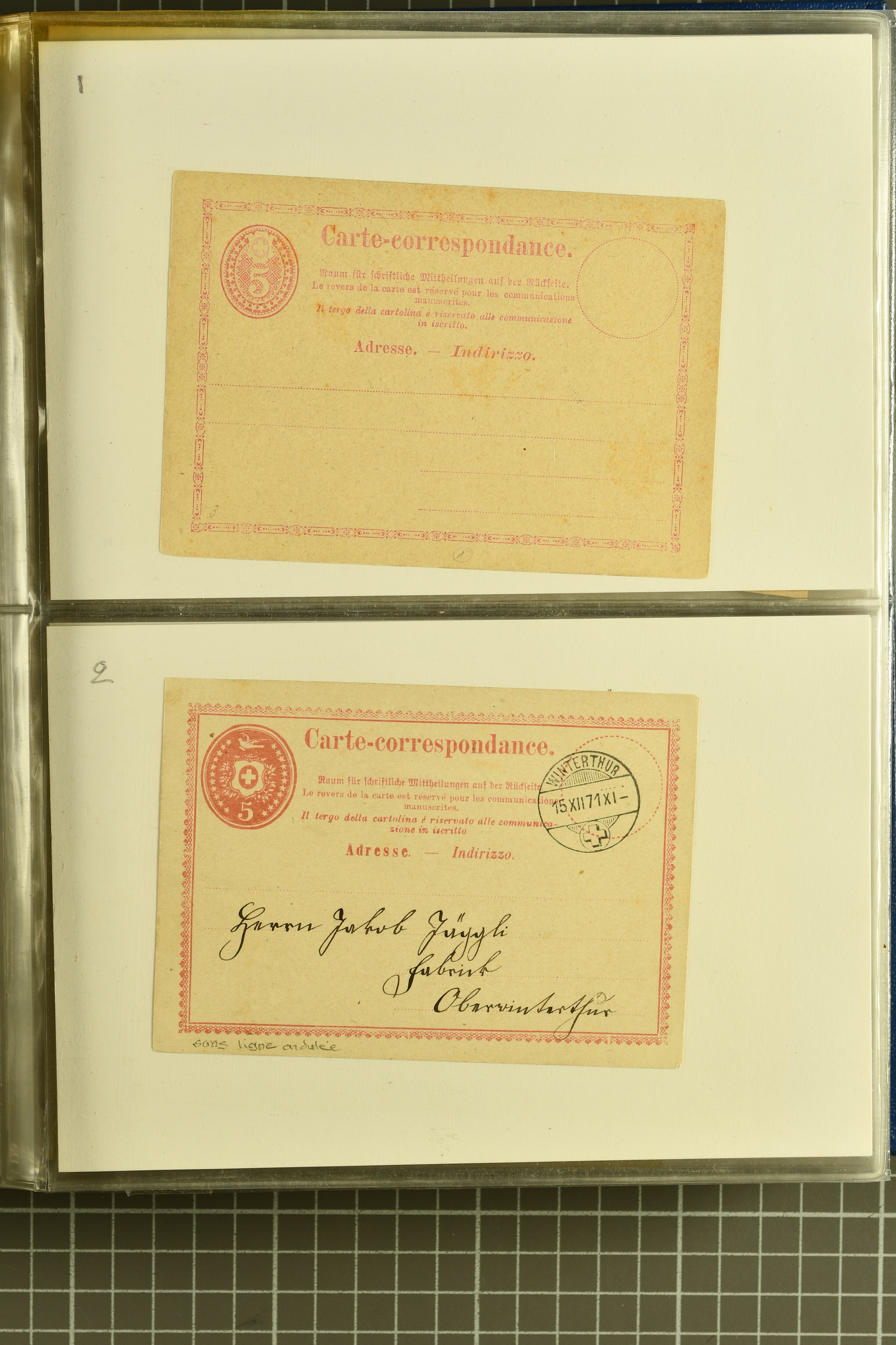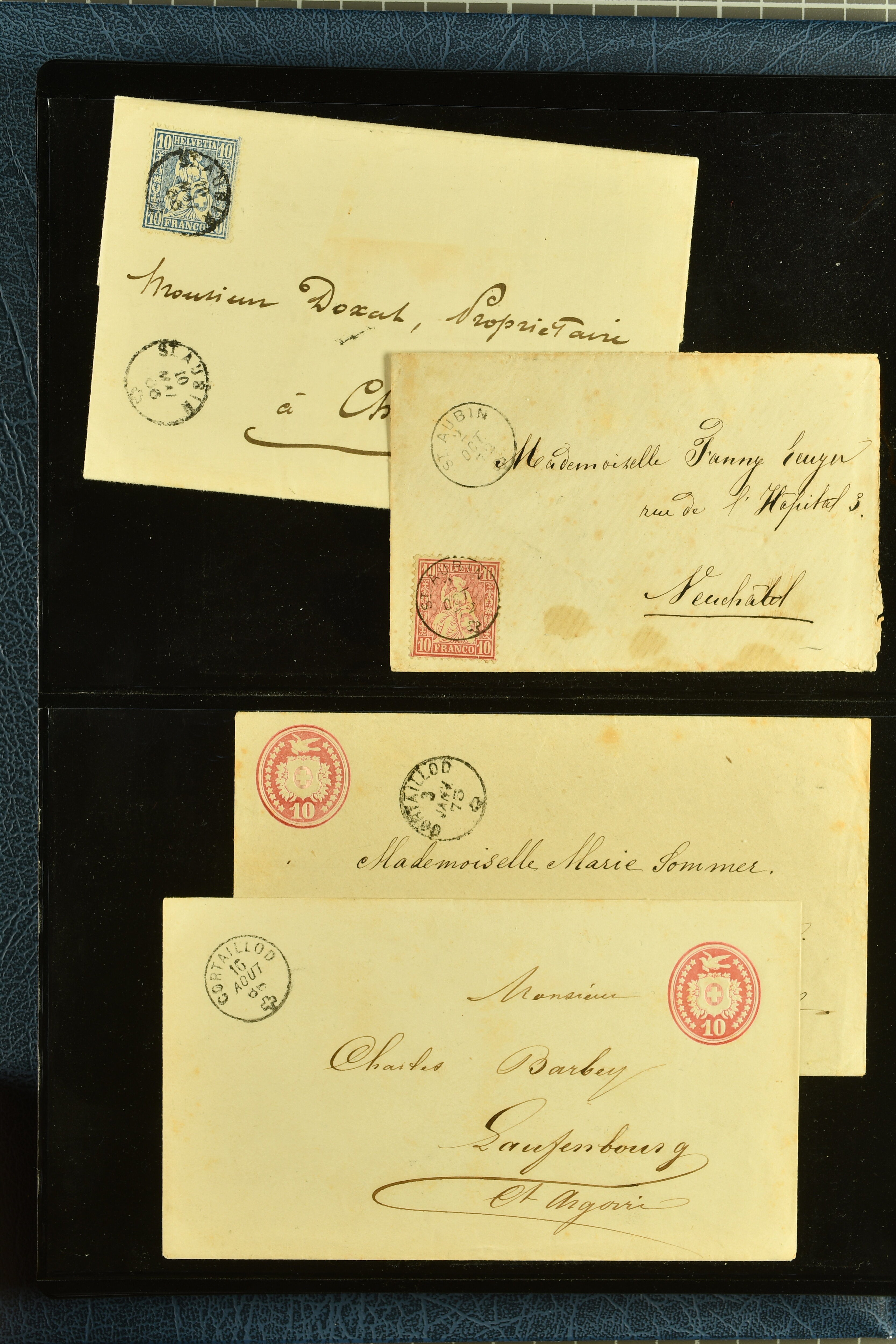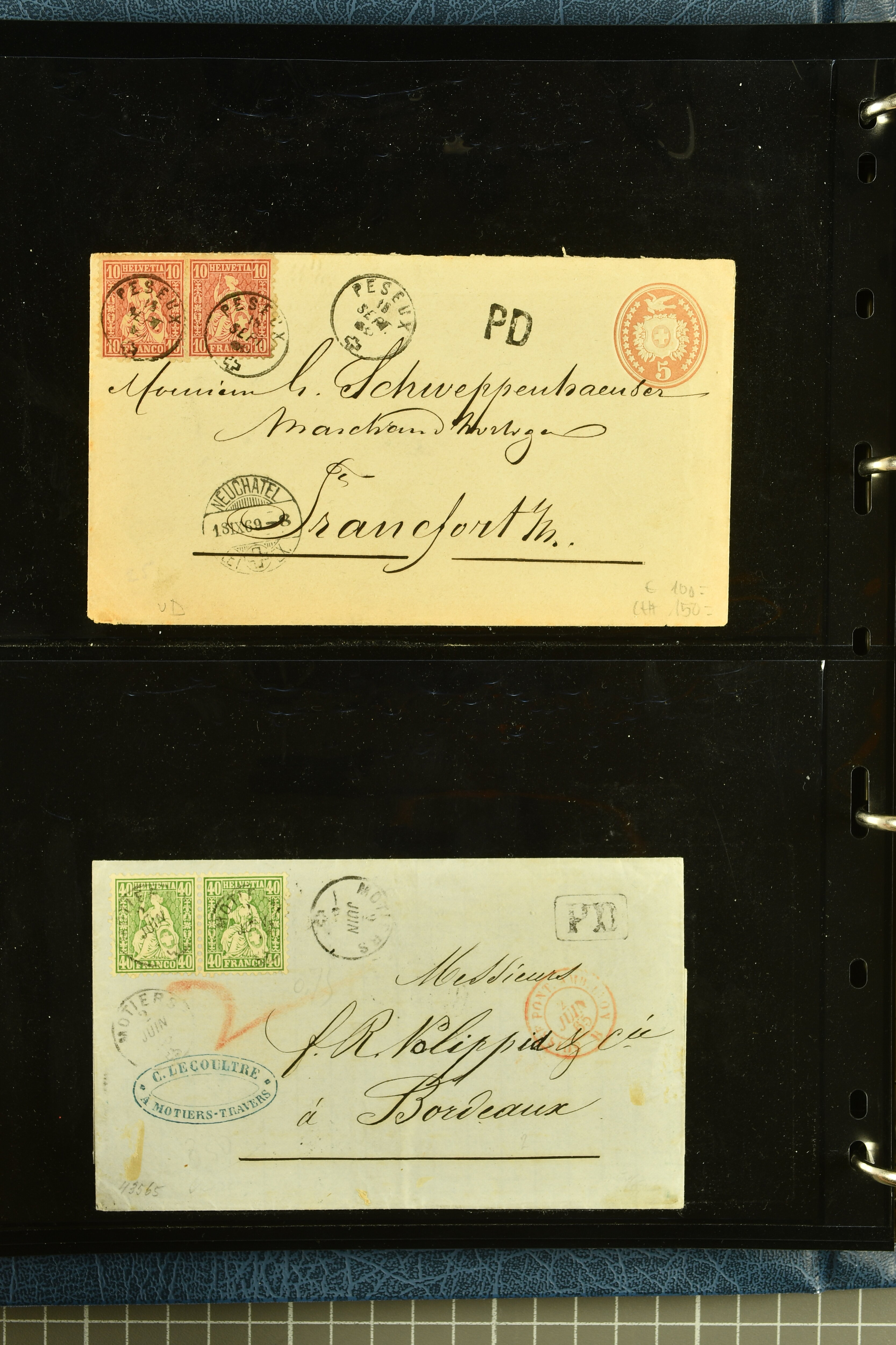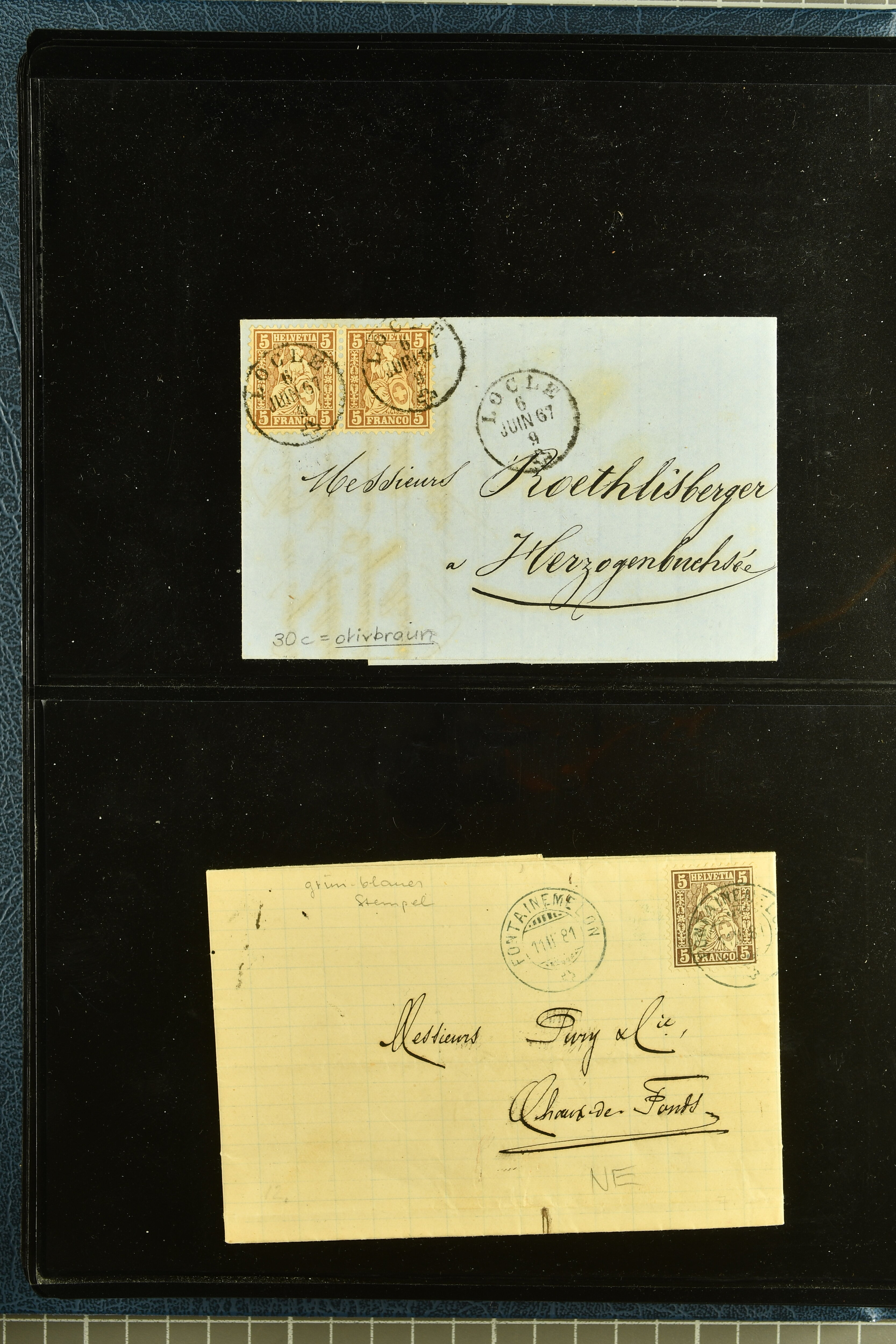9880 cover imagePostgeschichte Kanton Neuenburg 1854/1940 (ca.): Sammlung 180 Briefe und Karten ab acht Strubelbriefen mit einigen interessanten Entwertungen wie gr. Zierkreisstempel "BOUDRY 28 JANV. 1861", div. Fingerhutstempel oder einem Faltbrief nach Frankreich. Später Sitzende Helvetia und Ganzsachen mit zahlreichen Fingerhutstempeln worunter "MONTMIRAIL 23. NOV. 74" in blau auf Tüblibrief 25 Rp. grün nach Goldberg, Schlesien (Polen) und viele weniger geläufige Stempel, Spätverwendungen der grossen Zierkreisstempel von Serrières, Saint-Sulpice und Auvernier, Stabstp. wie "St. Olivier" auf kleinformatigem Drucksachen-Umschlag mit 2 Rp. grau nach La Chaux-de-Fonds, "CHAMBRELIEN" in blau auf sauberem Briefumschlag mit 10 Rp. rot nach Neuchâtel, verschiedene Güller-Datumstp. in blau aber auch diverse Auslandsfrankaturen der Sitzenden Helvetia oder eine frühe Einladungskarte der "Société la Récréation" in La Chaux-de-Fonds frankiert mit 2 Rp. oliv (1878). Ausserdem Ziffermuster und Stehende Helvetia mit interessanten Auslands-Buntfrankaturen, dekorativen illustrierten Briefen und Karten oder div. Ambulant- und anderen Stabstempeln, UPU 1900 mit 10 Rp.-Ganzsachenpostkarte von La Chaux-de-Fonds nach St. Petersburg, Russland sowie die Ausgaben nach 1907 weiterhin mit interessanten Versandformen wie Expresspostkarten, Stempel wie Stabstp. "CLÉMESIN / NEUCHTEL" auf Postkarte von 1908, Destinationen wie zwei 10 Rp.-Ganzsachenpostkarten nach Chile und Uruguay (1909/14), Vignetten und besseren Frankaturen wie zwei Karten mit Pro Juventute-Vorläufer französisch (SBK JII). Eine interessante Sammlung in meist guter Erhaltung; vier Atteste (Image 1) (Image 2) (Image 3) (Image 4) (Image 5) (Image 6) (Image 7) (Image 8) (Image 9) (Image 10) (Image 11) (Image 12) (Image 13) (Image 14) (Image 15) (Image 16) (Image 17) (Image 18) (Image 19) (Image 20) (Image 21) (Image 22) (Image 23) (Image 24) (Image 25) (Image 26) (Image 27) (Image 28) (Image 29) (Image 30) (Image 31) (Image 32) (Image 33) (Image 34) (Image 35) (Image 36) (Image 37) (Image 38) (Image 39) (Image 40) (Image 41) (Image 42) (Image 43) (Image 44) (Image 45) (Image 46) (Image 47) (Image 48) (Image 49) (Image 50)