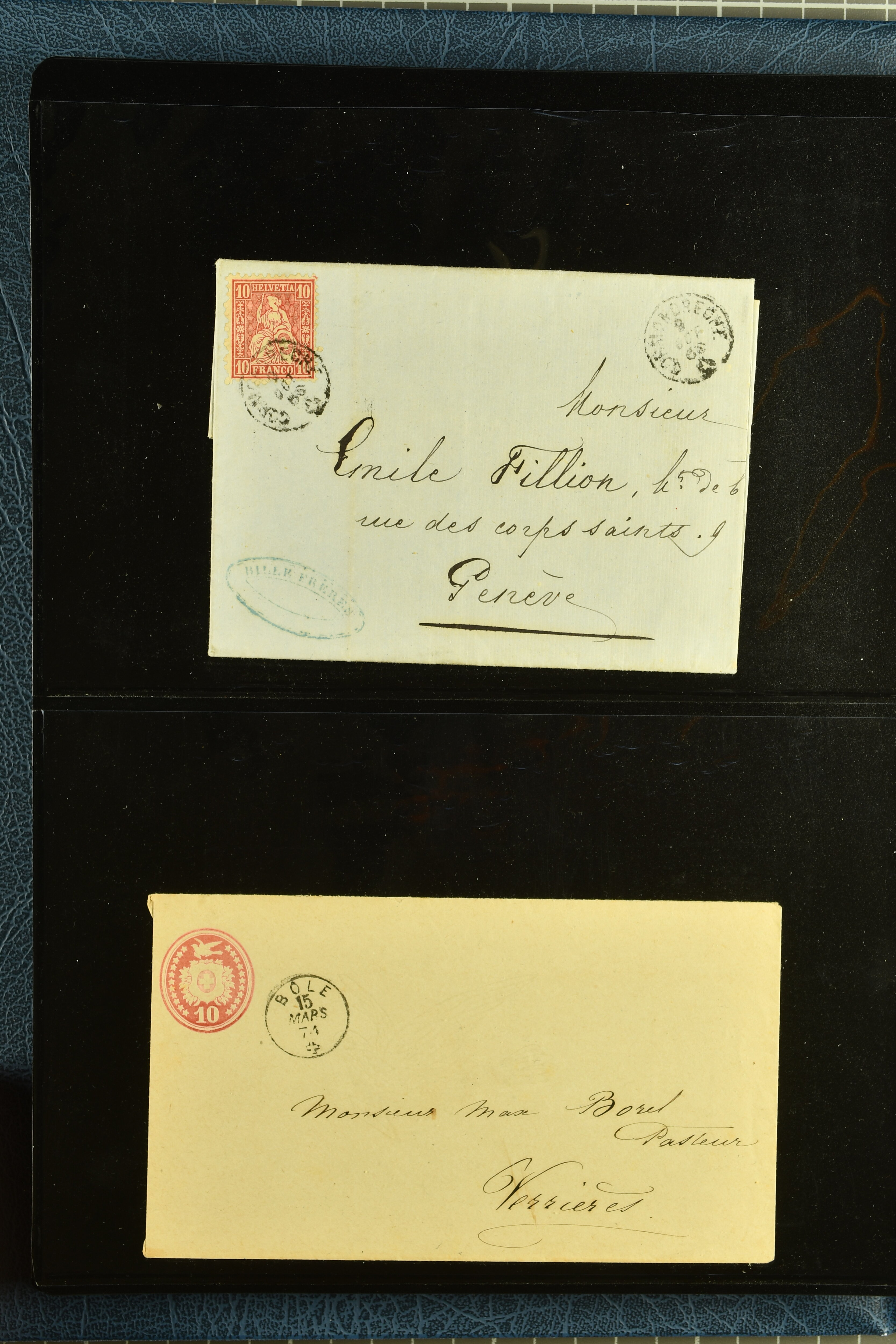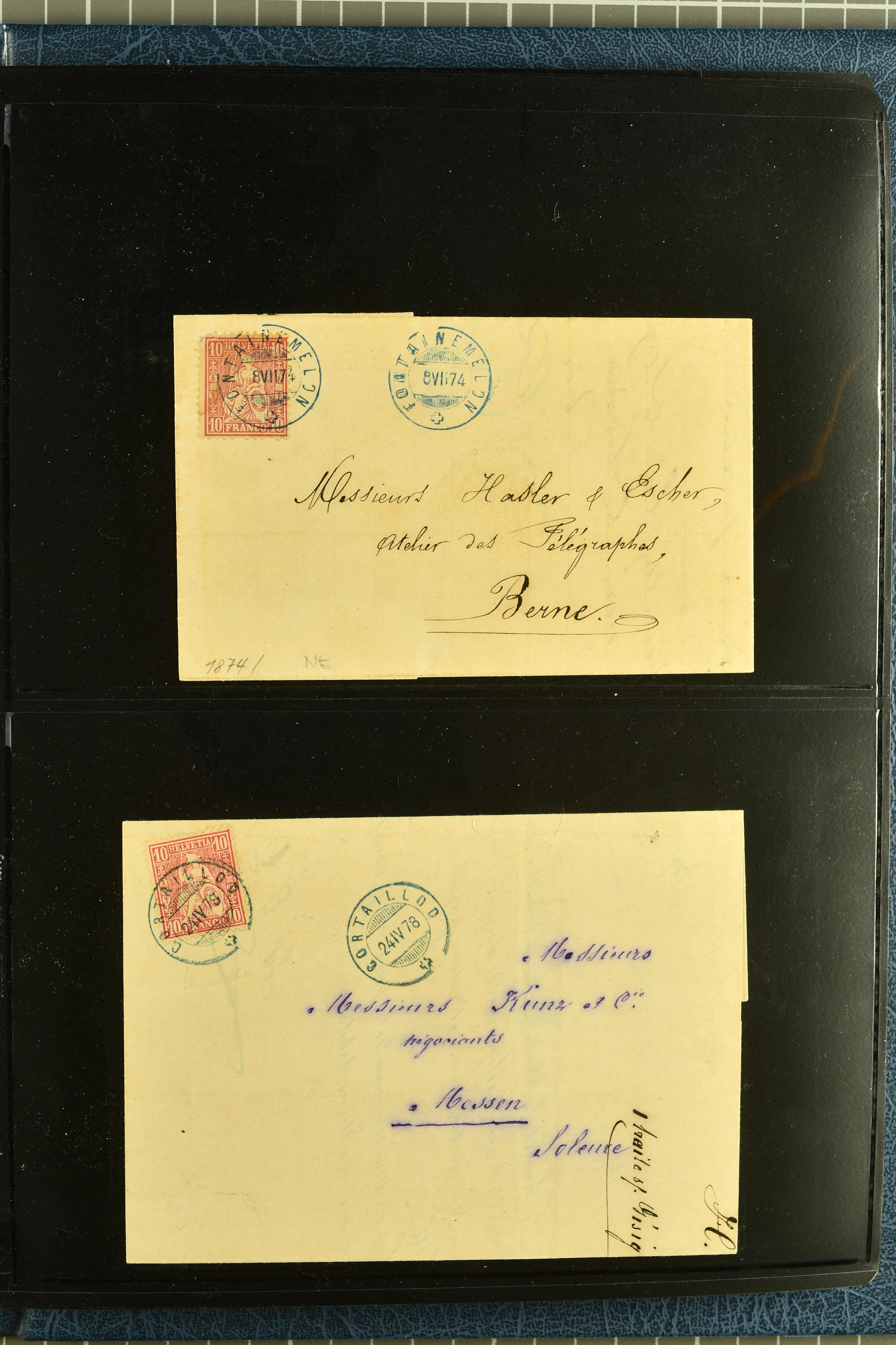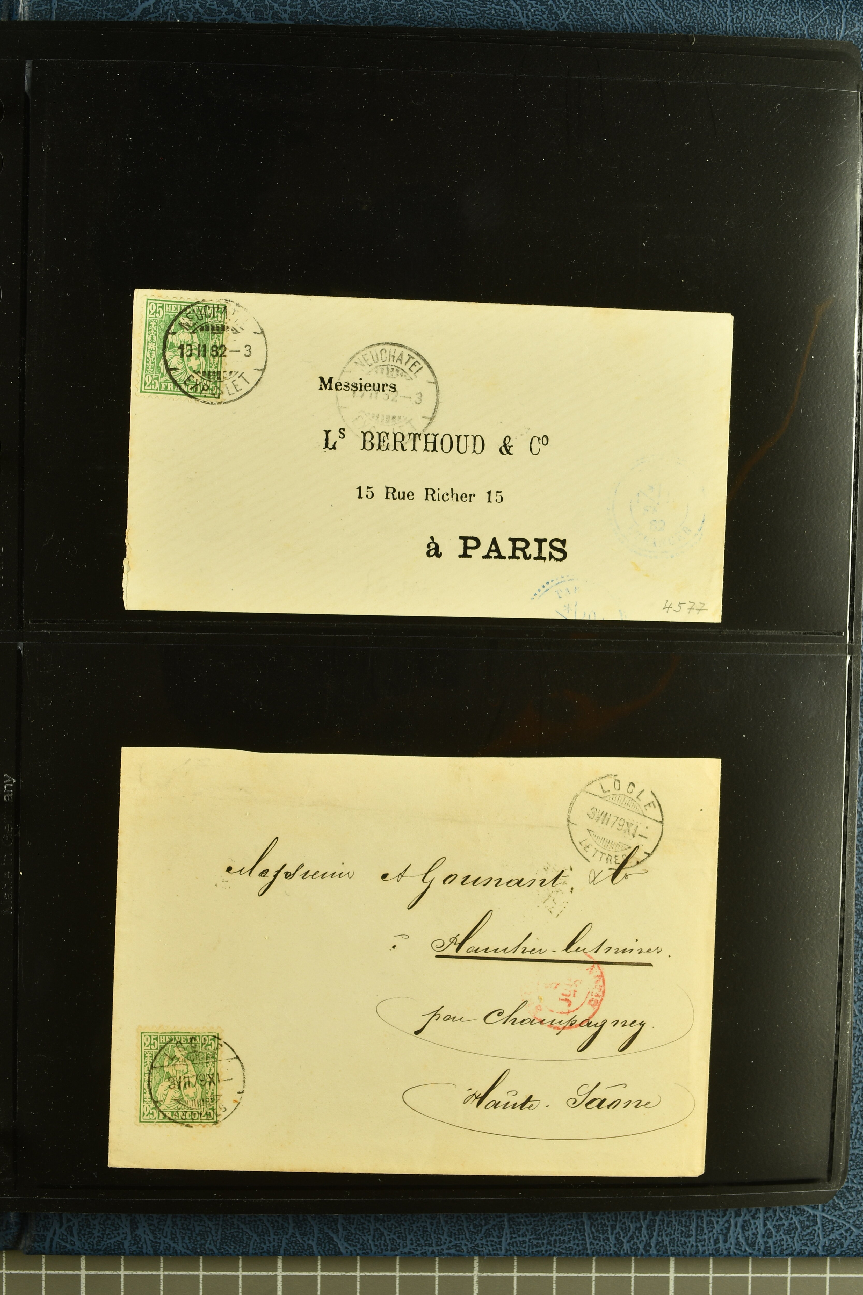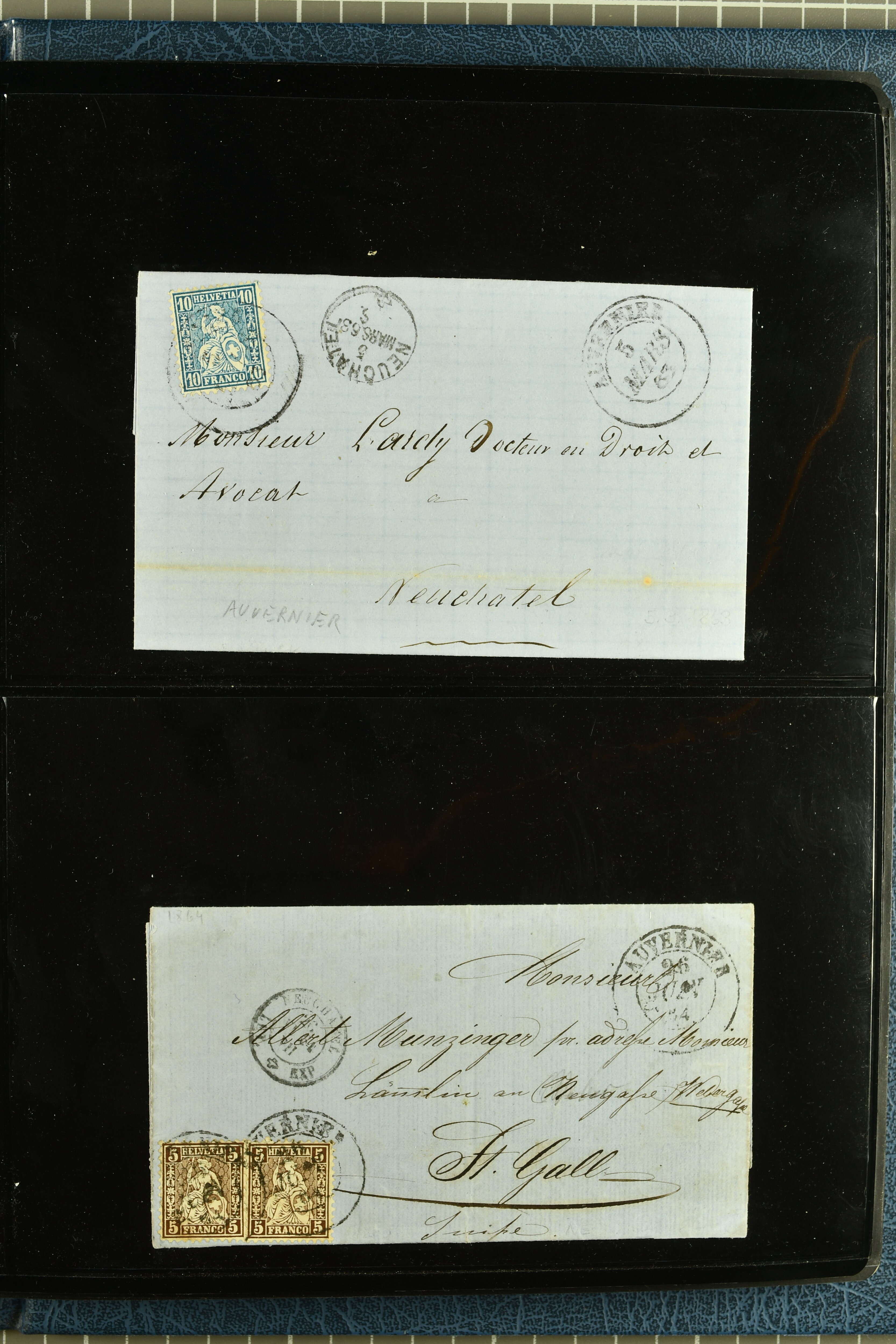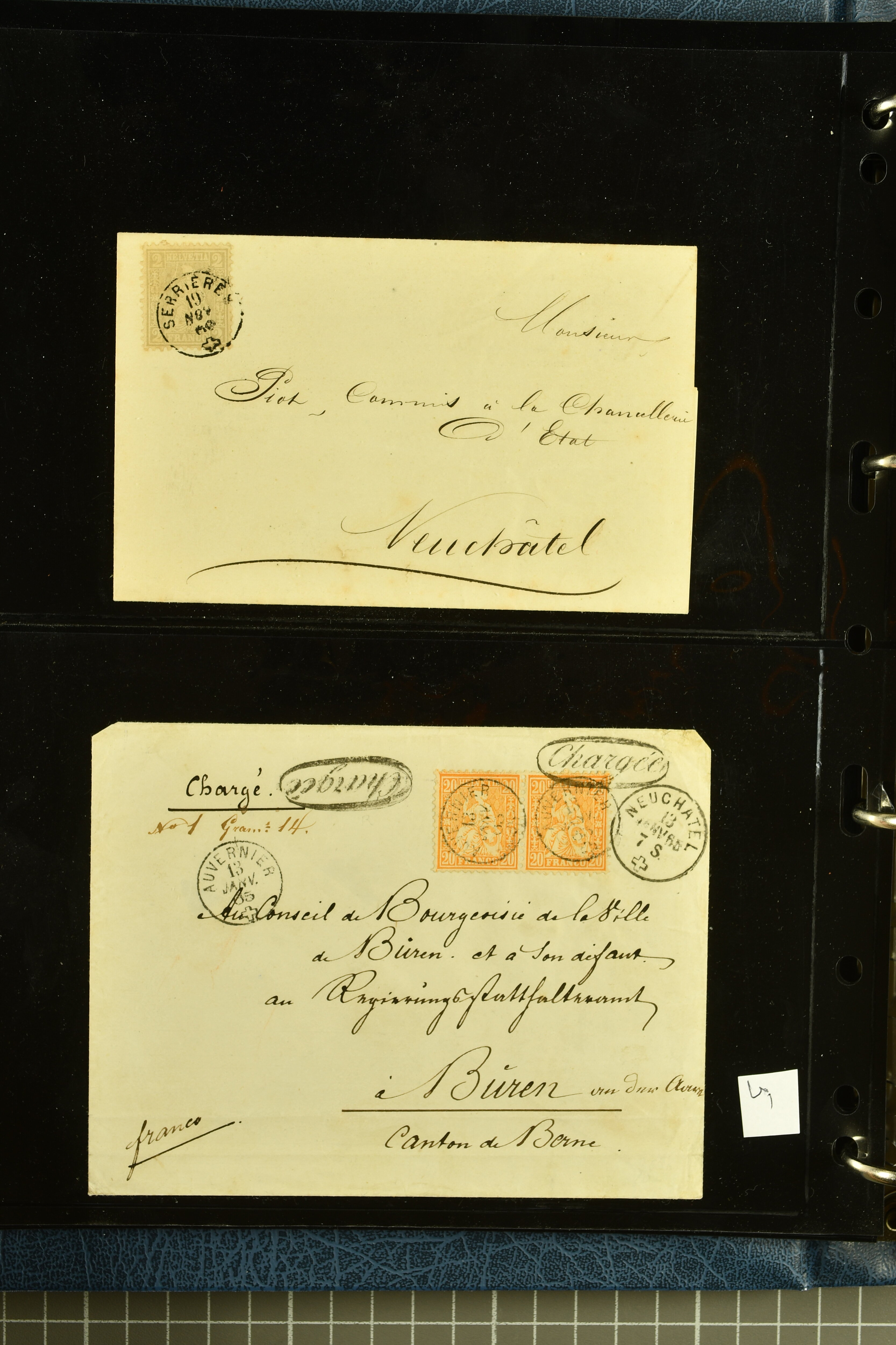 9880 cover imagePostgeschichte Kanton Neuenburg 1854/1940 (ca.): Sammlung 180 Briefe und Karten ab acht Strubelbriefen mit einigen interessanten Entwertungen wie gr. Zierkreisstempel "BOUDRY 28 JANV. 1861", div. Fingerhutstempel oder einem Faltbrief nach Frankreich. Später Sitzende Helvetia und Ganzsachen mit zahlreichen Fingerhutstempeln worunter "MONTMIRAIL 23. NOV. 74" in blau auf Tüblibrief 25 Rp. grün nach Goldberg, Schlesien (Polen) und viele weniger geläufige Stempel, Spätverwendungen der grossen Zierkreisstempel von Serrières, Saint-Sulpice und Auvernier, Stabstp. wie "St. Olivier" auf kleinformatigem Drucksachen-Umschlag mit 2 Rp. grau nach La Chaux-de-Fonds, "CHAMBRELIEN" in blau auf sauberem Briefumschlag mit 10 Rp. rot nach Neuchâtel, verschiedene Güller-Datumstp. in blau aber auch diverse Auslandsfrankaturen der Sitzenden Helvetia oder eine frühe Einladungskarte der "Société la Récréation" in La Chaux-de-Fonds frankiert mit 2 Rp. oliv (1878). Ausserdem Ziffermuster und Stehende Helvetia mit interessanten Auslands-Buntfrankaturen, dekorativen illustrierten Briefen und Karten oder div. Ambulant- und anderen Stabstempeln, UPU 1900 mit 10 Rp.-Ganzsachenpostkarte von La Chaux-de-Fonds nach St. Petersburg, Russland sowie die Ausgaben nach 1907 weiterhin mit interessanten Versandformen wie Expresspostkarten, Stempel wie Stabstp. "CLÉMESIN / NEUCHTEL" auf Postkarte von 1908, Destinationen wie zwei 10 Rp.-Ganzsachenpostkarten nach Chile und Uruguay (1909/14), Vignetten und besseren Frankaturen wie zwei Karten mit Pro Juventute-Vorläufer französisch (SBK JII). Eine interessante Sammlung in meist guter Erhaltung; vier Atteste (Image 1) (Image 2) (Image 3) (Image 4) (Image 5) (Image 6) (Image 7) (Image 8) (Image 9) (Image 10) (Image 11) (Image 12) (Image 13) (Image 14) (Image 15) (Image 16) (Image 17) (Image 18) (Image 19) (Image 20) (Image 21) (Image 22) (Image 23) (Image 24) (Image 25) (Image 26) (Image 27) (Image 28) (Image 29) (Image 30) (Image 31) (Image 32) (Image 33) (Image 34) (Image 35) (Image 36) (Image 37) (Image 38) (Image 39) (Image 40) (Image 41) (Image 42) (Image 43) (Image 44) (Image 45) (Image 46) (Image 47) (Image 48) (Image 49) (Image 50)