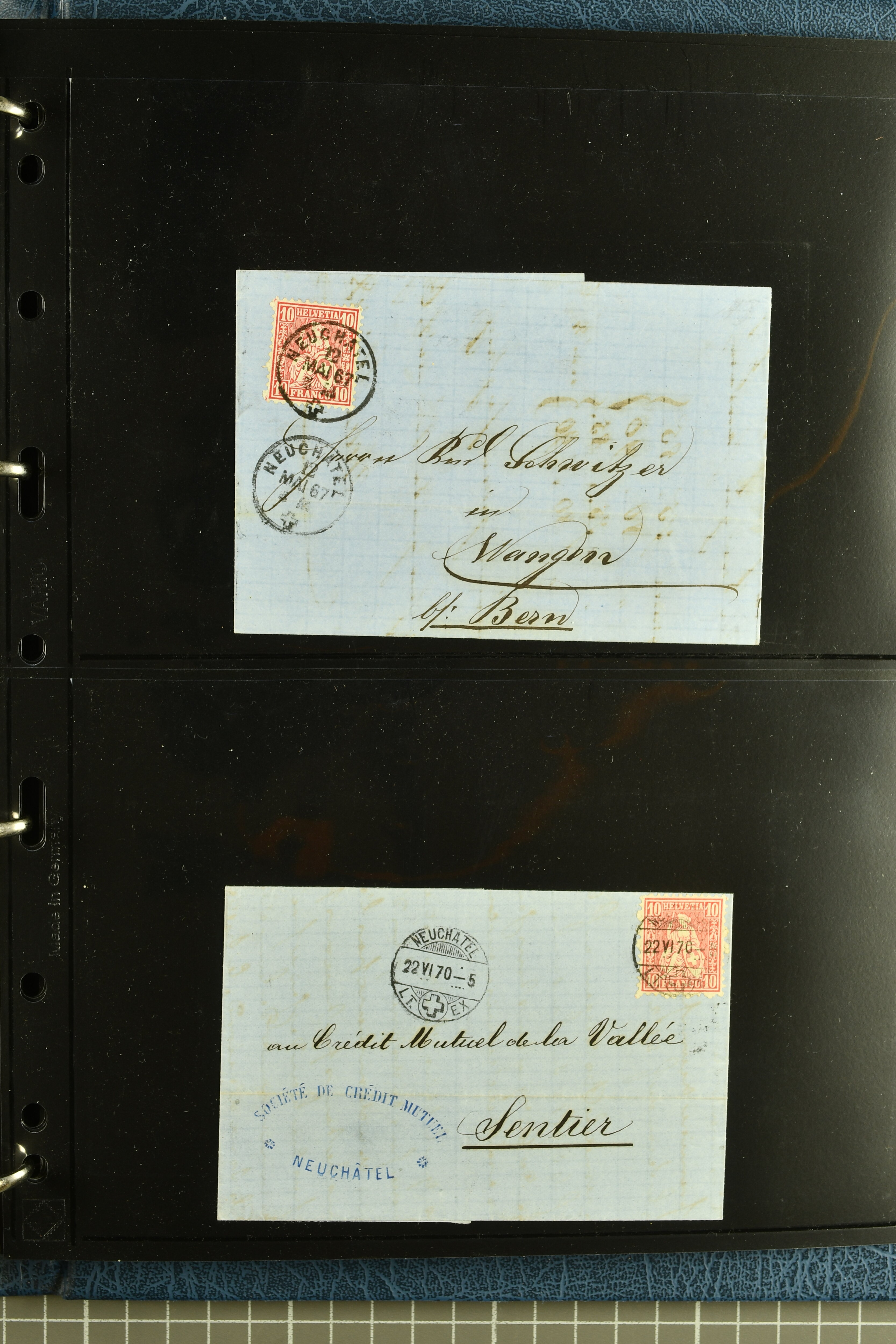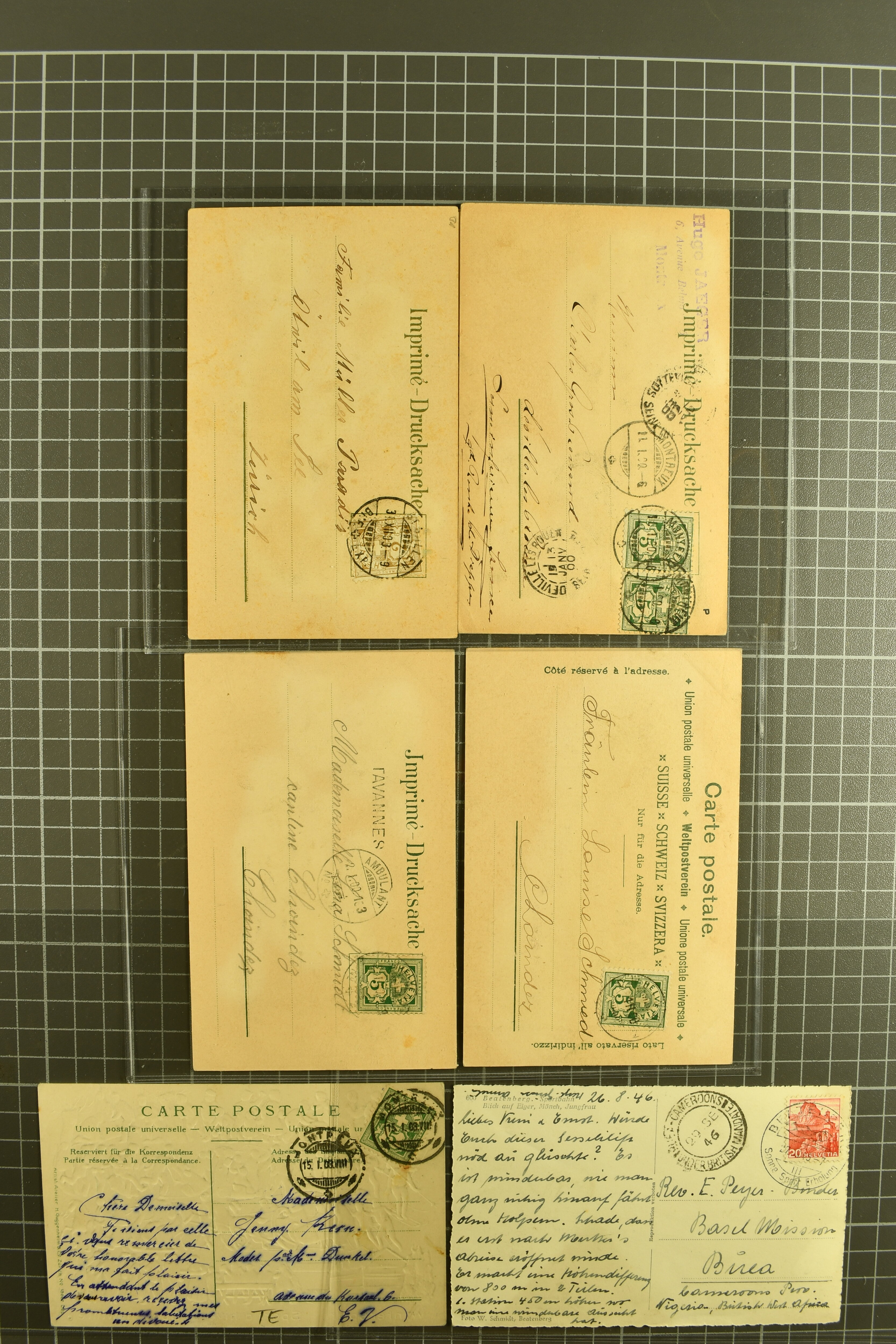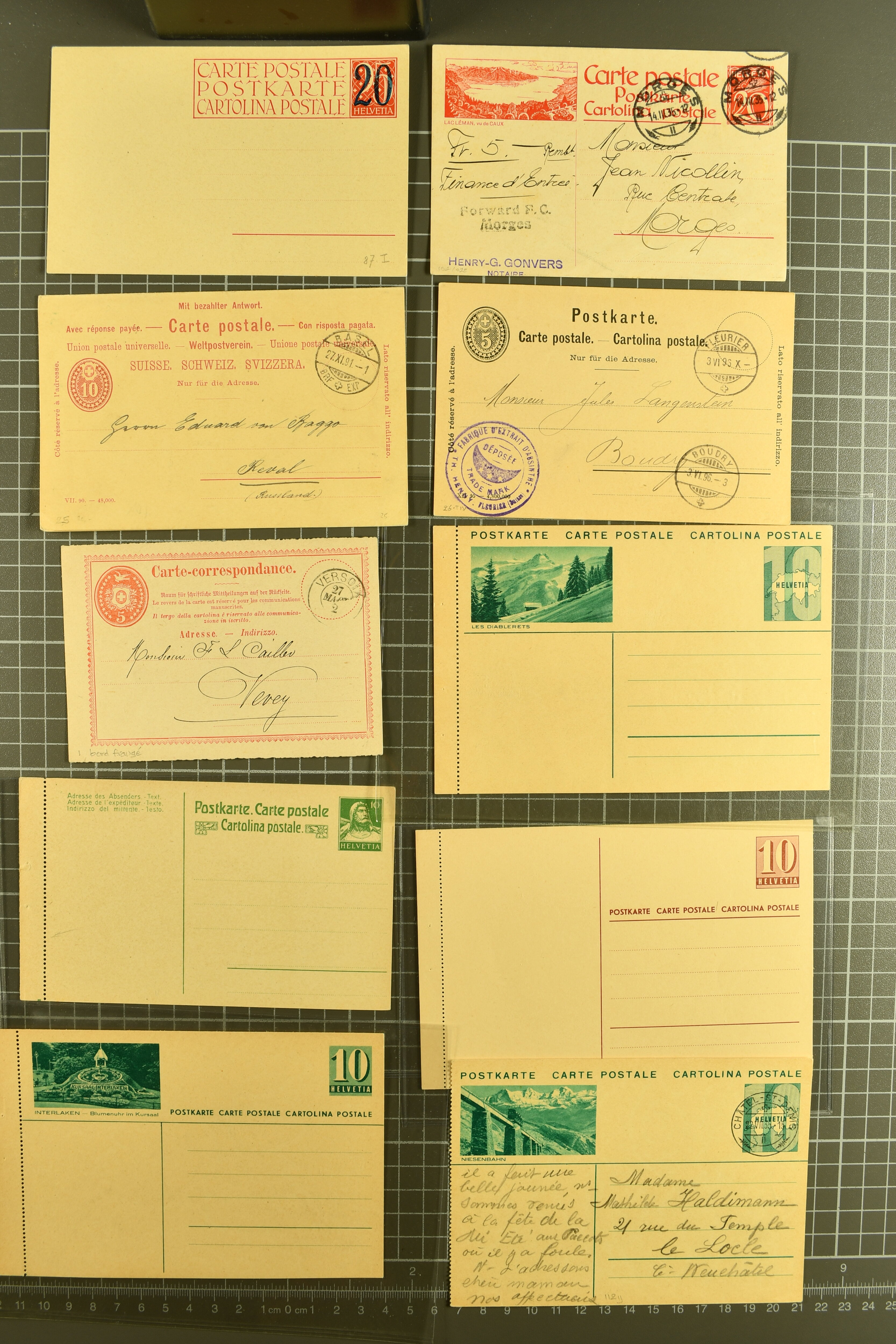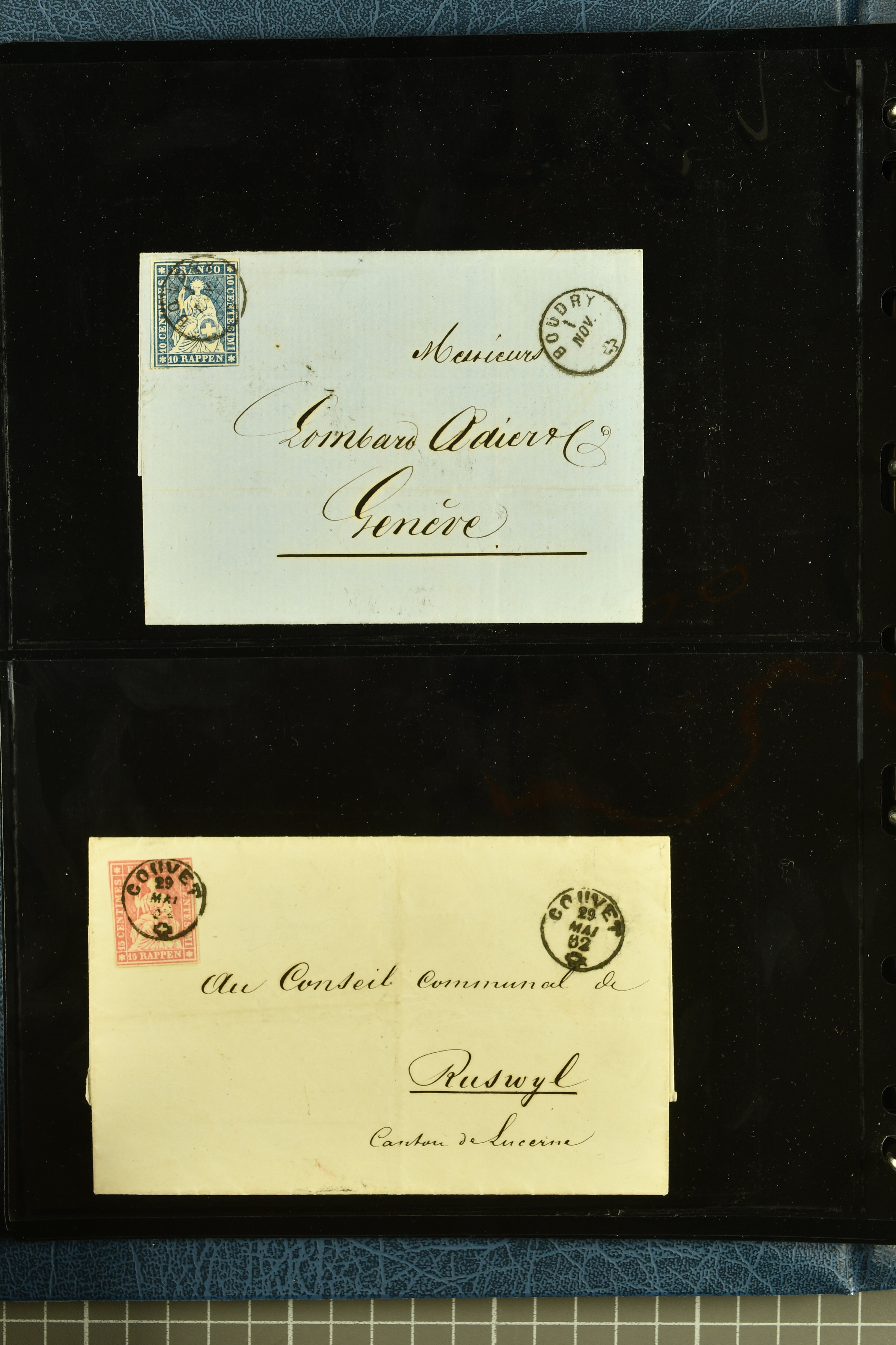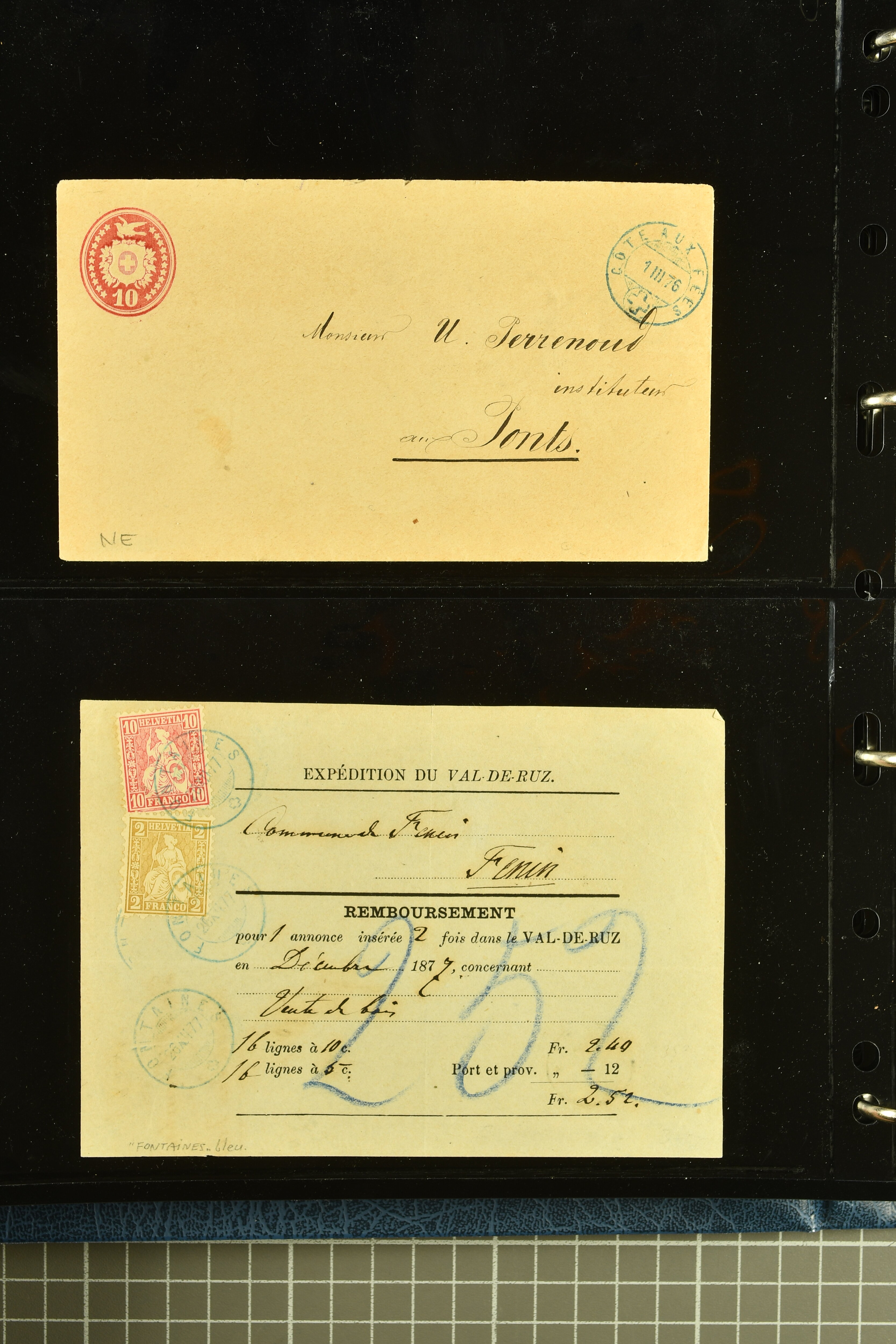 9880 cover imagePostgeschichte Kanton Neuenburg 1854/1940 (ca.): Sammlung 180 Briefe und Karten ab acht Strubelbriefen mit einigen interessanten Entwertungen wie gr. Zierkreisstempel "BOUDRY 28 JANV. 1861", div. Fingerhutstempel oder einem Faltbrief nach Frankreich. Später Sitzende Helvetia und Ganzsachen mit zahlreichen Fingerhutstempeln worunter "MONTMIRAIL 23. NOV. 74" in blau auf Tüblibrief 25 Rp. grün nach Goldberg, Schlesien (Polen) und viele weniger geläufige Stempel, Spätverwendungen der grossen Zierkreisstempel von Serrières, Saint-Sulpice und Auvernier, Stabstp. wie "St. Olivier" auf kleinformatigem Drucksachen-Umschlag mit 2 Rp. grau nach La Chaux-de-Fonds, "CHAMBRELIEN" in blau auf sauberem Briefumschlag mit 10 Rp. rot nach Neuchâtel, verschiedene Güller-Datumstp. in blau aber auch diverse Auslandsfrankaturen der Sitzenden Helvetia oder eine frühe Einladungskarte der "Société la Récréation" in La Chaux-de-Fonds frankiert mit 2 Rp. oliv (1878). Ausserdem Ziffermuster und Stehende Helvetia mit interessanten Auslands-Buntfrankaturen, dekorativen illustrierten Briefen und Karten oder div. Ambulant- und anderen Stabstempeln, UPU 1900 mit 10 Rp.-Ganzsachenpostkarte von La Chaux-de-Fonds nach St. Petersburg, Russland sowie die Ausgaben nach 1907 weiterhin mit interessanten Versandformen wie Expresspostkarten, Stempel wie Stabstp. "CLÉMESIN / NEUCHTEL" auf Postkarte von 1908, Destinationen wie zwei 10 Rp.-Ganzsachenpostkarten nach Chile und Uruguay (1909/14), Vignetten und besseren Frankaturen wie zwei Karten mit Pro Juventute-Vorläufer französisch (SBK JII). Eine interessante Sammlung in meist guter Erhaltung; vier Atteste (Image 1) (Image 2) (Image 3) (Image 4) (Image 5) (Image 6) (Image 7) (Image 8) (Image 9) (Image 10) (Image 11) (Image 12) (Image 13) (Image 14) (Image 15) (Image 16) (Image 17) (Image 18) (Image 19) (Image 20) (Image 21) (Image 22) (Image 23) (Image 24) (Image 25) (Image 26) (Image 27) (Image 28) (Image 29) (Image 30) (Image 31) (Image 32) (Image 33) (Image 34) (Image 35) (Image 36) (Image 37) (Image 38) (Image 39) (Image 40) (Image 41) (Image 42) (Image 43) (Image 44) (Image 45) (Image 46) (Image 47) (Image 48) (Image 49) (Image 50)