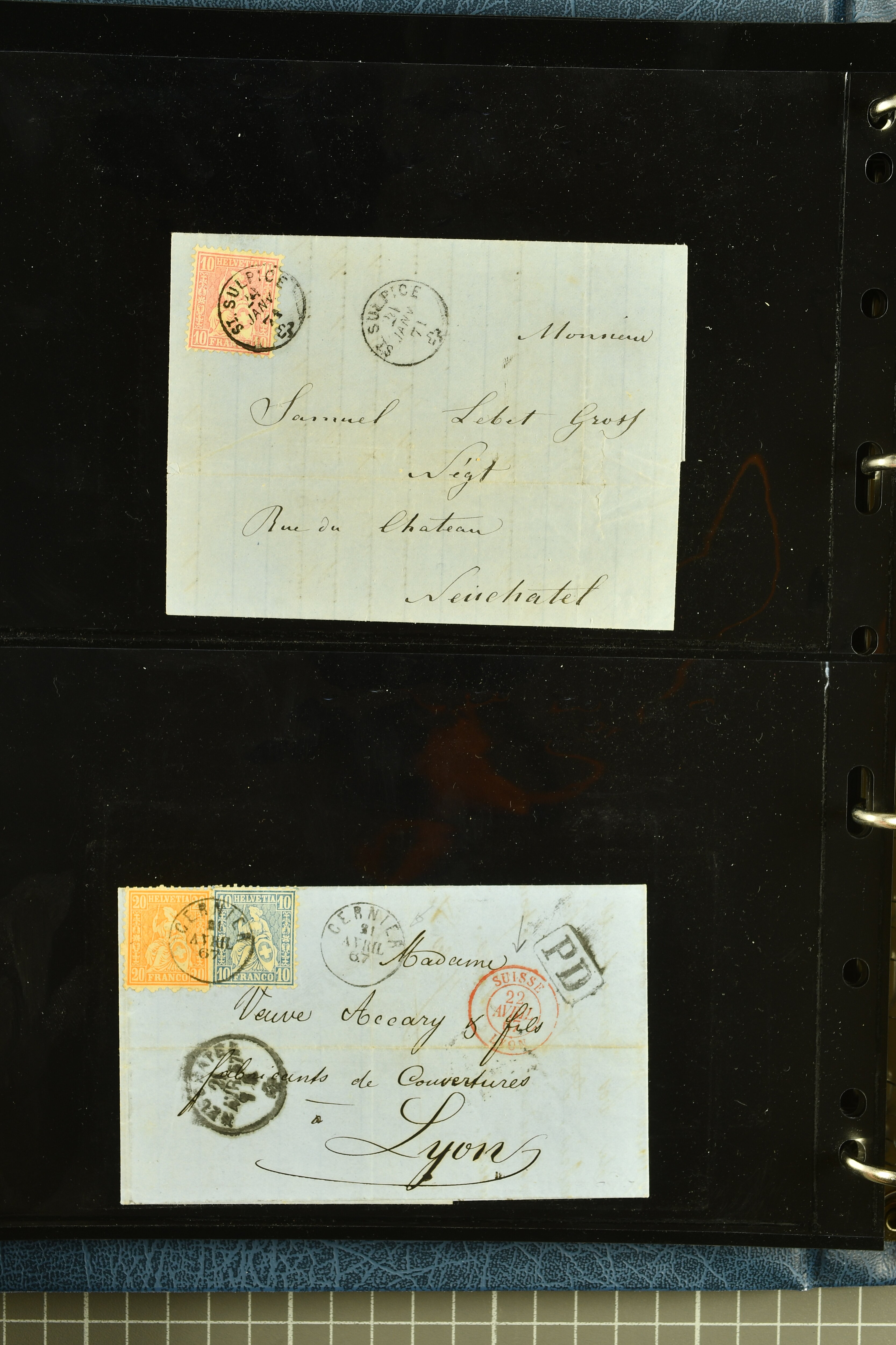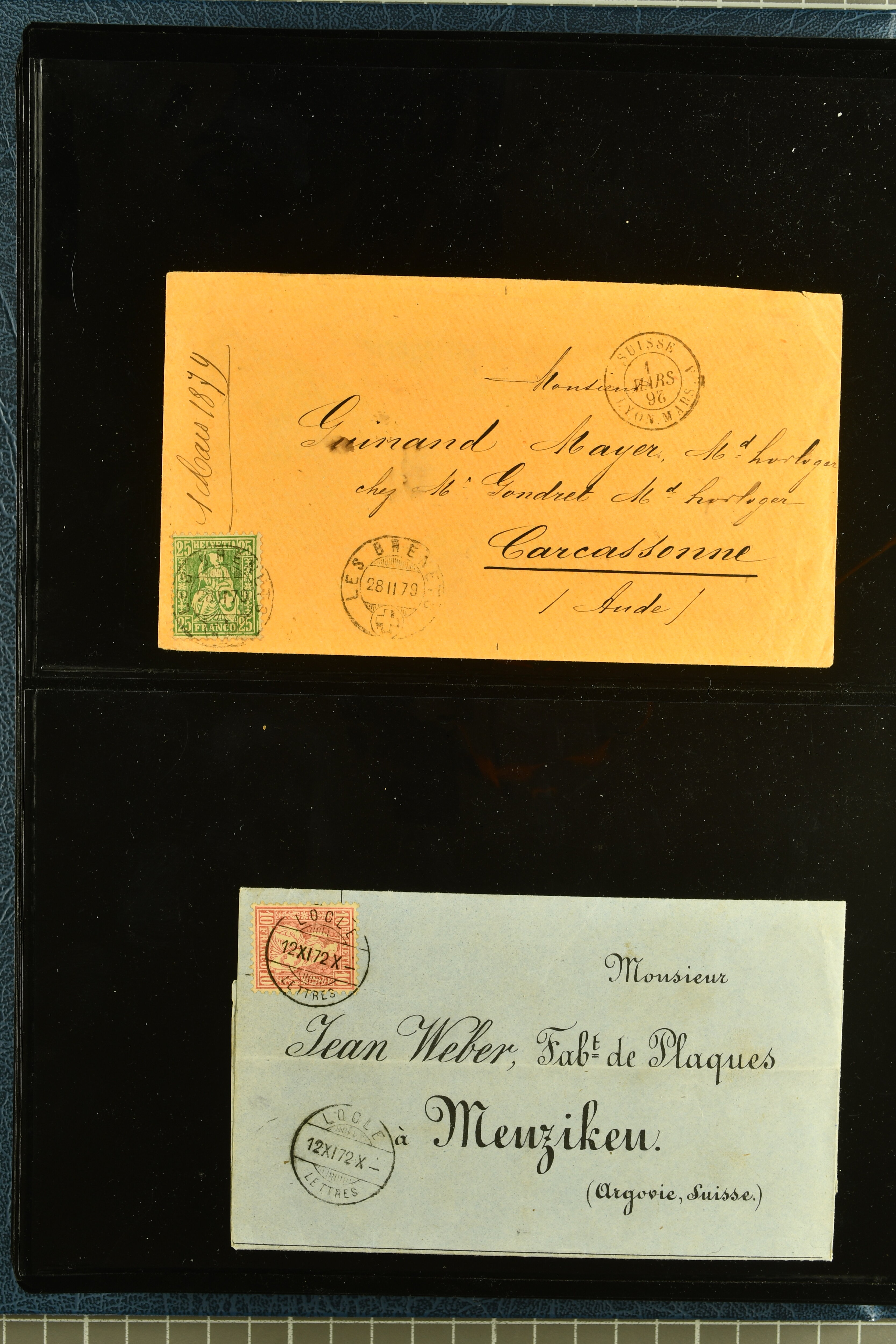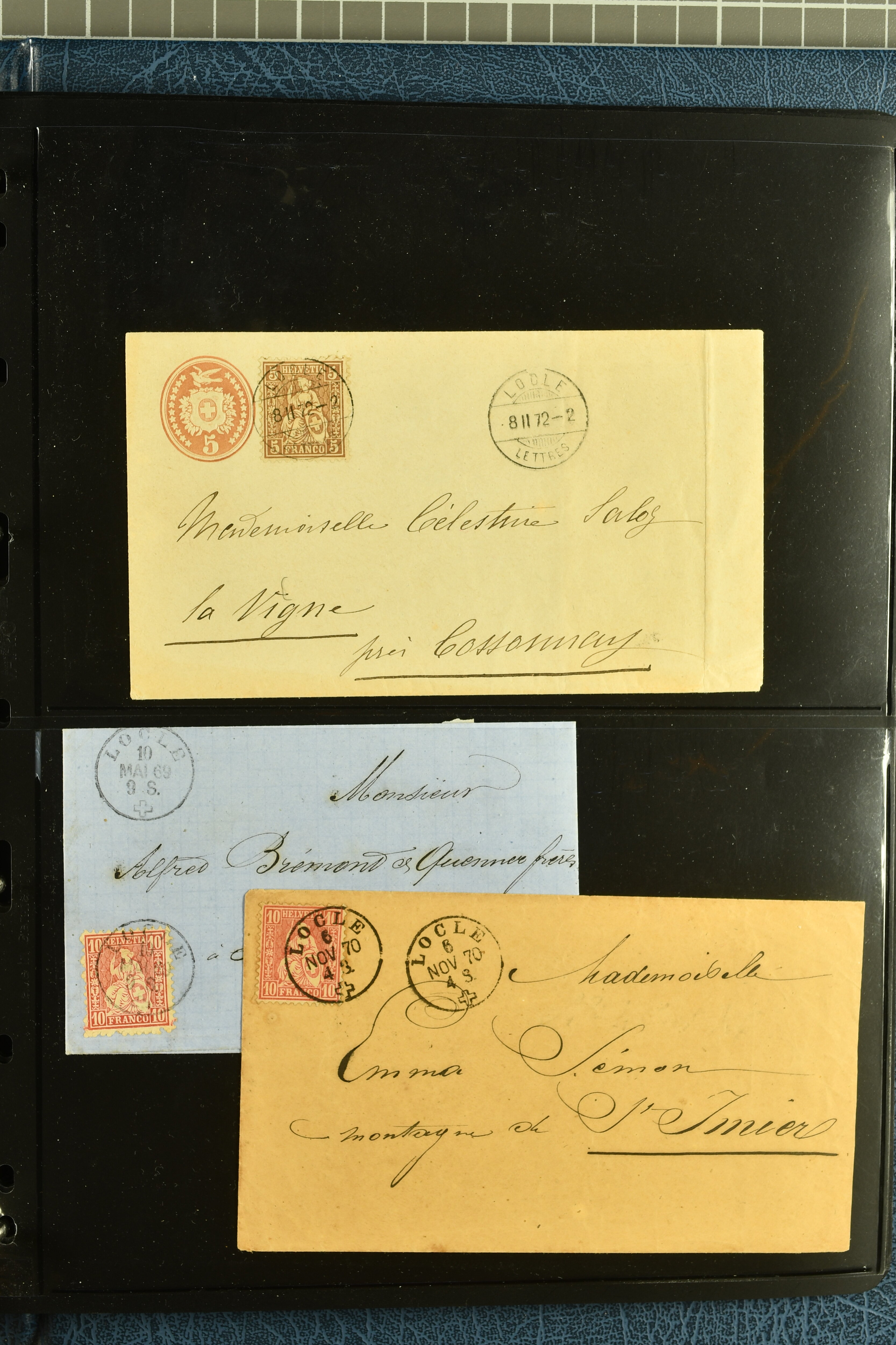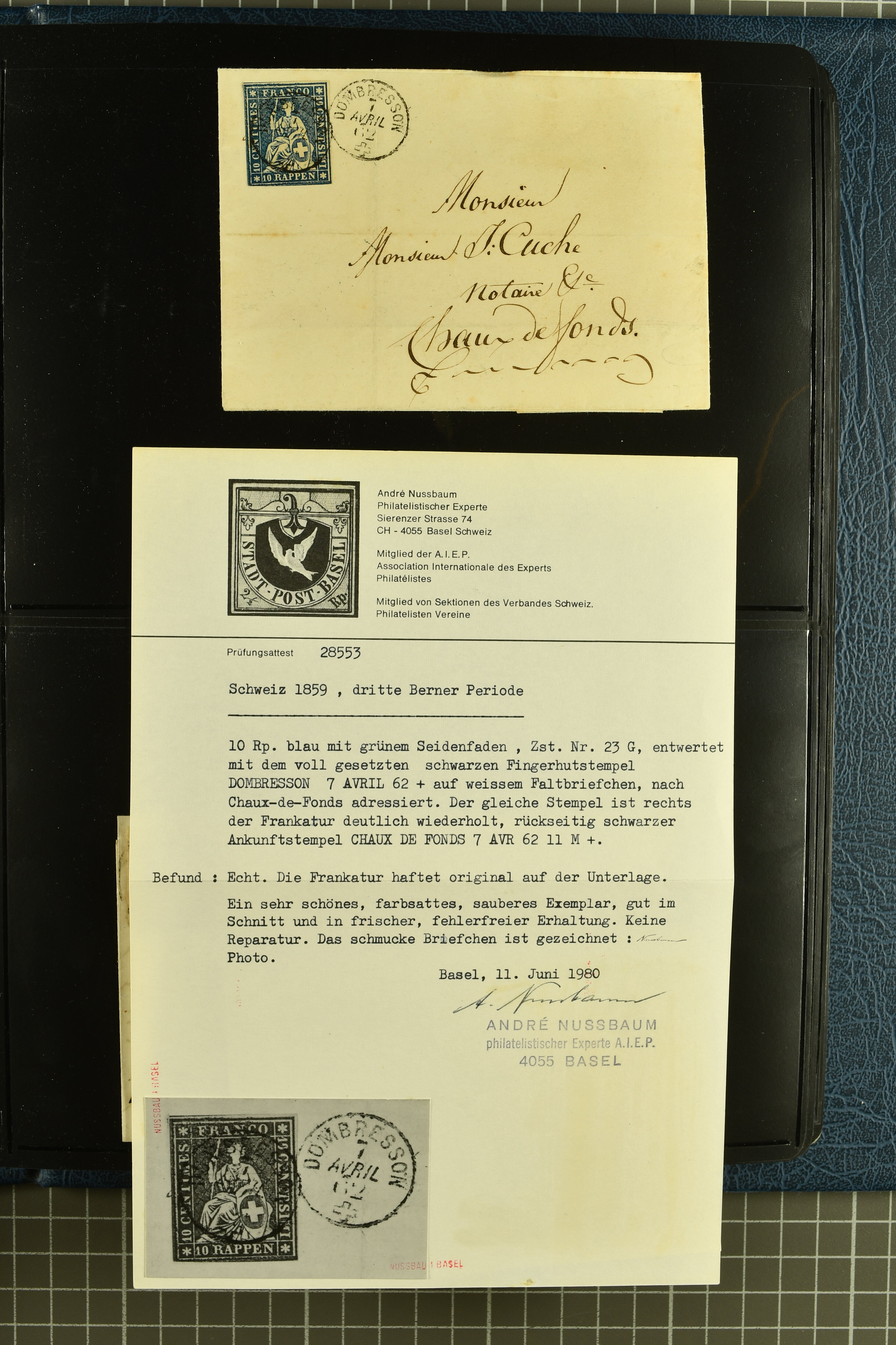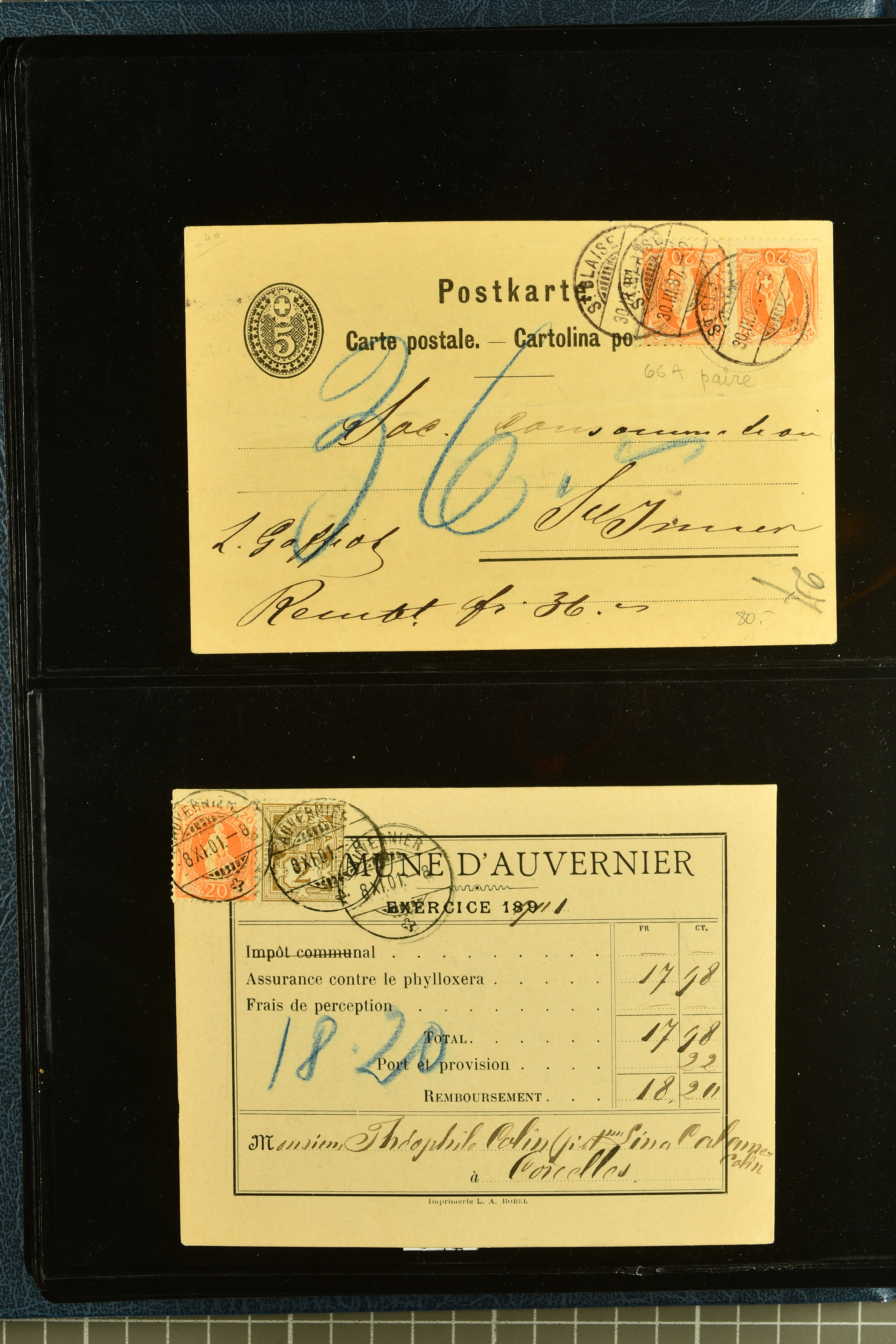 9880 cover imagePostgeschichte Kanton Neuenburg 1854/1940 (ca.): Sammlung 180 Briefe und Karten ab acht Strubelbriefen mit einigen interessanten Entwertungen wie gr. Zierkreisstempel "BOUDRY 28 JANV. 1861", div. Fingerhutstempel oder einem Faltbrief nach Frankreich. Später Sitzende Helvetia und Ganzsachen mit zahlreichen Fingerhutstempeln worunter "MONTMIRAIL 23. NOV. 74" in blau auf Tüblibrief 25 Rp. grün nach Goldberg, Schlesien (Polen) und viele weniger geläufige Stempel, Spätverwendungen der grossen Zierkreisstempel von Serrières, Saint-Sulpice und Auvernier, Stabstp. wie "St. Olivier" auf kleinformatigem Drucksachen-Umschlag mit 2 Rp. grau nach La Chaux-de-Fonds, "CHAMBRELIEN" in blau auf sauberem Briefumschlag mit 10 Rp. rot nach Neuchâtel, verschiedene Güller-Datumstp. in blau aber auch diverse Auslandsfrankaturen der Sitzenden Helvetia oder eine frühe Einladungskarte der "Société la Récréation" in La Chaux-de-Fonds frankiert mit 2 Rp. oliv (1878). Ausserdem Ziffermuster und Stehende Helvetia mit interessanten Auslands-Buntfrankaturen, dekorativen illustrierten Briefen und Karten oder div. Ambulant- und anderen Stabstempeln, UPU 1900 mit 10 Rp.-Ganzsachenpostkarte von La Chaux-de-Fonds nach St. Petersburg, Russland sowie die Ausgaben nach 1907 weiterhin mit interessanten Versandformen wie Expresspostkarten, Stempel wie Stabstp. "CLÉMESIN / NEUCHTEL" auf Postkarte von 1908, Destinationen wie zwei 10 Rp.-Ganzsachenpostkarten nach Chile und Uruguay (1909/14), Vignetten und besseren Frankaturen wie zwei Karten mit Pro Juventute-Vorläufer französisch (SBK JII). Eine interessante Sammlung in meist guter Erhaltung; vier Atteste (Image 1) (Image 2) (Image 3) (Image 4) (Image 5) (Image 6) (Image 7) (Image 8) (Image 9) (Image 10) (Image 11) (Image 12) (Image 13) (Image 14) (Image 15) (Image 16) (Image 17) (Image 18) (Image 19) (Image 20) (Image 21) (Image 22) (Image 23) (Image 24) (Image 25) (Image 26) (Image 27) (Image 28) (Image 29) (Image 30) (Image 31) (Image 32) (Image 33) (Image 34) (Image 35) (Image 36) (Image 37) (Image 38) (Image 39) (Image 40) (Image 41) (Image 42) (Image 43) (Image 44) (Image 45) (Image 46) (Image 47) (Image 48) (Image 49) (Image 50)