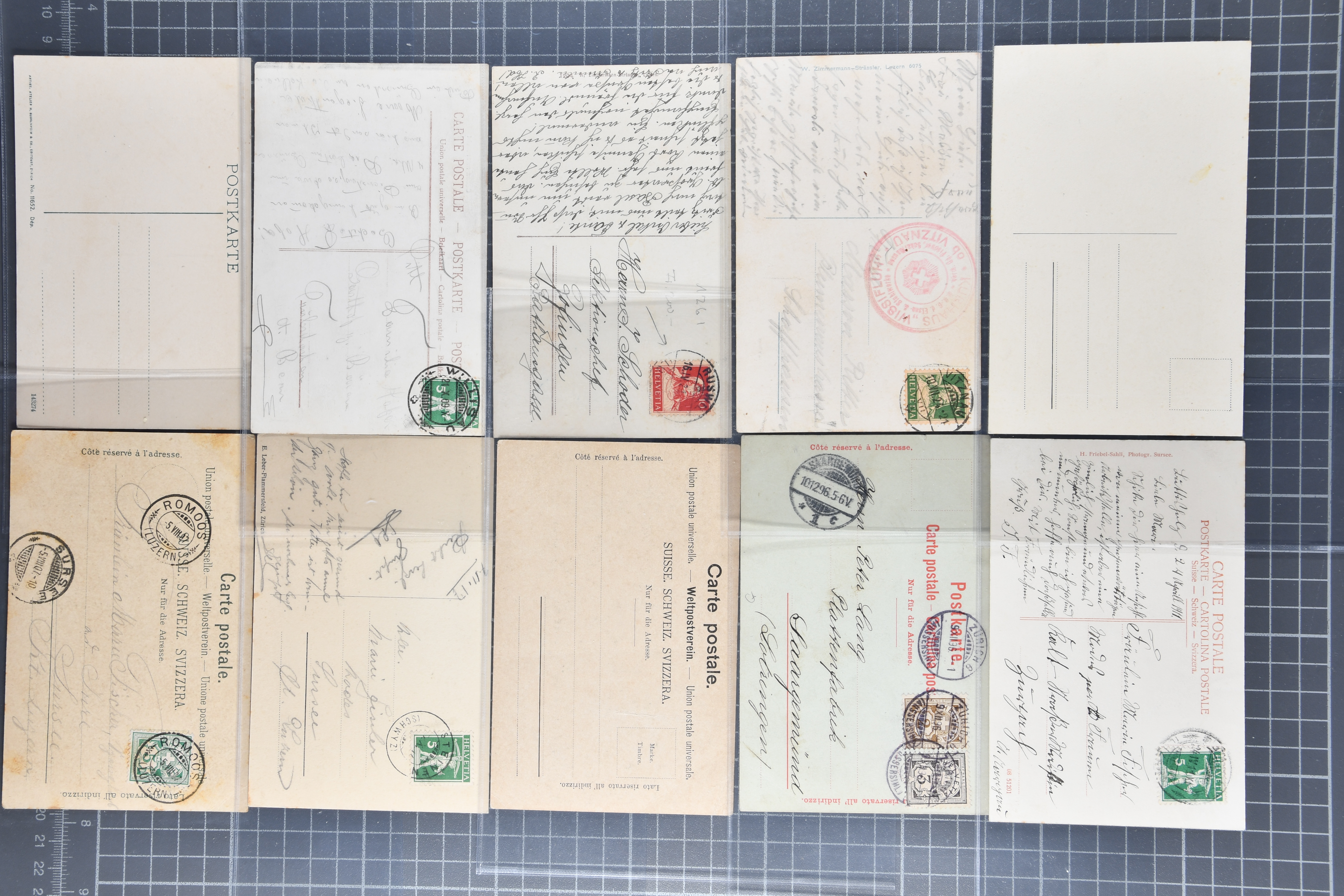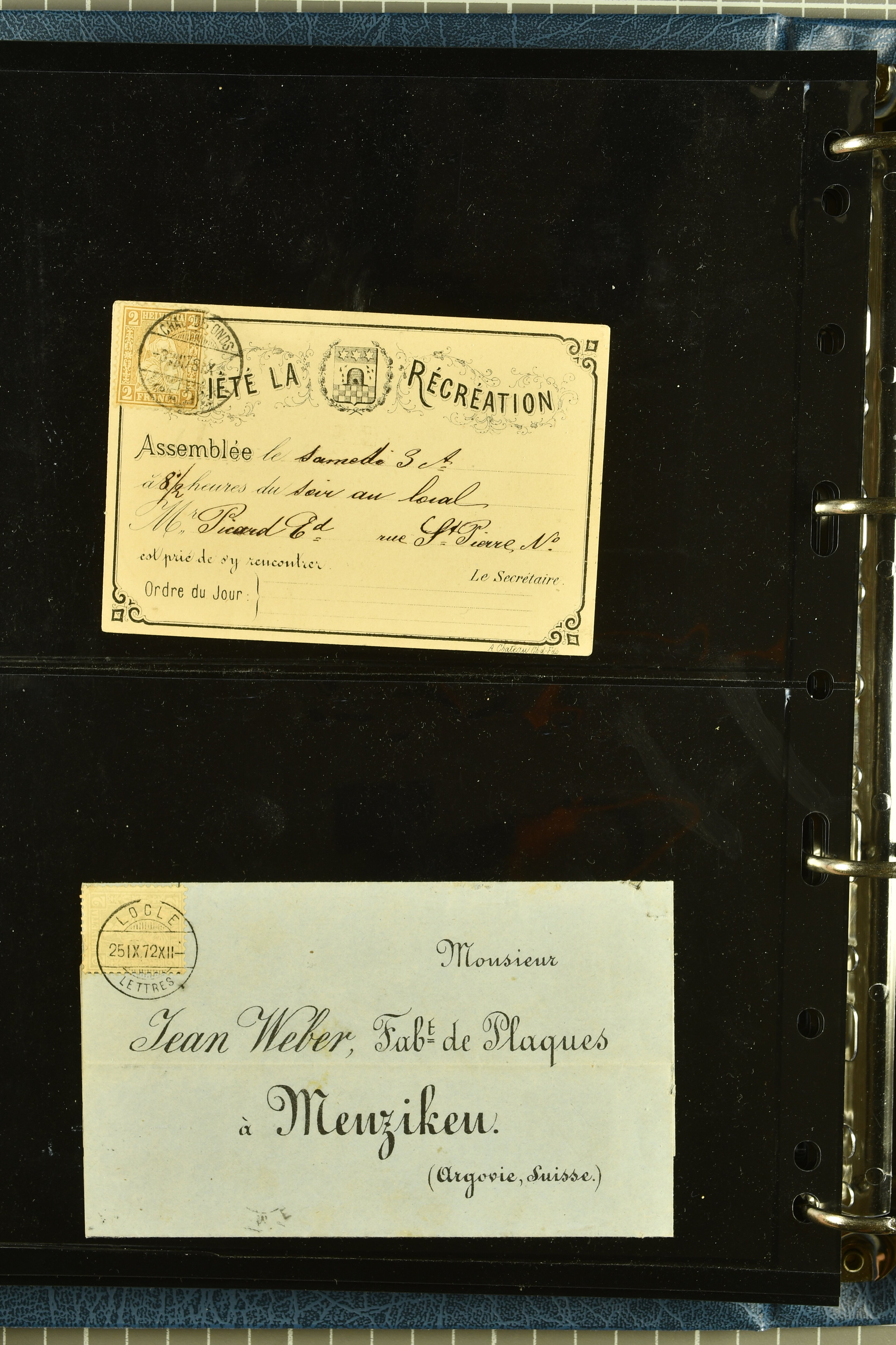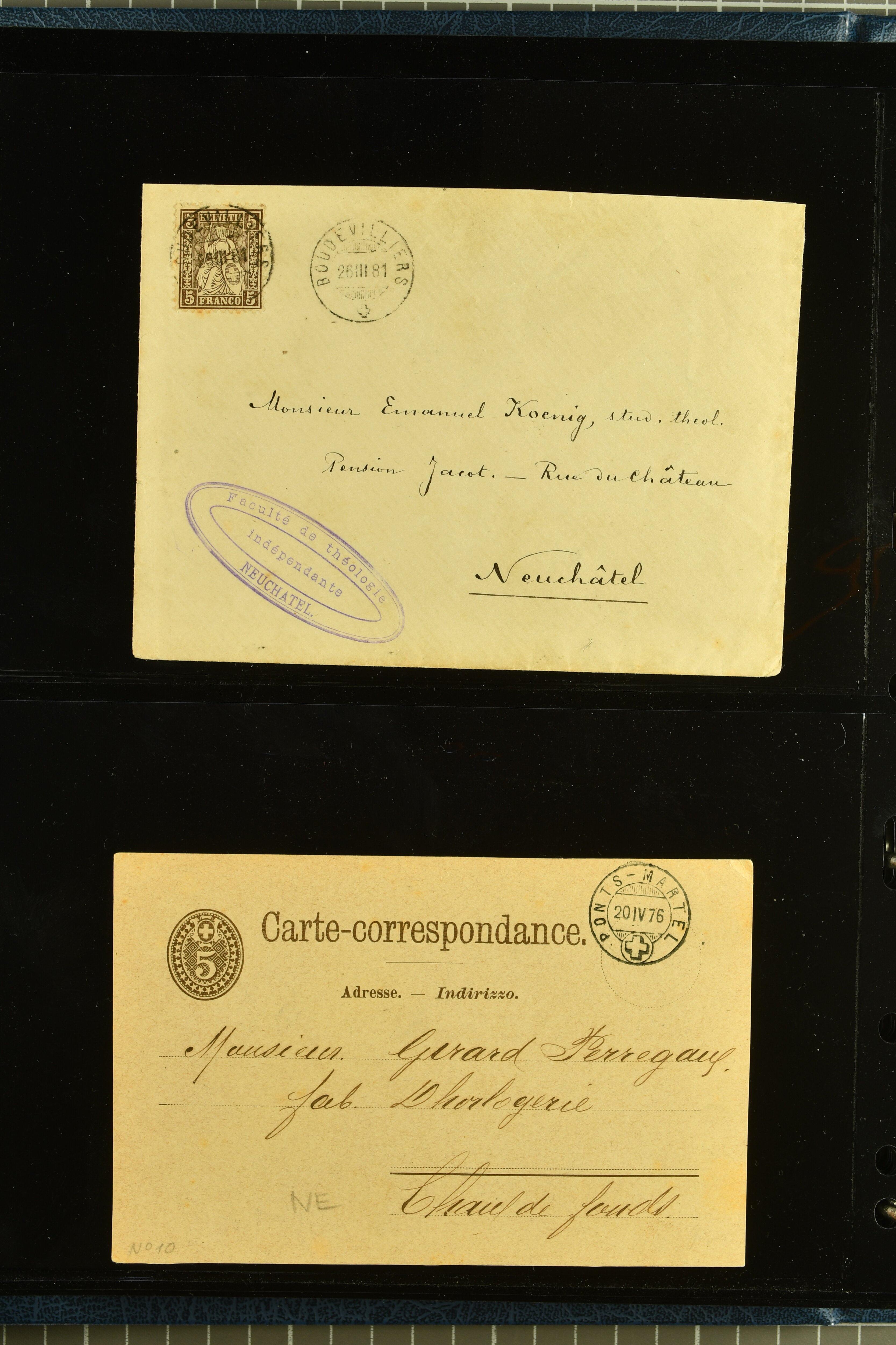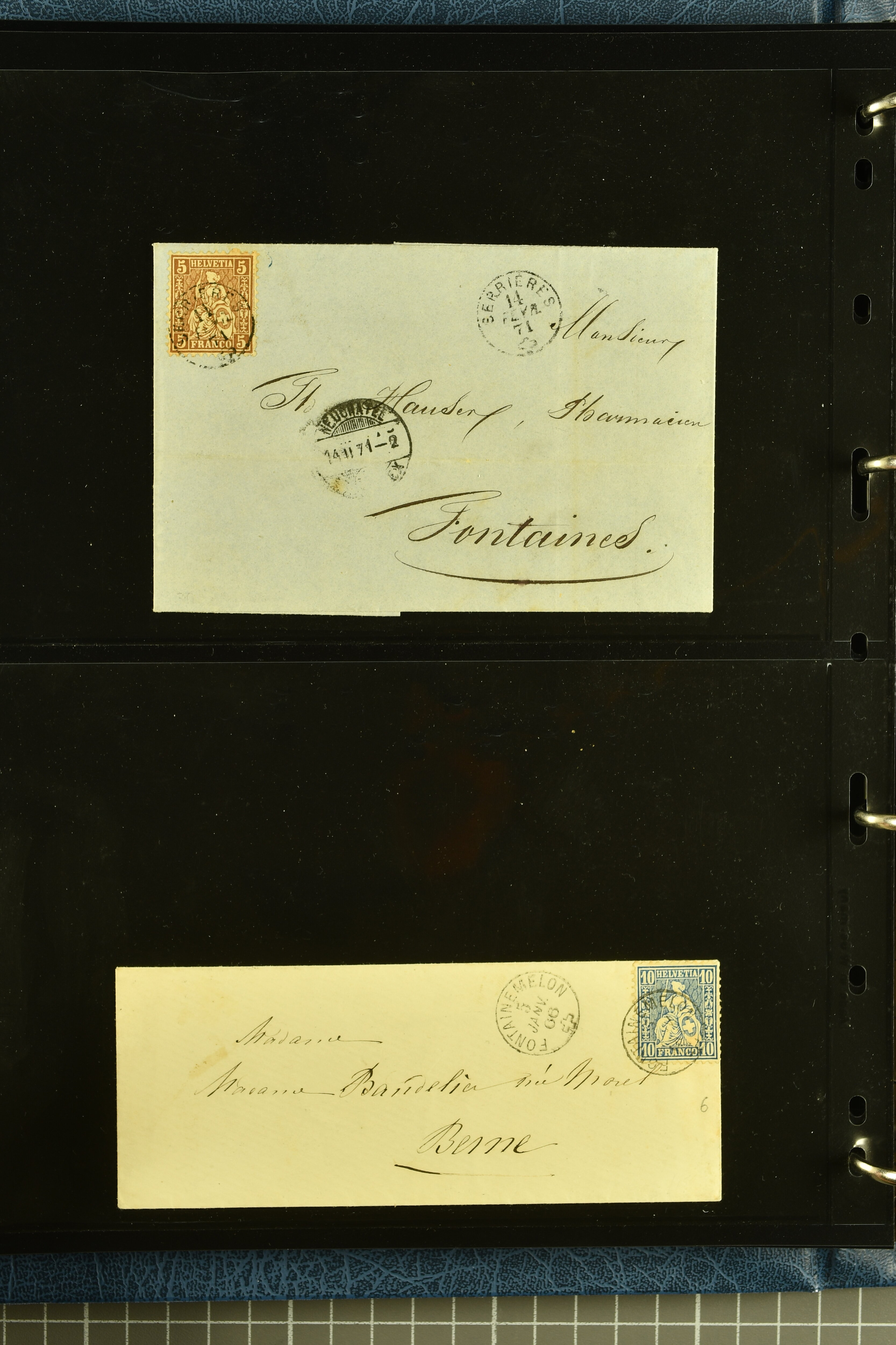 9880 cover imagePostgeschichte Kanton Neuenburg 1854/1940 (ca.): Sammlung 180 Briefe und Karten ab acht Strubelbriefen mit einigen interessanten Entwertungen wie gr. Zierkreisstempel "BOUDRY 28 JANV. 1861", div. Fingerhutstempel oder einem Faltbrief nach Frankreich. Später Sitzende Helvetia und Ganzsachen mit zahlreichen Fingerhutstempeln worunter "MONTMIRAIL 23. NOV. 74" in blau auf Tüblibrief 25 Rp. grün nach Goldberg, Schlesien (Polen) und viele weniger geläufige Stempel, Spätverwendungen der grossen Zierkreisstempel von Serrières, Saint-Sulpice und Auvernier, Stabstp. wie "St. Olivier" auf kleinformatigem Drucksachen-Umschlag mit 2 Rp. grau nach La Chaux-de-Fonds, "CHAMBRELIEN" in blau auf sauberem Briefumschlag mit 10 Rp. rot nach Neuchâtel, verschiedene Güller-Datumstp. in blau aber auch diverse Auslandsfrankaturen der Sitzenden Helvetia oder eine frühe Einladungskarte der "Société la Récréation" in La Chaux-de-Fonds frankiert mit 2 Rp. oliv (1878). Ausserdem Ziffermuster und Stehende Helvetia mit interessanten Auslands-Buntfrankaturen, dekorativen illustrierten Briefen und Karten oder div. Ambulant- und anderen Stabstempeln, UPU 1900 mit 10 Rp.-Ganzsachenpostkarte von La Chaux-de-Fonds nach St. Petersburg, Russland sowie die Ausgaben nach 1907 weiterhin mit interessanten Versandformen wie Expresspostkarten, Stempel wie Stabstp. "CLÉMESIN / NEUCHTEL" auf Postkarte von 1908, Destinationen wie zwei 10 Rp.-Ganzsachenpostkarten nach Chile und Uruguay (1909/14), Vignetten und besseren Frankaturen wie zwei Karten mit Pro Juventute-Vorläufer französisch (SBK JII). Eine interessante Sammlung in meist guter Erhaltung; vier Atteste (Image 1) (Image 2) (Image 3) (Image 4) (Image 5) (Image 6) (Image 7) (Image 8) (Image 9) (Image 10) (Image 11) (Image 12) (Image 13) (Image 14) (Image 15) (Image 16) (Image 17) (Image 18) (Image 19) (Image 20) (Image 21) (Image 22) (Image 23) (Image 24) (Image 25) (Image 26) (Image 27) (Image 28) (Image 29) (Image 30) (Image 31) (Image 32) (Image 33) (Image 34) (Image 35) (Image 36) (Image 37) (Image 38) (Image 39) (Image 40) (Image 41) (Image 42) (Image 43) (Image 44) (Image 45) (Image 46) (Image 47) (Image 48) (Image 49) (Image 50)