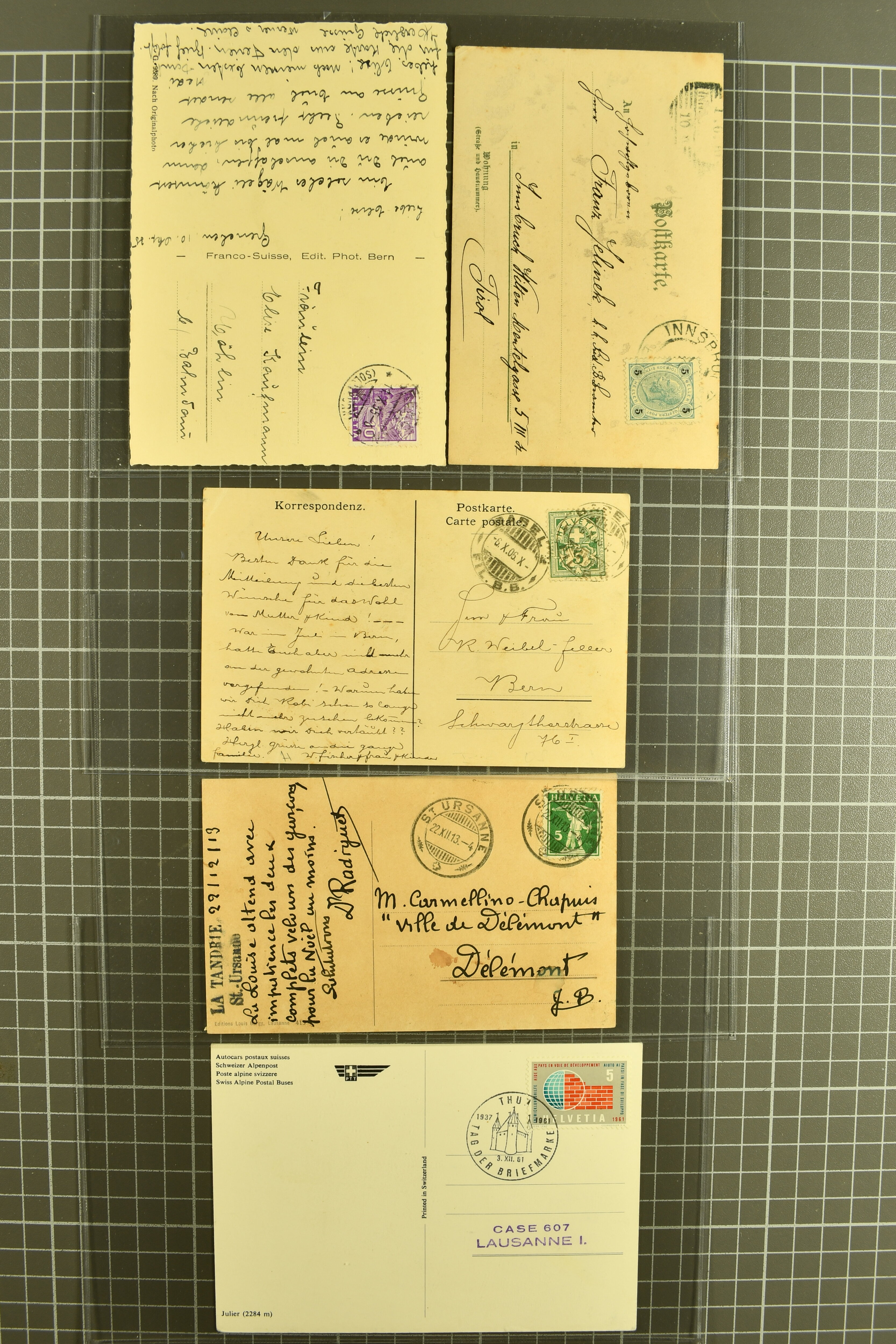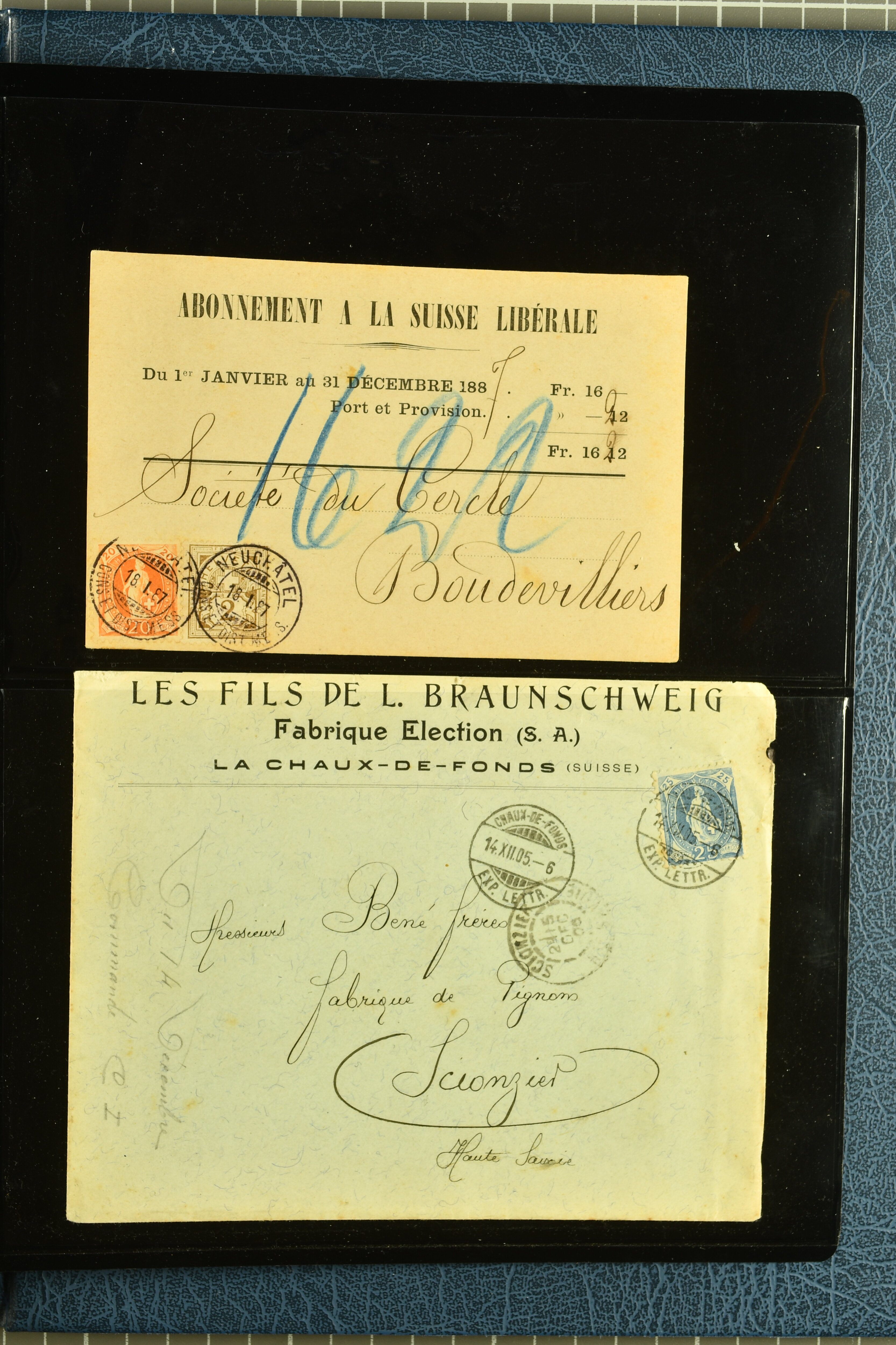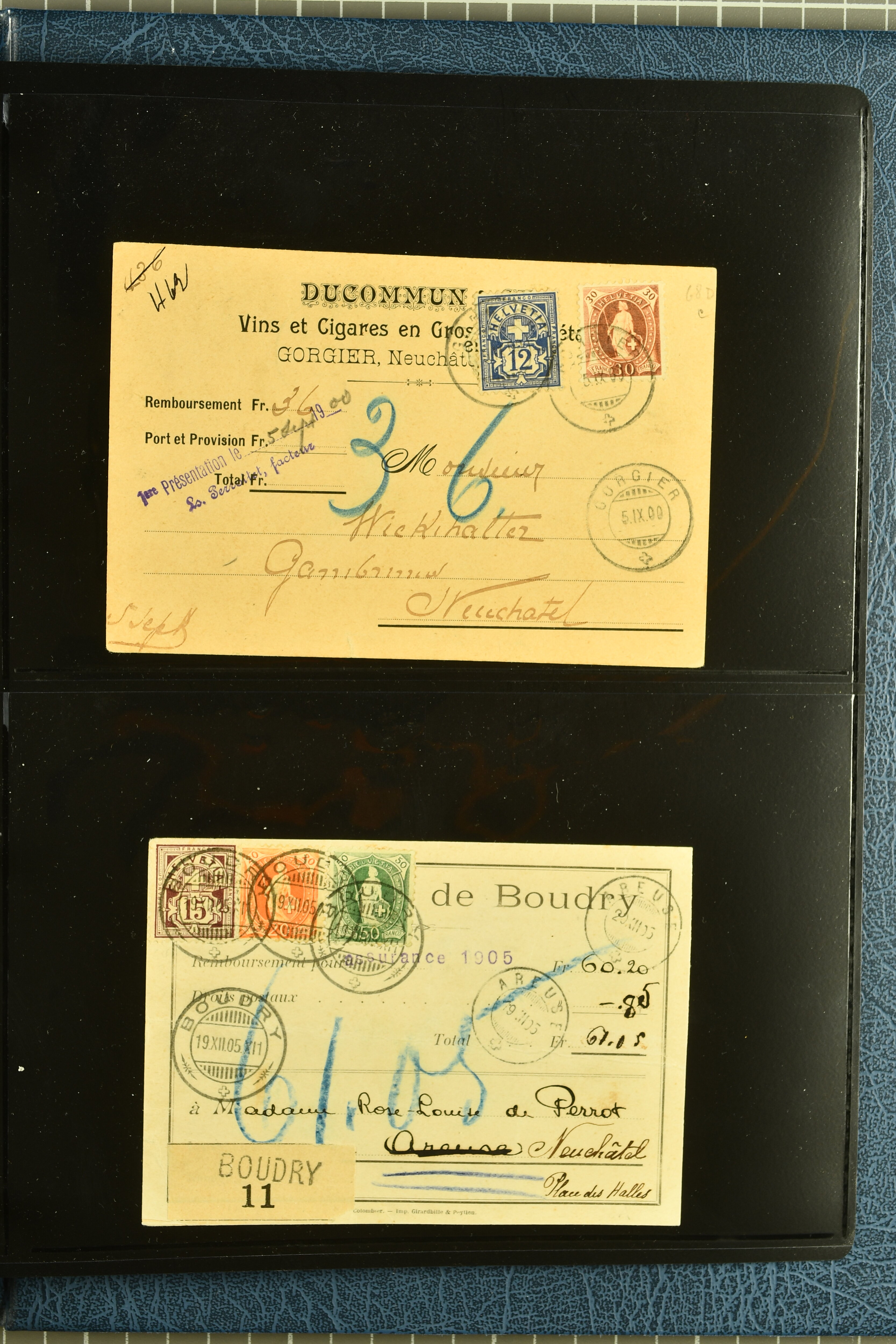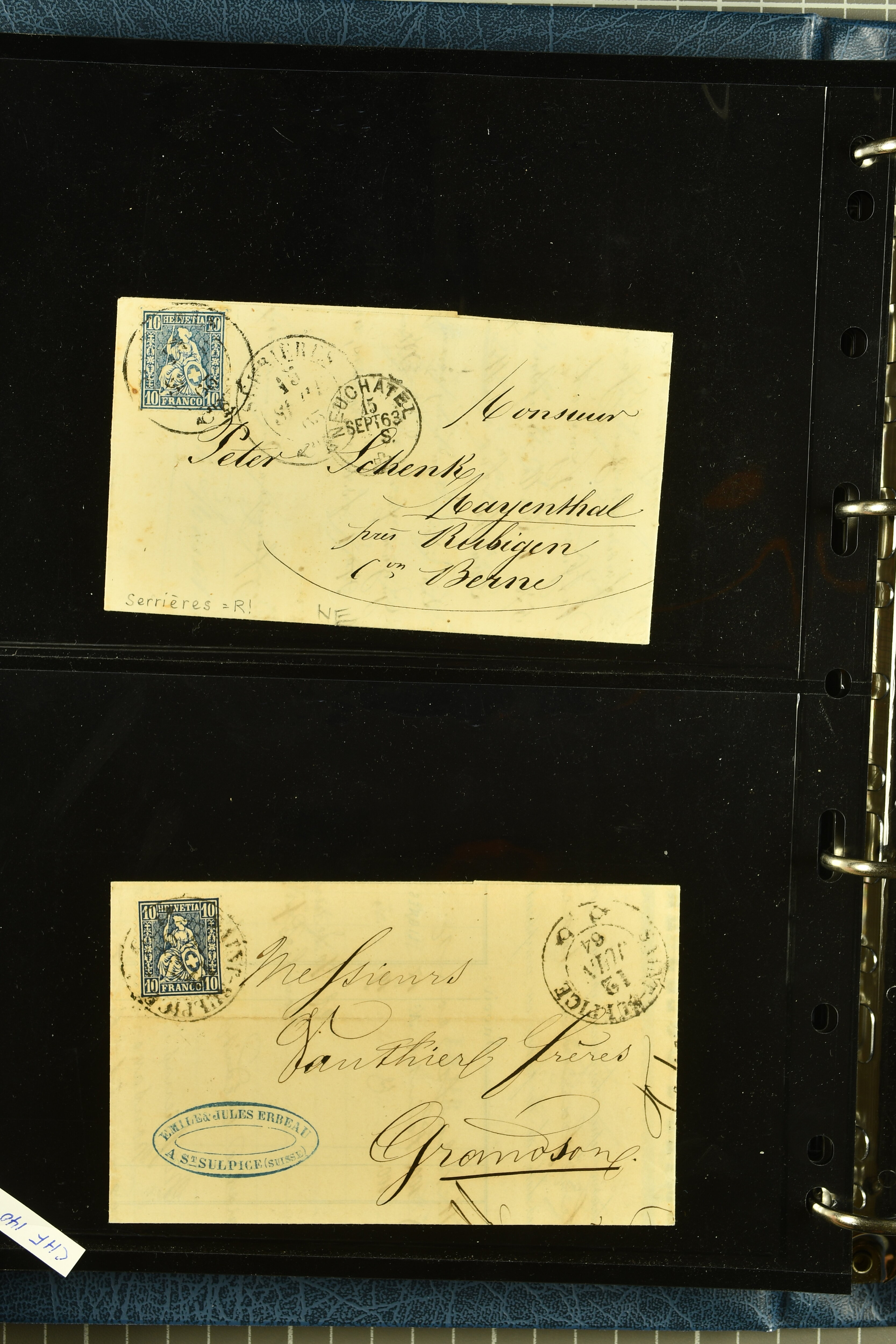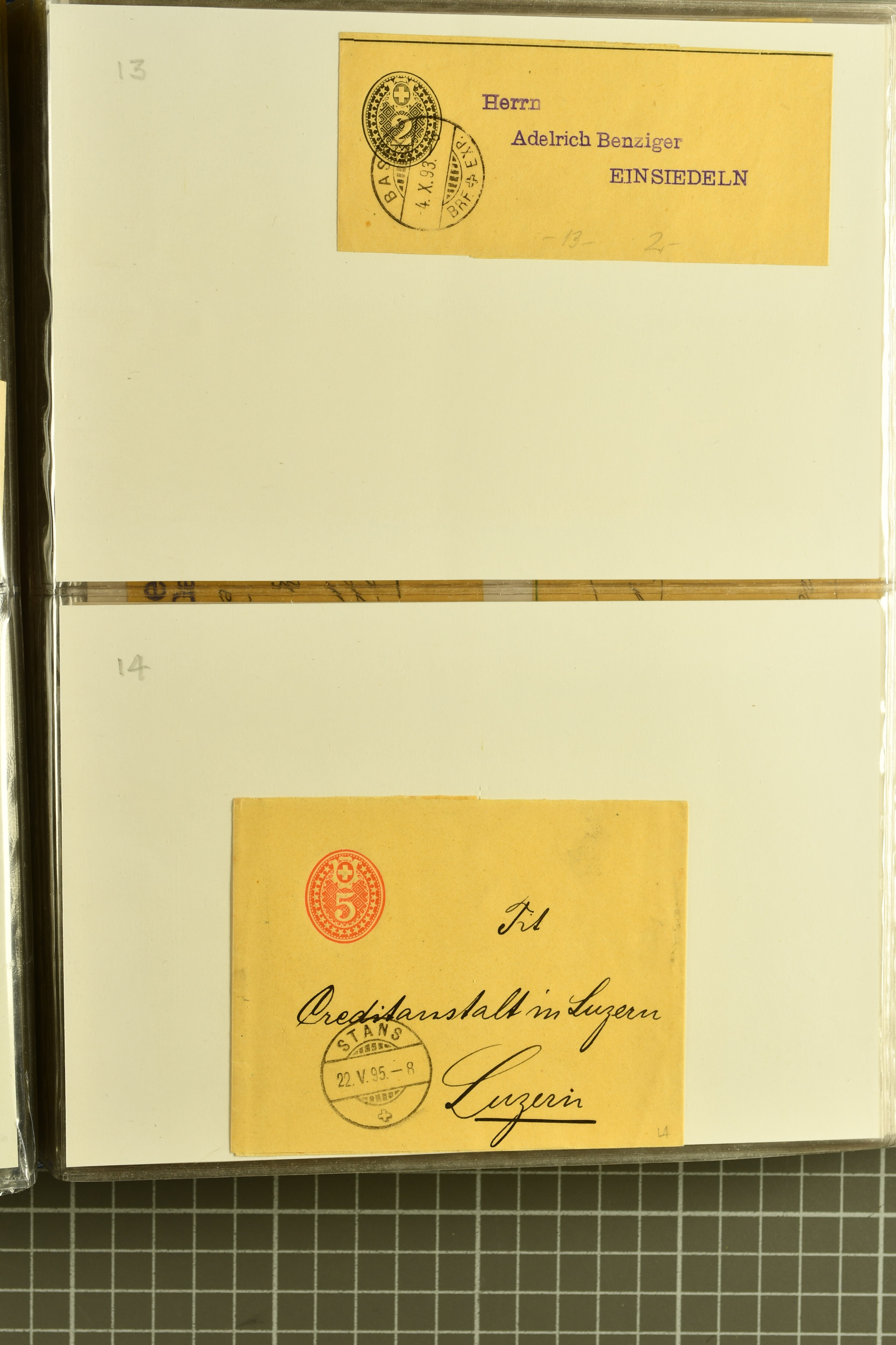 9880 cover imagePostgeschichte Kanton Neuenburg 1854/1940 (ca.): Sammlung 180 Briefe und Karten ab acht Strubelbriefen mit einigen interessanten Entwertungen wie gr. Zierkreisstempel "BOUDRY 28 JANV. 1861", div. Fingerhutstempel oder einem Faltbrief nach Frankreich. Später Sitzende Helvetia und Ganzsachen mit zahlreichen Fingerhutstempeln worunter "MONTMIRAIL 23. NOV. 74" in blau auf Tüblibrief 25 Rp. grün nach Goldberg, Schlesien (Polen) und viele weniger geläufige Stempel, Spätverwendungen der grossen Zierkreisstempel von Serrières, Saint-Sulpice und Auvernier, Stabstp. wie "St. Olivier" auf kleinformatigem Drucksachen-Umschlag mit 2 Rp. grau nach La Chaux-de-Fonds, "CHAMBRELIEN" in blau auf sauberem Briefumschlag mit 10 Rp. rot nach Neuchâtel, verschiedene Güller-Datumstp. in blau aber auch diverse Auslandsfrankaturen der Sitzenden Helvetia oder eine frühe Einladungskarte der "Société la Récréation" in La Chaux-de-Fonds frankiert mit 2 Rp. oliv (1878). Ausserdem Ziffermuster und Stehende Helvetia mit interessanten Auslands-Buntfrankaturen, dekorativen illustrierten Briefen und Karten oder div. Ambulant- und anderen Stabstempeln, UPU 1900 mit 10 Rp.-Ganzsachenpostkarte von La Chaux-de-Fonds nach St. Petersburg, Russland sowie die Ausgaben nach 1907 weiterhin mit interessanten Versandformen wie Expresspostkarten, Stempel wie Stabstp. "CLÉMESIN / NEUCHTEL" auf Postkarte von 1908, Destinationen wie zwei 10 Rp.-Ganzsachenpostkarten nach Chile und Uruguay (1909/14), Vignetten und besseren Frankaturen wie zwei Karten mit Pro Juventute-Vorläufer französisch (SBK JII). Eine interessante Sammlung in meist guter Erhaltung; vier Atteste (Image 1) (Image 2) (Image 3) (Image 4) (Image 5) (Image 6) (Image 7) (Image 8) (Image 9) (Image 10) (Image 11) (Image 12) (Image 13) (Image 14) (Image 15) (Image 16) (Image 17) (Image 18) (Image 19) (Image 20) (Image 21) (Image 22) (Image 23) (Image 24) (Image 25) (Image 26) (Image 27) (Image 28) (Image 29) (Image 30) (Image 31) (Image 32) (Image 33) (Image 34) (Image 35) (Image 36) (Image 37) (Image 38) (Image 39) (Image 40) (Image 41) (Image 42) (Image 43) (Image 44) (Image 45) (Image 46) (Image 47) (Image 48) (Image 49) (Image 50)