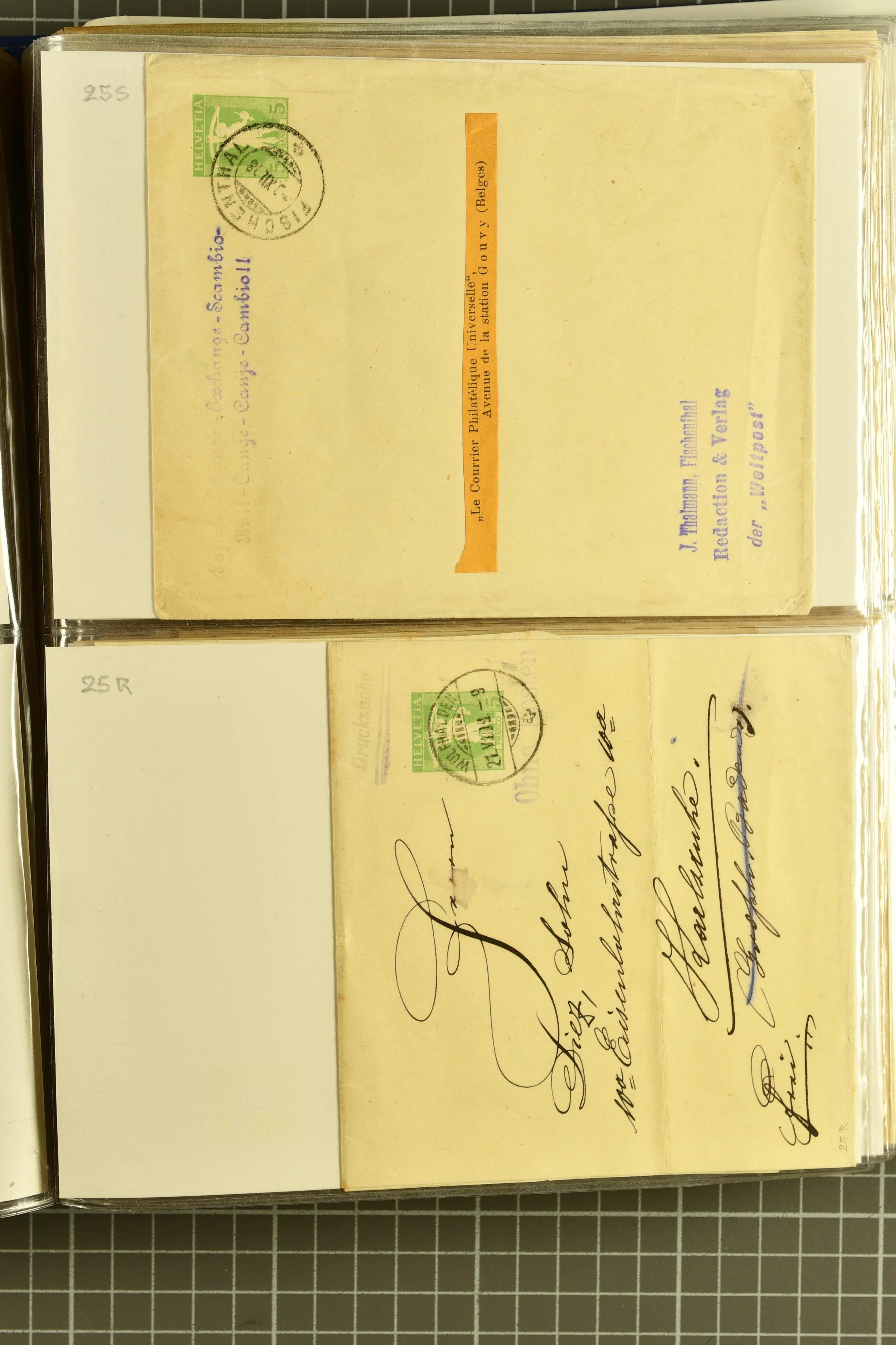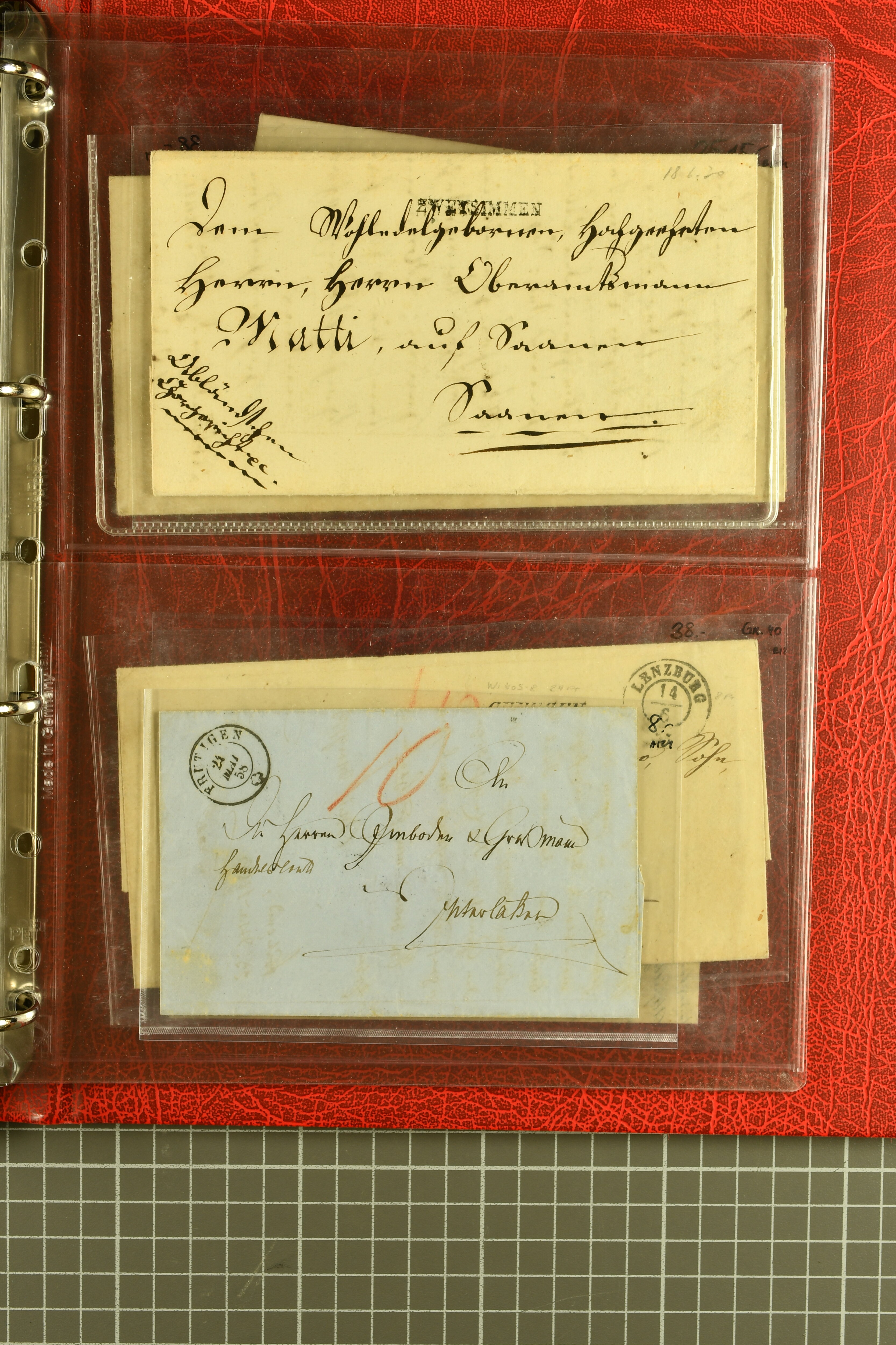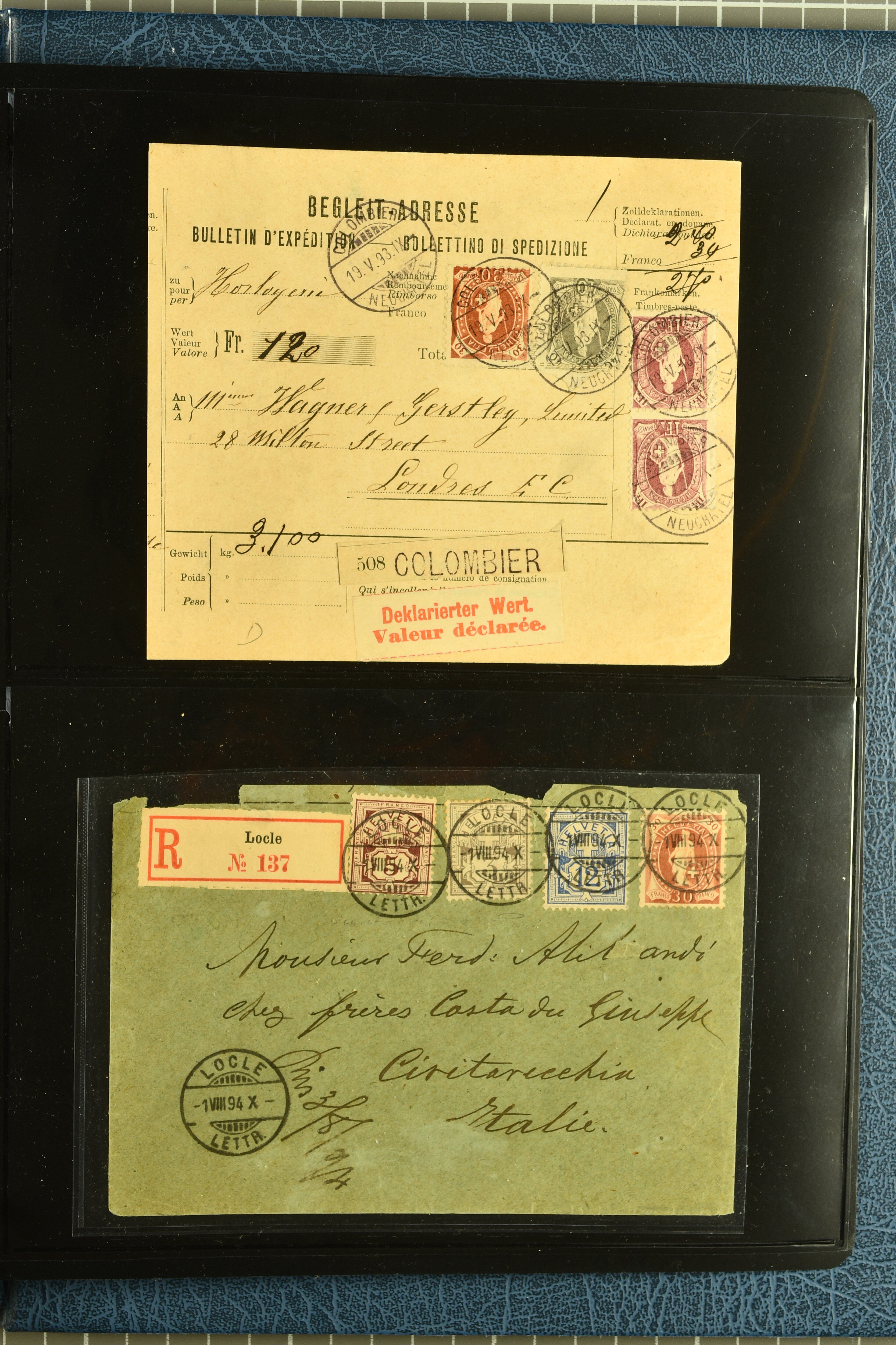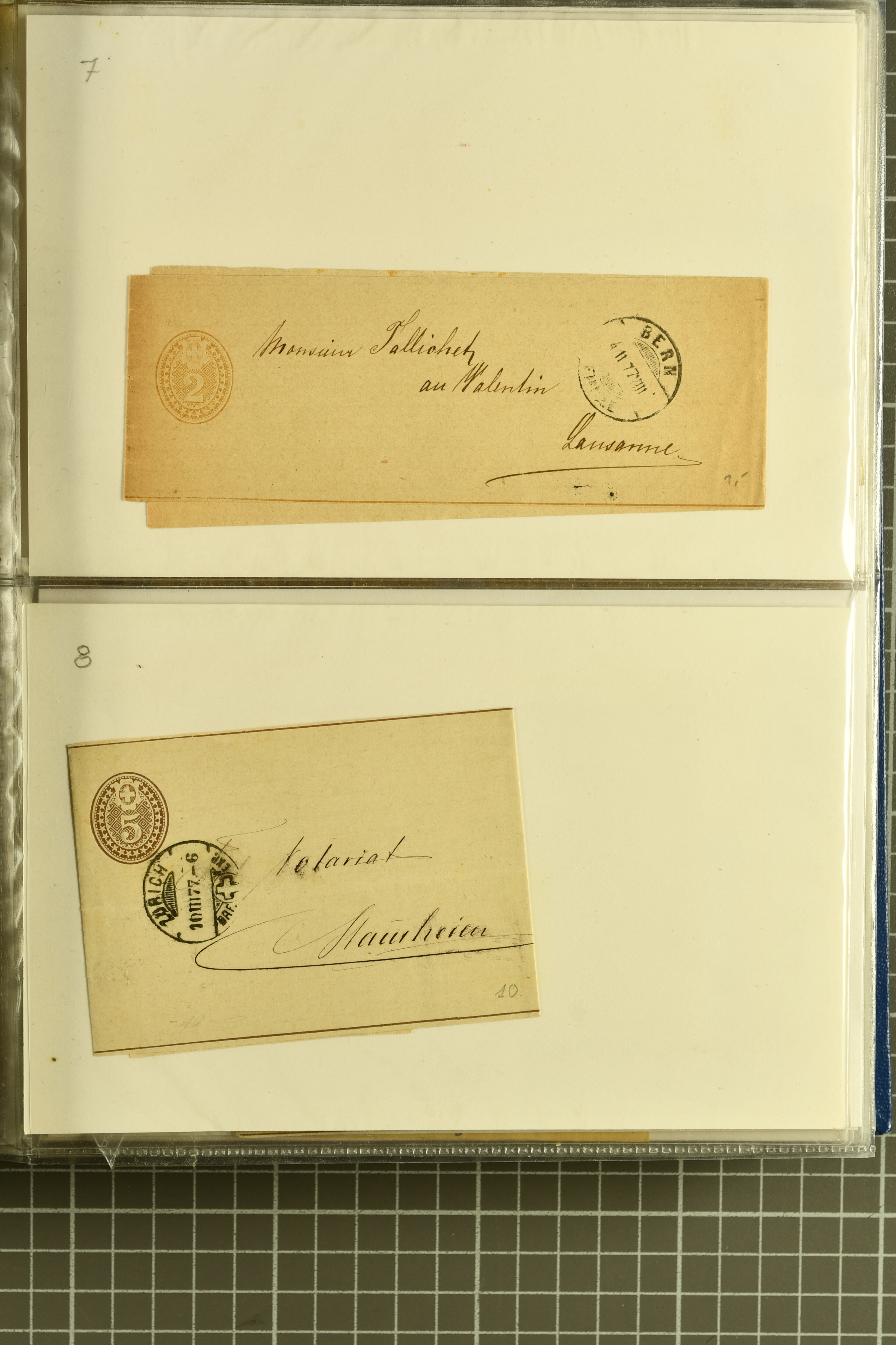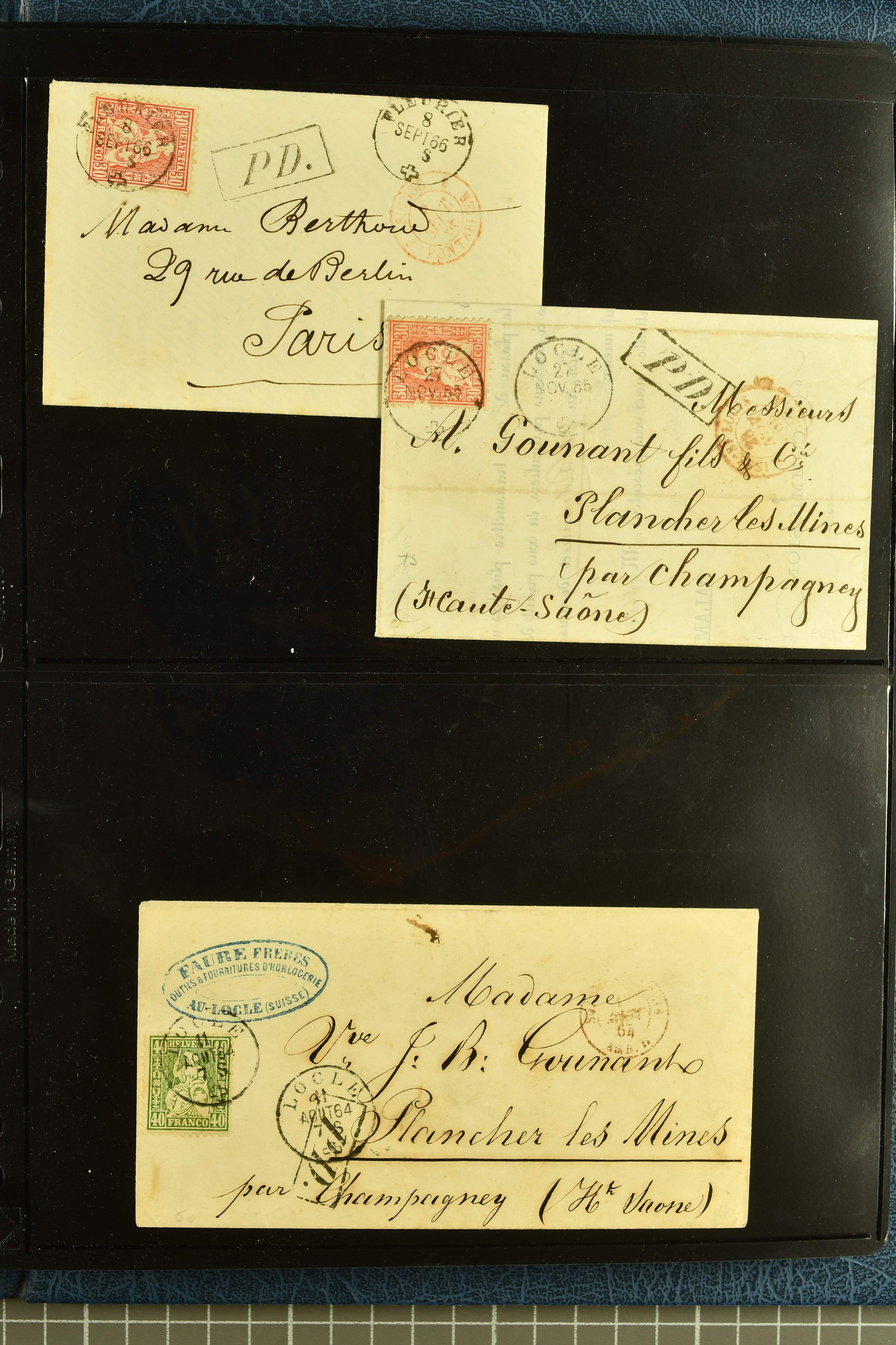 9880 cover imagePostgeschichte Kanton Neuenburg 1854/1940 (ca.): Sammlung 180 Briefe und Karten ab acht Strubelbriefen mit einigen interessanten Entwertungen wie gr. Zierkreisstempel "BOUDRY 28 JANV. 1861", div. Fingerhutstempel oder einem Faltbrief nach Frankreich. Später Sitzende Helvetia und Ganzsachen mit zahlreichen Fingerhutstempeln worunter "MONTMIRAIL 23. NOV. 74" in blau auf Tüblibrief 25 Rp. grün nach Goldberg, Schlesien (Polen) und viele weniger geläufige Stempel, Spätverwendungen der grossen Zierkreisstempel von Serrières, Saint-Sulpice und Auvernier, Stabstp. wie "St. Olivier" auf kleinformatigem Drucksachen-Umschlag mit 2 Rp. grau nach La Chaux-de-Fonds, "CHAMBRELIEN" in blau auf sauberem Briefumschlag mit 10 Rp. rot nach Neuchâtel, verschiedene Güller-Datumstp. in blau aber auch diverse Auslandsfrankaturen der Sitzenden Helvetia oder eine frühe Einladungskarte der "Société la Récréation" in La Chaux-de-Fonds frankiert mit 2 Rp. oliv (1878). Ausserdem Ziffermuster und Stehende Helvetia mit interessanten Auslands-Buntfrankaturen, dekorativen illustrierten Briefen und Karten oder div. Ambulant- und anderen Stabstempeln, UPU 1900 mit 10 Rp.-Ganzsachenpostkarte von La Chaux-de-Fonds nach St. Petersburg, Russland sowie die Ausgaben nach 1907 weiterhin mit interessanten Versandformen wie Expresspostkarten, Stempel wie Stabstp. "CLÉMESIN / NEUCHTEL" auf Postkarte von 1908, Destinationen wie zwei 10 Rp.-Ganzsachenpostkarten nach Chile und Uruguay (1909/14), Vignetten und besseren Frankaturen wie zwei Karten mit Pro Juventute-Vorläufer französisch (SBK JII). Eine interessante Sammlung in meist guter Erhaltung; vier Atteste (Image 1) (Image 2) (Image 3) (Image 4) (Image 5) (Image 6) (Image 7) (Image 8) (Image 9) (Image 10) (Image 11) (Image 12) (Image 13) (Image 14) (Image 15) (Image 16) (Image 17) (Image 18) (Image 19) (Image 20) (Image 21) (Image 22) (Image 23) (Image 24) (Image 25) (Image 26) (Image 27) (Image 28) (Image 29) (Image 30) (Image 31) (Image 32) (Image 33) (Image 34) (Image 35) (Image 36) (Image 37) (Image 38) (Image 39) (Image 40) (Image 41) (Image 42) (Image 43) (Image 44) (Image 45) (Image 46) (Image 47) (Image 48) (Image 49) (Image 50)