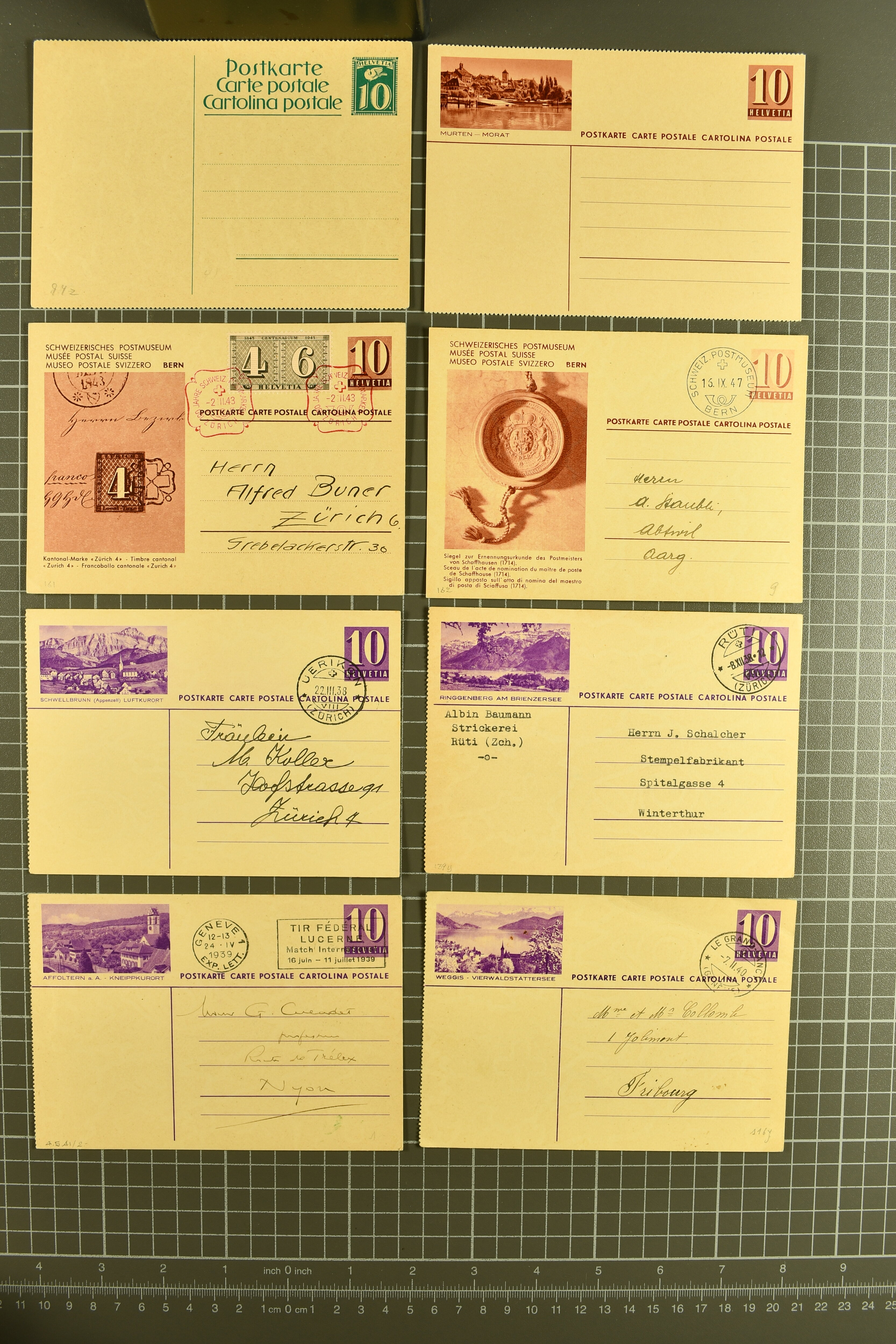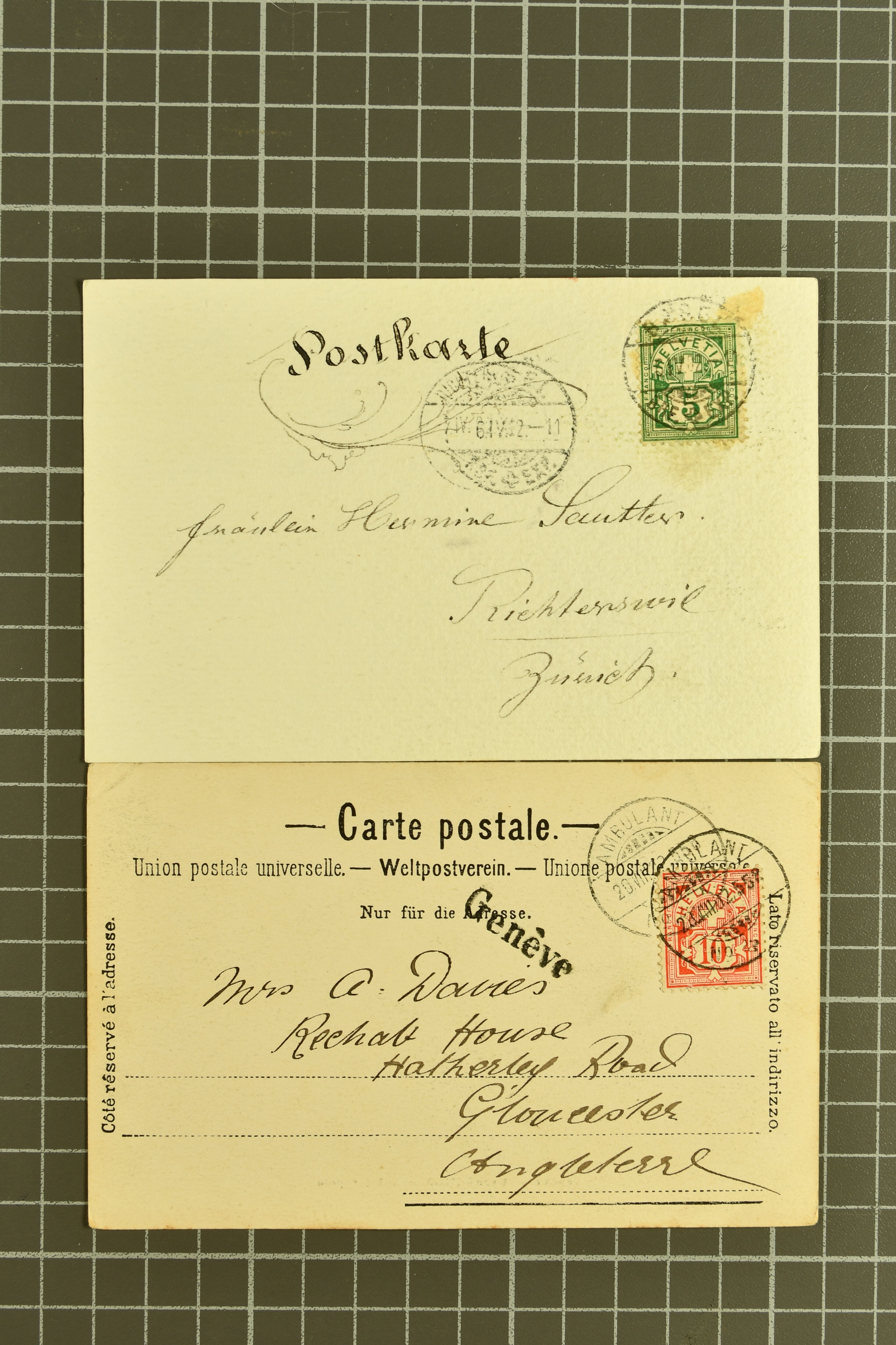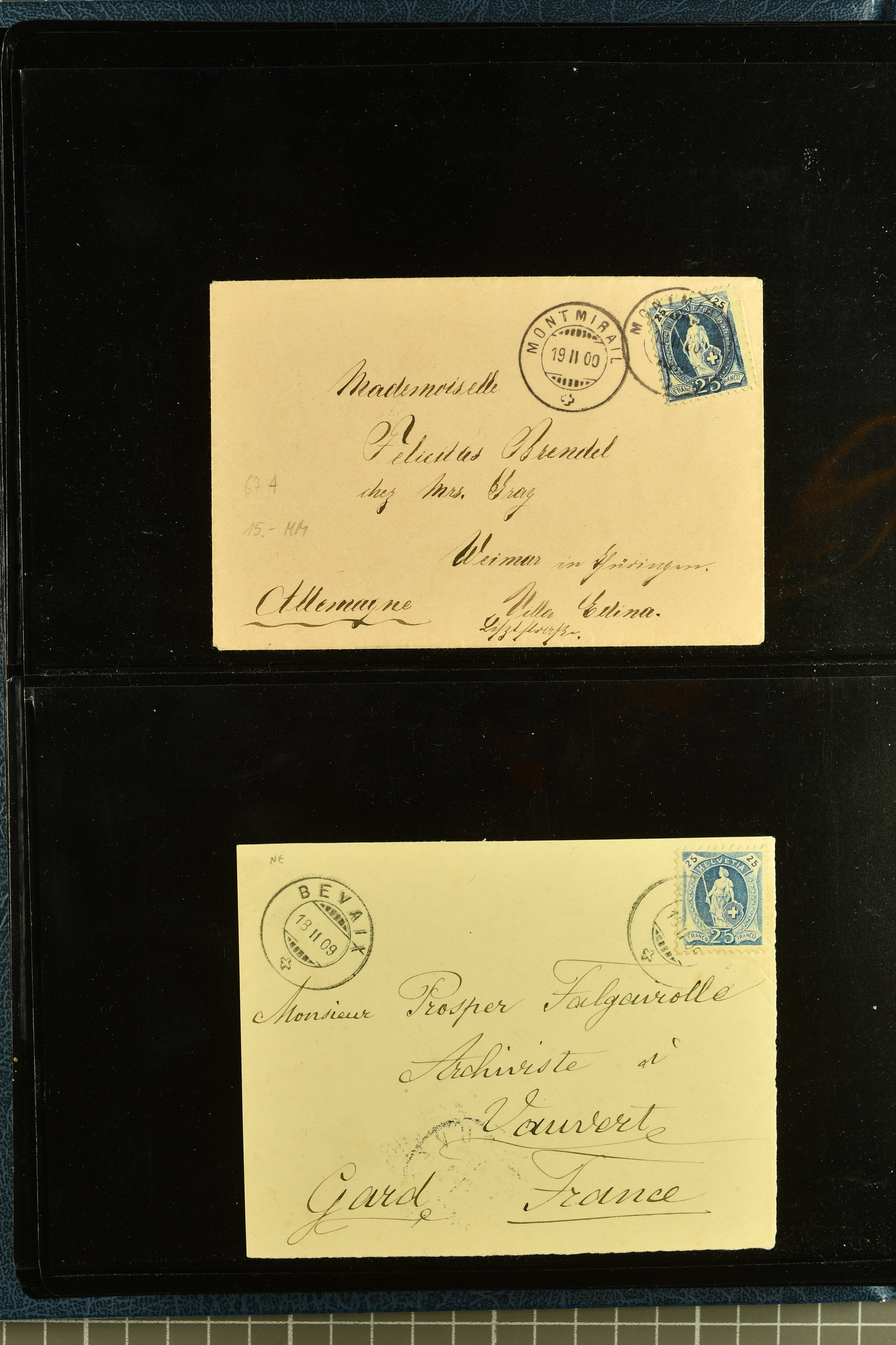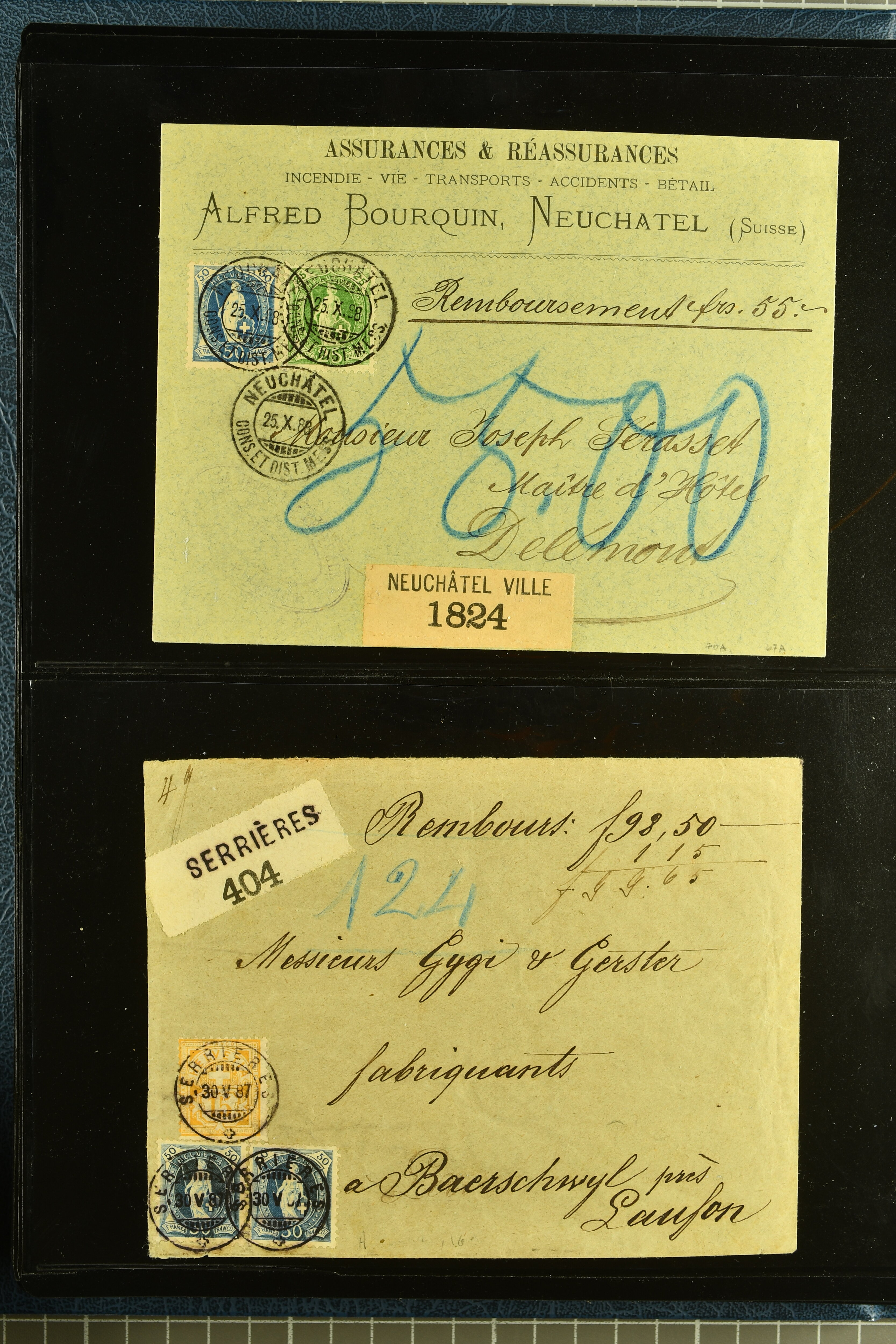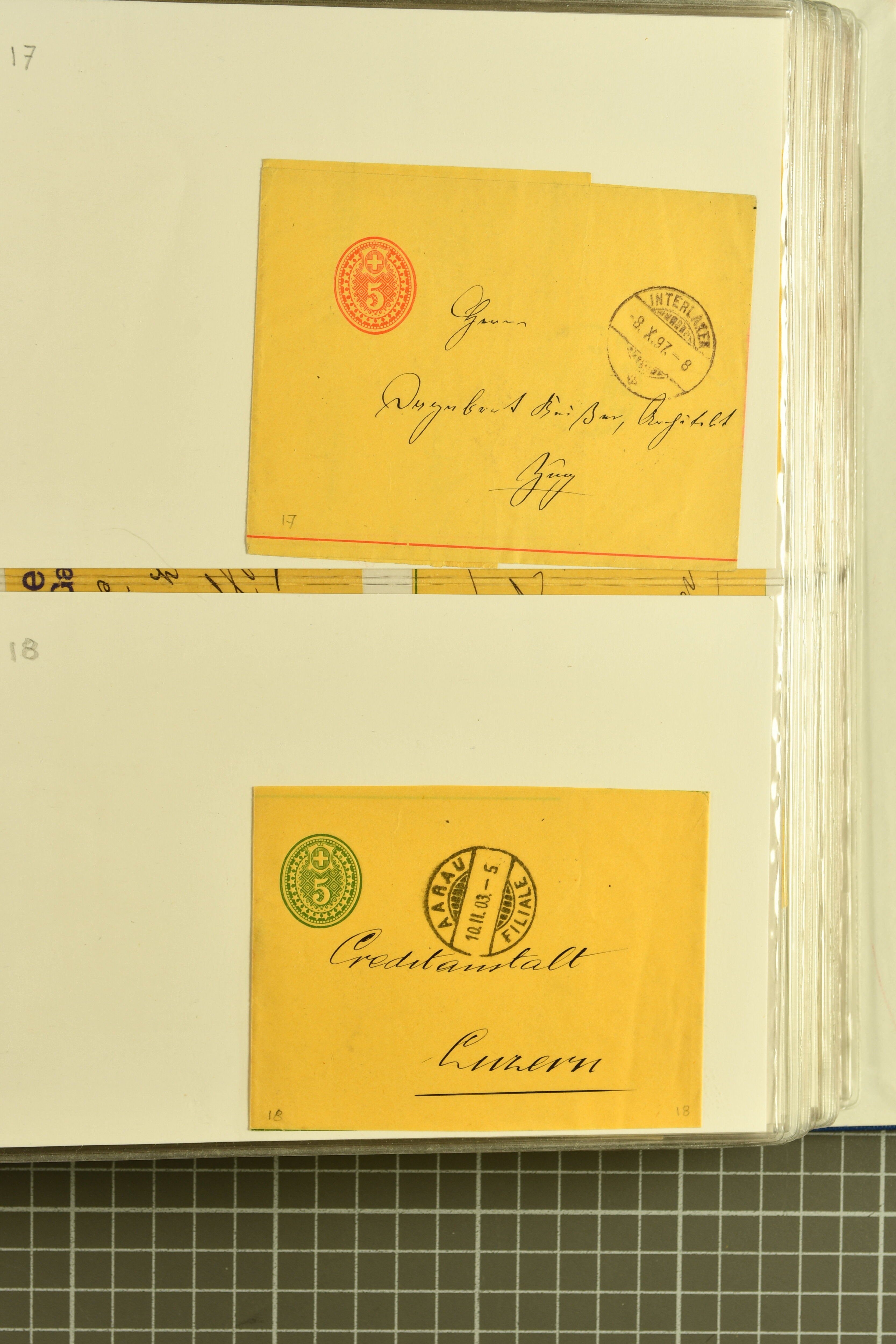 9880 cover imagePostgeschichte Kanton Neuenburg 1854/1940 (ca.): Sammlung 180 Briefe und Karten ab acht Strubelbriefen mit einigen interessanten Entwertungen wie gr. Zierkreisstempel "BOUDRY 28 JANV. 1861", div. Fingerhutstempel oder einem Faltbrief nach Frankreich. Später Sitzende Helvetia und Ganzsachen mit zahlreichen Fingerhutstempeln worunter "MONTMIRAIL 23. NOV. 74" in blau auf Tüblibrief 25 Rp. grün nach Goldberg, Schlesien (Polen) und viele weniger geläufige Stempel, Spätverwendungen der grossen Zierkreisstempel von Serrières, Saint-Sulpice und Auvernier, Stabstp. wie "St. Olivier" auf kleinformatigem Drucksachen-Umschlag mit 2 Rp. grau nach La Chaux-de-Fonds, "CHAMBRELIEN" in blau auf sauberem Briefumschlag mit 10 Rp. rot nach Neuchâtel, verschiedene Güller-Datumstp. in blau aber auch diverse Auslandsfrankaturen der Sitzenden Helvetia oder eine frühe Einladungskarte der "Société la Récréation" in La Chaux-de-Fonds frankiert mit 2 Rp. oliv (1878). Ausserdem Ziffermuster und Stehende Helvetia mit interessanten Auslands-Buntfrankaturen, dekorativen illustrierten Briefen und Karten oder div. Ambulant- und anderen Stabstempeln, UPU 1900 mit 10 Rp.-Ganzsachenpostkarte von La Chaux-de-Fonds nach St. Petersburg, Russland sowie die Ausgaben nach 1907 weiterhin mit interessanten Versandformen wie Expresspostkarten, Stempel wie Stabstp. "CLÉMESIN / NEUCHTEL" auf Postkarte von 1908, Destinationen wie zwei 10 Rp.-Ganzsachenpostkarten nach Chile und Uruguay (1909/14), Vignetten und besseren Frankaturen wie zwei Karten mit Pro Juventute-Vorläufer französisch (SBK JII). Eine interessante Sammlung in meist guter Erhaltung; vier Atteste (Image 1) (Image 2) (Image 3) (Image 4) (Image 5) (Image 6) (Image 7) (Image 8) (Image 9) (Image 10) (Image 11) (Image 12) (Image 13) (Image 14) (Image 15) (Image 16) (Image 17) (Image 18) (Image 19) (Image 20) (Image 21) (Image 22) (Image 23) (Image 24) (Image 25) (Image 26) (Image 27) (Image 28) (Image 29) (Image 30) (Image 31) (Image 32) (Image 33) (Image 34) (Image 35) (Image 36) (Image 37) (Image 38) (Image 39) (Image 40) (Image 41) (Image 42) (Image 43) (Image 44) (Image 45) (Image 46) (Image 47) (Image 48) (Image 49) (Image 50)