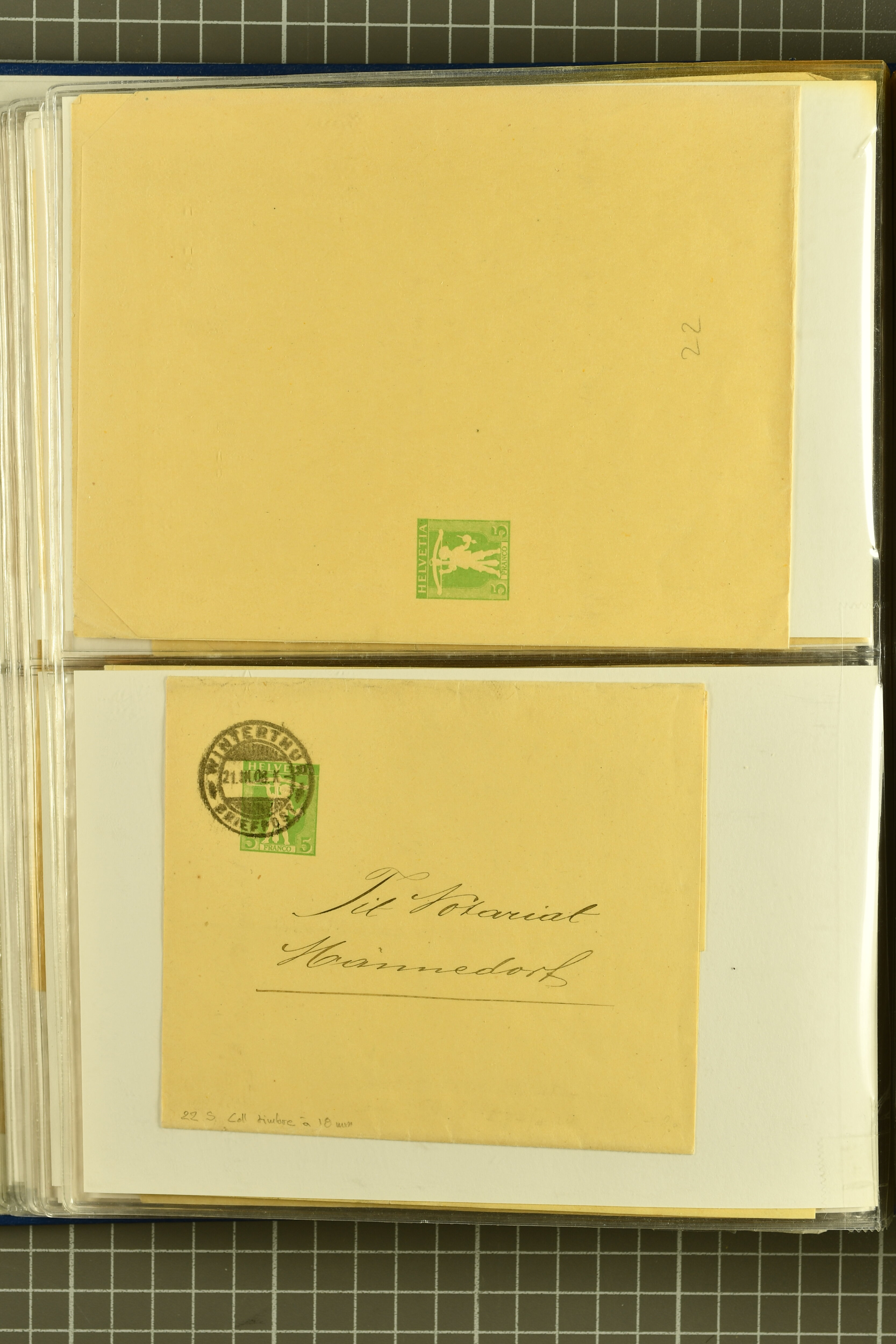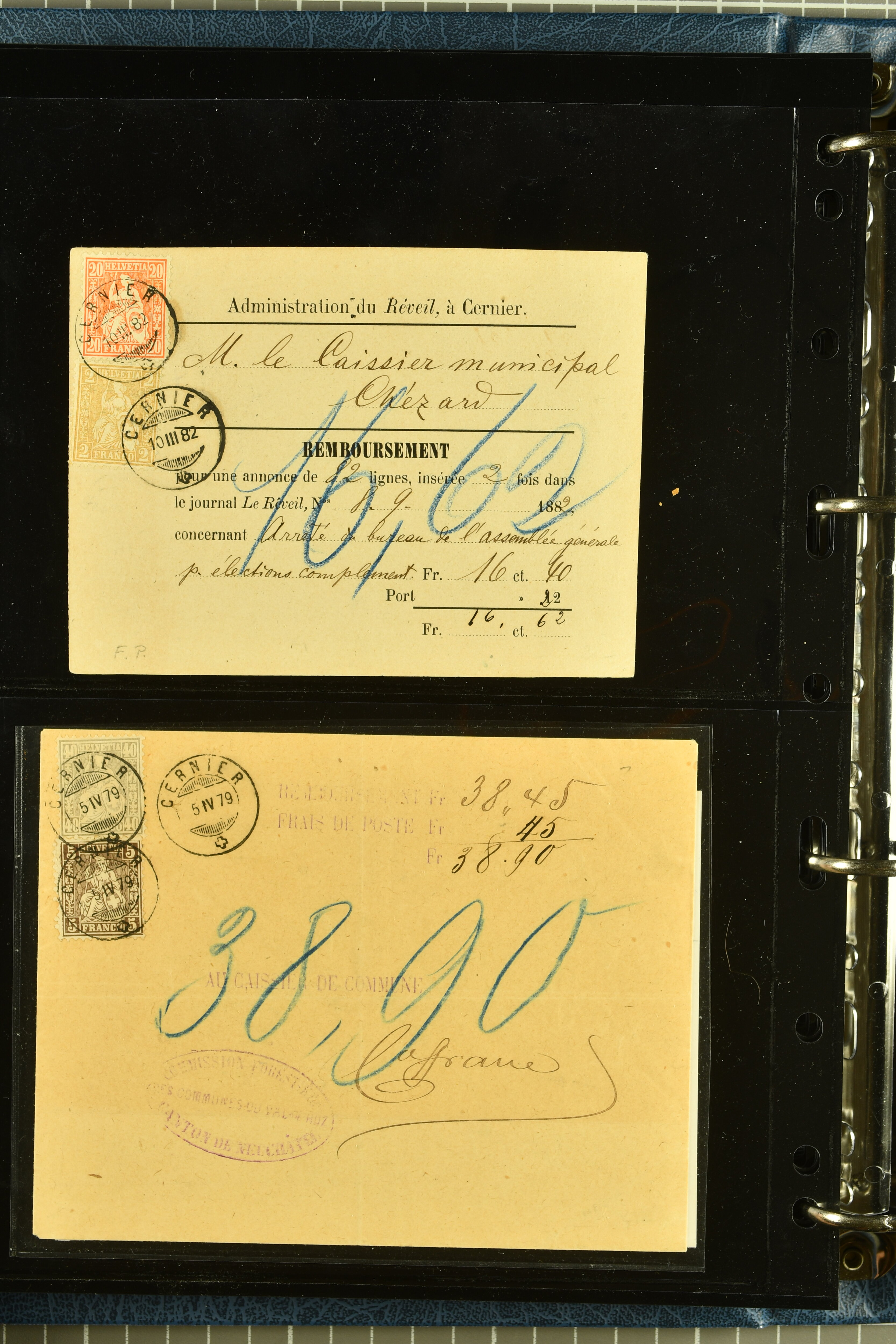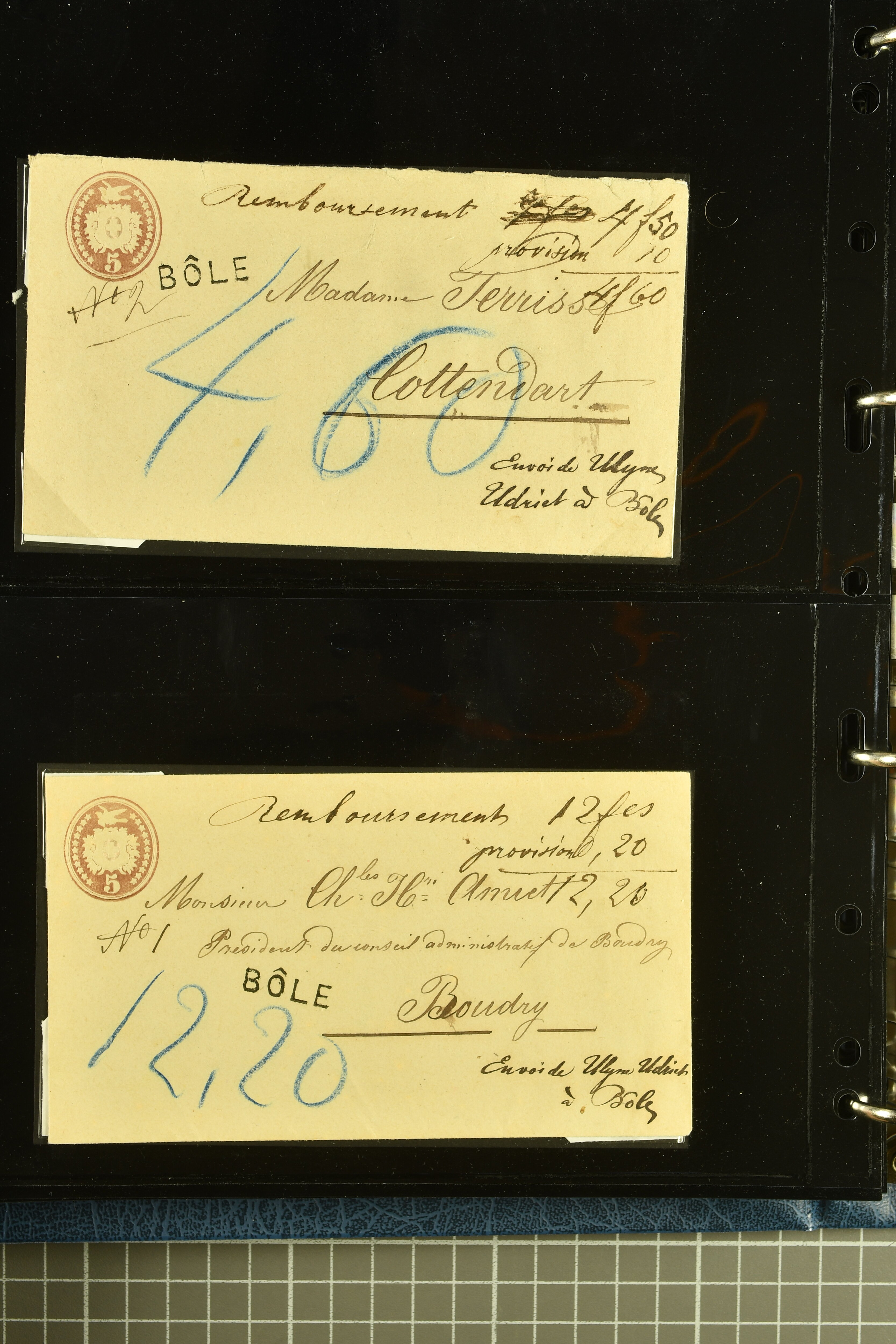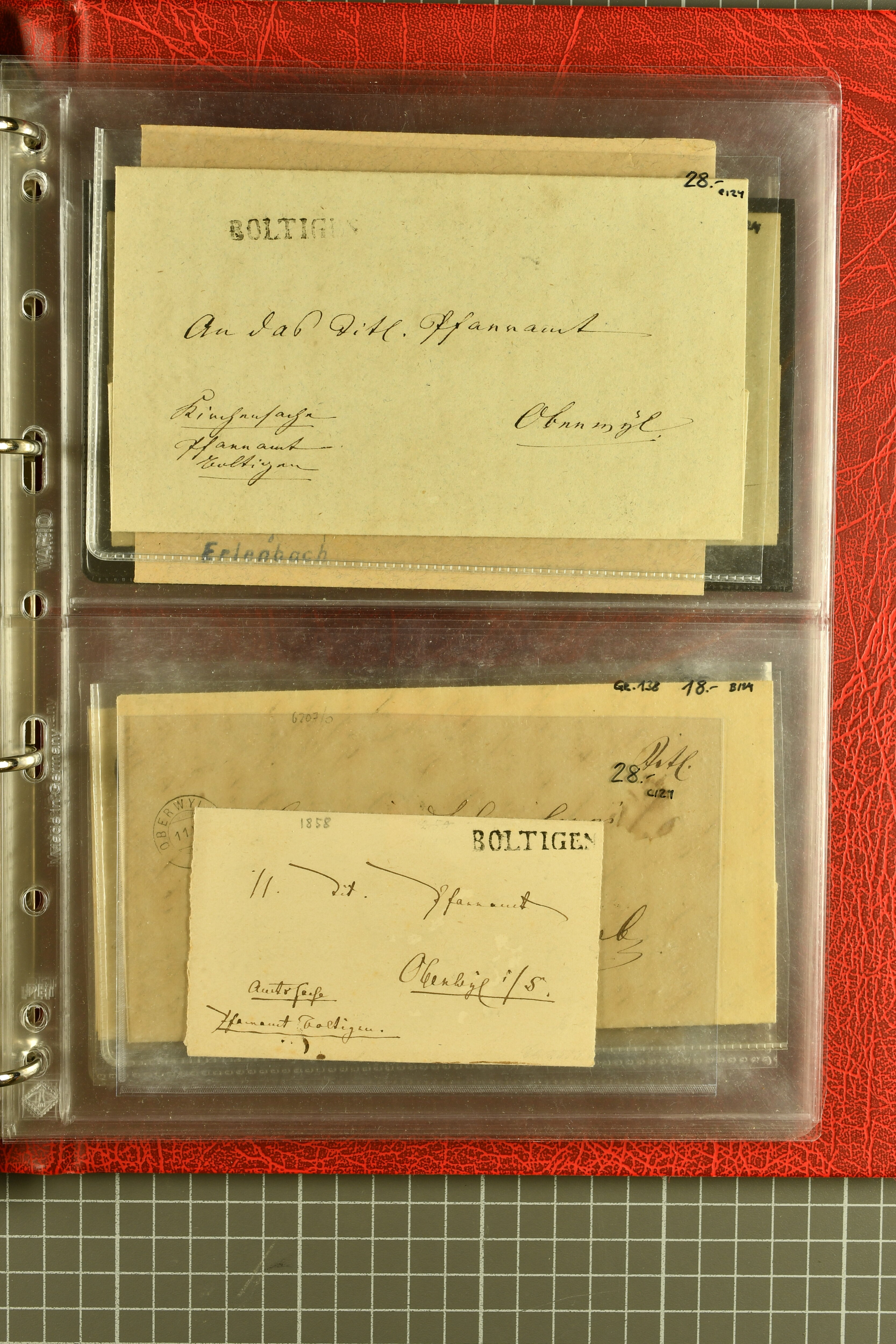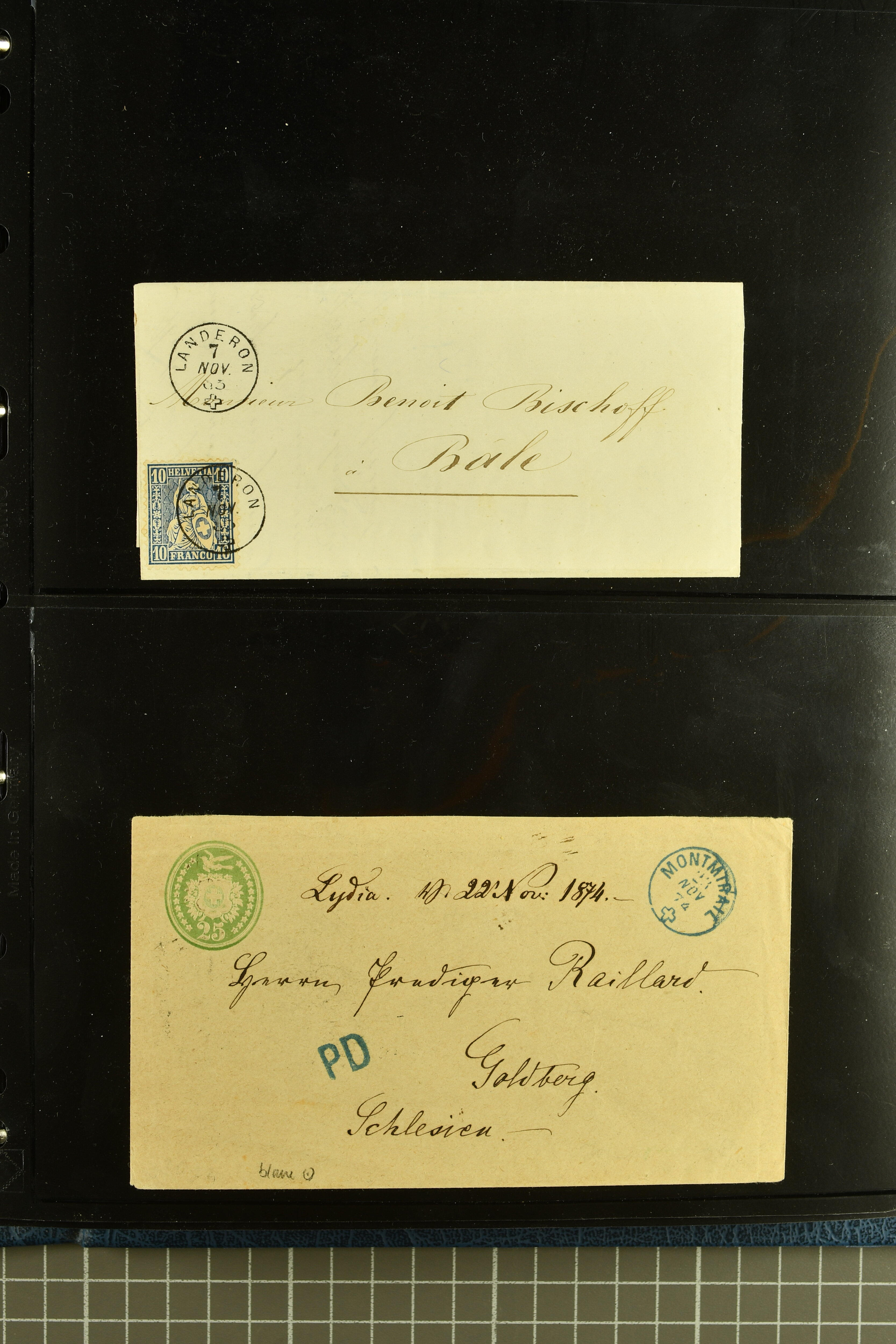 9880 cover imagePostgeschichte Kanton Neuenburg 1854/1940 (ca.): Sammlung 180 Briefe und Karten ab acht Strubelbriefen mit einigen interessanten Entwertungen wie gr. Zierkreisstempel "BOUDRY 28 JANV. 1861", div. Fingerhutstempel oder einem Faltbrief nach Frankreich. Später Sitzende Helvetia und Ganzsachen mit zahlreichen Fingerhutstempeln worunter "MONTMIRAIL 23. NOV. 74" in blau auf Tüblibrief 25 Rp. grün nach Goldberg, Schlesien (Polen) und viele weniger geläufige Stempel, Spätverwendungen der grossen Zierkreisstempel von Serrières, Saint-Sulpice und Auvernier, Stabstp. wie "St. Olivier" auf kleinformatigem Drucksachen-Umschlag mit 2 Rp. grau nach La Chaux-de-Fonds, "CHAMBRELIEN" in blau auf sauberem Briefumschlag mit 10 Rp. rot nach Neuchâtel, verschiedene Güller-Datumstp. in blau aber auch diverse Auslandsfrankaturen der Sitzenden Helvetia oder eine frühe Einladungskarte der "Société la Récréation" in La Chaux-de-Fonds frankiert mit 2 Rp. oliv (1878). Ausserdem Ziffermuster und Stehende Helvetia mit interessanten Auslands-Buntfrankaturen, dekorativen illustrierten Briefen und Karten oder div. Ambulant- und anderen Stabstempeln, UPU 1900 mit 10 Rp.-Ganzsachenpostkarte von La Chaux-de-Fonds nach St. Petersburg, Russland sowie die Ausgaben nach 1907 weiterhin mit interessanten Versandformen wie Expresspostkarten, Stempel wie Stabstp. "CLÉMESIN / NEUCHTEL" auf Postkarte von 1908, Destinationen wie zwei 10 Rp.-Ganzsachenpostkarten nach Chile und Uruguay (1909/14), Vignetten und besseren Frankaturen wie zwei Karten mit Pro Juventute-Vorläufer französisch (SBK JII). Eine interessante Sammlung in meist guter Erhaltung; vier Atteste (Image 1) (Image 2) (Image 3) (Image 4) (Image 5) (Image 6) (Image 7) (Image 8) (Image 9) (Image 10) (Image 11) (Image 12) (Image 13) (Image 14) (Image 15) (Image 16) (Image 17) (Image 18) (Image 19) (Image 20) (Image 21) (Image 22) (Image 23) (Image 24) (Image 25) (Image 26) (Image 27) (Image 28) (Image 29) (Image 30) (Image 31) (Image 32) (Image 33) (Image 34) (Image 35) (Image 36) (Image 37) (Image 38) (Image 39) (Image 40) (Image 41) (Image 42) (Image 43) (Image 44) (Image 45) (Image 46) (Image 47) (Image 48) (Image 49) (Image 50)
