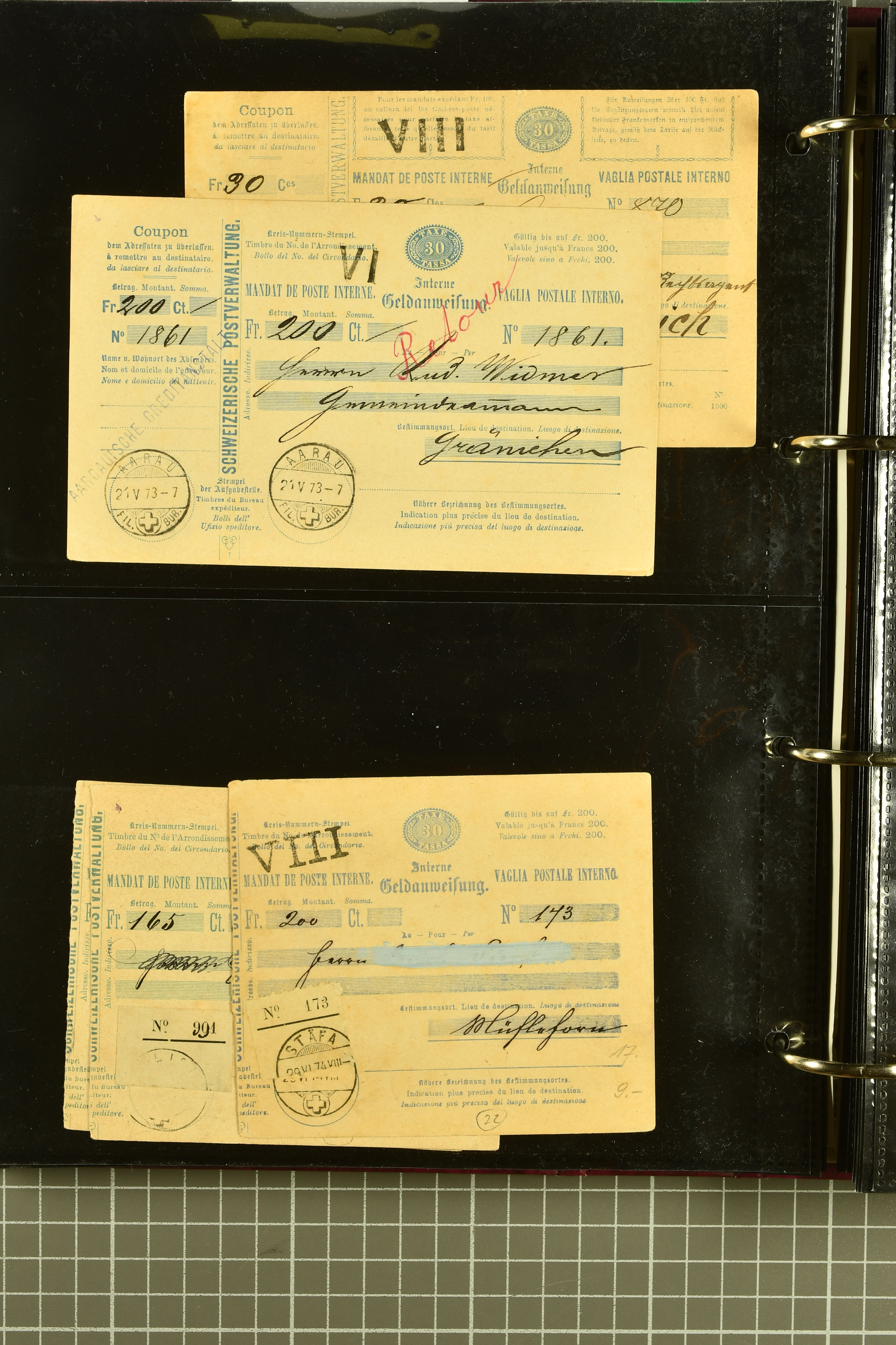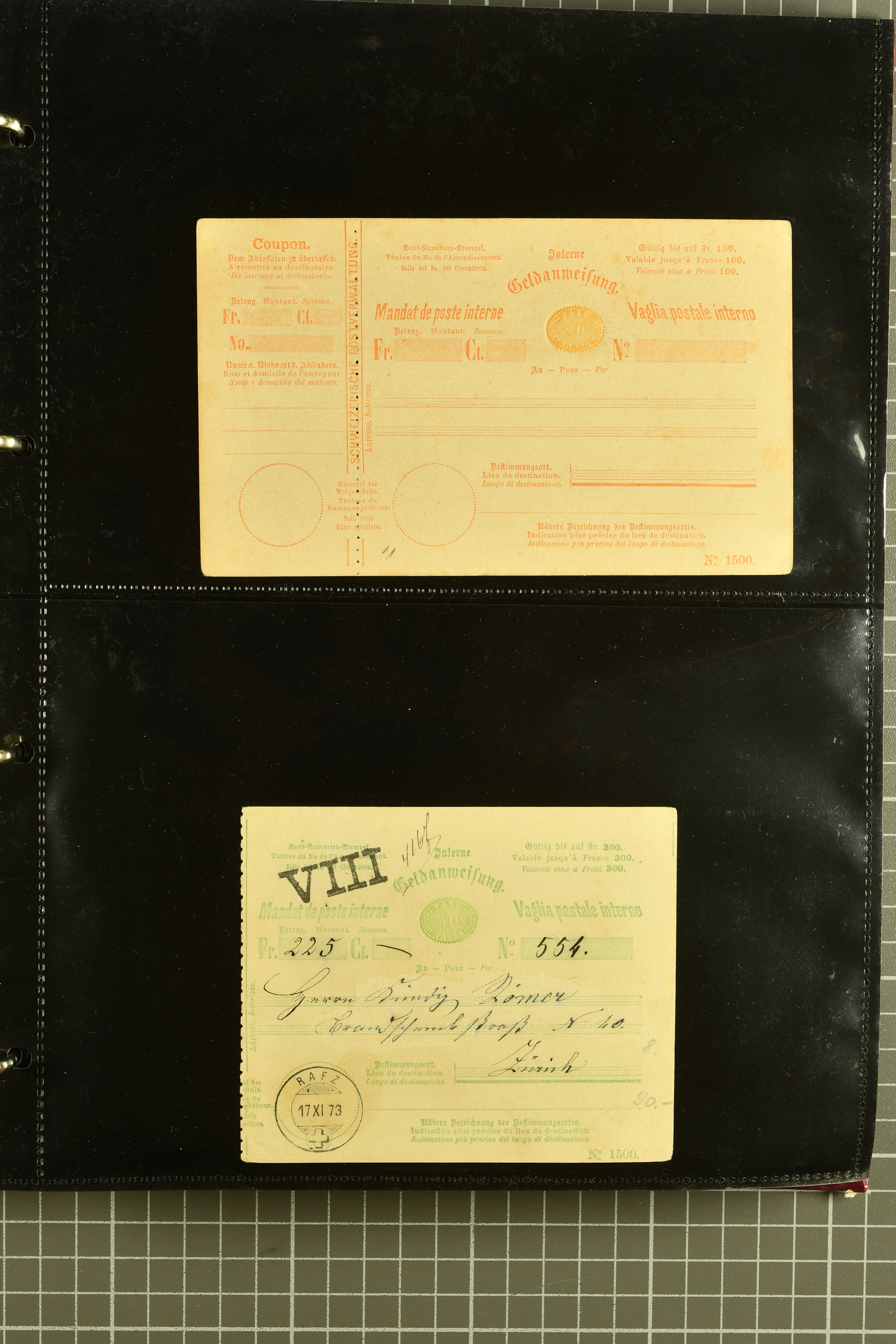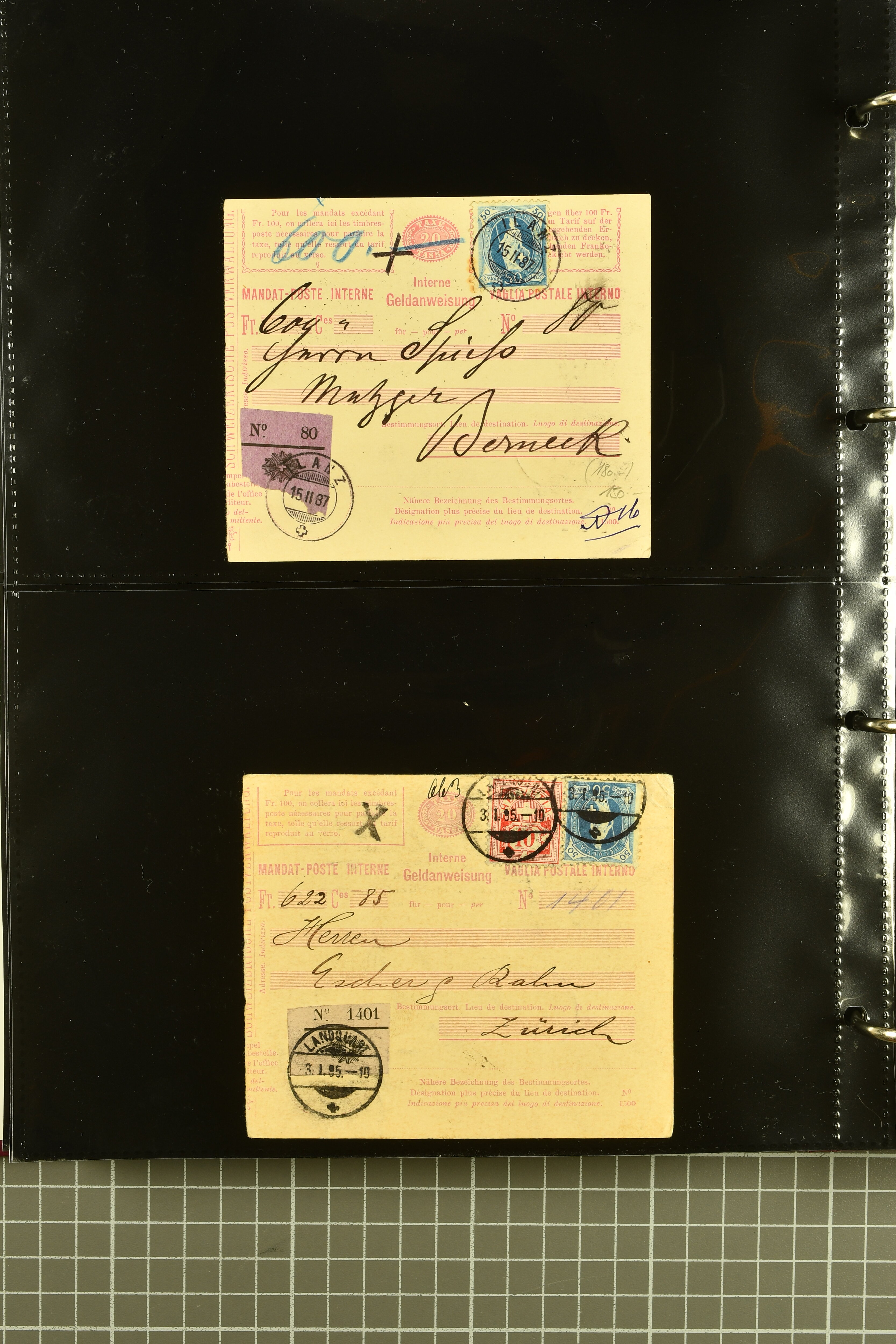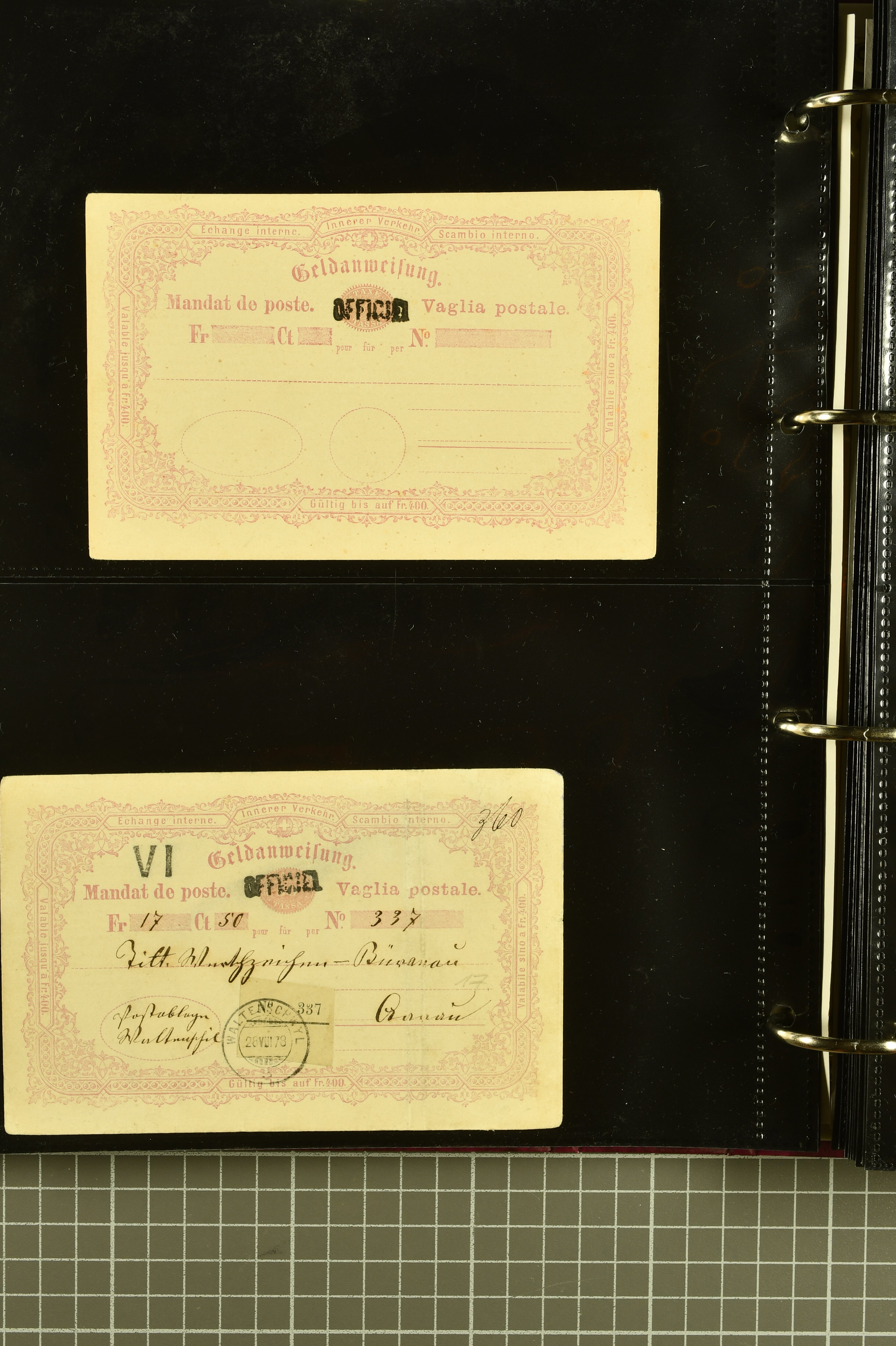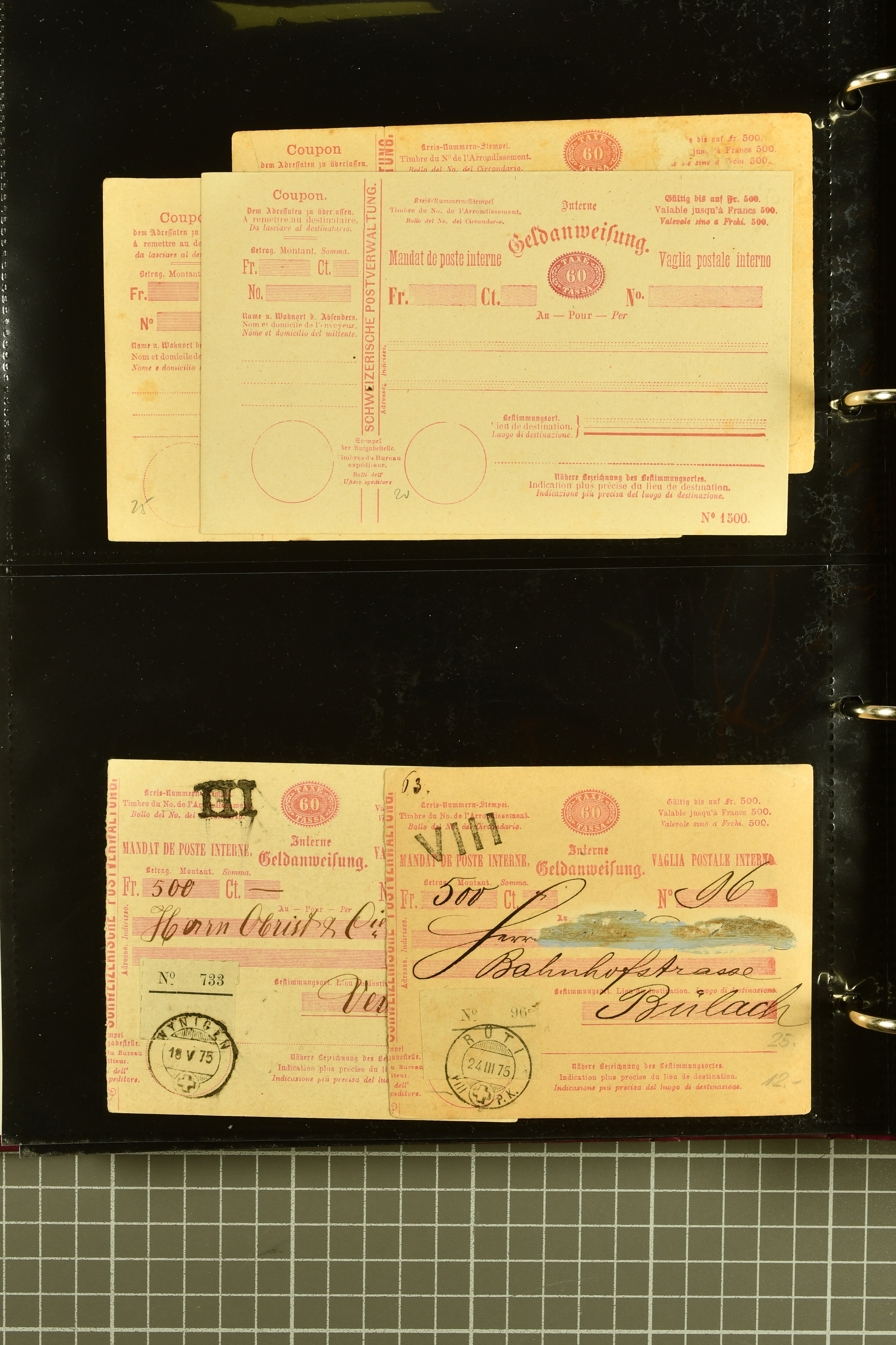 9896 cover image1867/1905ca: Lot 125 ungebrauchte / gebrauchte interne Geldanweisungen, die Ausgabe 1867 mit 20, 30 & 50 Rp. ungebraucht, 1860 OFFICIEL 40 Rp. grün gebraucht & ungebraucht, 50 Rp. lila gebraucht 1878 in WALTENSCHWYL und ungebraucht (2) sowie 60 Rp. gebraucht; 1869 zweiteilige Anweisung mit enger oder weiter Zähnung, der komplette Satz aller fünf Wertstufen ungebraucht, die Ausgaben bis 1875 in grosser Vielfalt, Ausgaben ab 1894 gebraucht ohne Coupon mit Zusatzfrankaturen Ziffer resp. Stehende (12), interessantes Los auch mit Vielzahl an Ortsstempeln, meist aus dem Zürcher Postkreis. SGSSV = CHF 1600+ (Image 1) (Image 2) (Image 3) (Image 4) (Image 5) (Image 6) (Image 7) (Image 8) (Image 9) (Image 10) (Image 11) (Image 12) (Image 13) (Image 14) (Image 15) (Image 16) (Image 17) (Image 18) (Image 19) (Image 20) (Image 21) (Image 22) (Image 23) (Image 24) (Image 25) (Image 26) (Image 27) (Image 28) (Image 29)