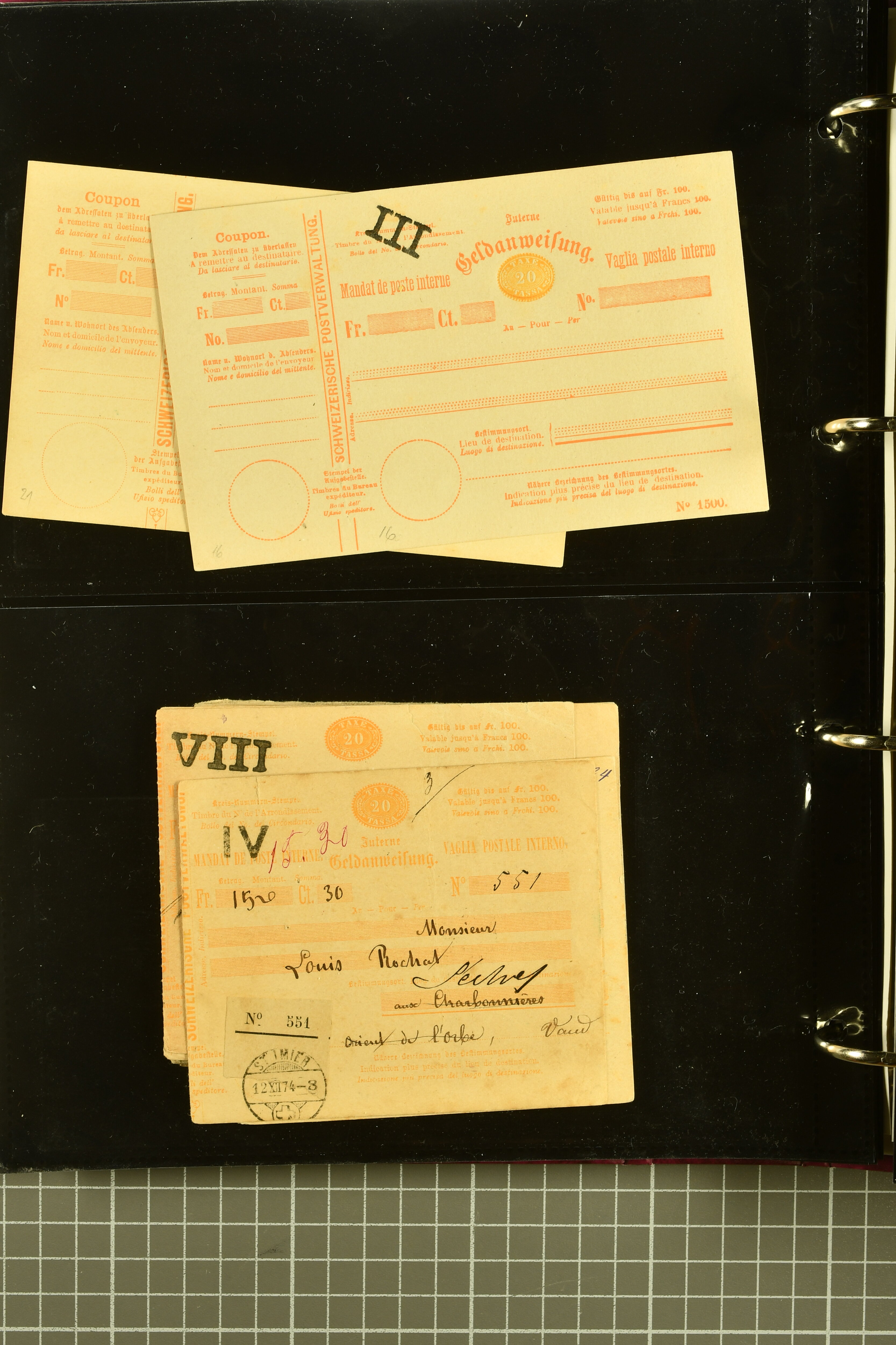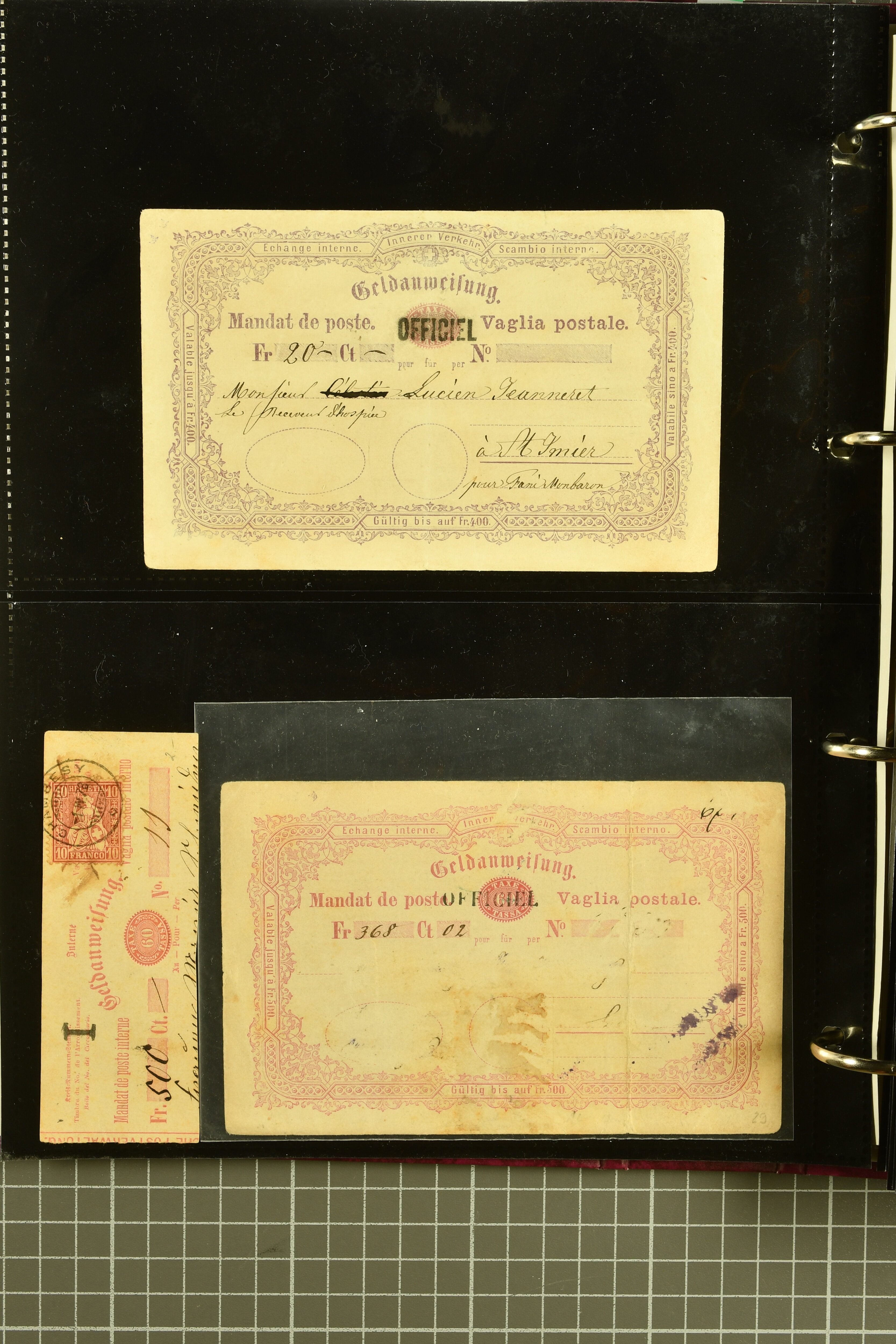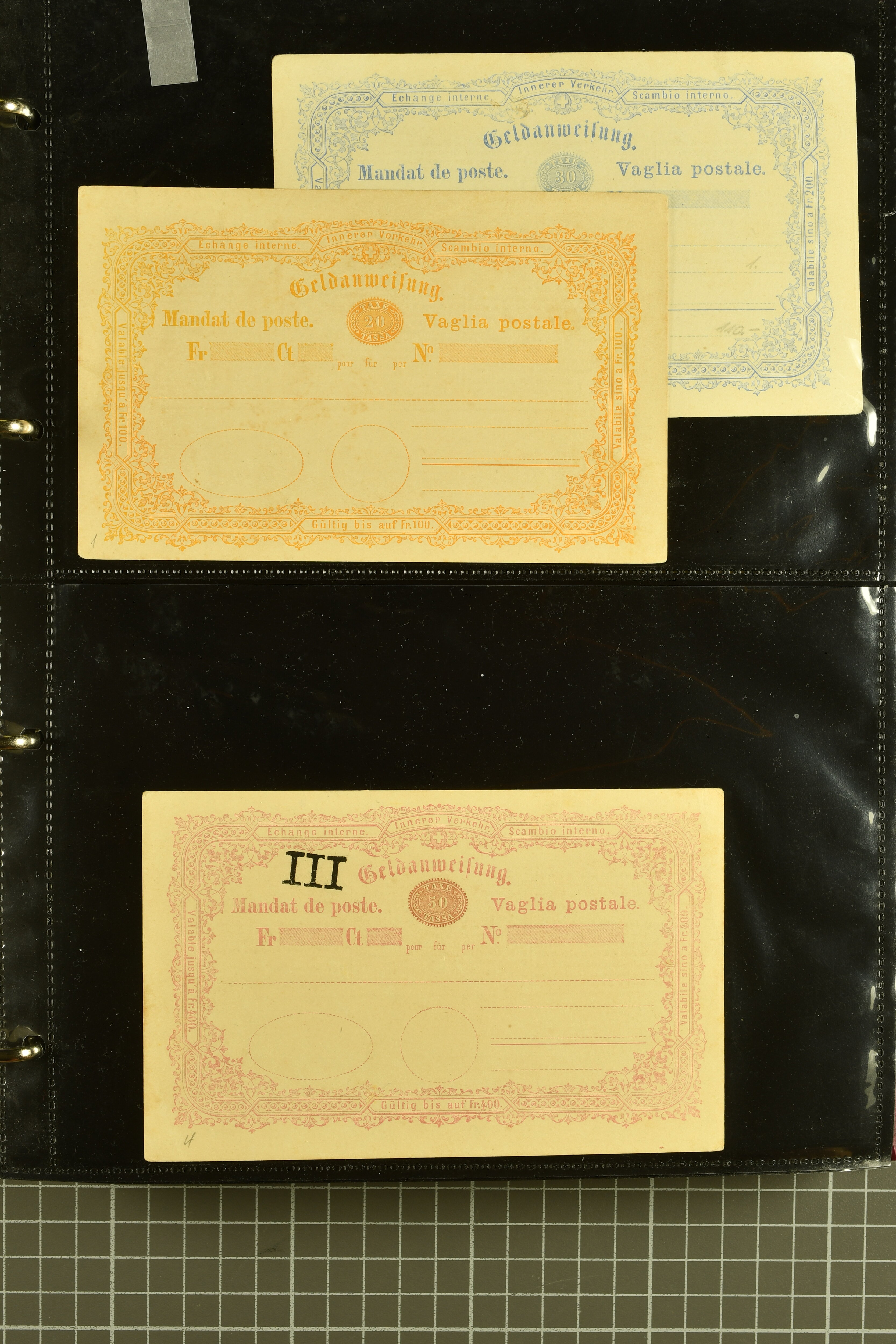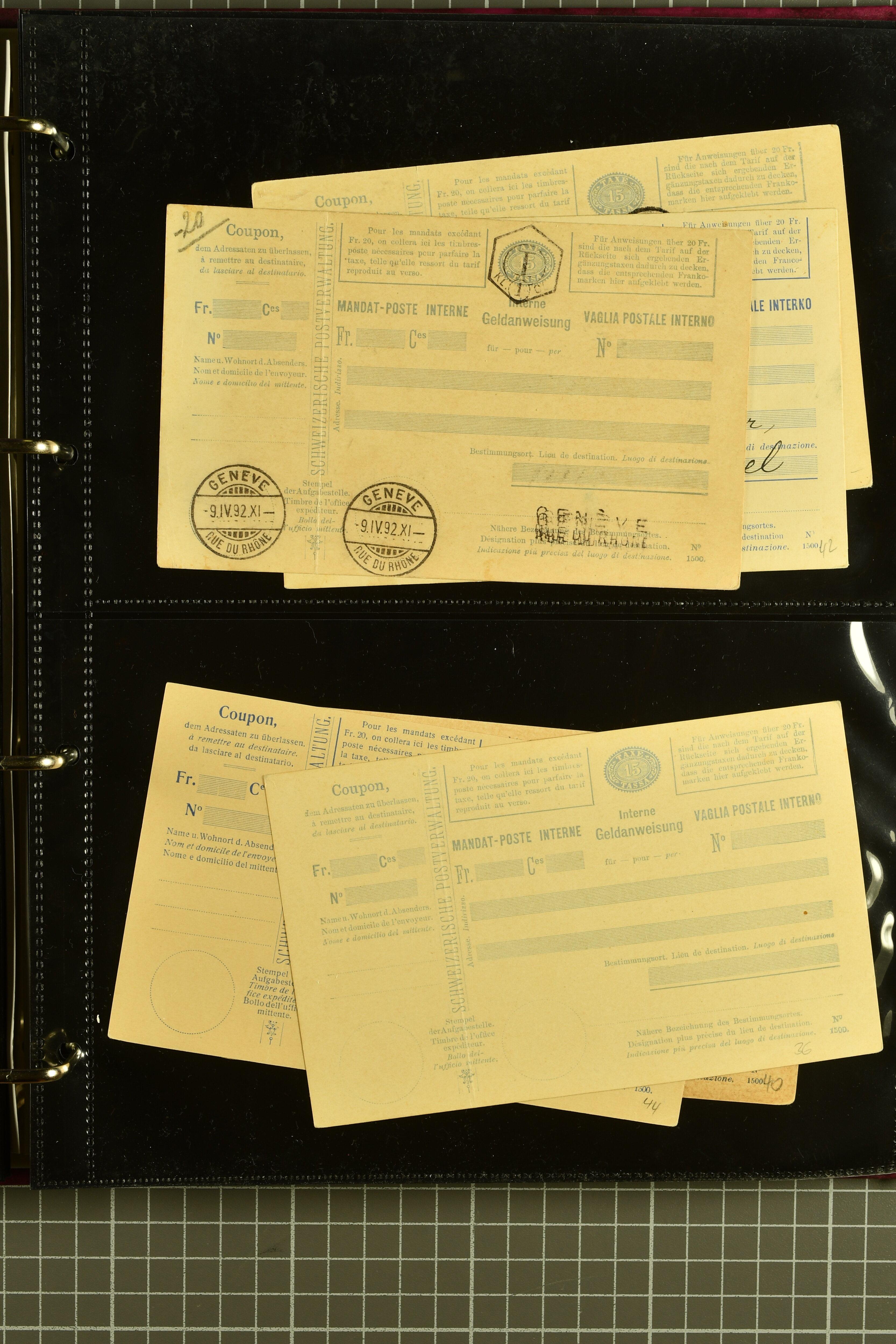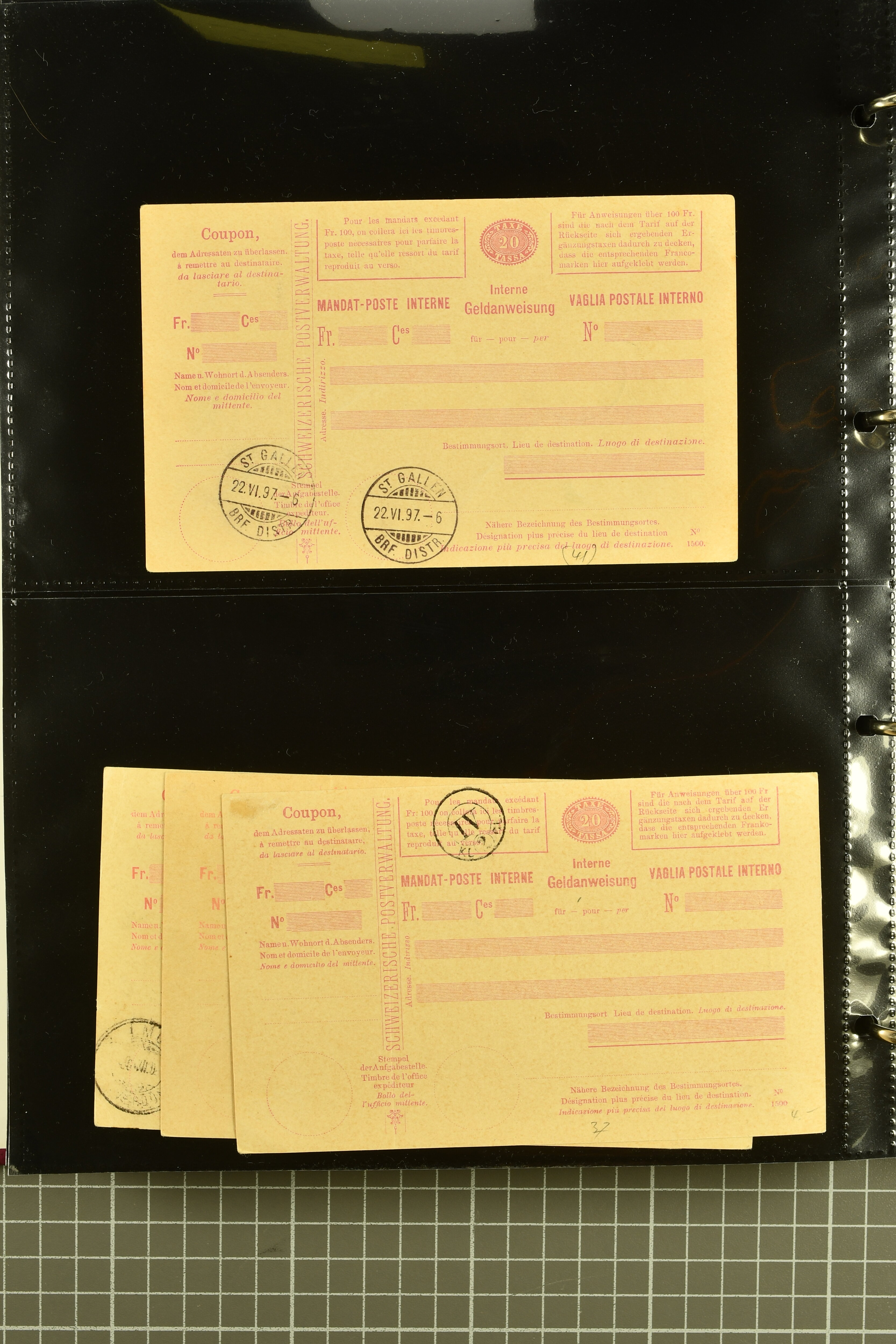 9896 cover image1867/1905ca: Lot 125 ungebrauchte / gebrauchte interne Geldanweisungen, die Ausgabe 1867 mit 20, 30 & 50 Rp. ungebraucht, 1860 OFFICIEL 40 Rp. grün gebraucht & ungebraucht, 50 Rp. lila gebraucht 1878 in WALTENSCHWYL und ungebraucht (2) sowie 60 Rp. gebraucht; 1869 zweiteilige Anweisung mit enger oder weiter Zähnung, der komplette Satz aller fünf Wertstufen ungebraucht, die Ausgaben bis 1875 in grosser Vielfalt, Ausgaben ab 1894 gebraucht ohne Coupon mit Zusatzfrankaturen Ziffer resp. Stehende (12), interessantes Los auch mit Vielzahl an Ortsstempeln, meist aus dem Zürcher Postkreis. SGSSV = CHF 1600+ (Image 1) (Image 2) (Image 3) (Image 4) (Image 5) (Image 6) (Image 7) (Image 8) (Image 9) (Image 10) (Image 11) (Image 12) (Image 13) (Image 14) (Image 15) (Image 16) (Image 17) (Image 18) (Image 19) (Image 20) (Image 21) (Image 22) (Image 23) (Image 24) (Image 25) (Image 26) (Image 27) (Image 28) (Image 29)