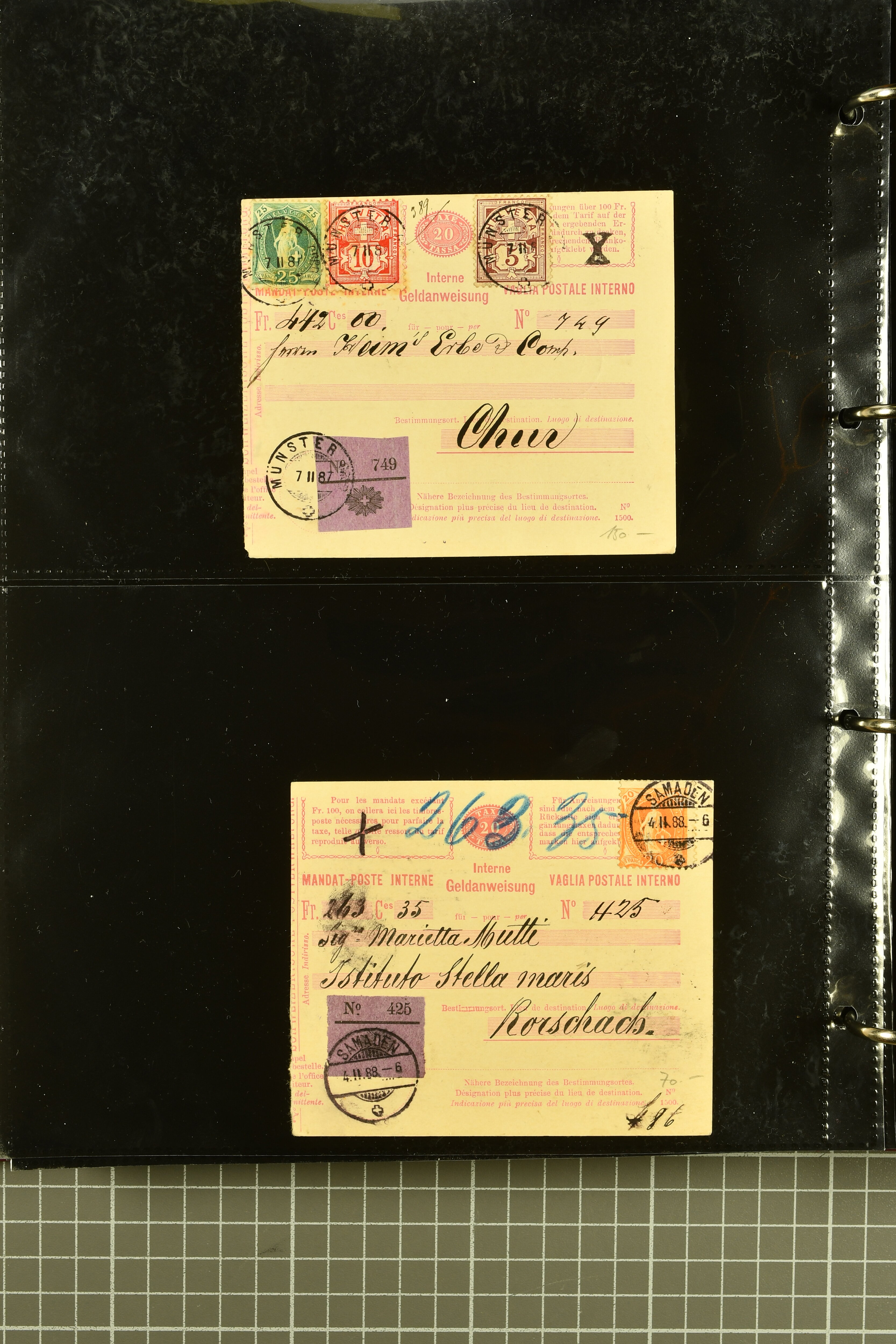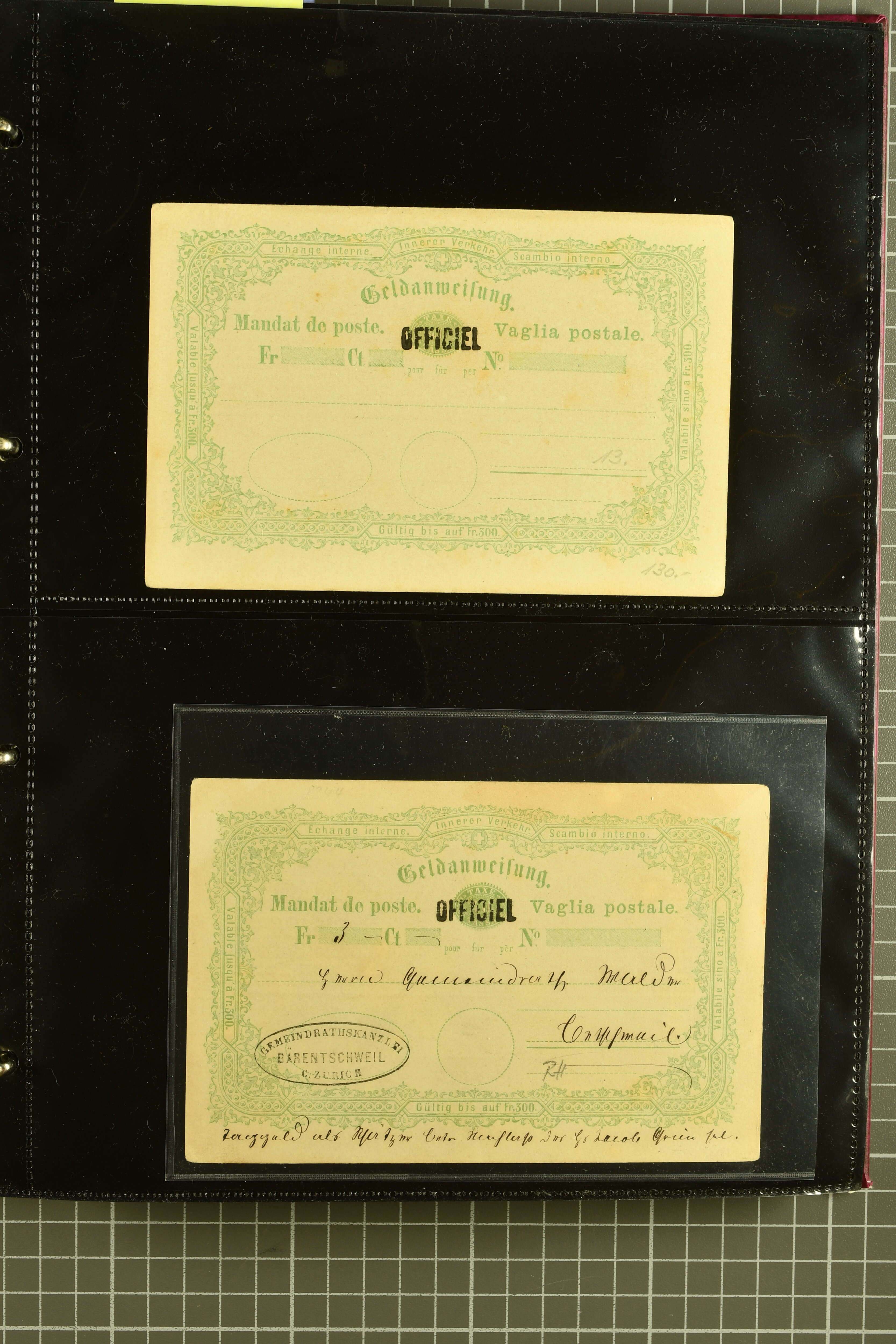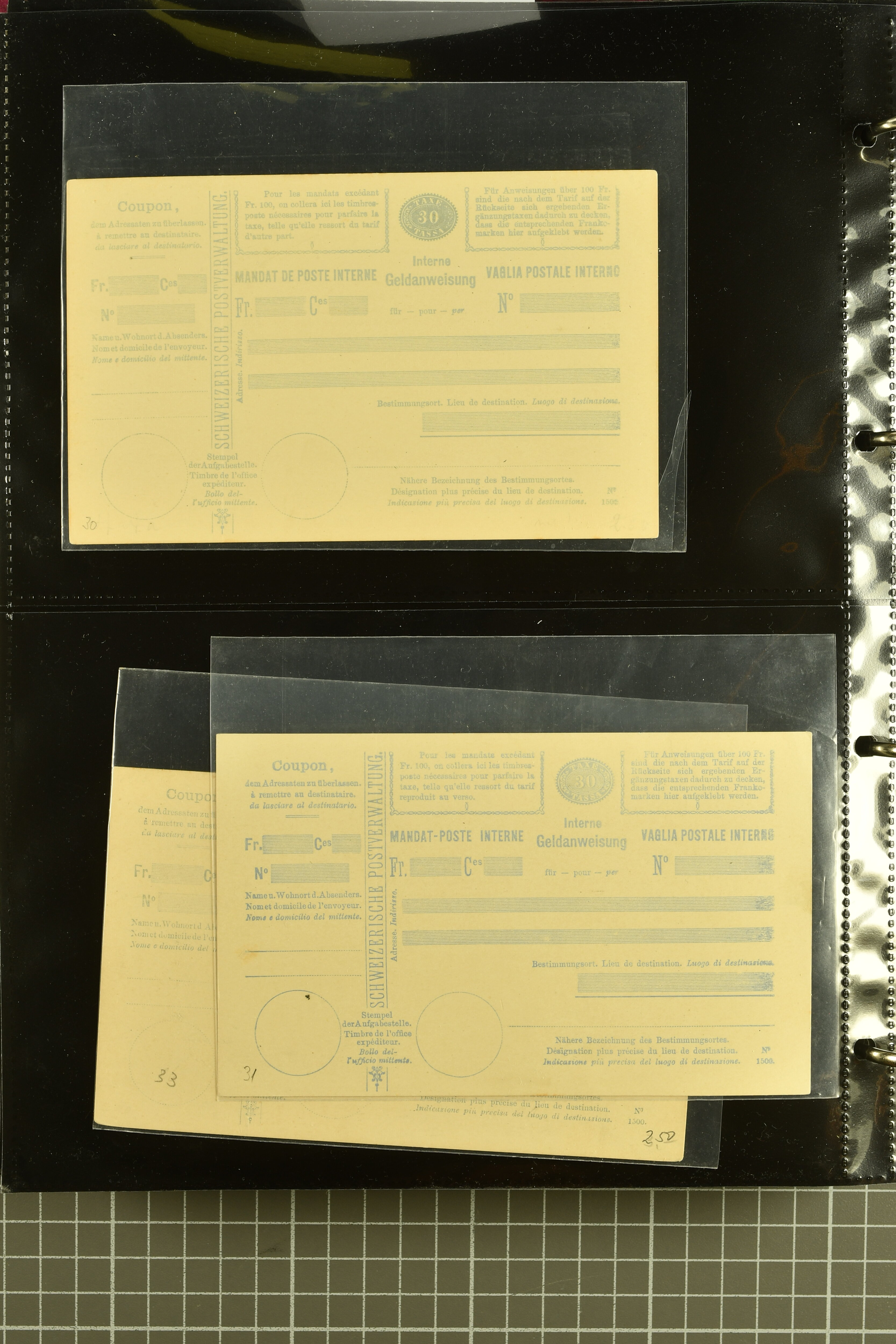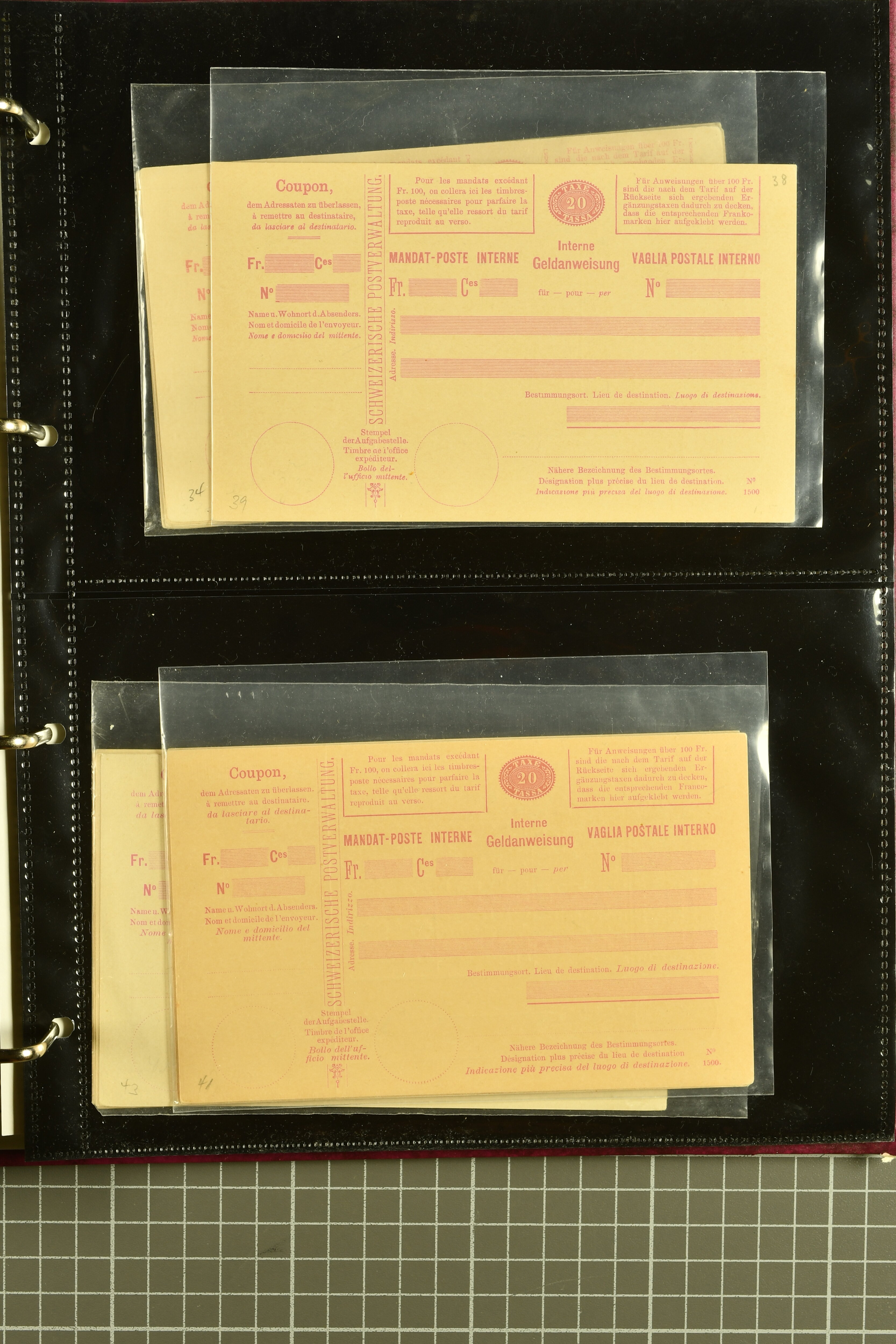 9896 cover image1867/1905ca: Lot 125 ungebrauchte / gebrauchte interne Geldanweisungen, die Ausgabe 1867 mit 20, 30 & 50 Rp. ungebraucht, 1860 OFFICIEL 40 Rp. grün gebraucht & ungebraucht, 50 Rp. lila gebraucht 1878 in WALTENSCHWYL und ungebraucht (2) sowie 60 Rp. gebraucht; 1869 zweiteilige Anweisung mit enger oder weiter Zähnung, der komplette Satz aller fünf Wertstufen ungebraucht, die Ausgaben bis 1875 in grosser Vielfalt, Ausgaben ab 1894 gebraucht ohne Coupon mit Zusatzfrankaturen Ziffer resp. Stehende (12), interessantes Los auch mit Vielzahl an Ortsstempeln, meist aus dem Zürcher Postkreis. SGSSV = CHF 1600+ (Image 1) (Image 2) (Image 3) (Image 4) (Image 5) (Image 6) (Image 7) (Image 8) (Image 9) (Image 10) (Image 11) (Image 12) (Image 13) (Image 14) (Image 15) (Image 16) (Image 17) (Image 18) (Image 19) (Image 20) (Image 21) (Image 22) (Image 23) (Image 24) (Image 25) (Image 26) (Image 27) (Image 28) (Image 29)