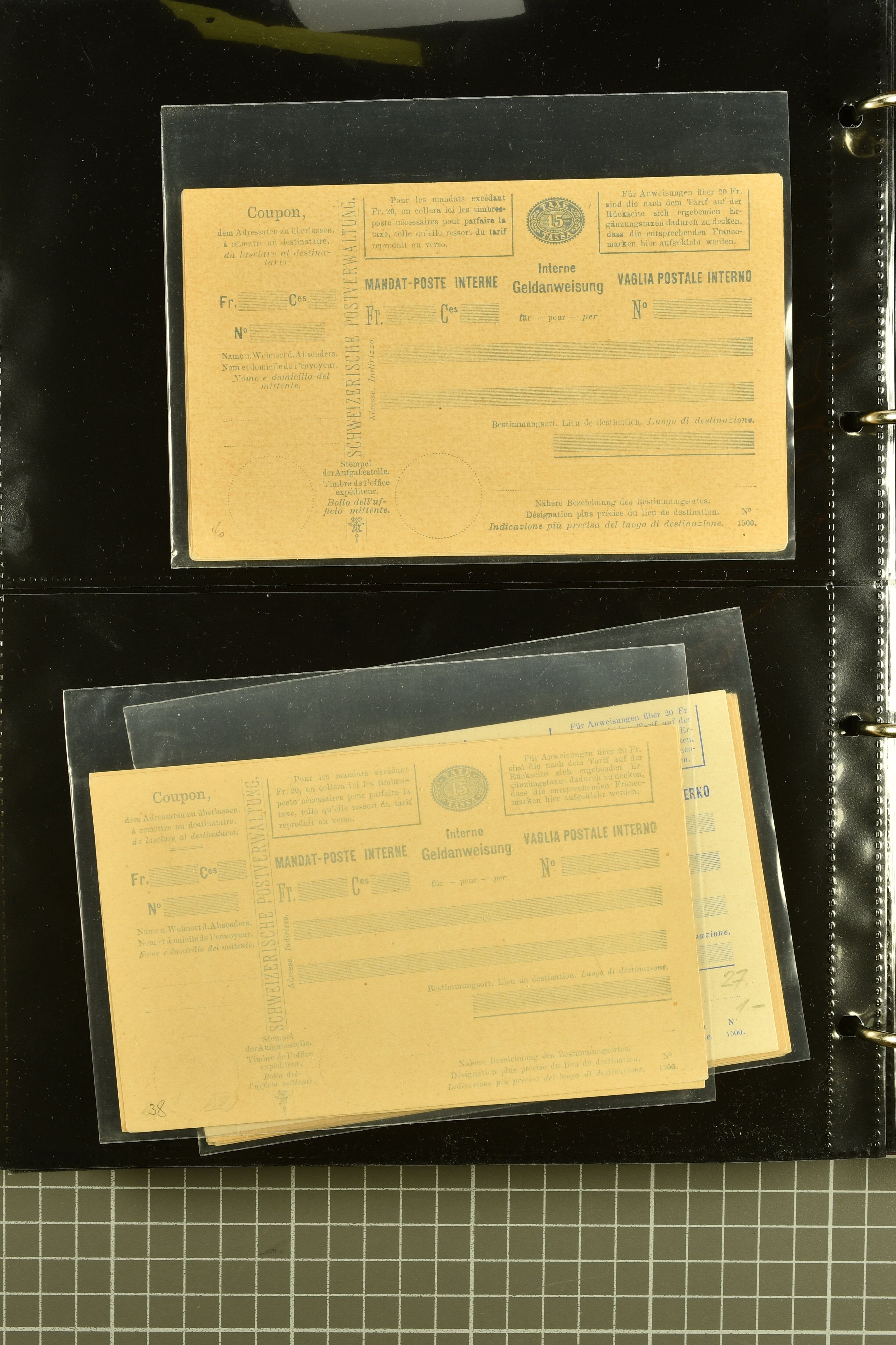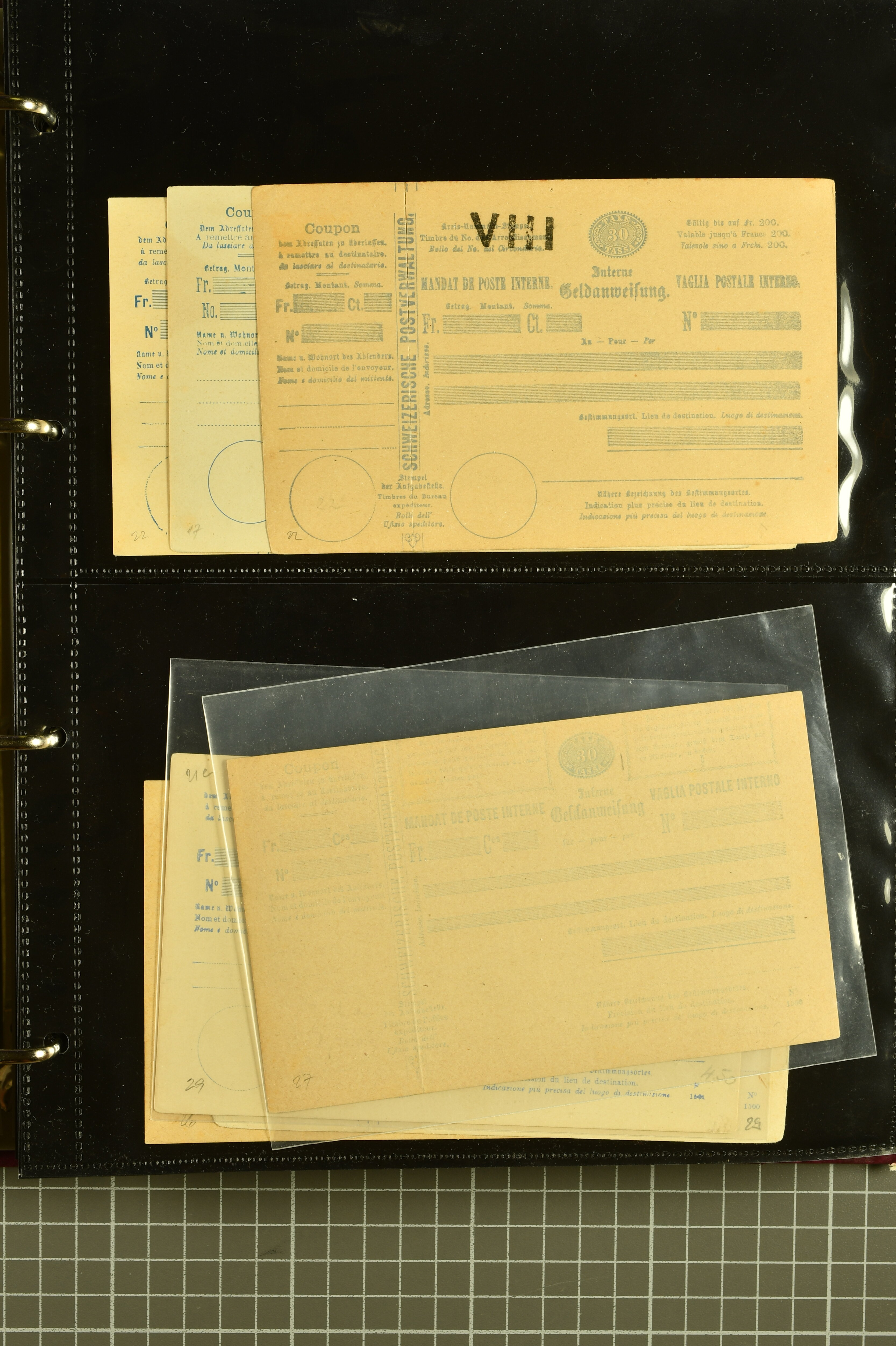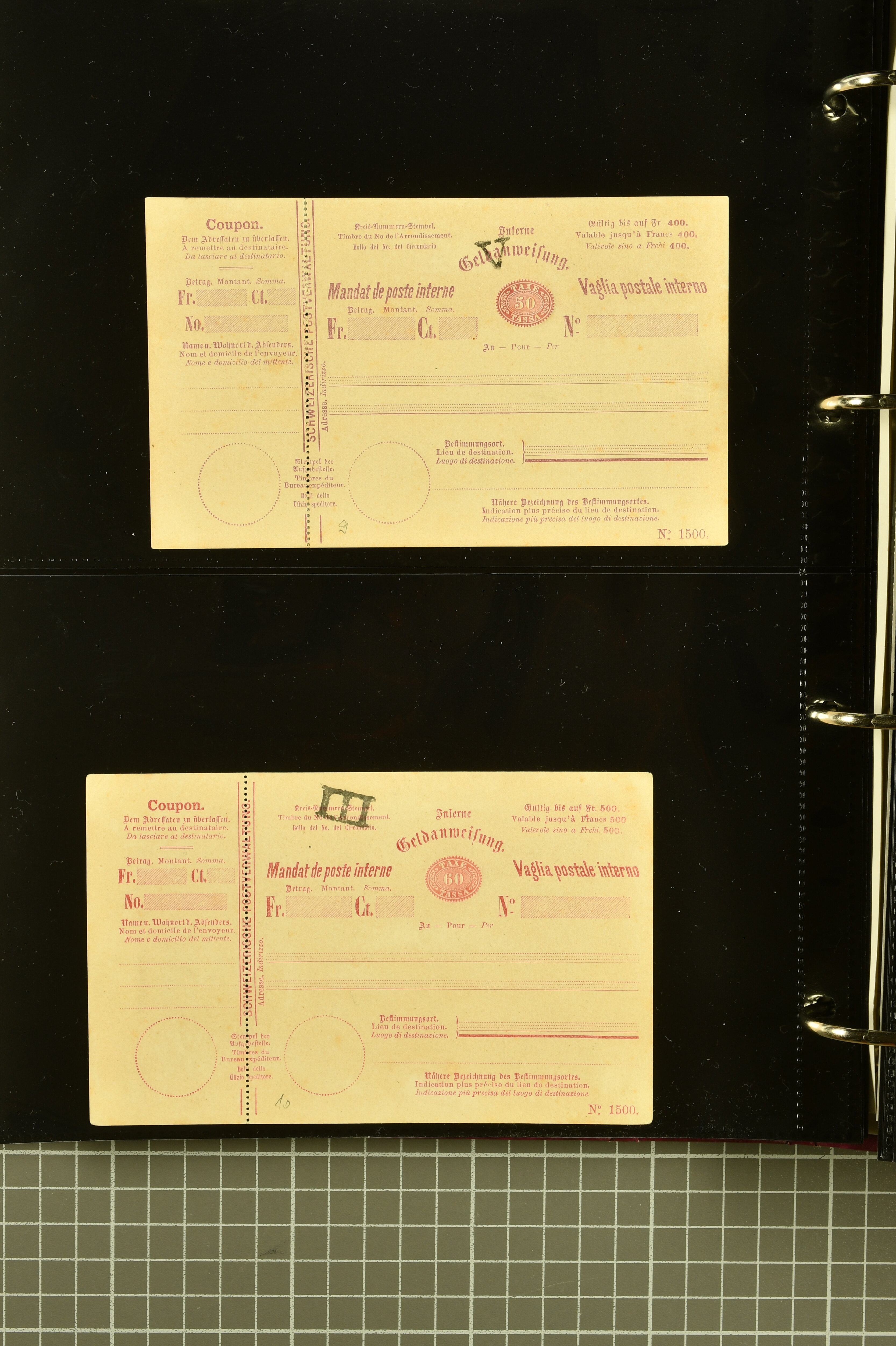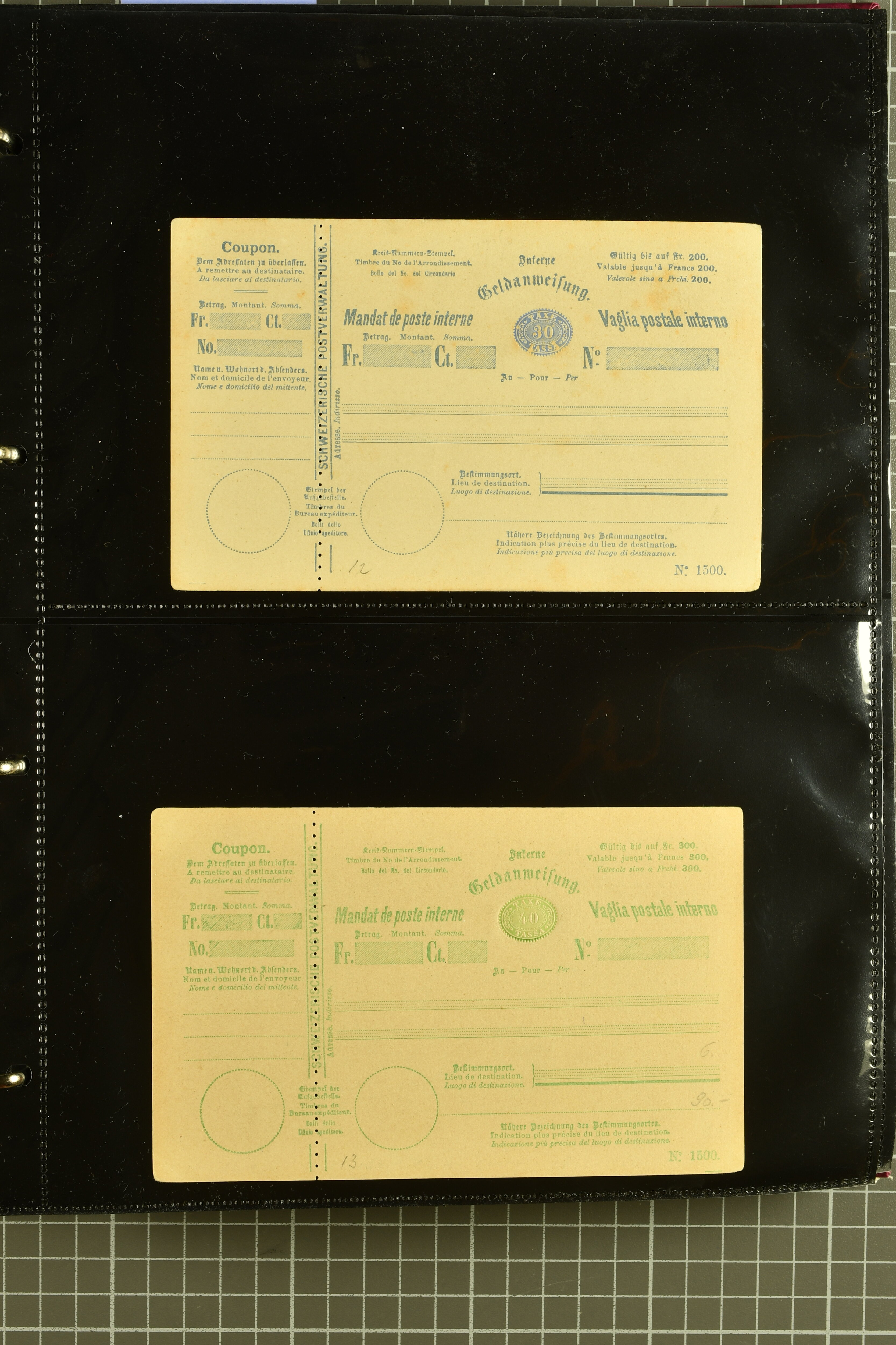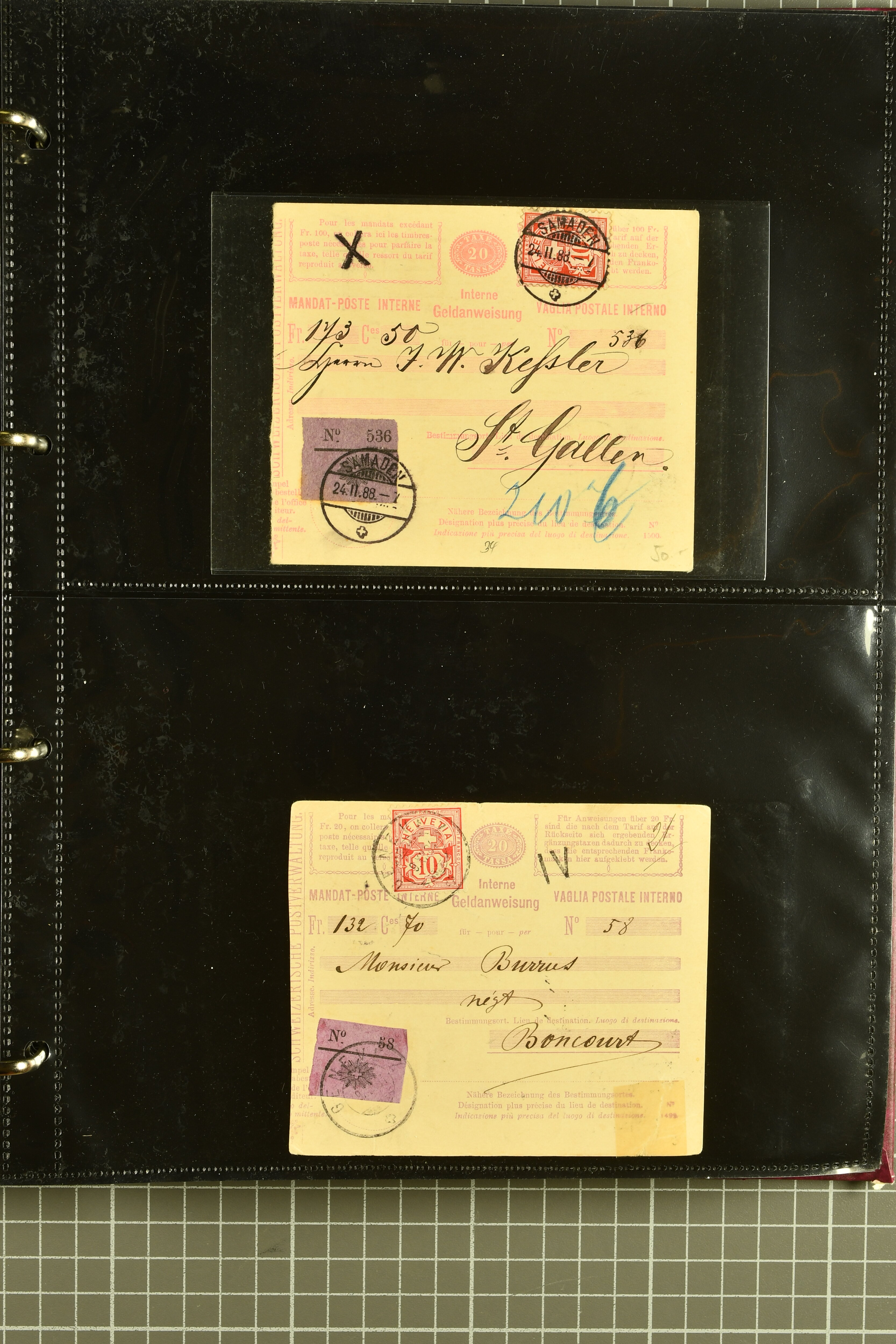 9896 cover image1867/1905ca: Lot 125 ungebrauchte / gebrauchte interne Geldanweisungen, die Ausgabe 1867 mit 20, 30 & 50 Rp. ungebraucht, 1860 OFFICIEL 40 Rp. grün gebraucht & ungebraucht, 50 Rp. lila gebraucht 1878 in WALTENSCHWYL und ungebraucht (2) sowie 60 Rp. gebraucht; 1869 zweiteilige Anweisung mit enger oder weiter Zähnung, der komplette Satz aller fünf Wertstufen ungebraucht, die Ausgaben bis 1875 in grosser Vielfalt, Ausgaben ab 1894 gebraucht ohne Coupon mit Zusatzfrankaturen Ziffer resp. Stehende (12), interessantes Los auch mit Vielzahl an Ortsstempeln, meist aus dem Zürcher Postkreis. SGSSV = CHF 1600+ (Image 1) (Image 2) (Image 3) (Image 4) (Image 5) (Image 6) (Image 7) (Image 8) (Image 9) (Image 10) (Image 11) (Image 12) (Image 13) (Image 14) (Image 15) (Image 16) (Image 17) (Image 18) (Image 19) (Image 20) (Image 21) (Image 22) (Image 23) (Image 24) (Image 25) (Image 26) (Image 27) (Image 28) (Image 29)
